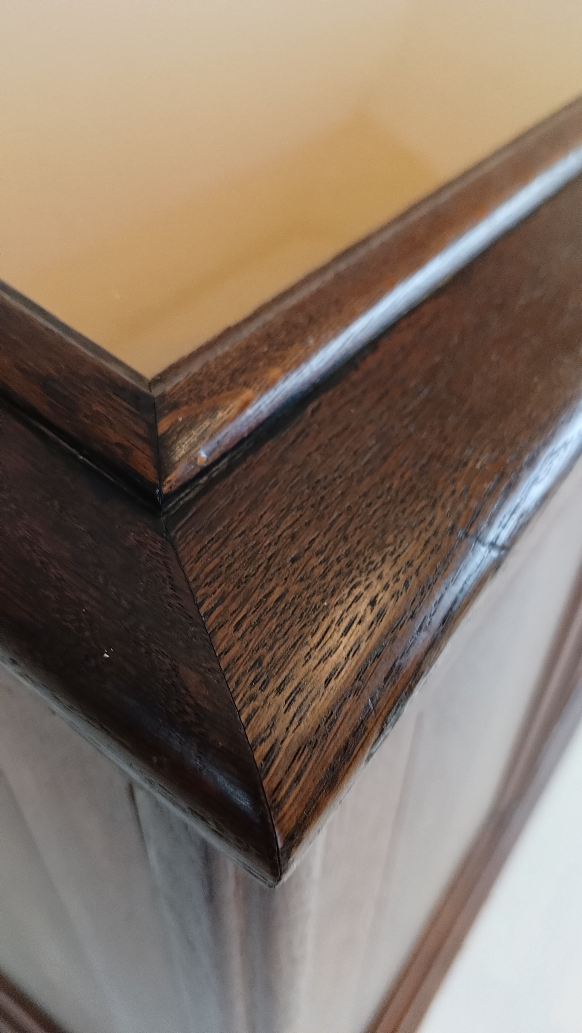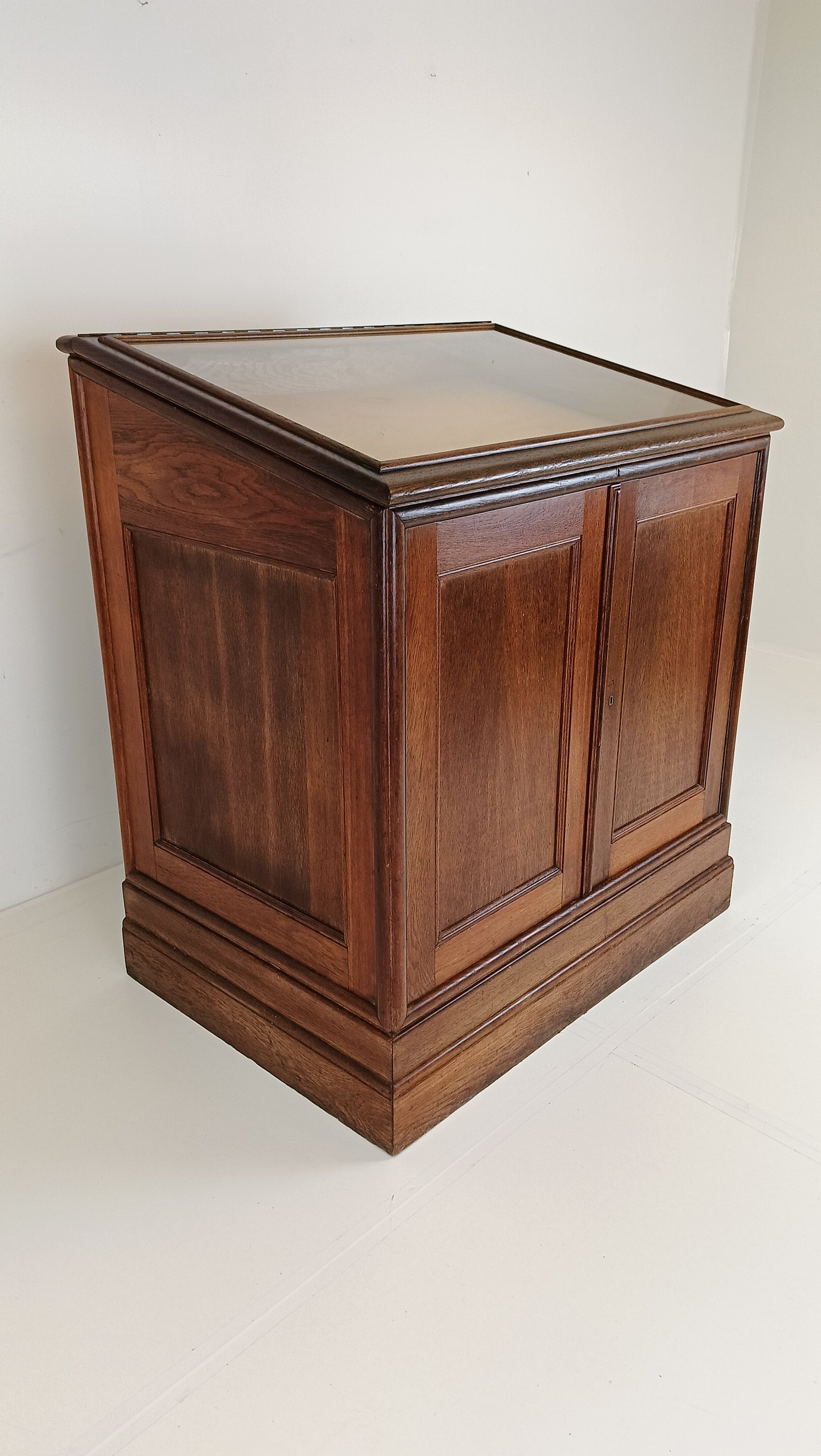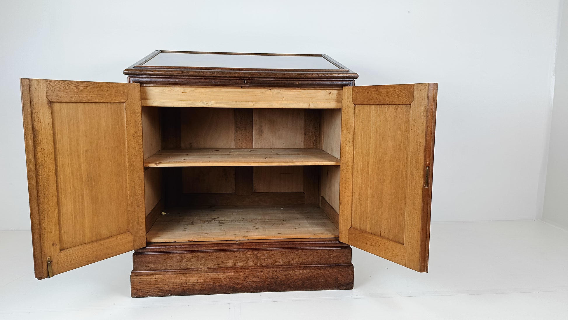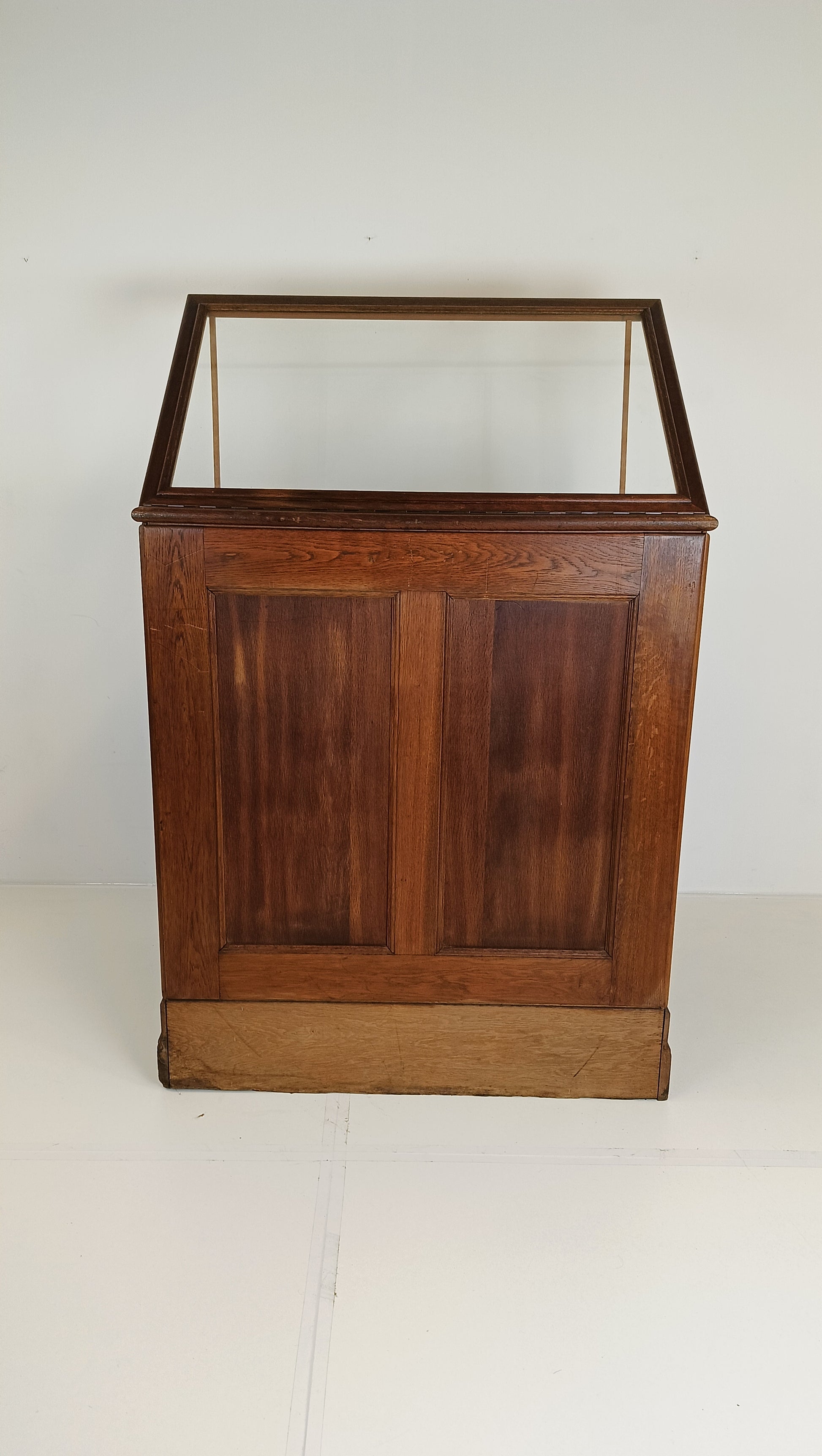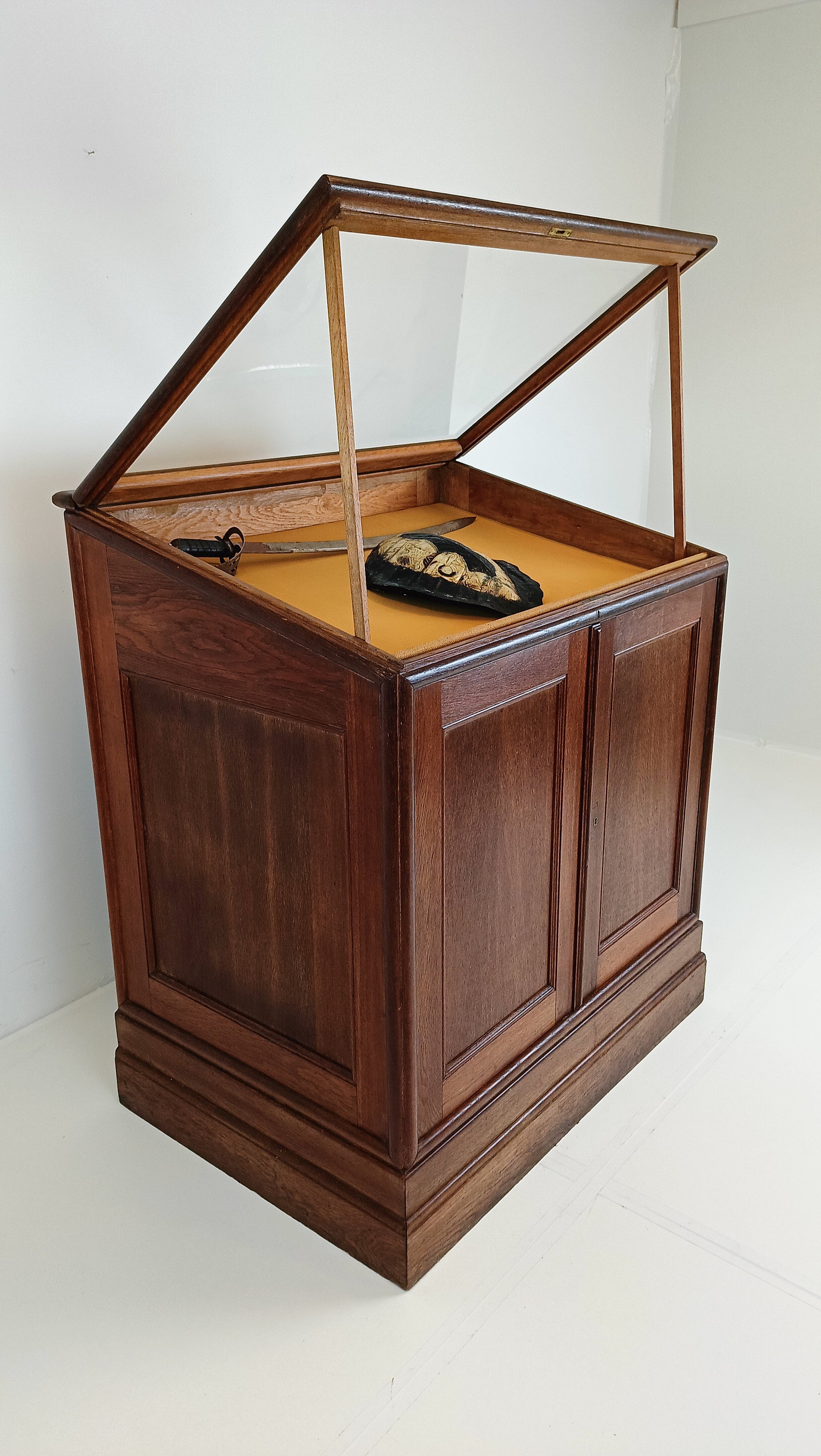 These two antique museum display cabinets are a striking blend of beauty and functionality. Featuring display areas at the top for showcasing artifacts, and ample storage space underneath, they offer both aesthetic appeal and practicality. The cabinets boast a beautiful patina, a testament to their age and history, which has been lovingly preserved and enhanced through repolishing with oil. Additionally, they have been tastefully reupholstered, breathing new life into their timeless design. With their exquisite craftsmanship and thoughtful restoration, these cabinets are sure to captivate admirers and serve as stunning focal points in any space.