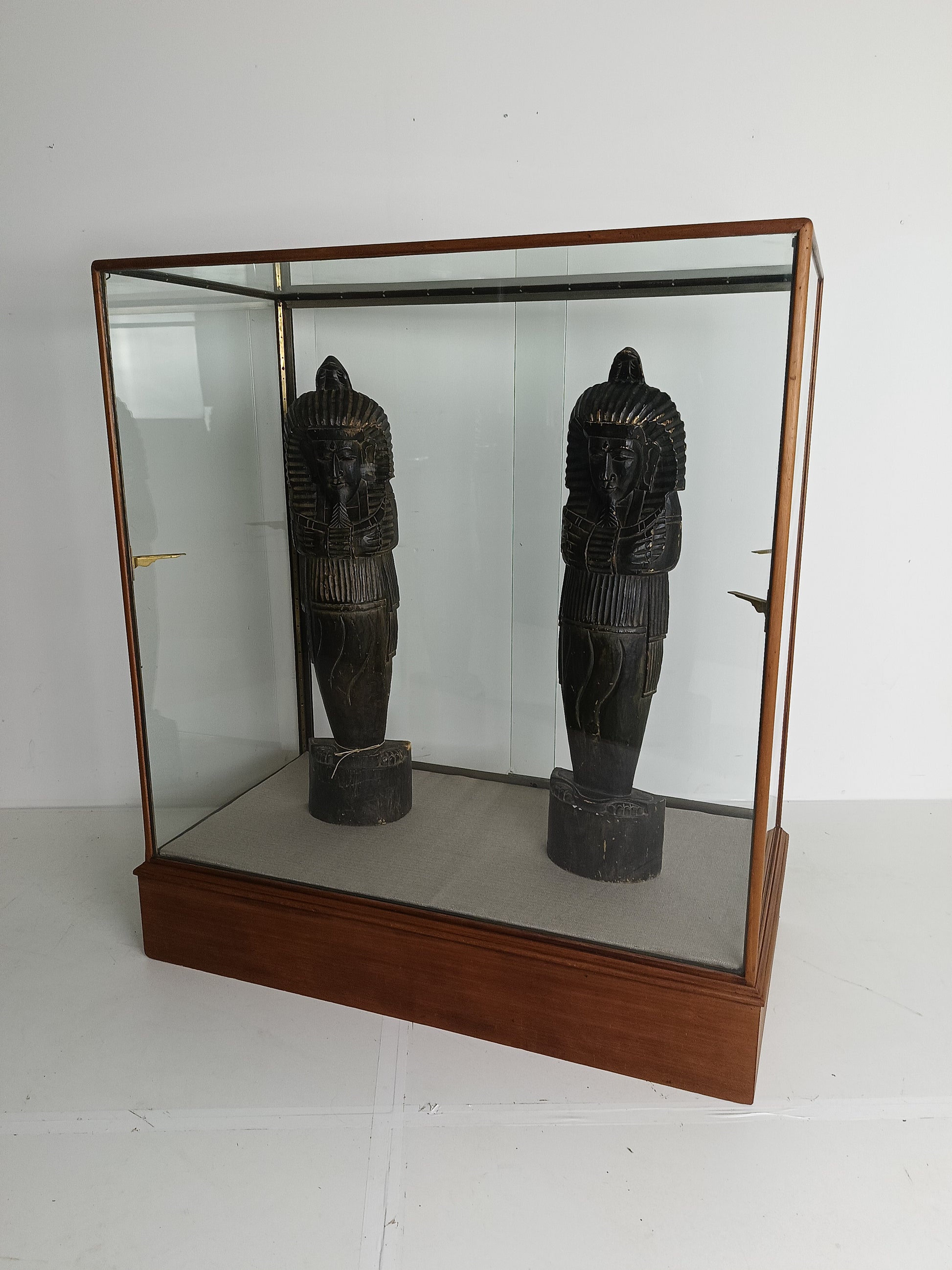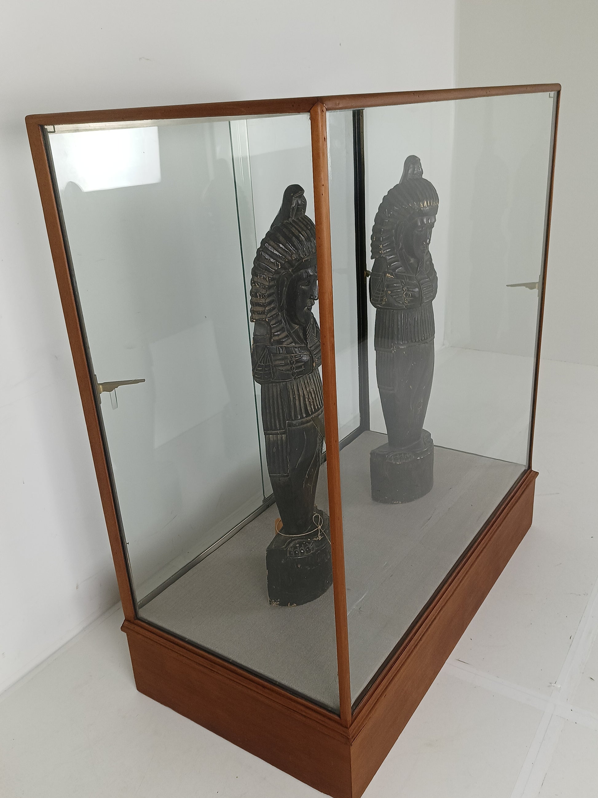 Step into the past and discover treasures in our antique shop/museum display cabinet. Recently refurbished with fabric at the bottom, this piece exudes charm and history. While the top glass bears slight signs of wear, it adds character to its story. Perfect for showcasing your own collection or adding a touch of nostalgia to any space. The back doors have been renewed, the rest of glas is original. With one glass shelf