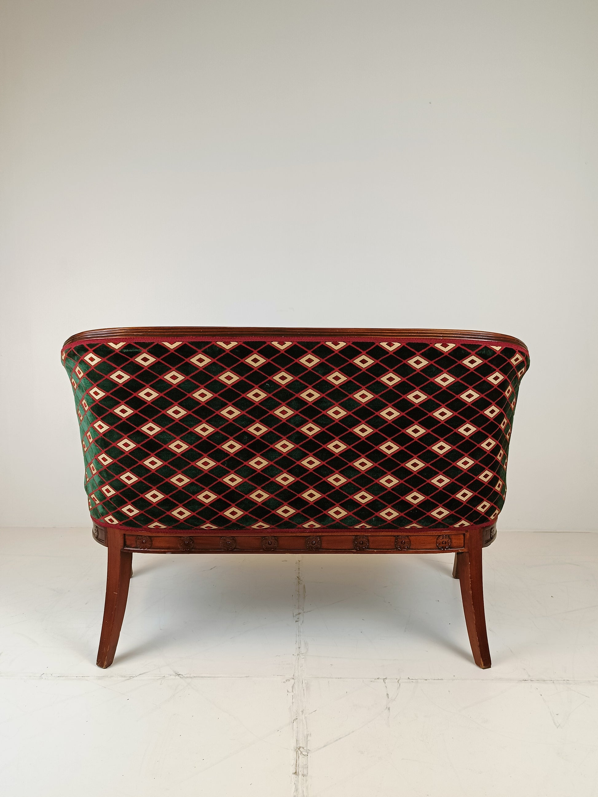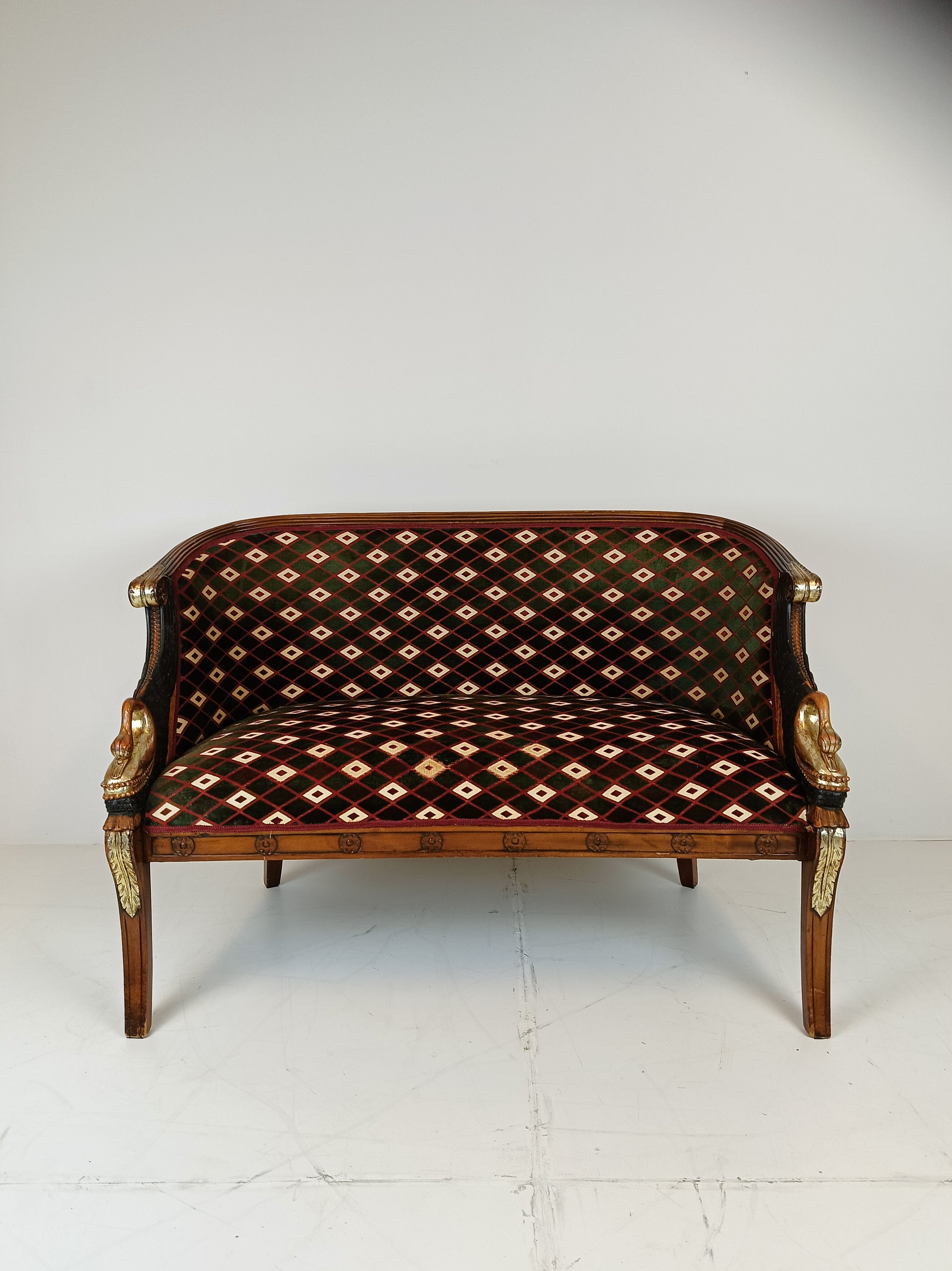 Antique neoclassical sofa in black gold lacquer finish, Each has a round reed comb rail that continues into carved arm connections of rosette, connecting upright carved swans nail head details. The apron has floral medallion carving