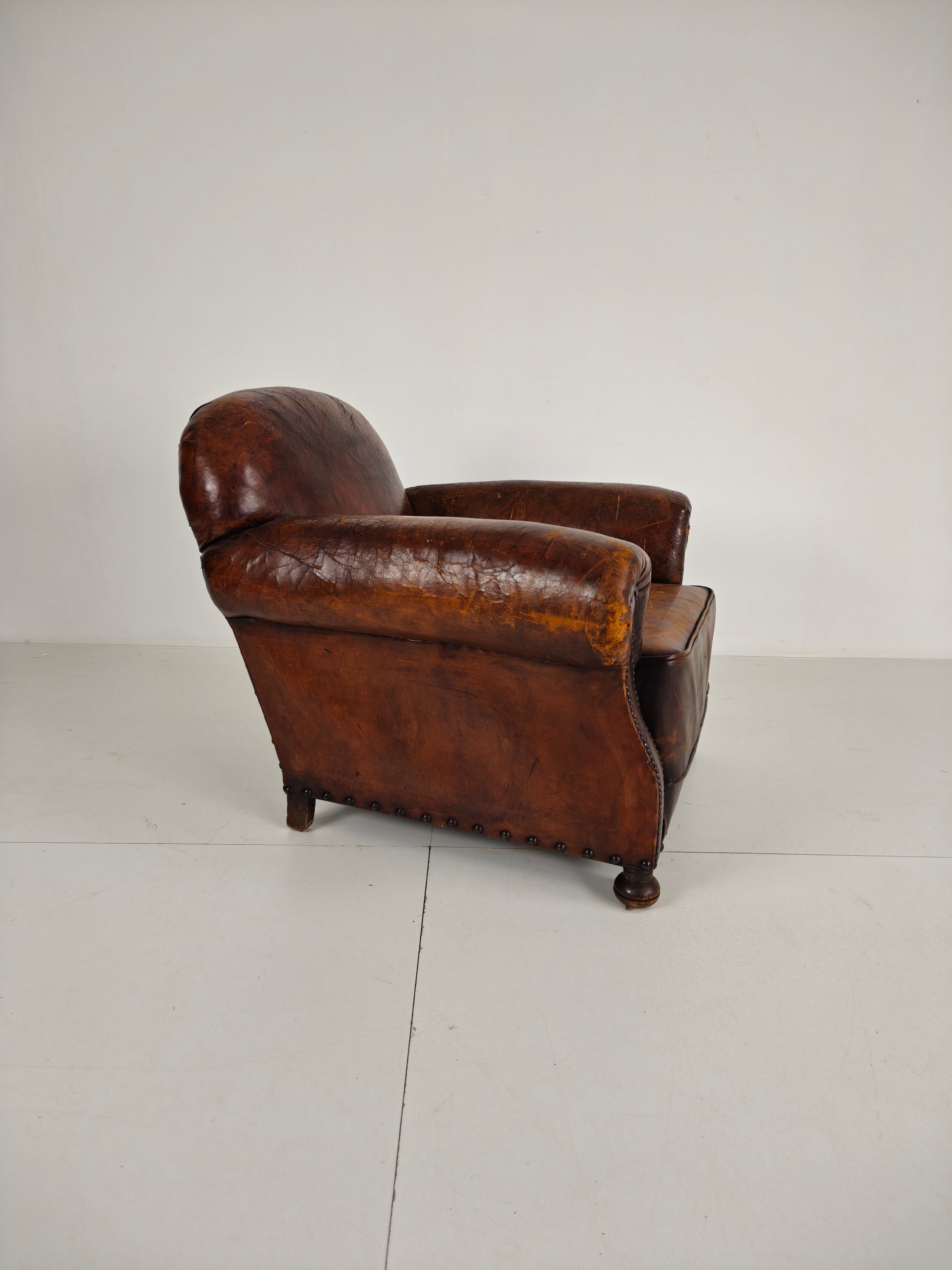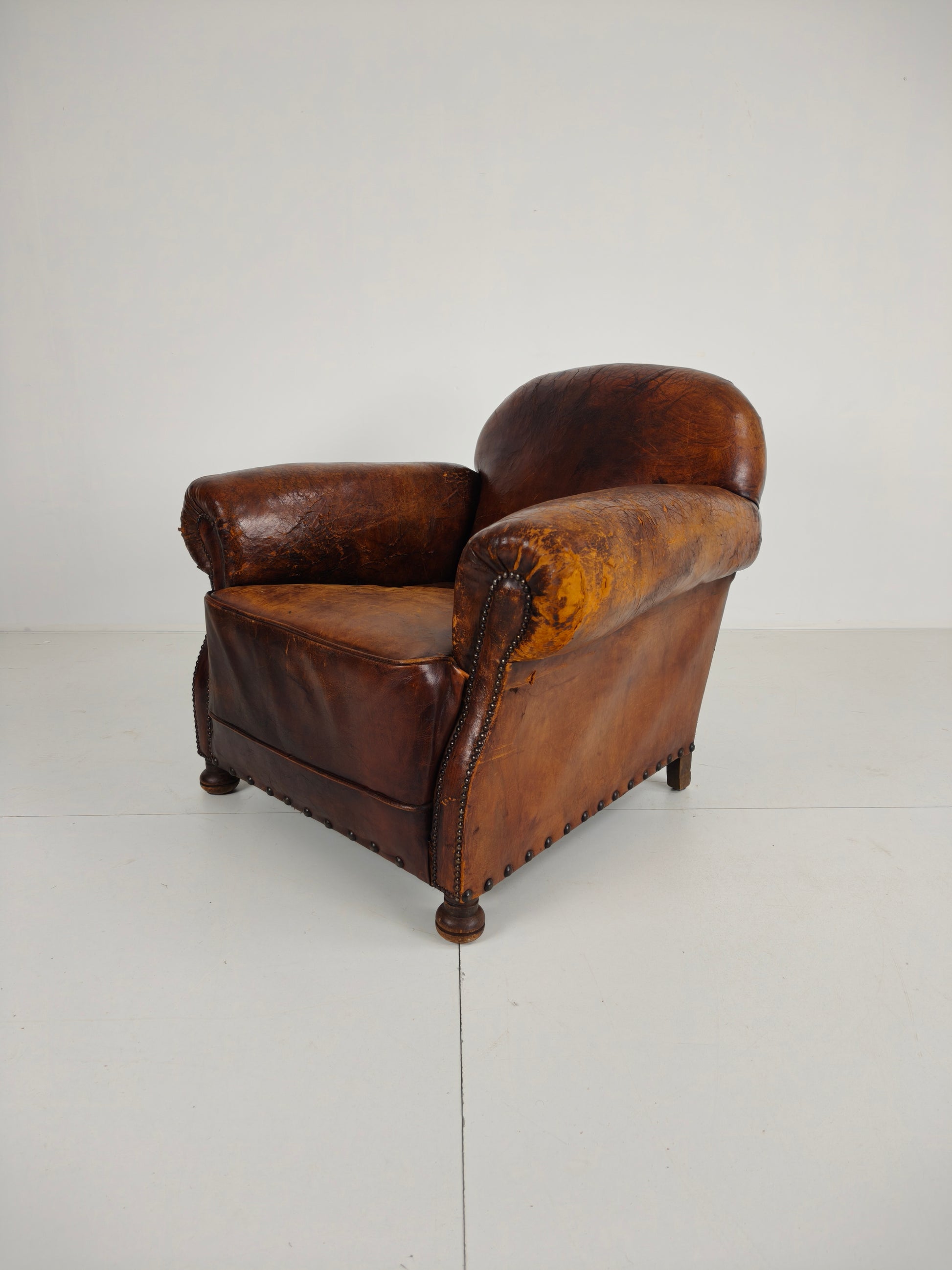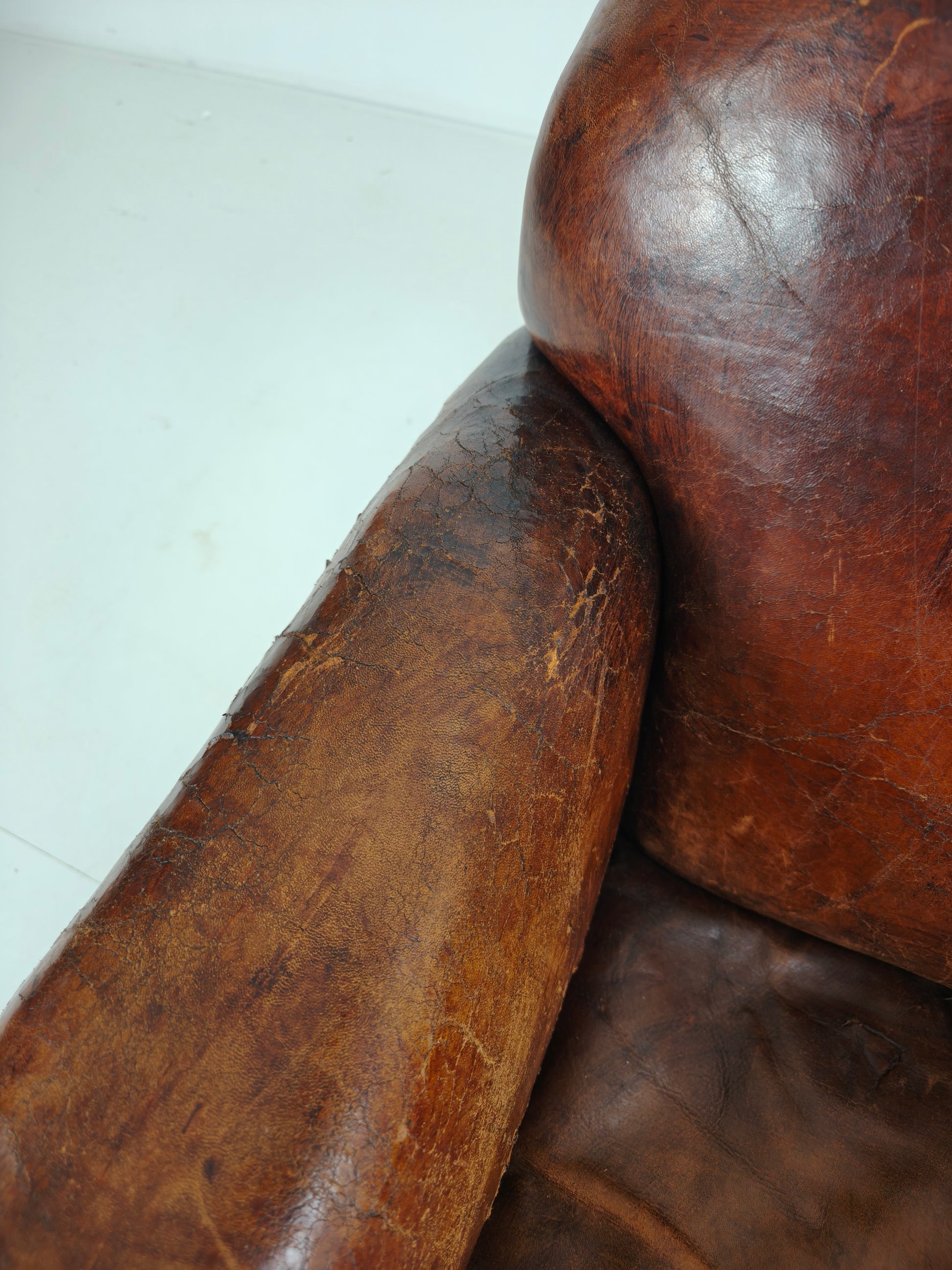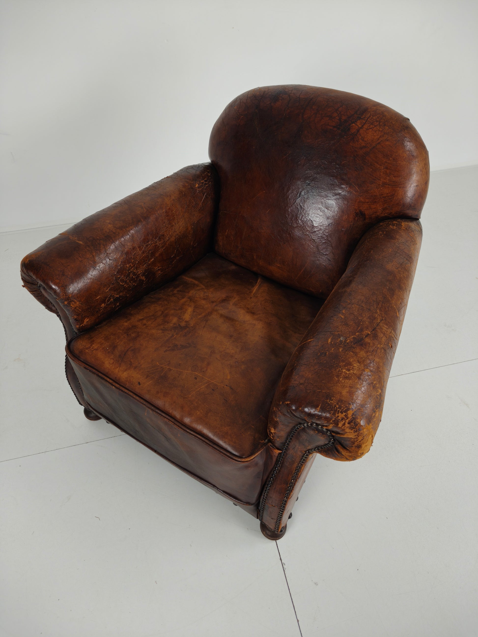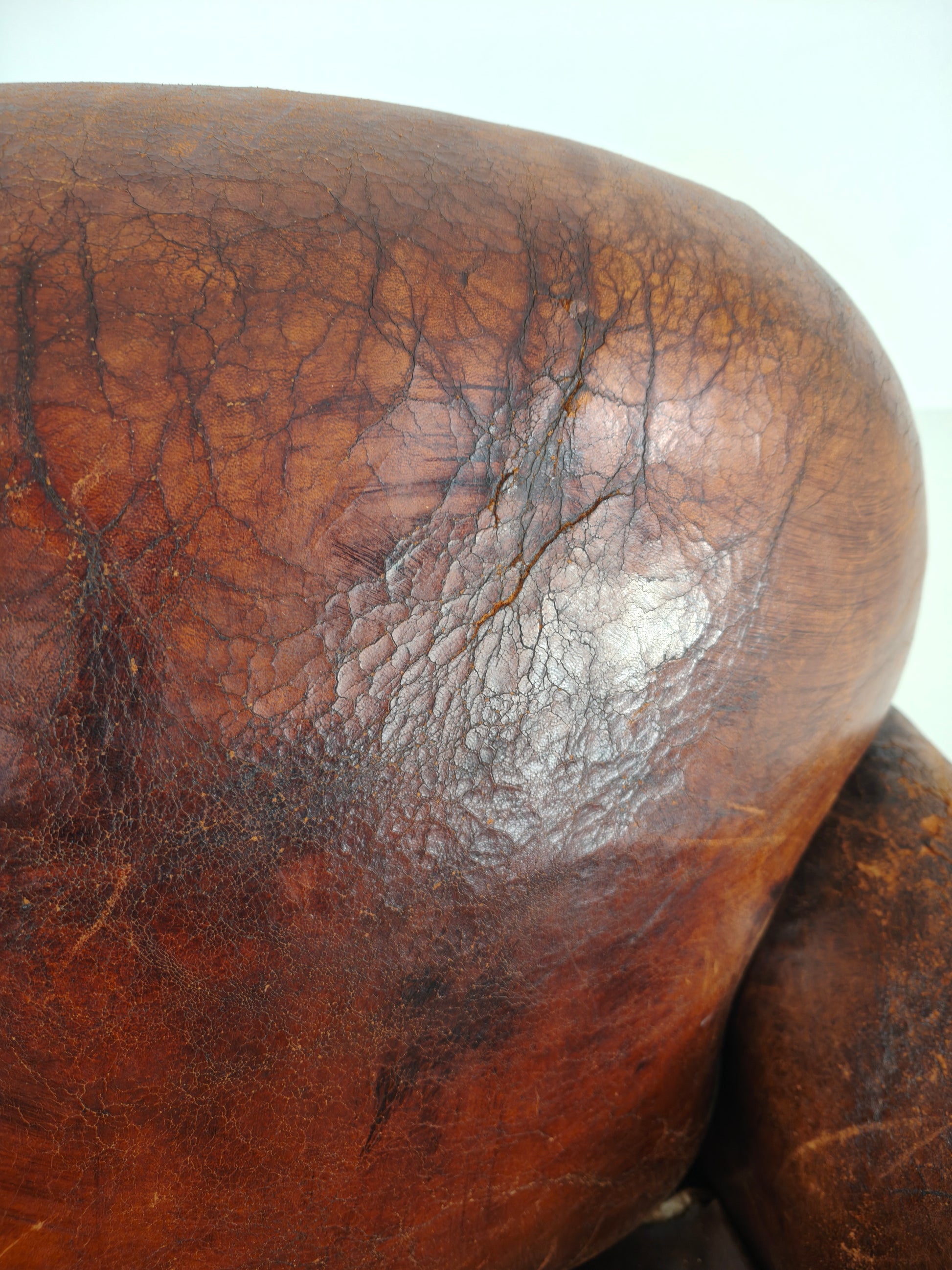 This beautifully aged antique sheepskin leather club chair has a charming, weathered appearance that adds character and warmth to any interior. With its generous proportions and comfortable seating, it invites you to relax in style.