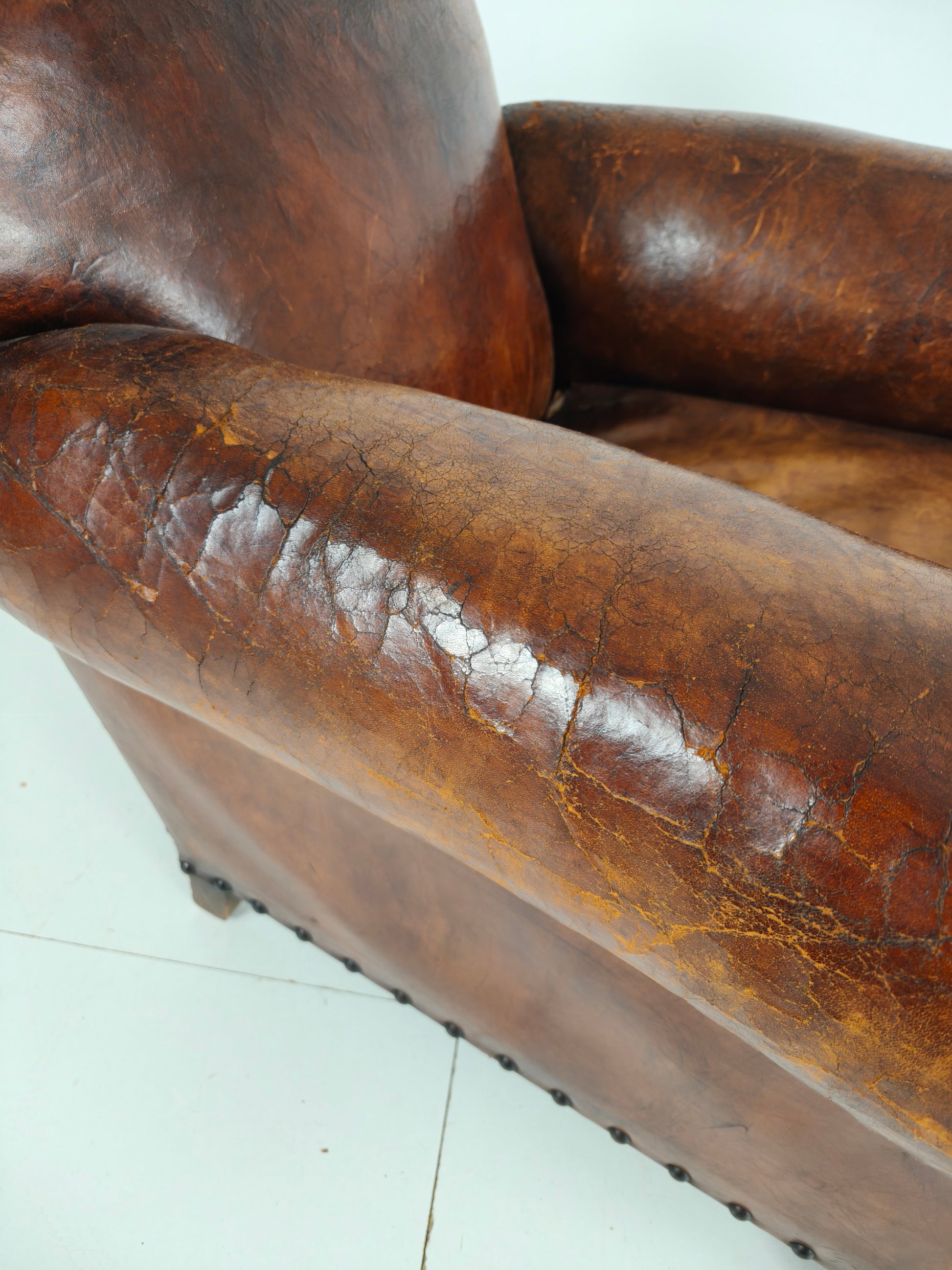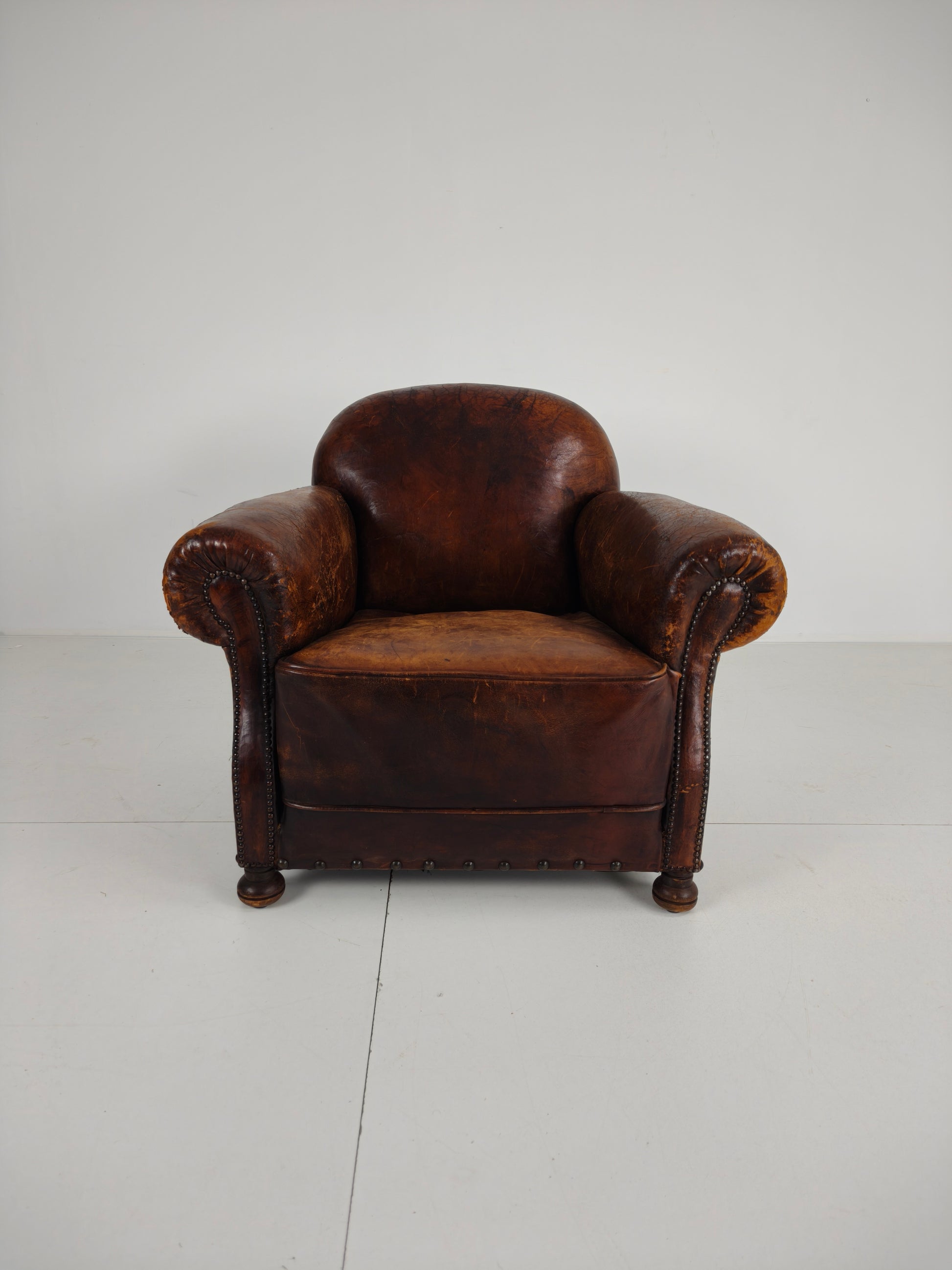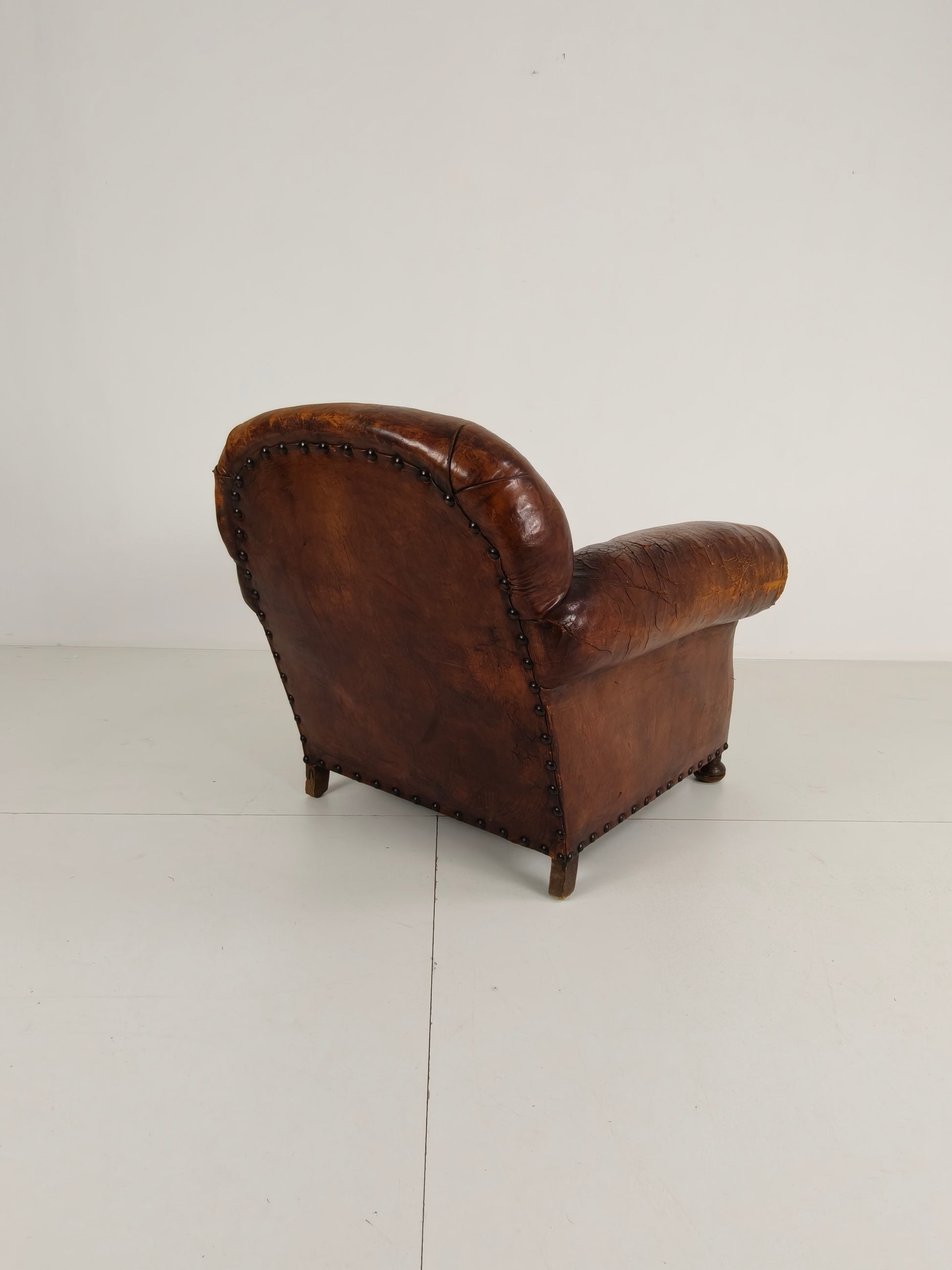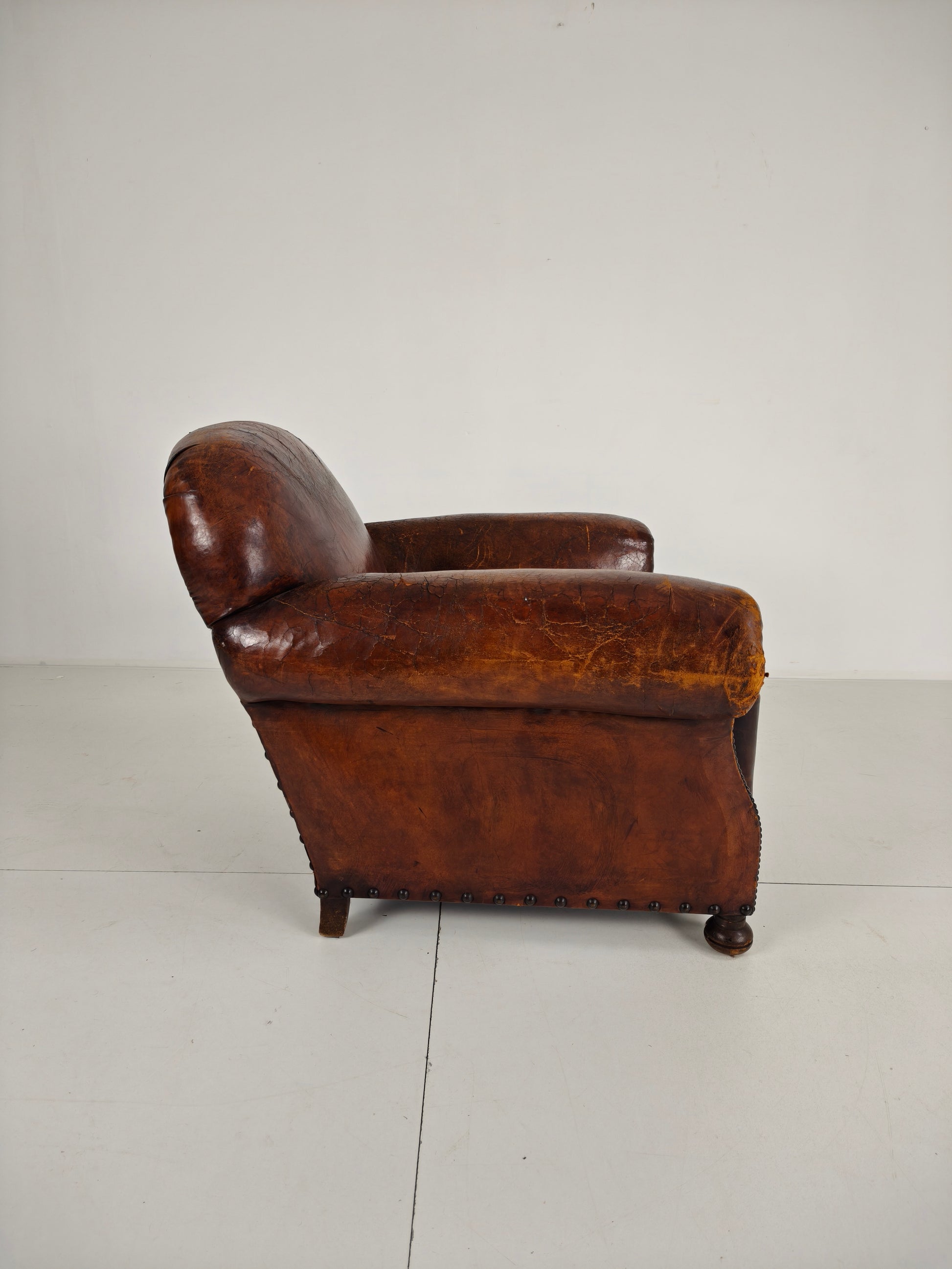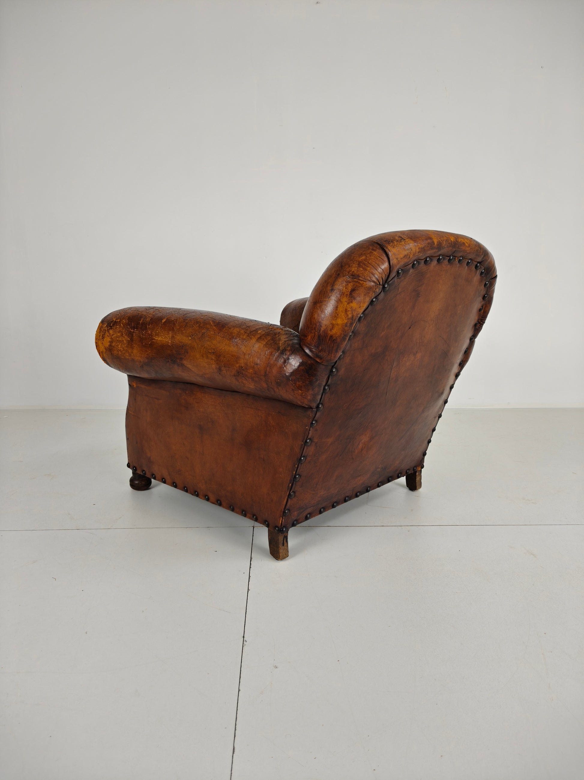 This beautifully aged antique sheepskin leather club chair has a charming, weathered appearance that adds character and warmth to any interior. With its generous proportions and comfortable seating, it invites you to relax in style.