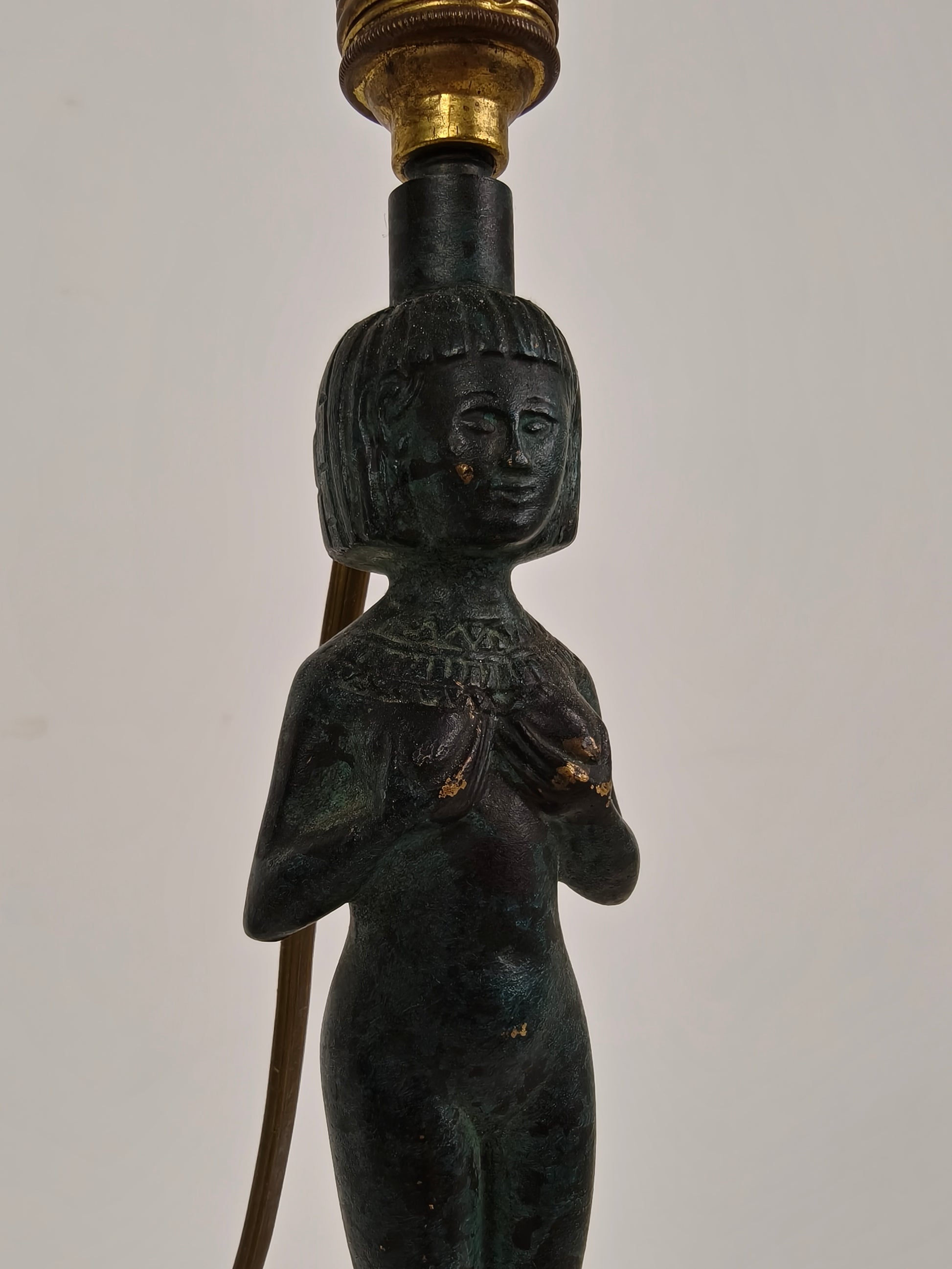 A charming and decorative bronze table lamp featuring a finely detailed lady in elegant Egyptian style. This exquisite piece is of a subtle, small size, perfect for adding a refined, historical touch to any interior.
