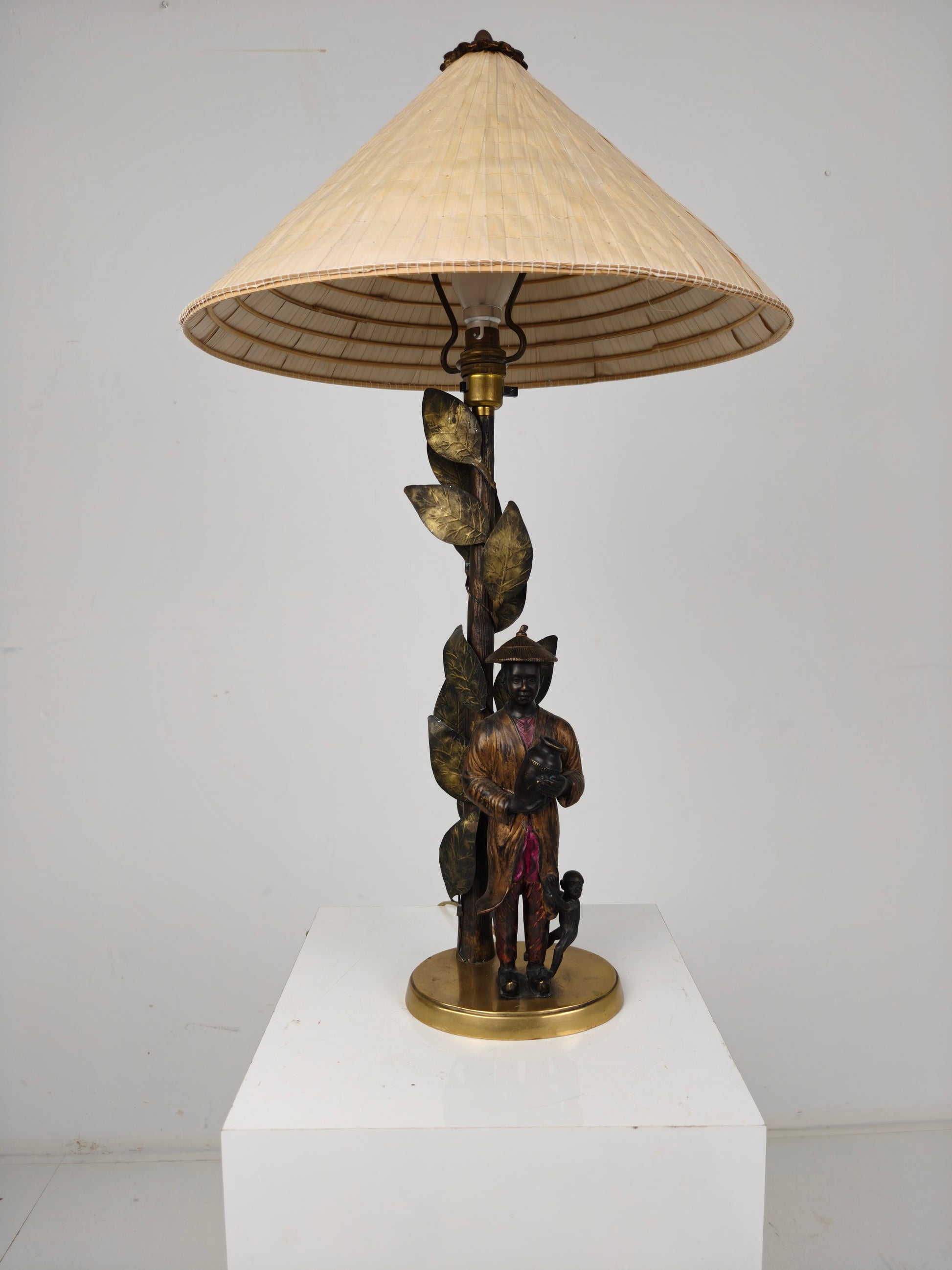 An exquisite Chinoiserie bronze table lamp featuring a charming scene of a young boy with a monkey beside a finely detailed tree with leaves. This decorative piece showcases exceptional craftsmanship and artistry from the 1940/1950 20th century.