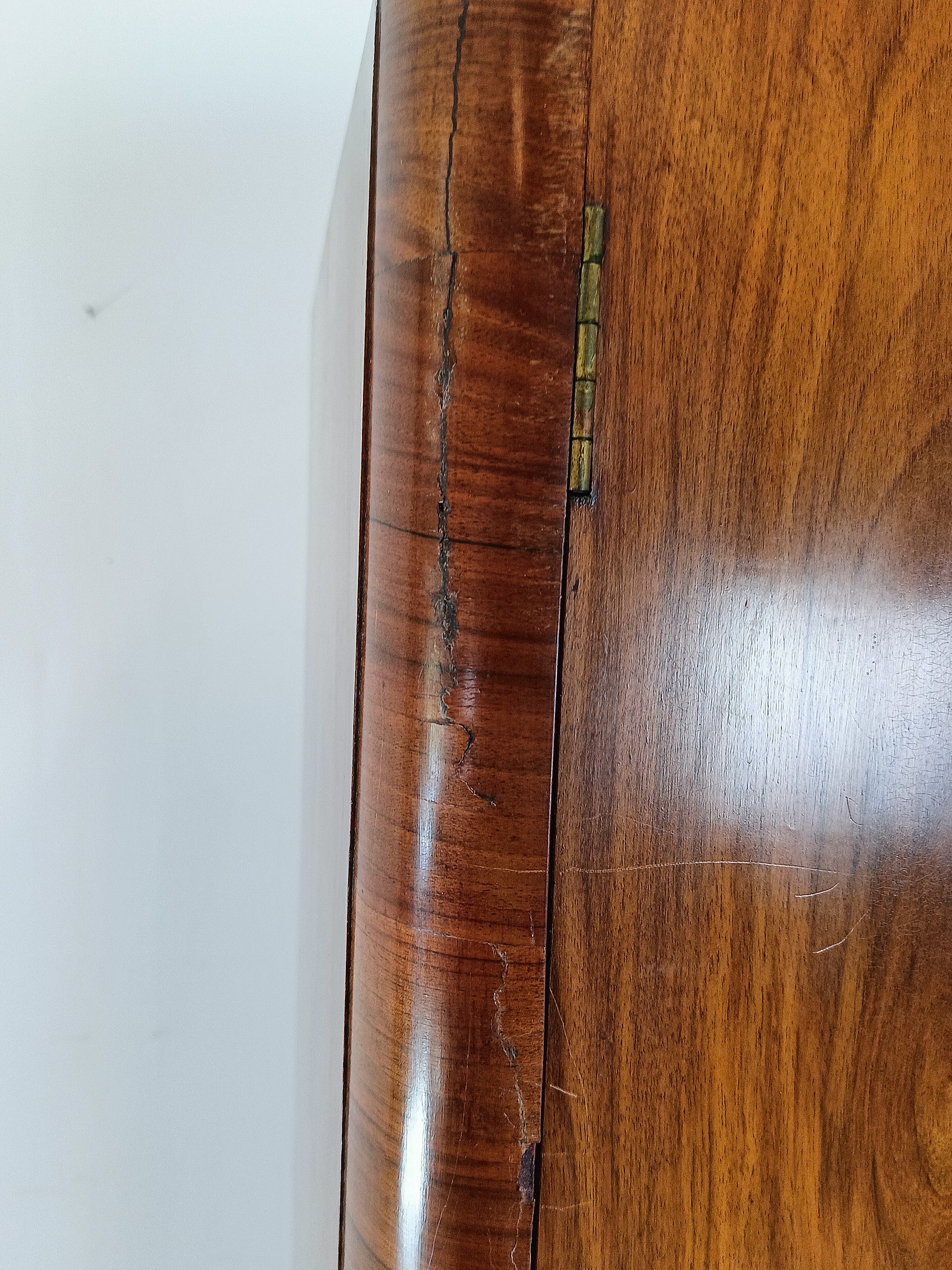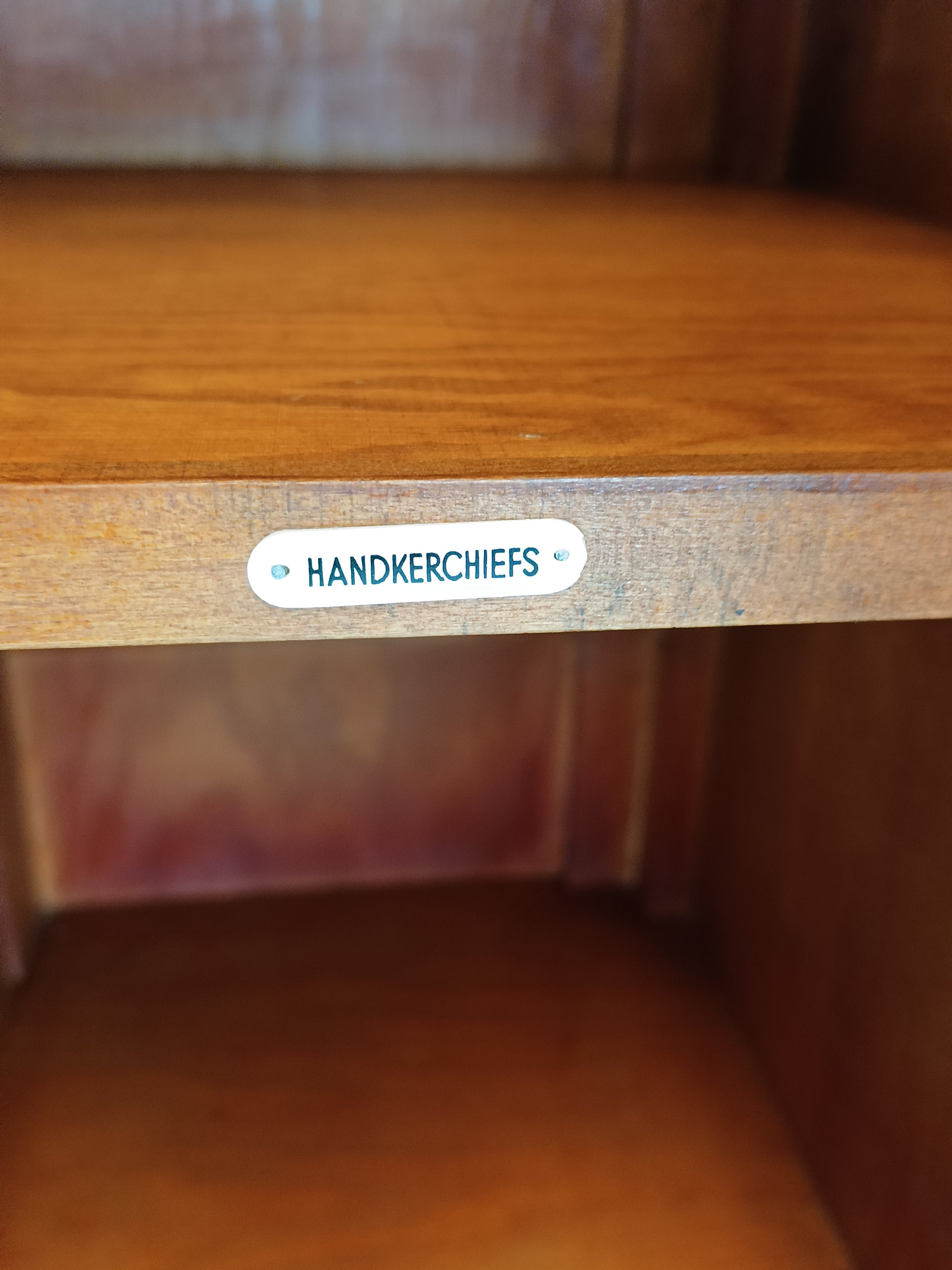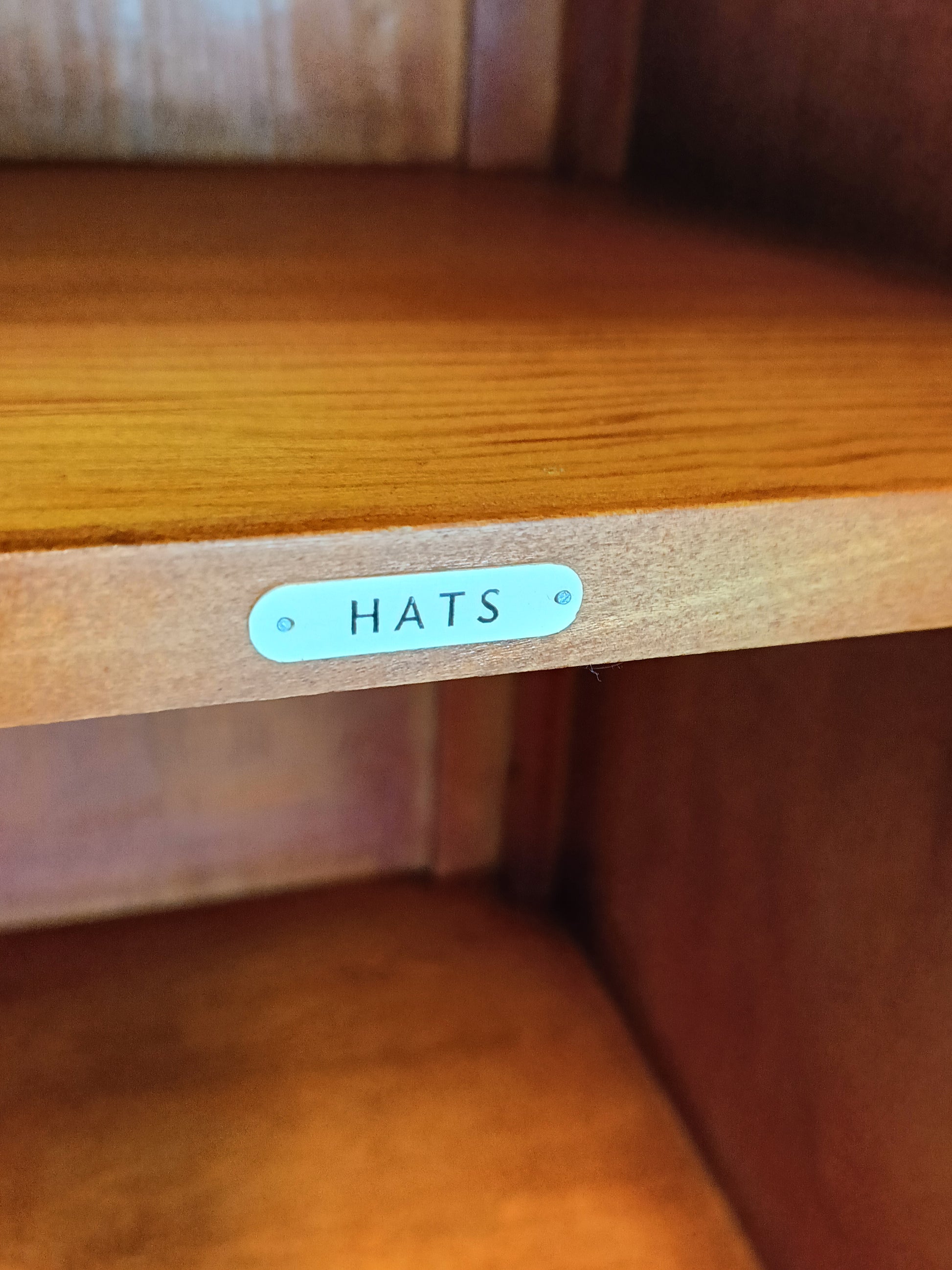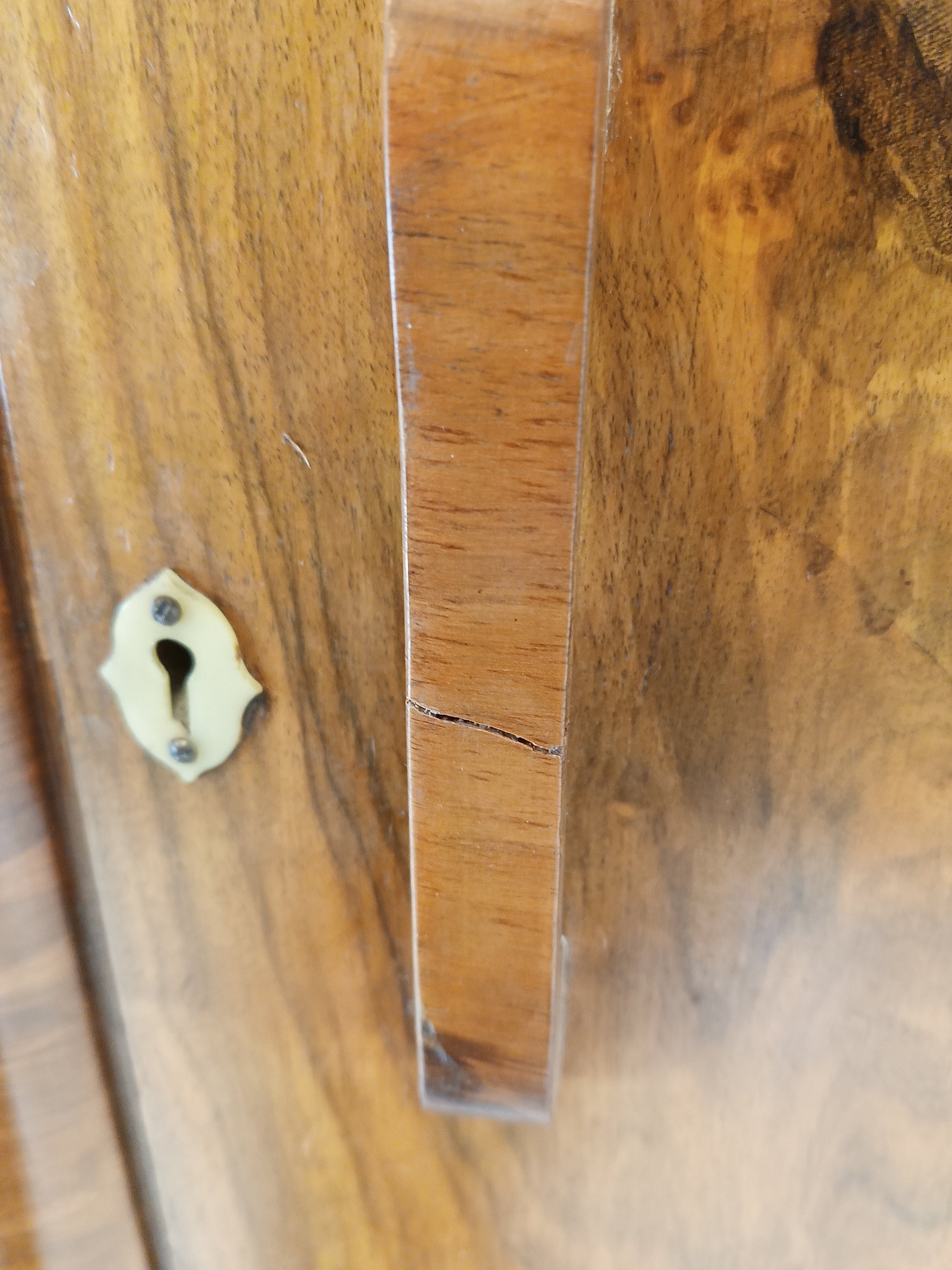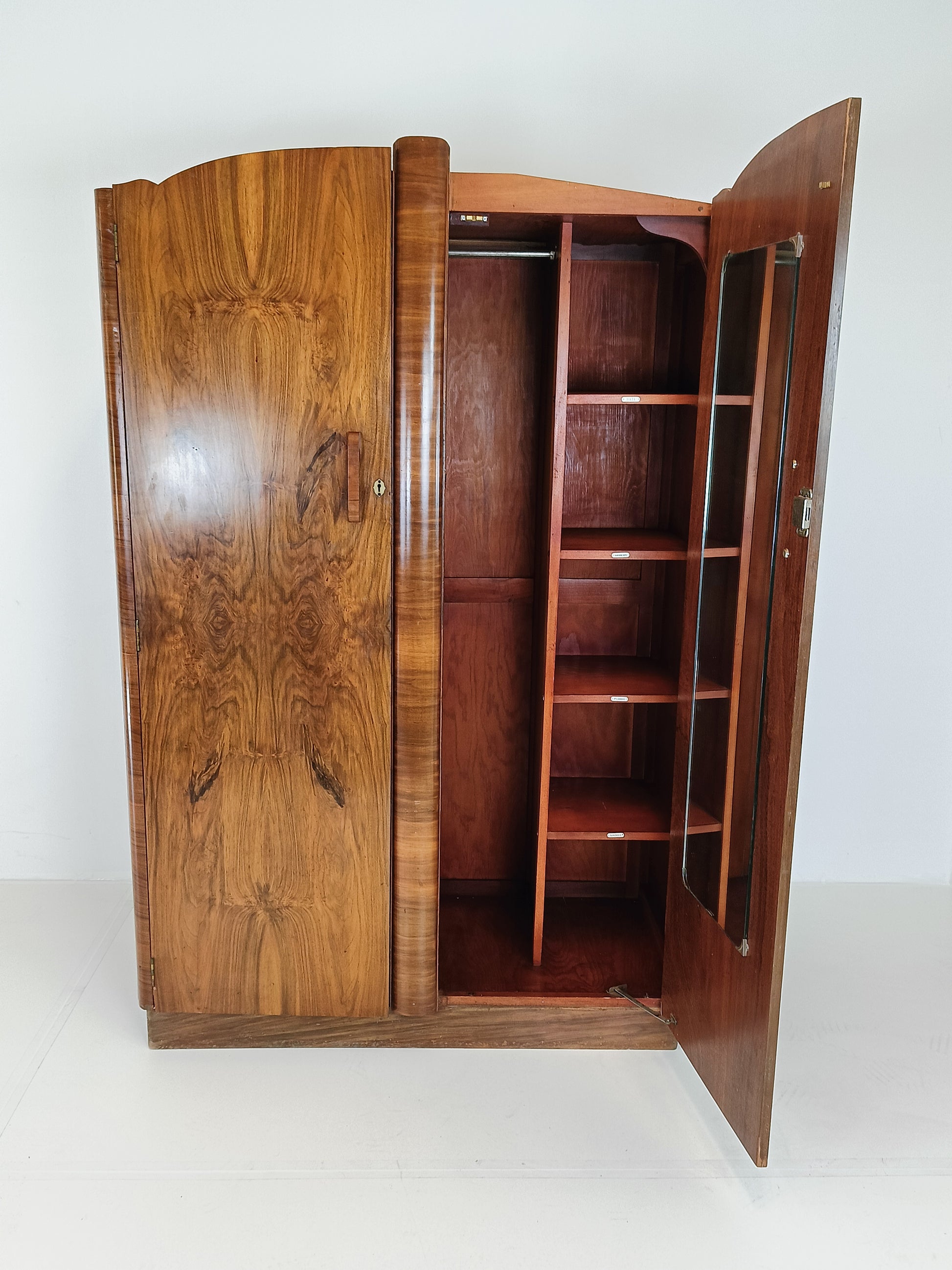 Small size English Art Deco wardrobe. The cabinet has a sleek design but is at the same time elegantly finished with burl walnut veneer. With a handy, compact interior layout with compartments on the right side and an extendable rod on the left.With labels including HATS
