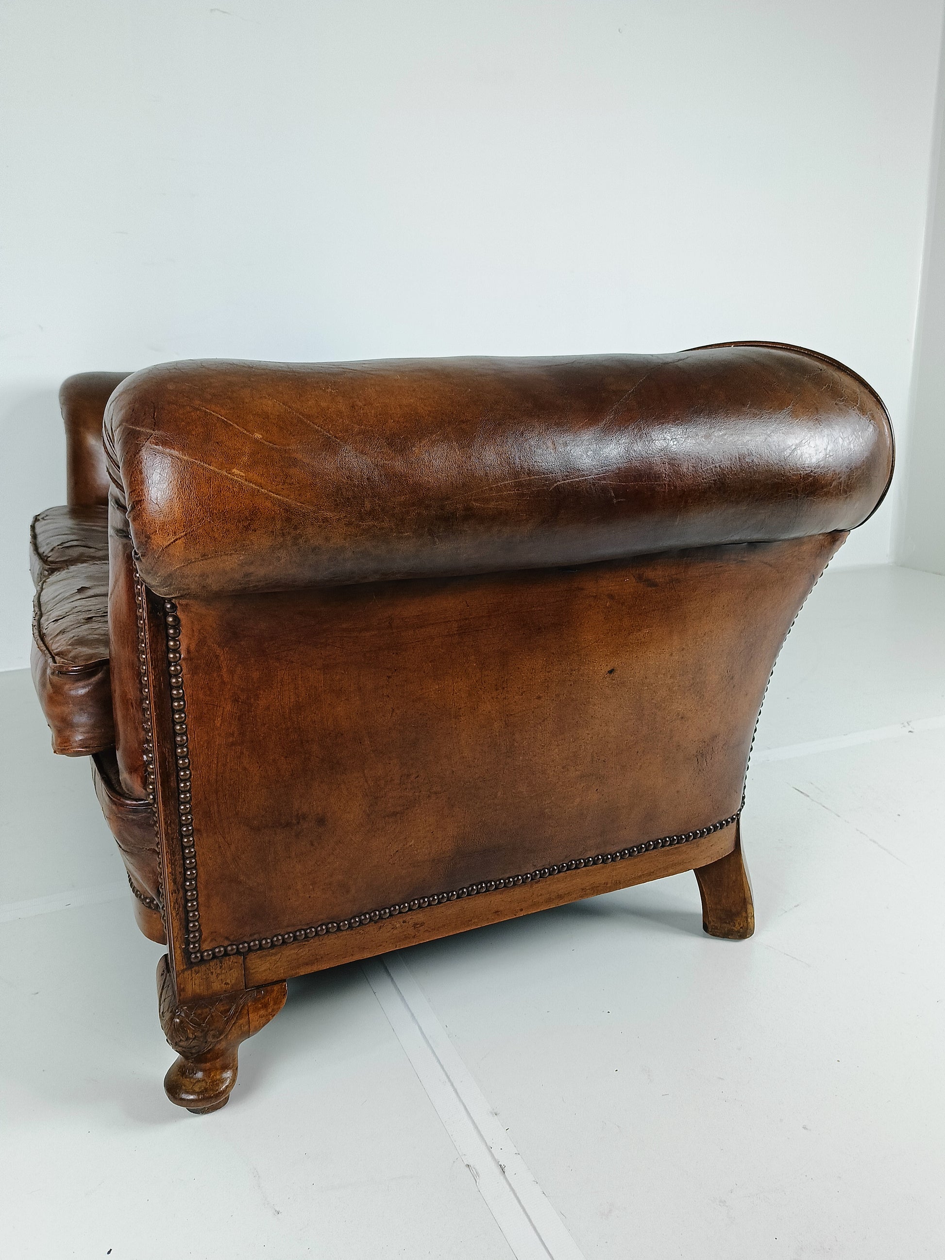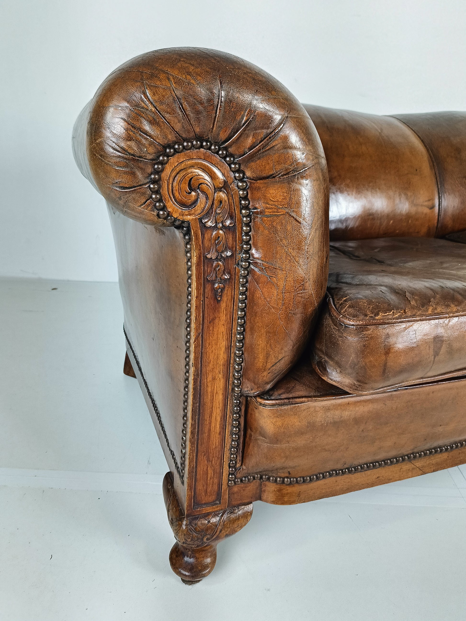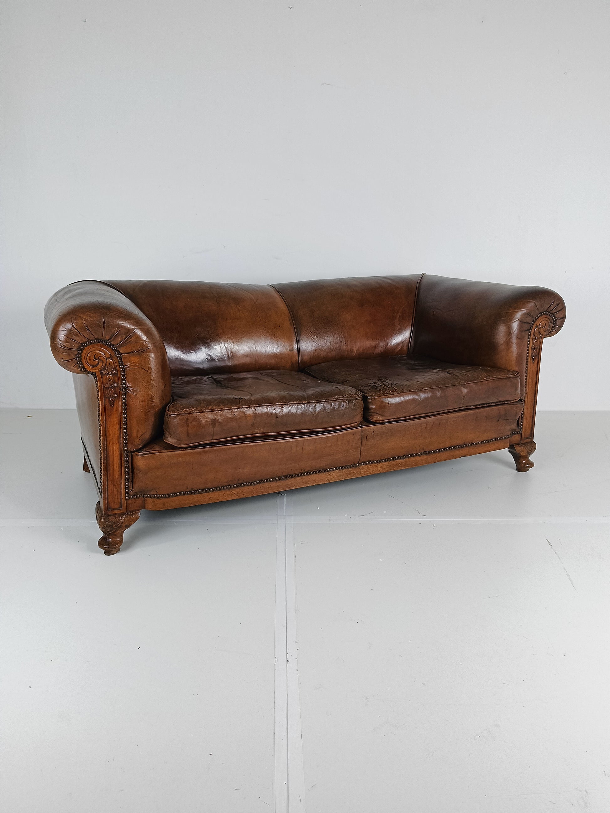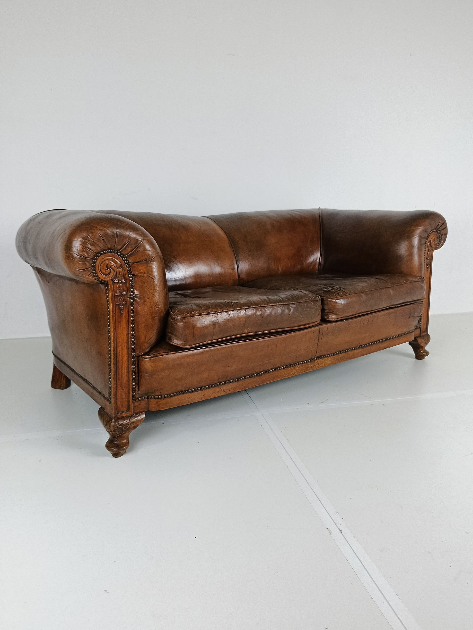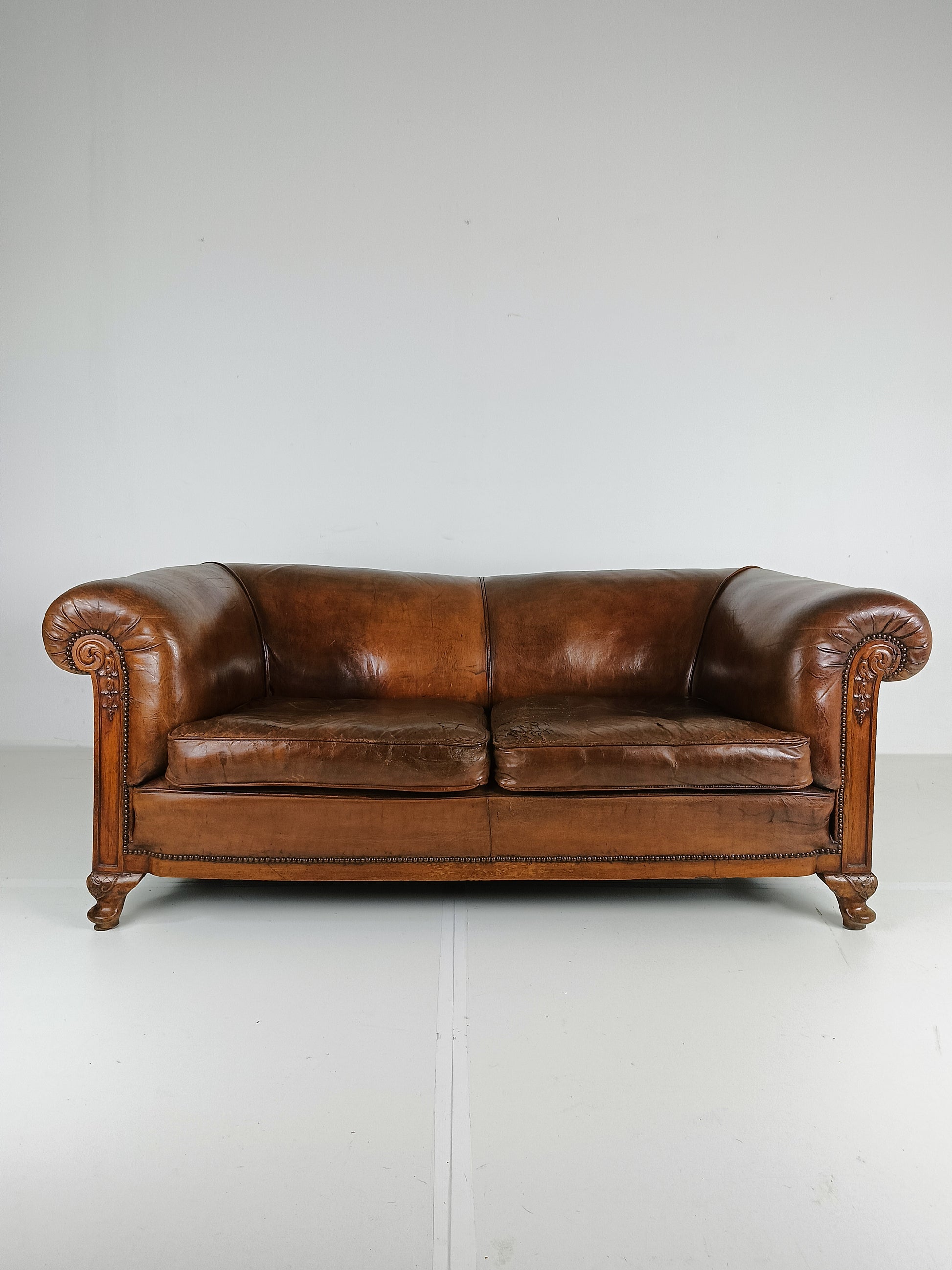 Experience luxury and warmth with this exquisite sheep leather sofa, designed to blend comfort with timeless elegance. The supple sheep leather has developed a rich patina, adding character and depth that only improves with age. The sofa's hand-carved wooden legs showcase intricate craftsmanship, offering a hint of old-world charm. Perfect for refined interiors, this sofa brings both sophistication and inviting comfort, making it an eye-catching centerpiece for any living room or lounge space. Has signs of wear consistant with age and use. Circa 1920's.