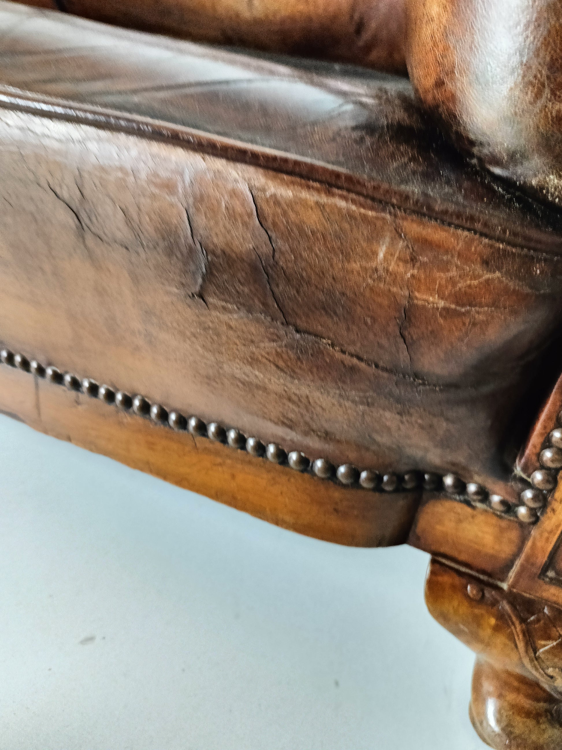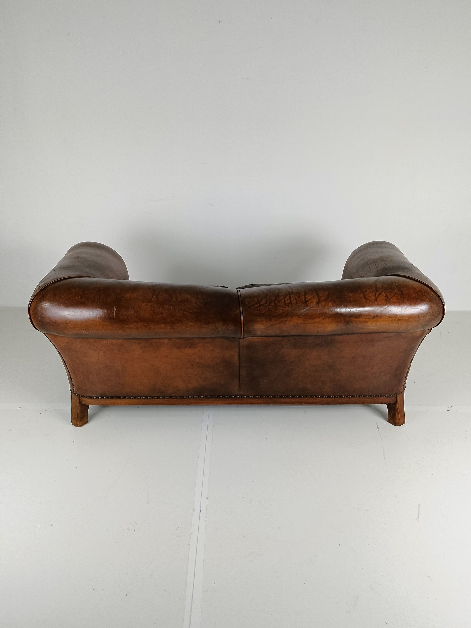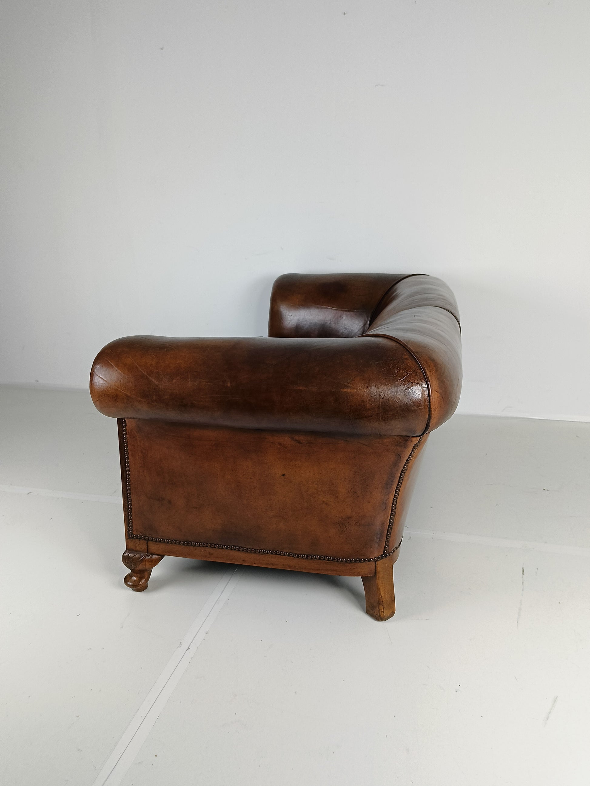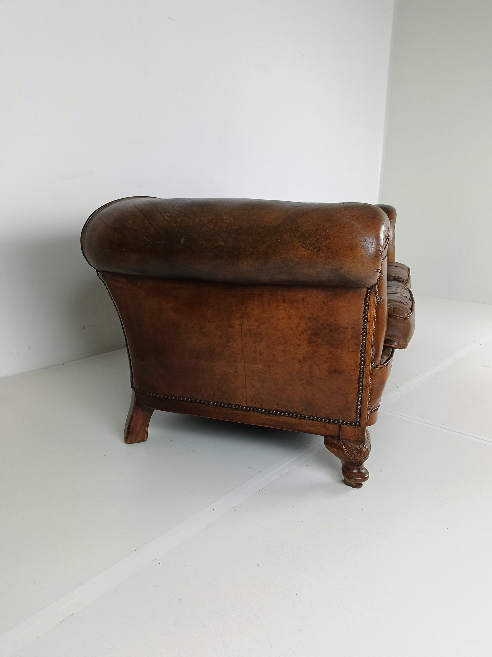 Experience luxury and warmth with this exquisite sheep leather sofa, designed to blend comfort with timeless elegance. The supple sheep leather has developed a rich patina, adding character and depth that only improves with age. The sofa's hand-carved wooden legs showcase intricate craftsmanship, offering a hint of old-world charm. Perfect for refined interiors, this sofa brings both sophistication and inviting comfort, making it an eye-catching centerpiece for any living room or lounge space. Has signs of wear consistant with age and use. Circa 1920's.
