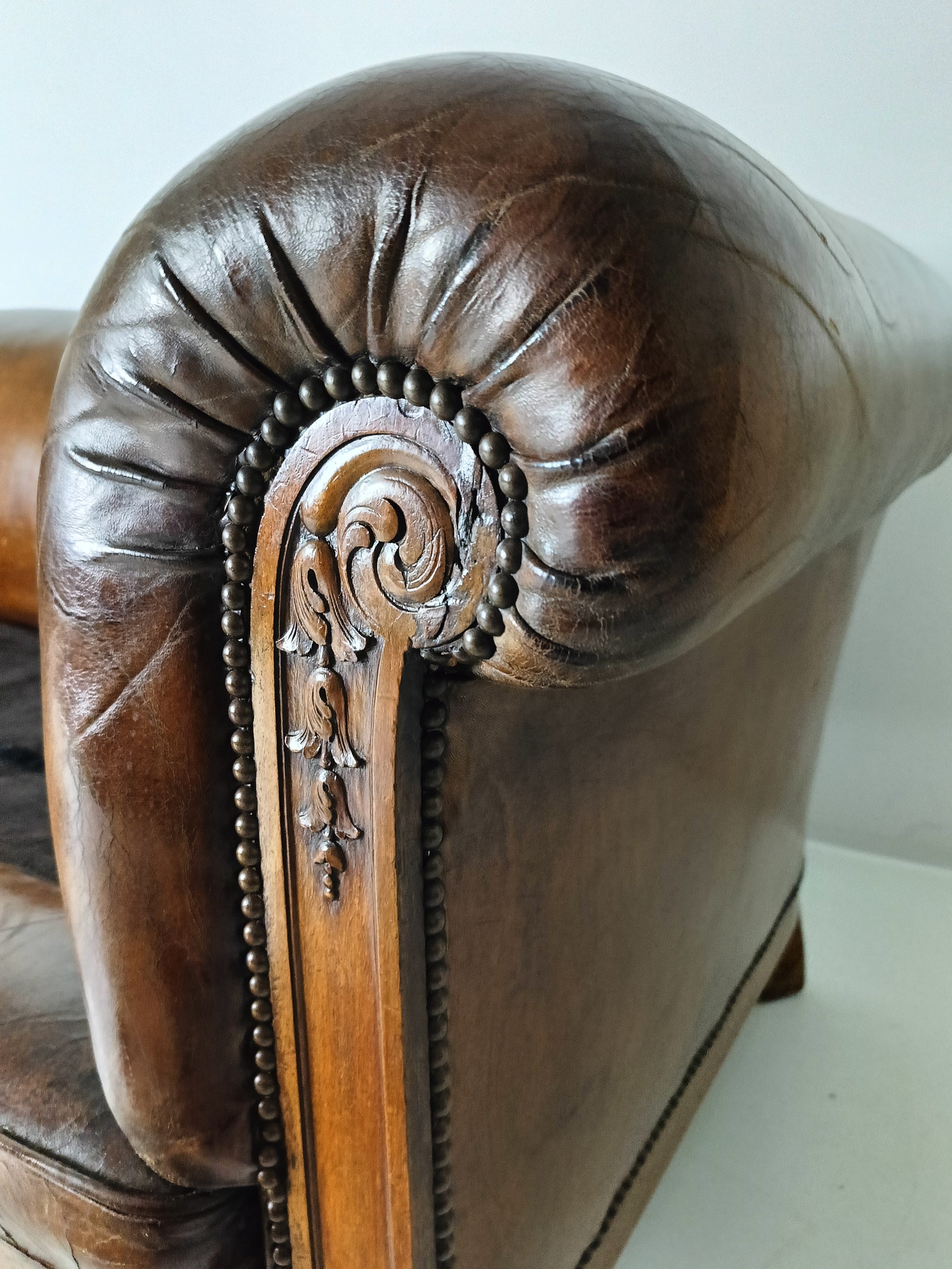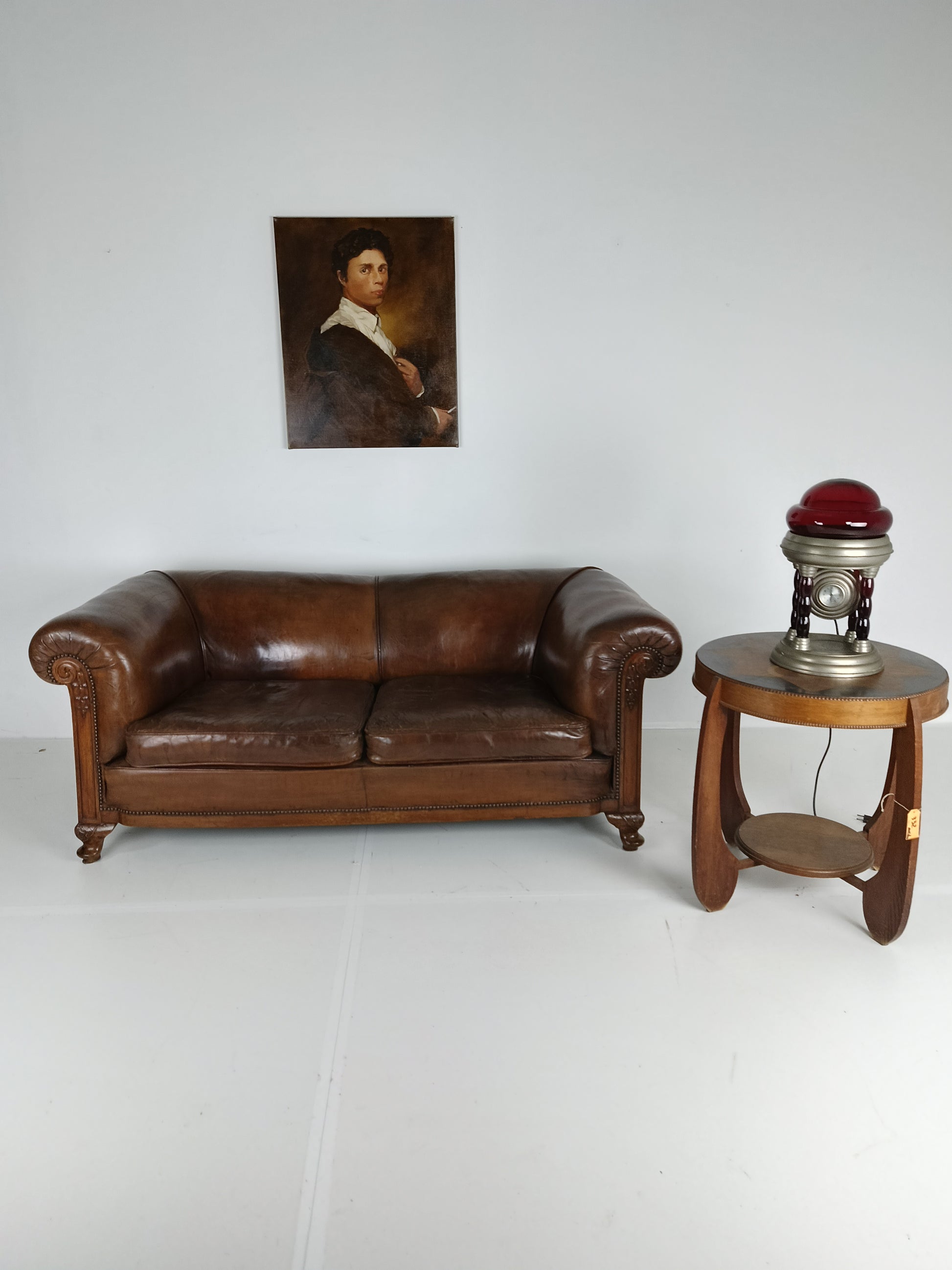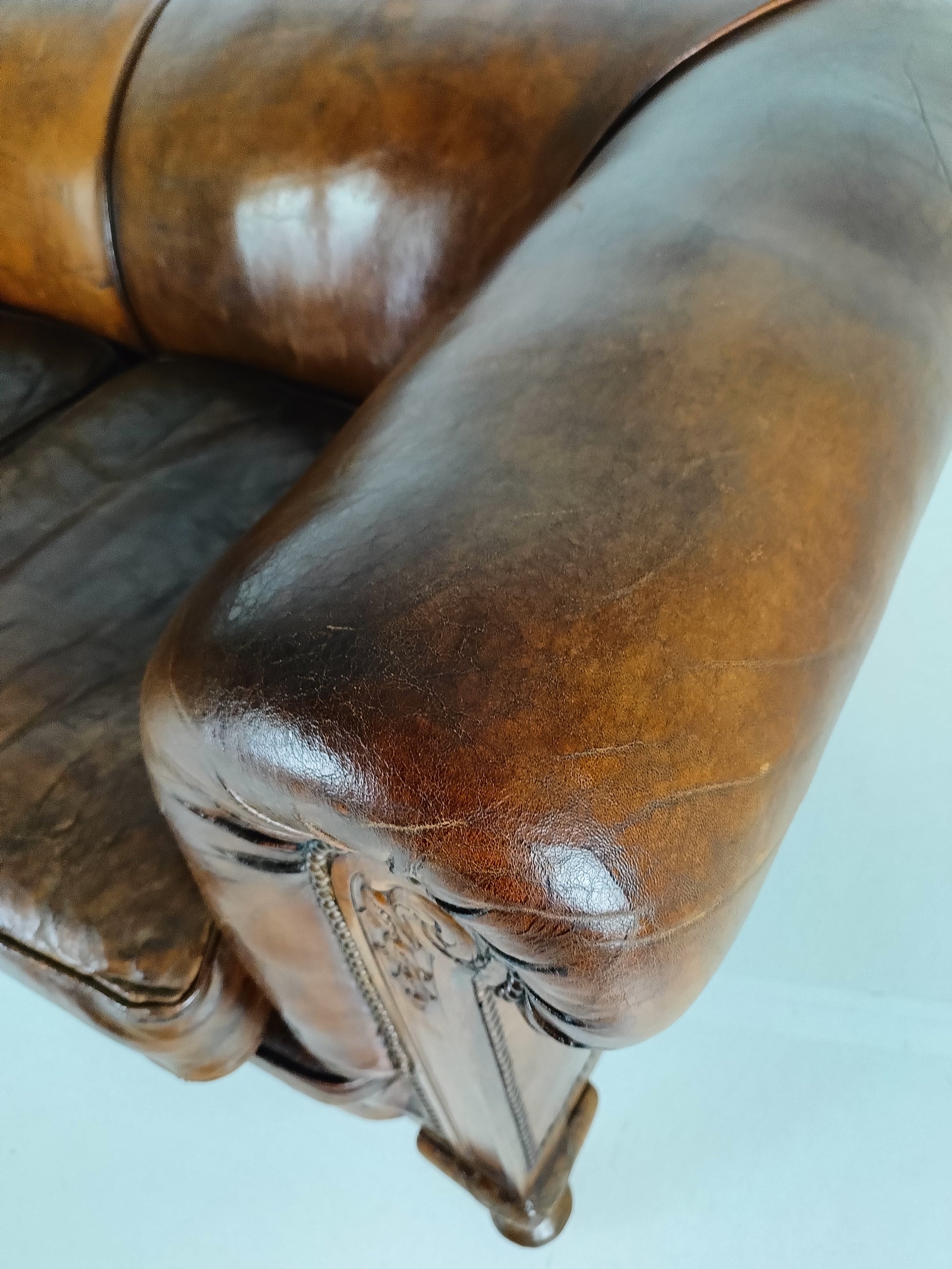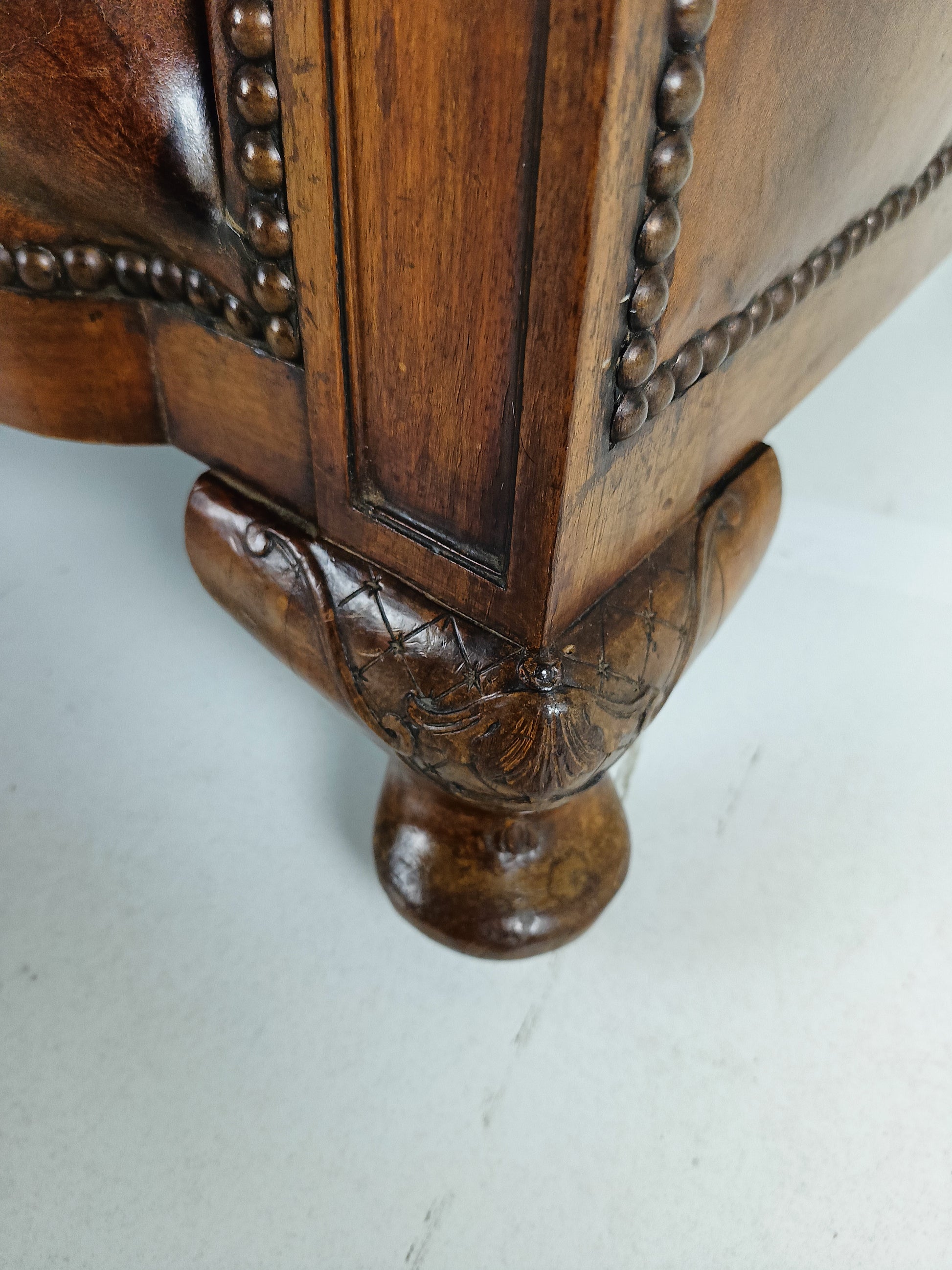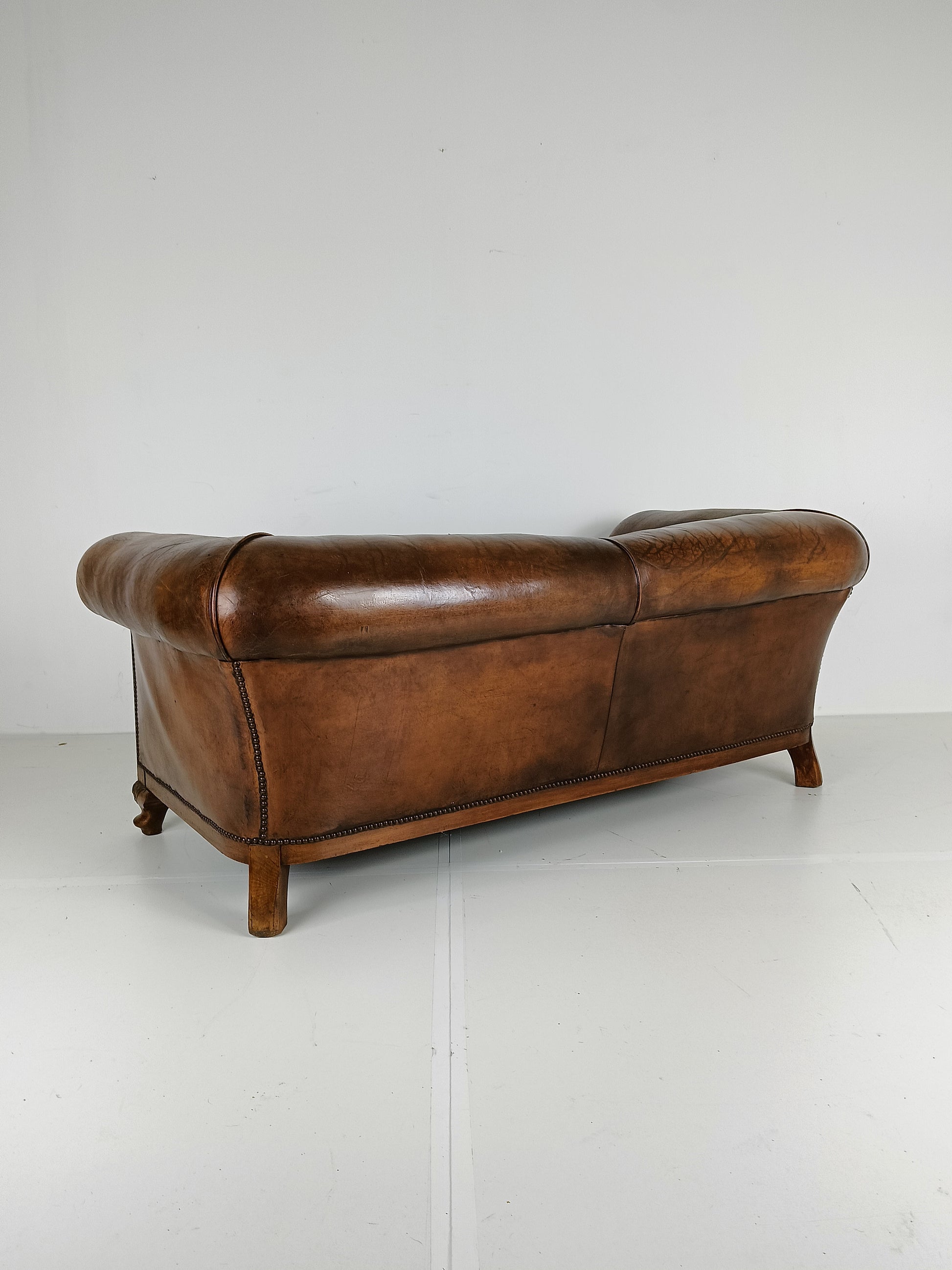 Experience luxury and warmth with this exquisite sheep leather sofa, designed to blend comfort with timeless elegance. The supple sheep leather has developed a rich patina, adding character and depth that only improves with age. The sofa's hand-carved wooden legs showcase intricate craftsmanship, offering a hint of old-world charm. Perfect for refined interiors, this sofa brings both sophistication and inviting comfort, making it an eye-catching centerpiece for any living room or lounge space. Has signs of wear consistant with age and use. Circa 1920's.