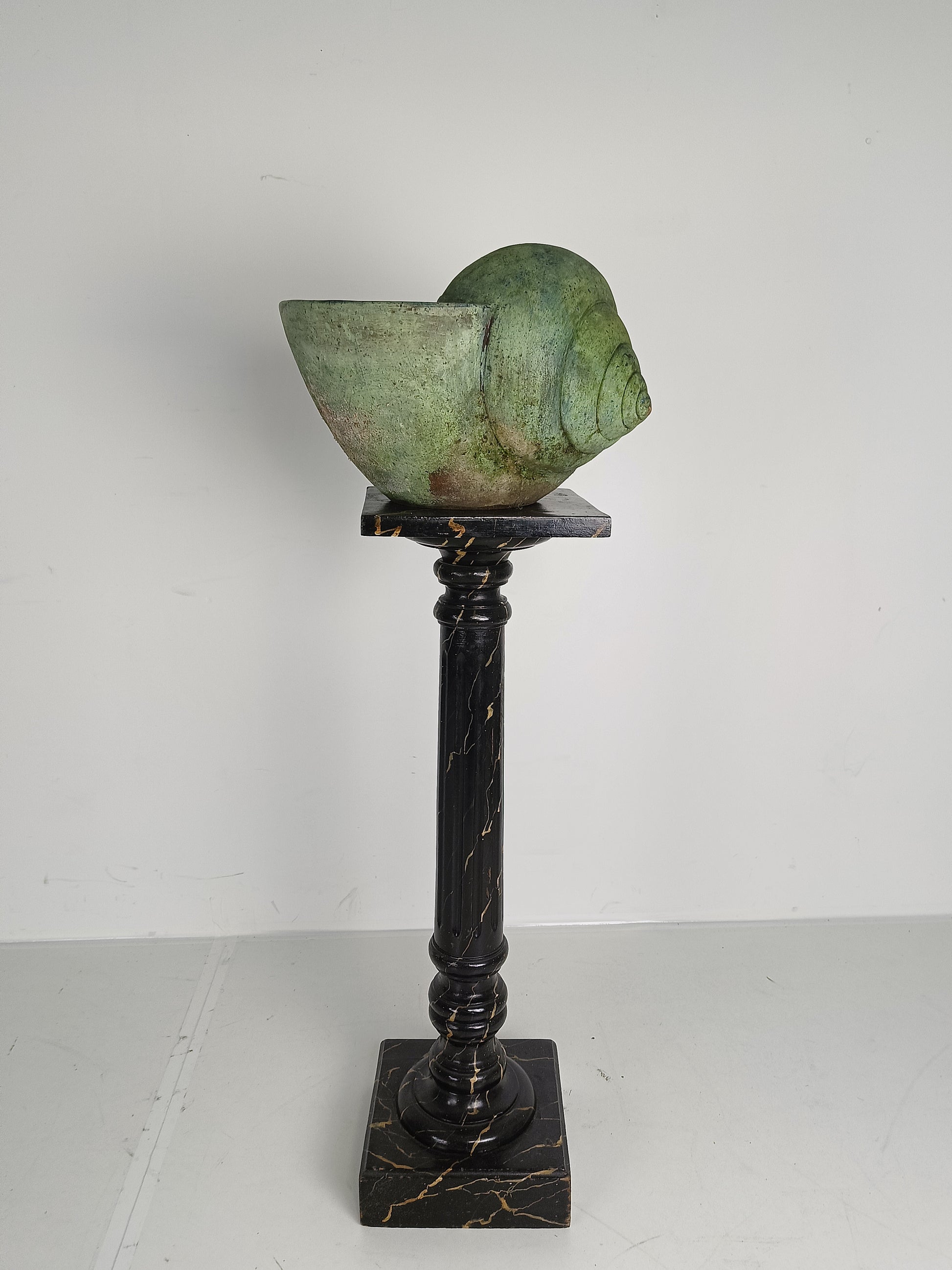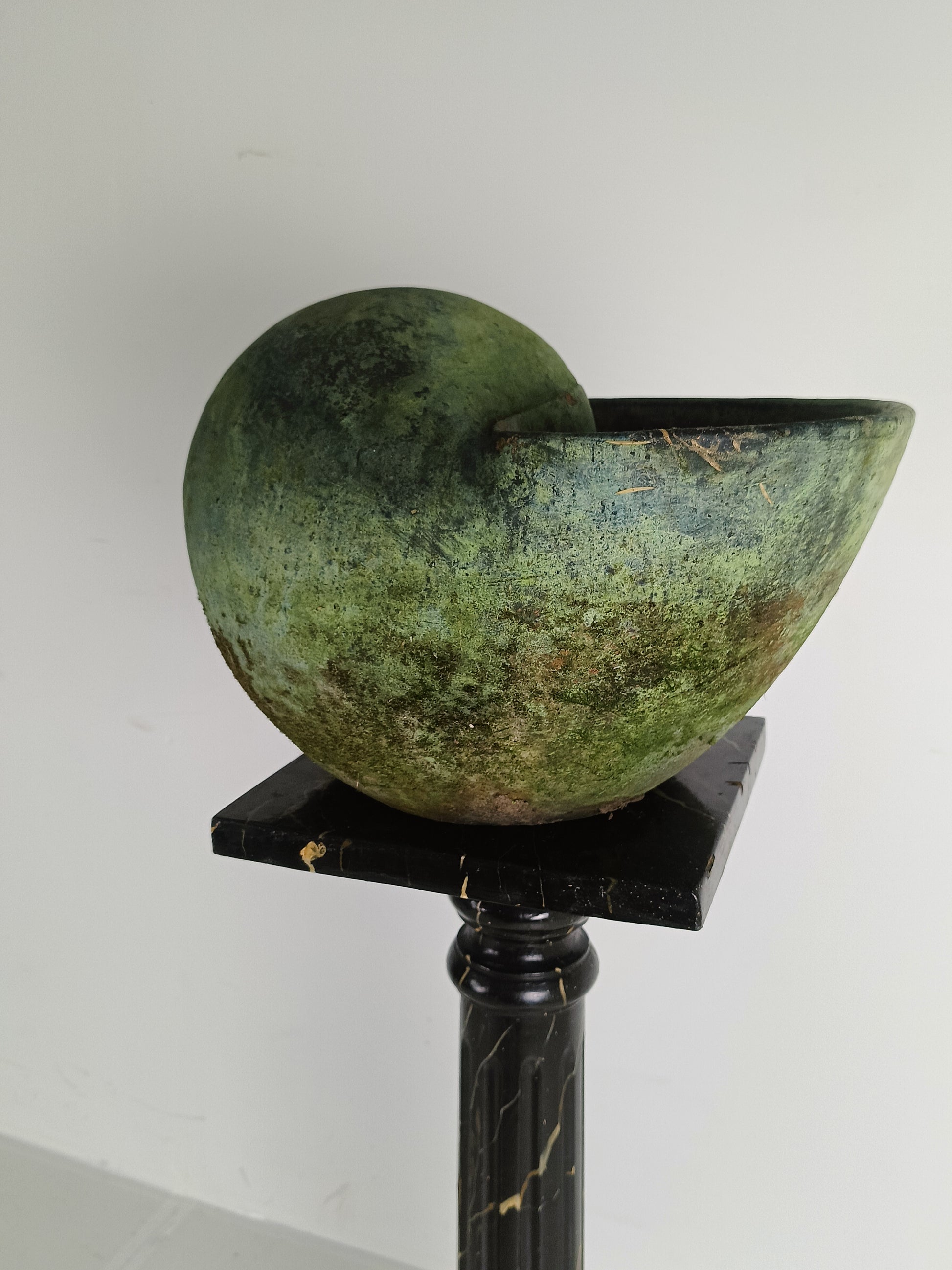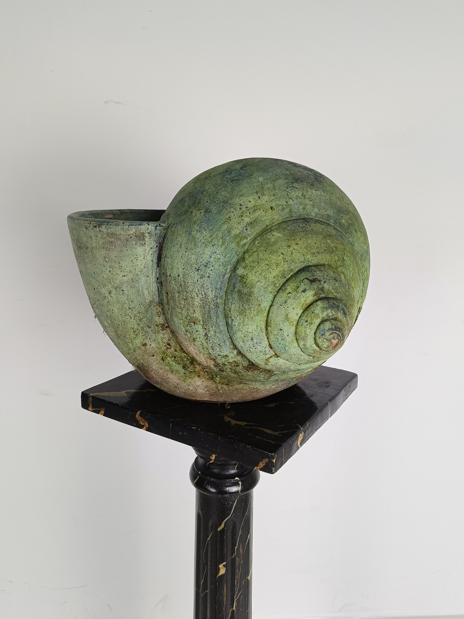 This stunning terracotta cochlea showcases a remarkable patina that enhances its earthy, aged charm. A unique, decorative piece, it embodies timeless craftsmanship and adds a touch of rustic elegance to any space.