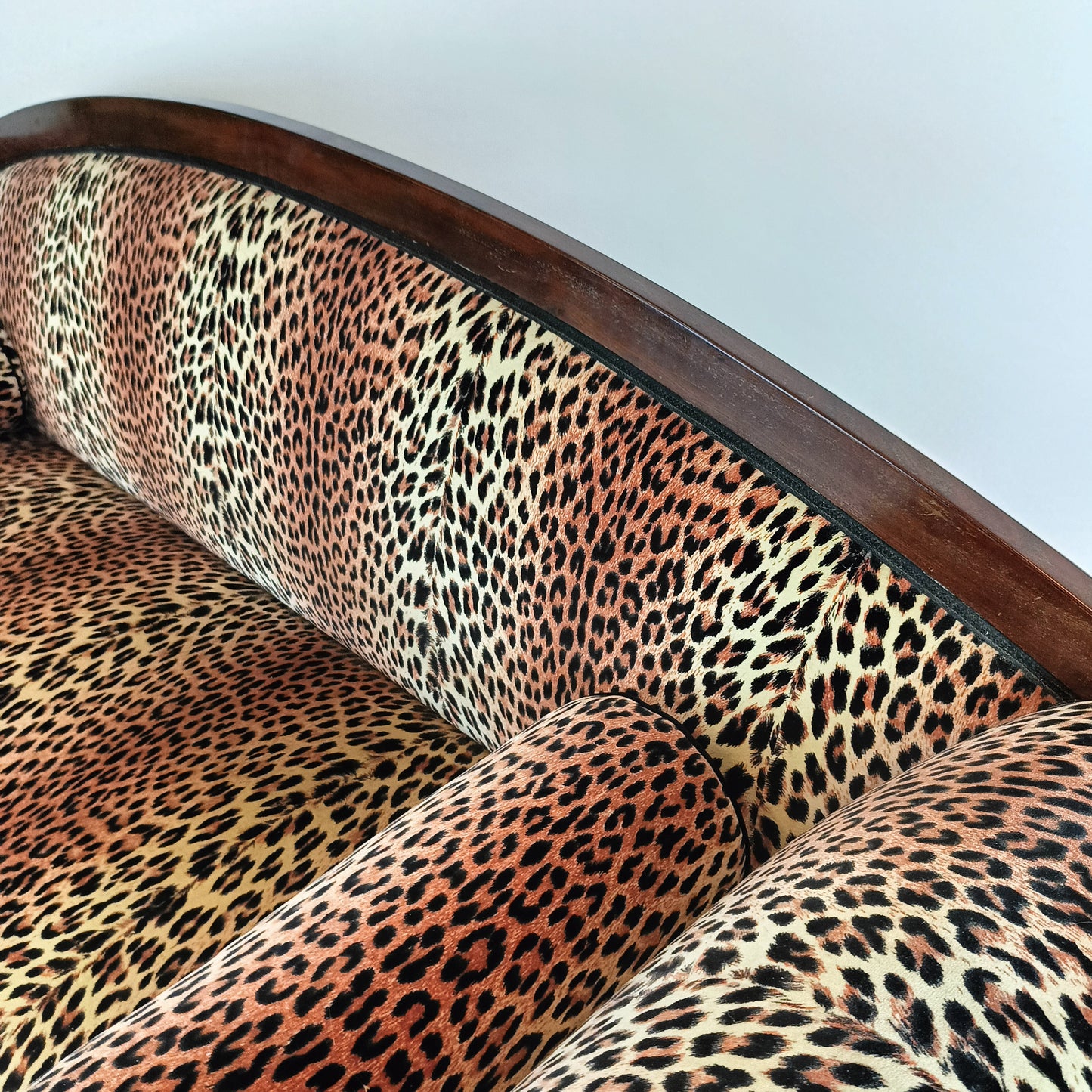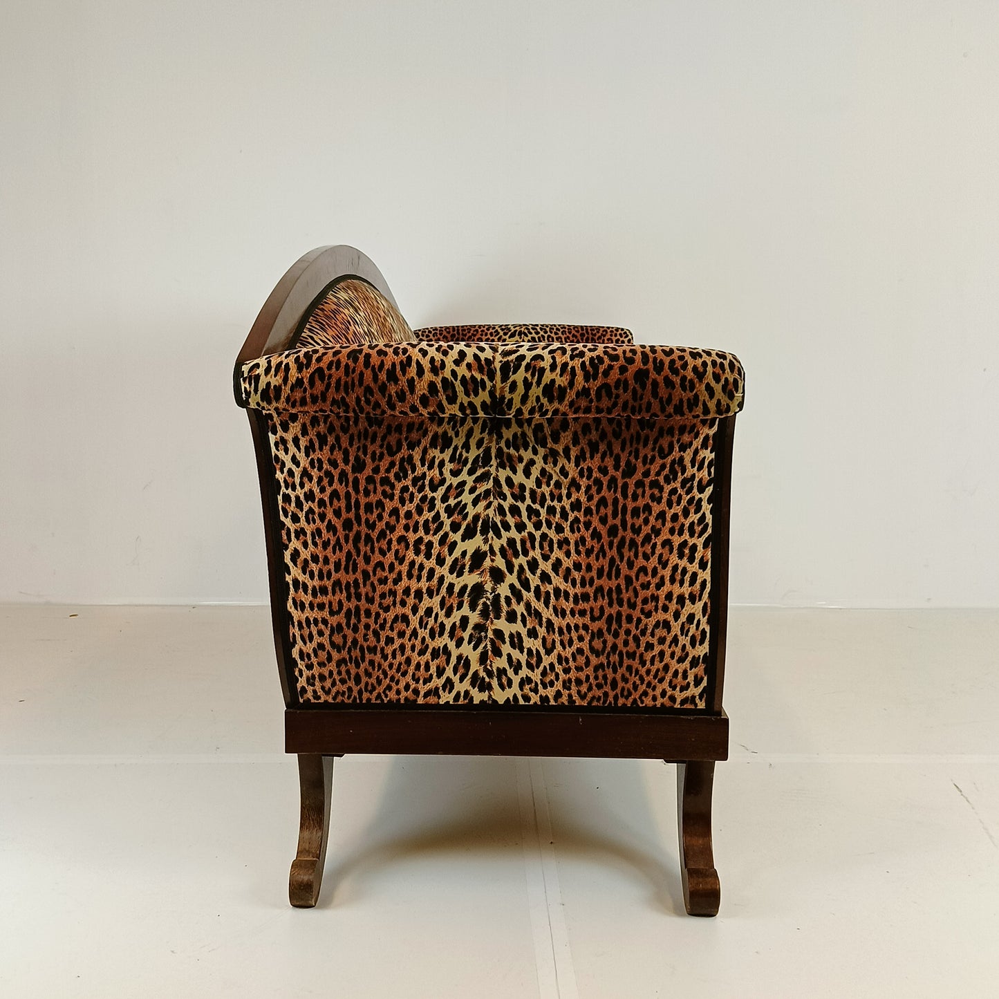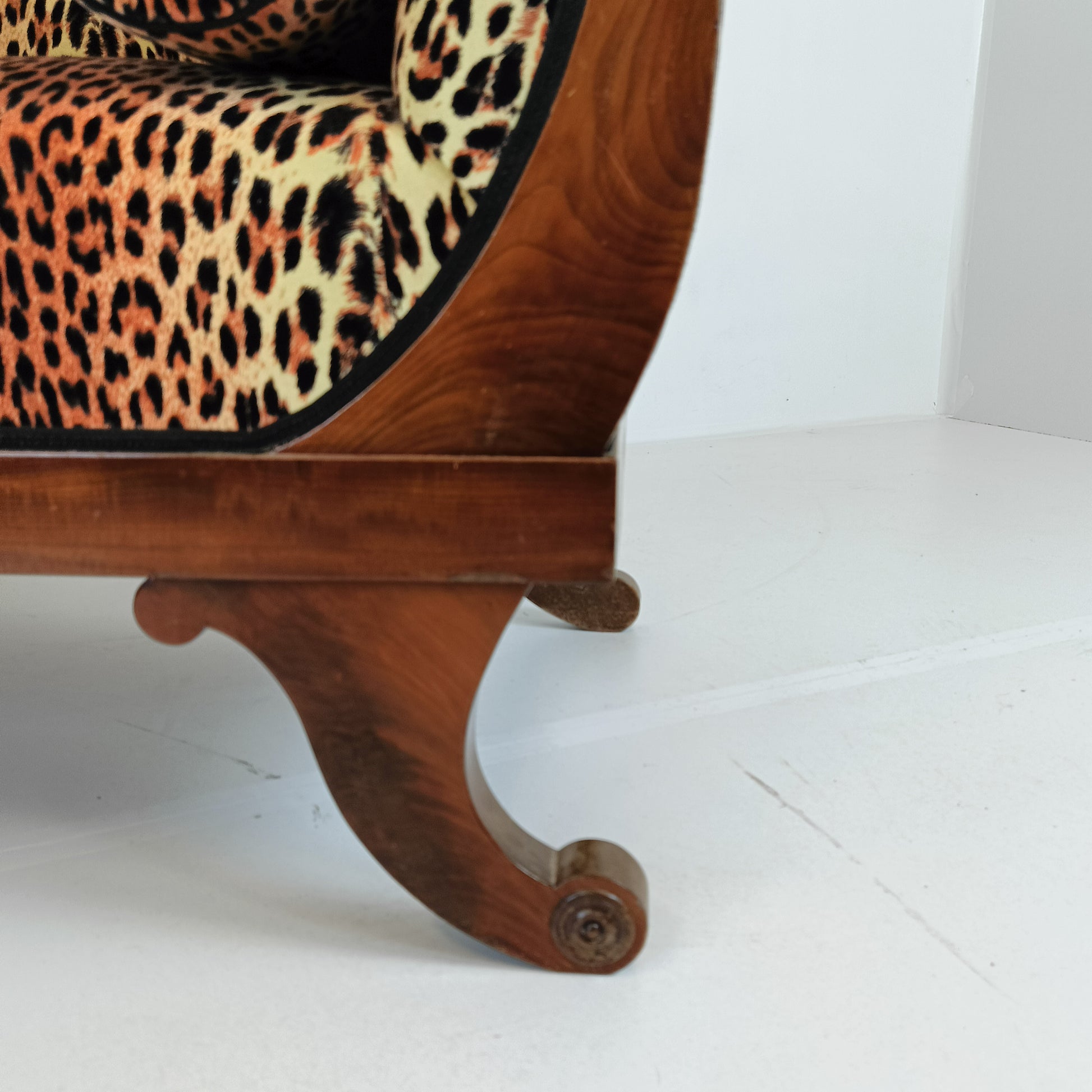 A Biedermeier-style sofa with a leopard print combines the elegance of early 19th-century European design with a bold, modern twist. The Biedermeier style is known for its clean lines, graceful curves, and understated ornamentation, often made from rich woods like walnut or cherry. Adding a leopard print upholstery introduces a striking contrast, blending classic sophistication with a touch of contemporary flair, making it a standout piece in any room.