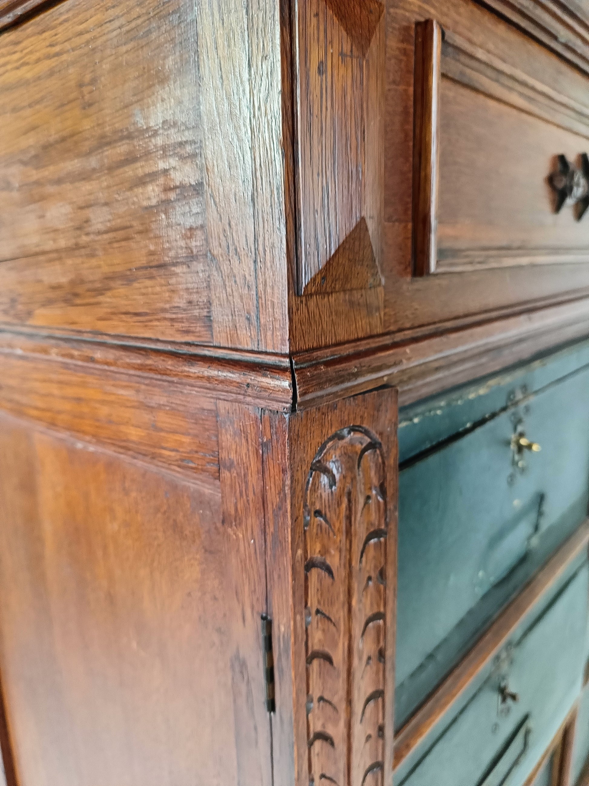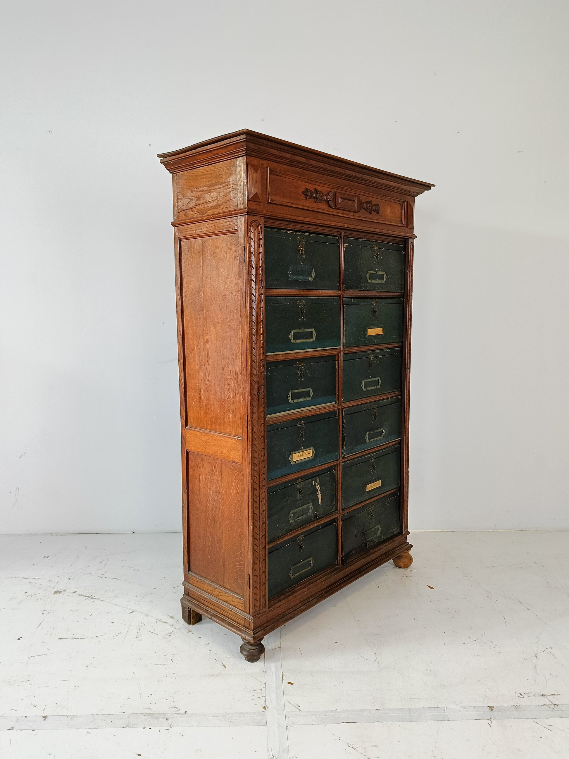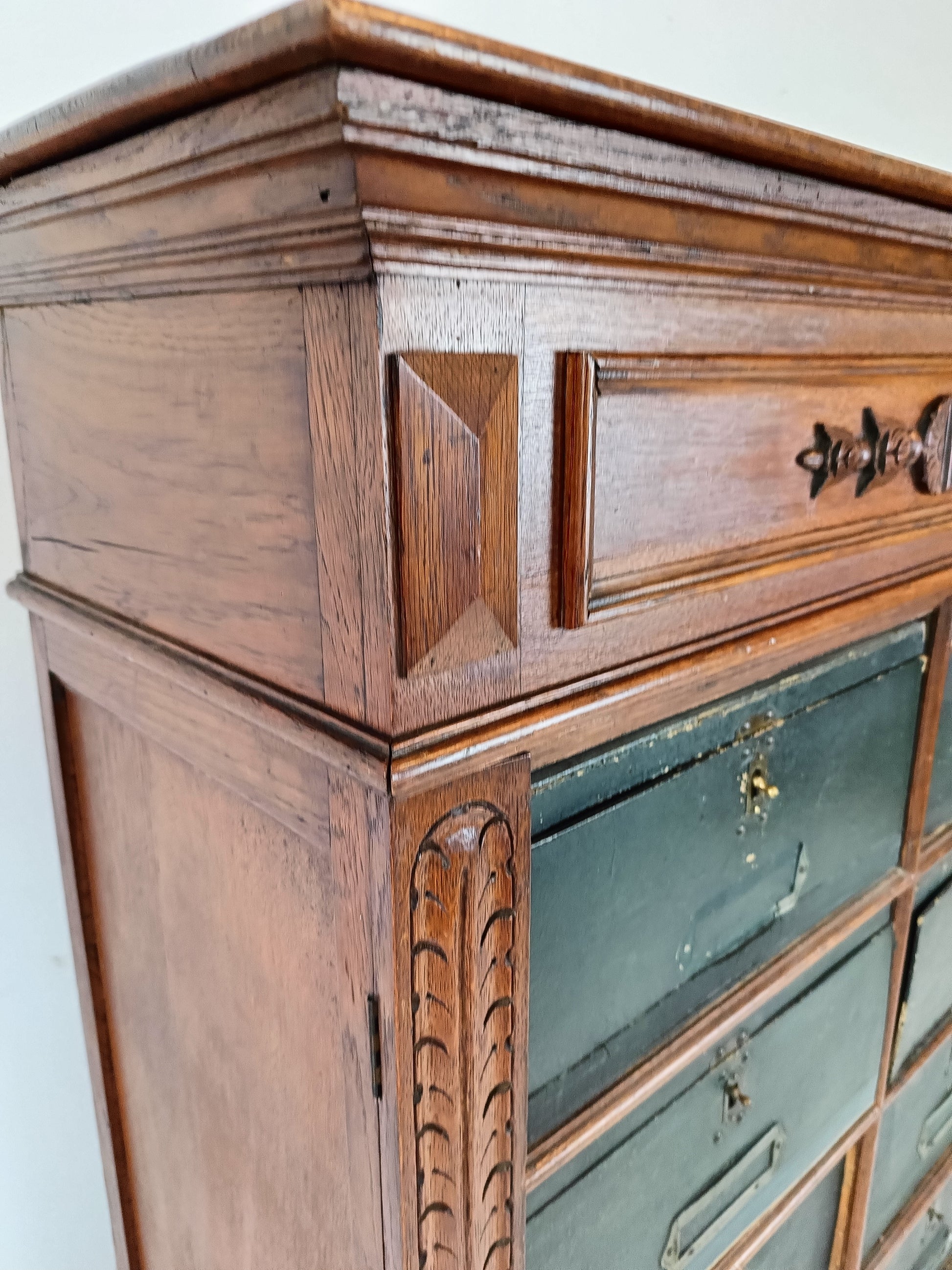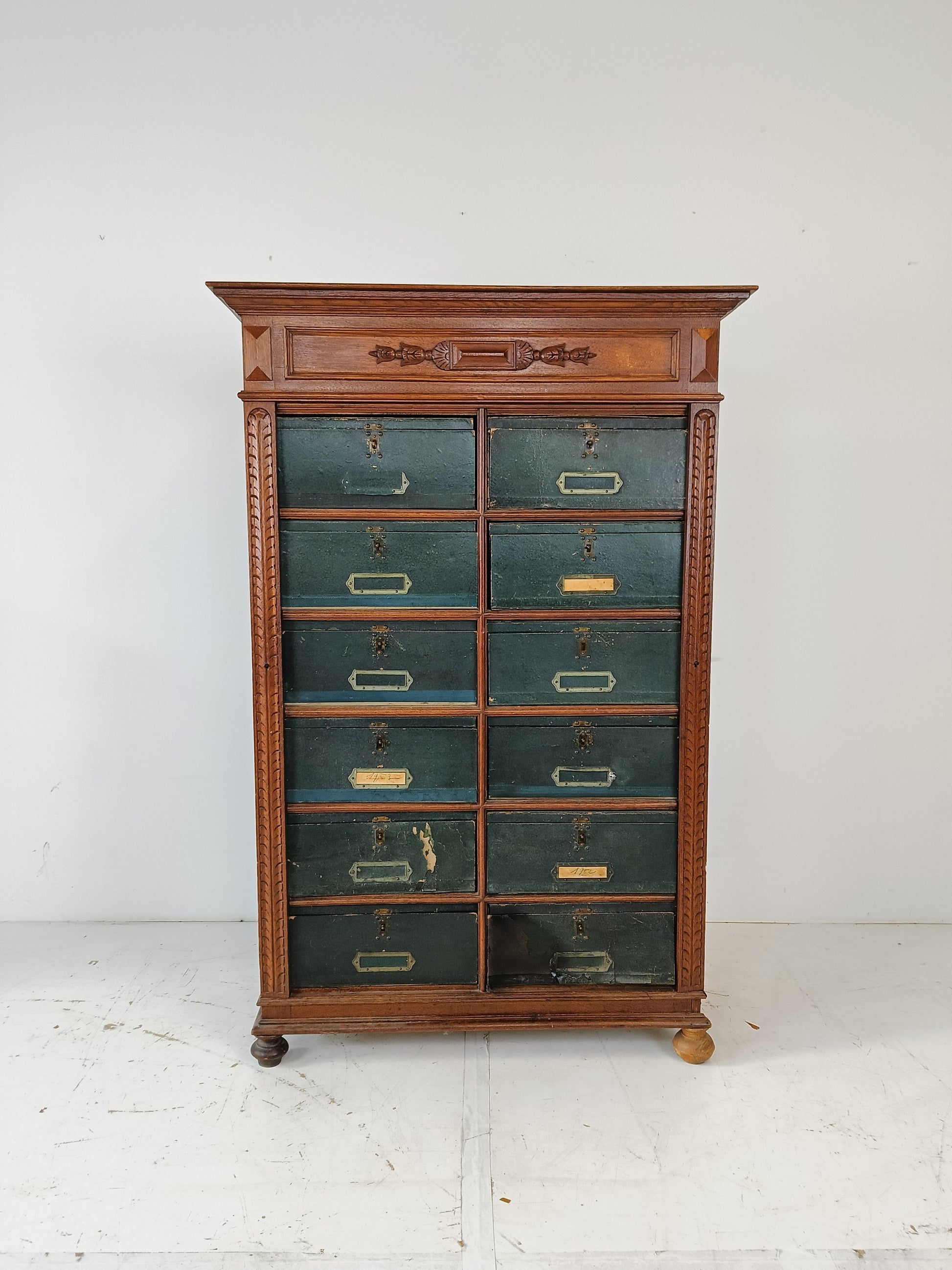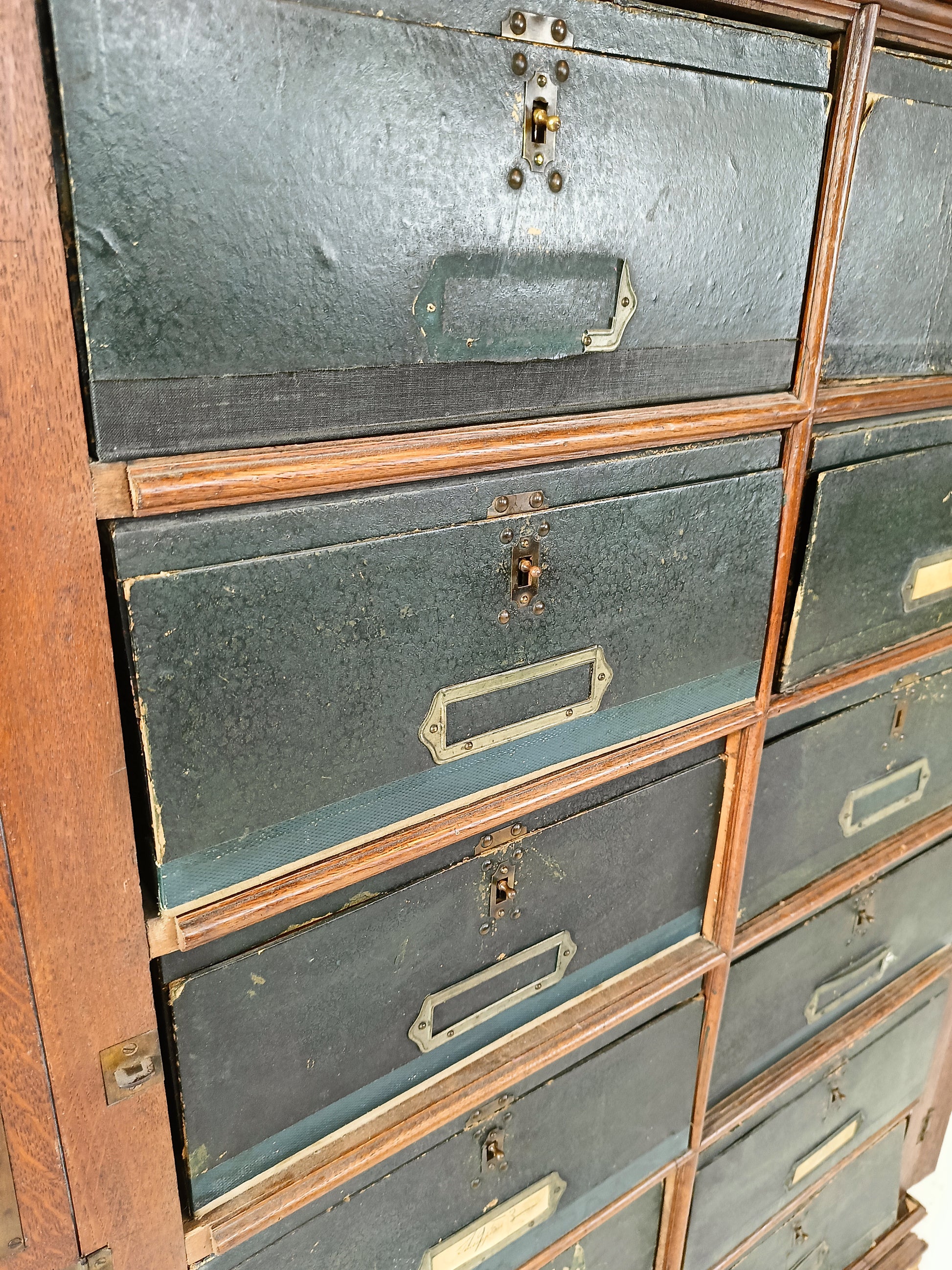 Classic filing cabinet still contains old blue cardboard drawers. Made of oak. Needs some antique love to get it back to an excellent condition.