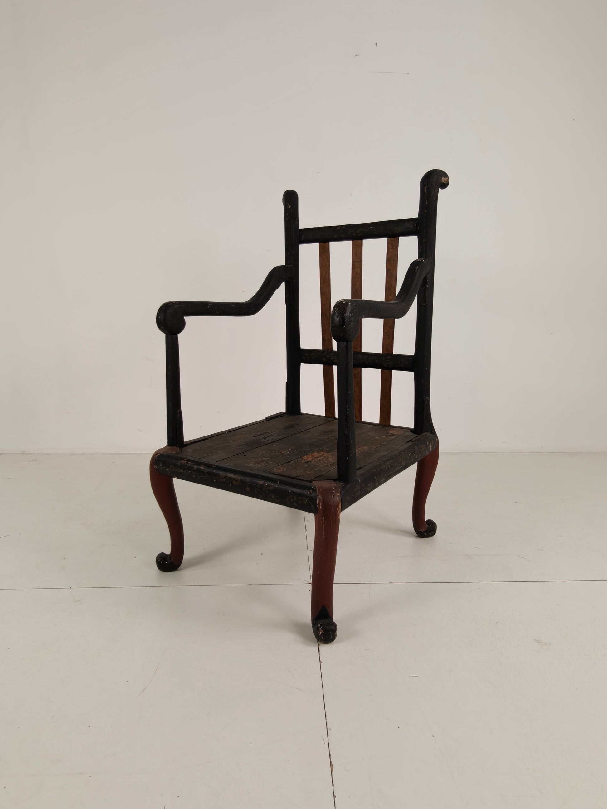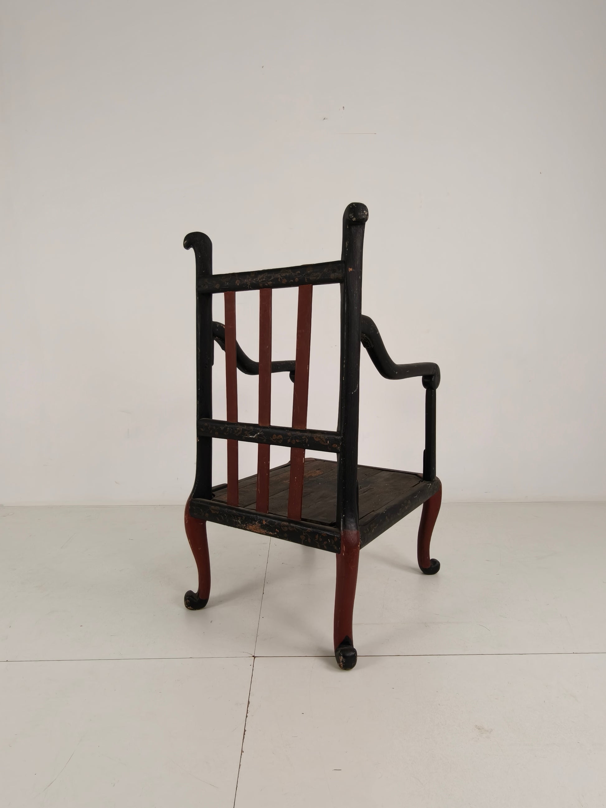An eye-catching English armchair in chinoiserie style, dating from around 1900. This beautifully decorative piece features hand-painted floral motifs across the frame, with striking red-painted legs that add contrast and charm.
