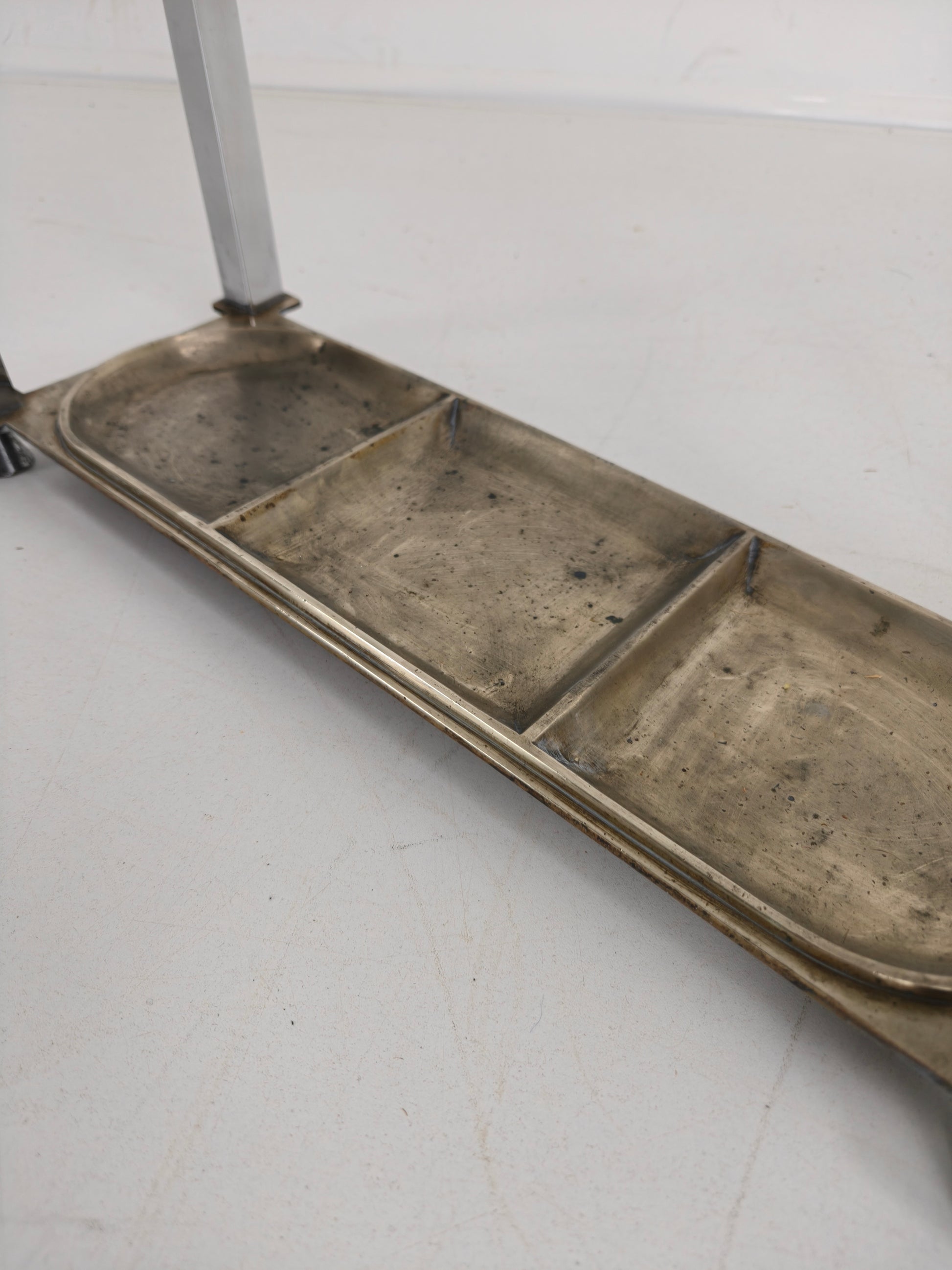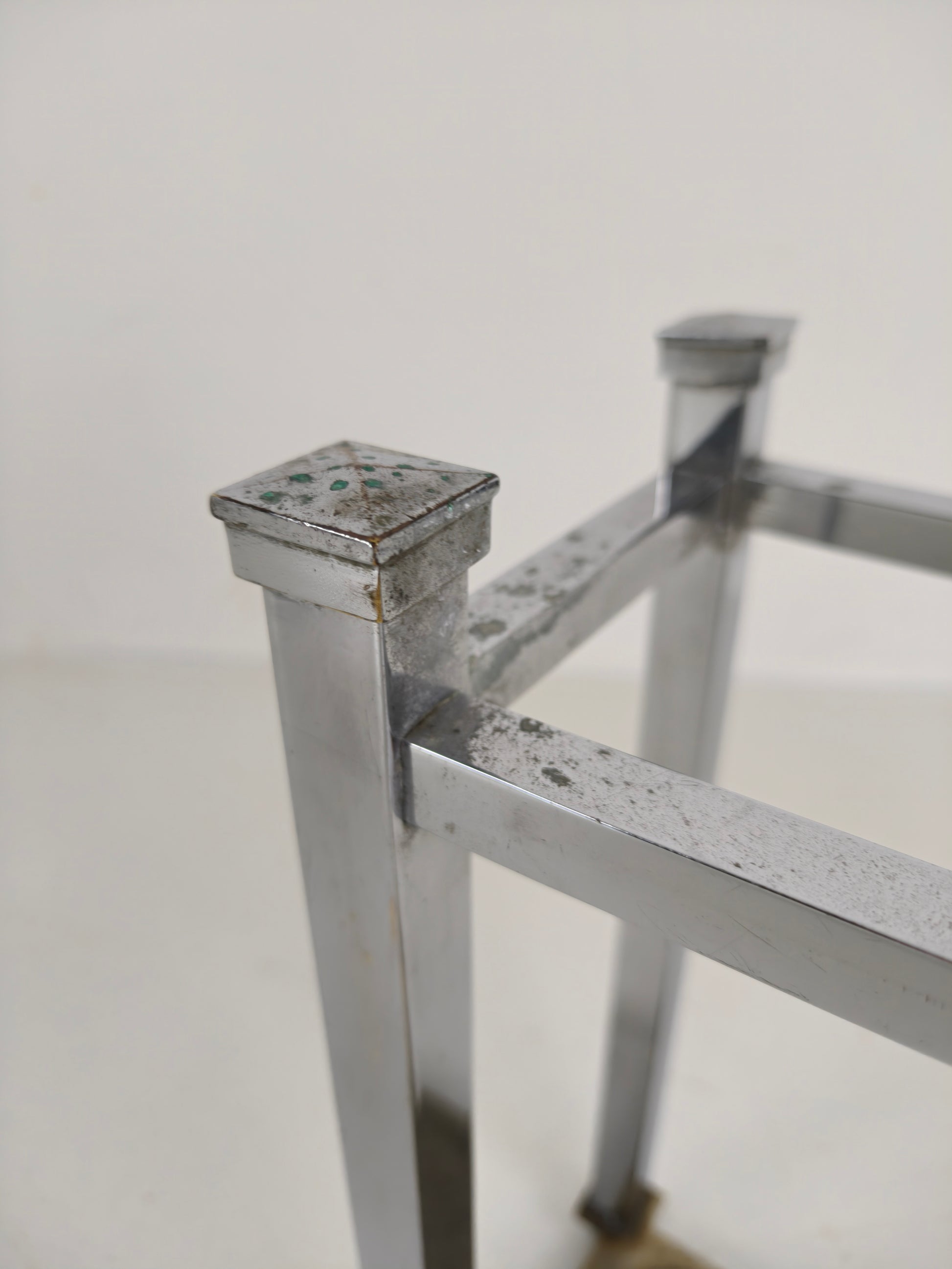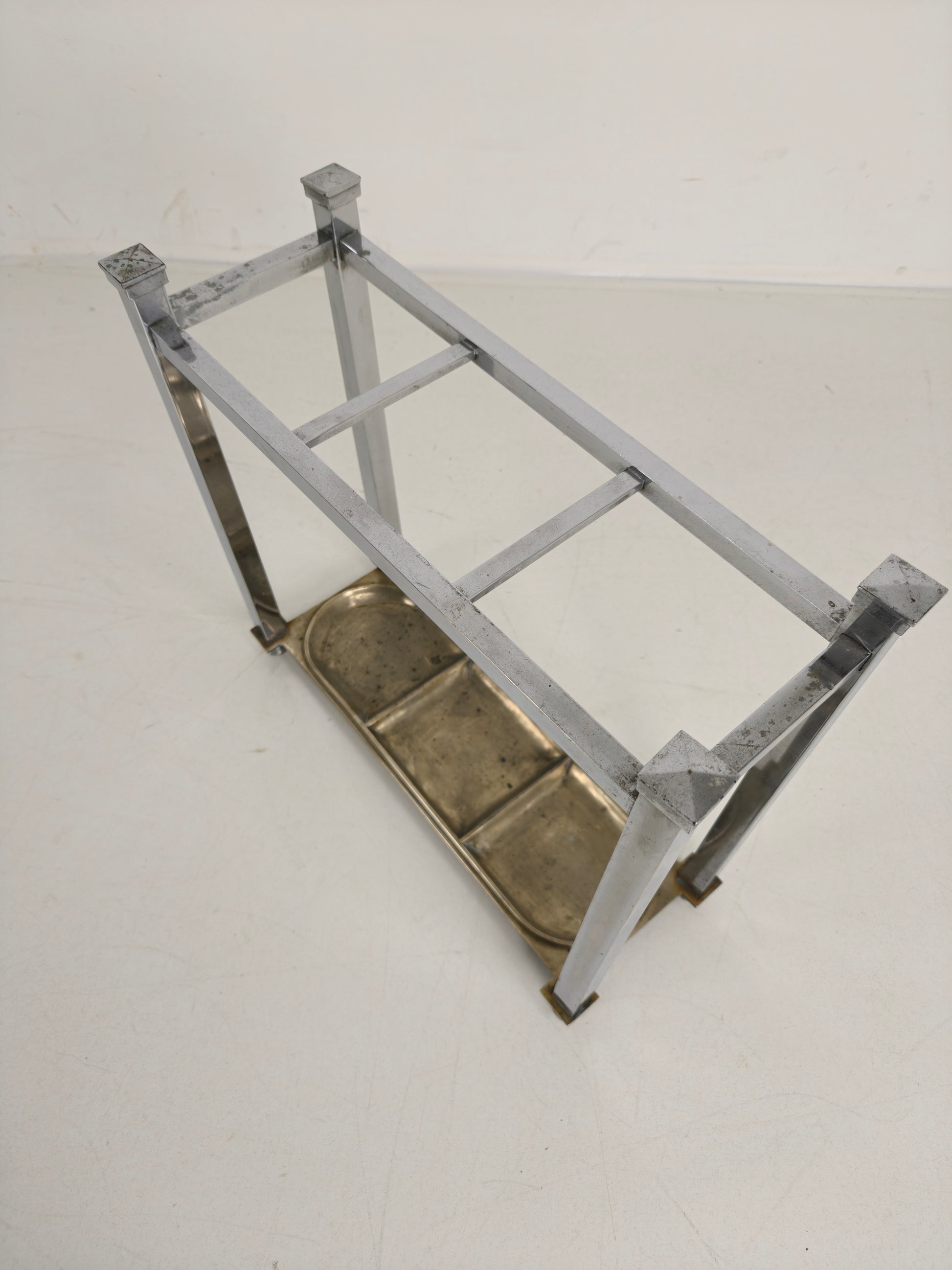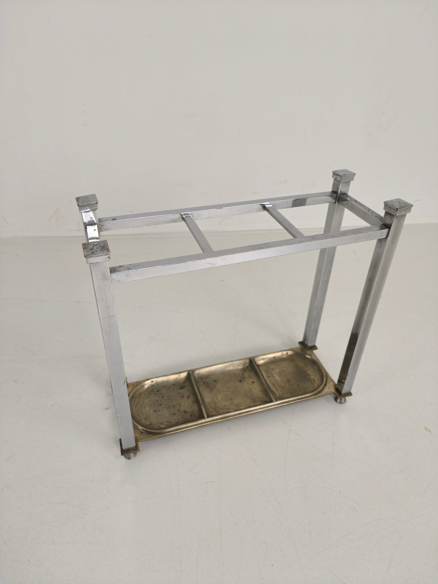 This beautiful chrome Art Deco umbrella/walking stick stand is a charming small-sized piece, showcasing the sleek and elegant design typical of the Art Deco era. The stand is made of chrome and is in used condition, with visible signs of wear, as shown in the photos.