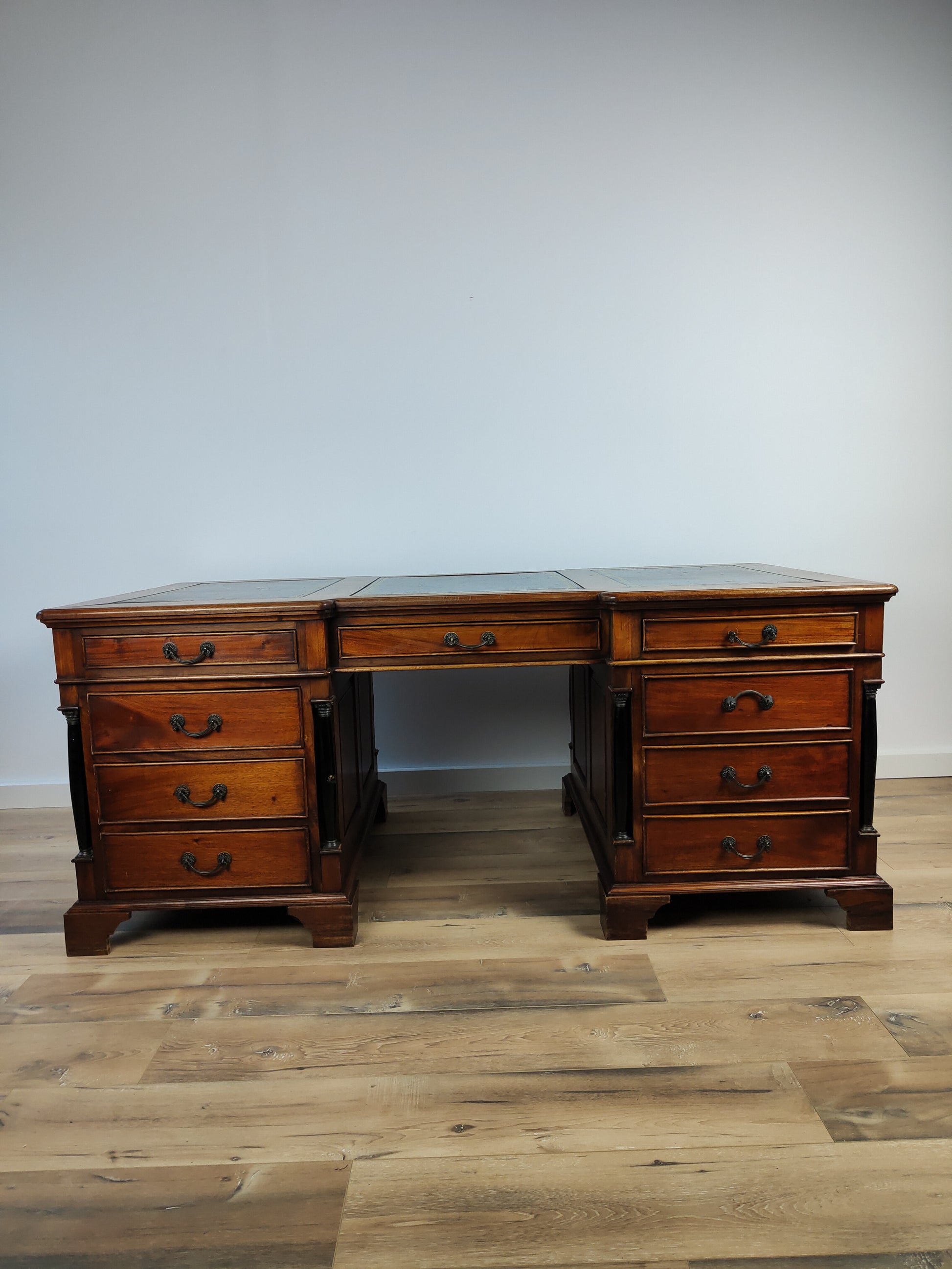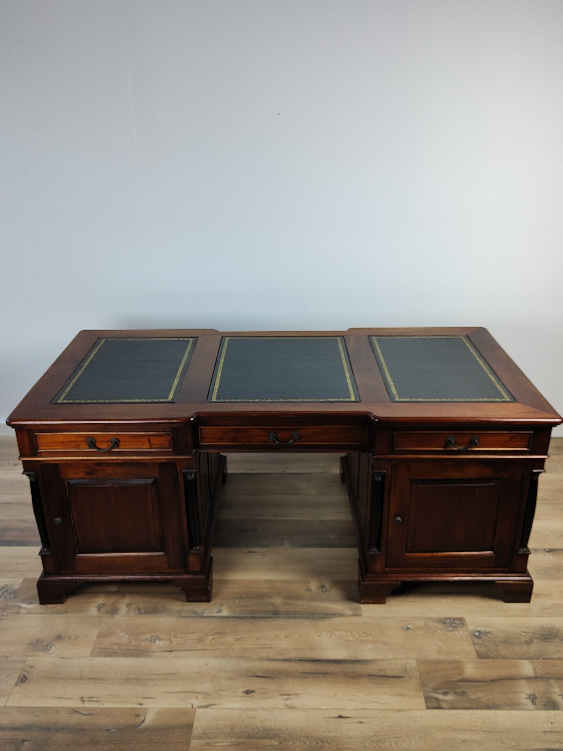 Beautiful classic English Chesterfield partner desk with beautifully incorporated black leather and pillars