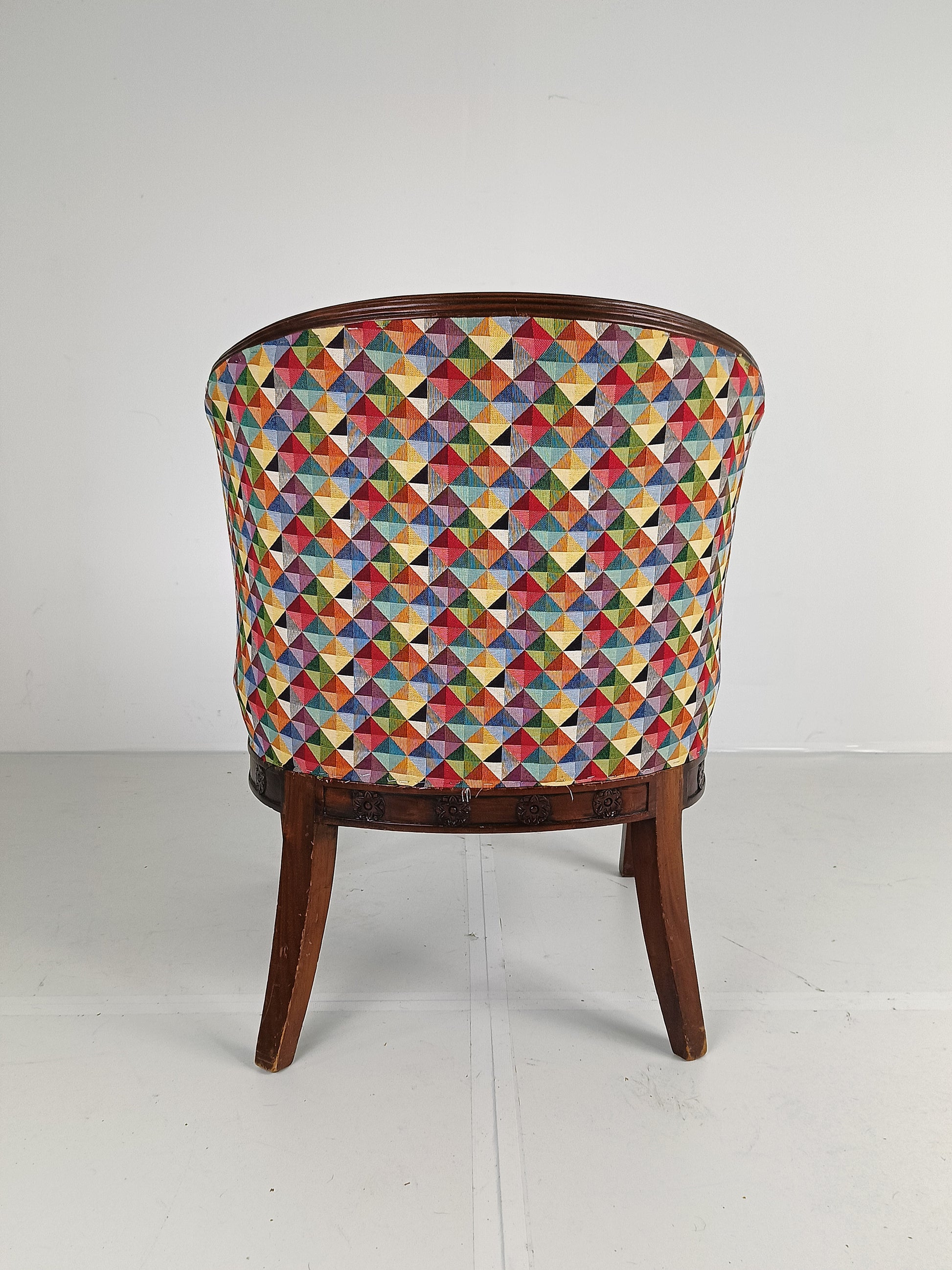 An armchair, circa 1940. The swan chair has a round wicker comb rail that continues into carved rosette arm joints, upright carved swans connecting the reupholstered back and seat cushion with silver nailhead detailing. The apron has floral medallion carving.