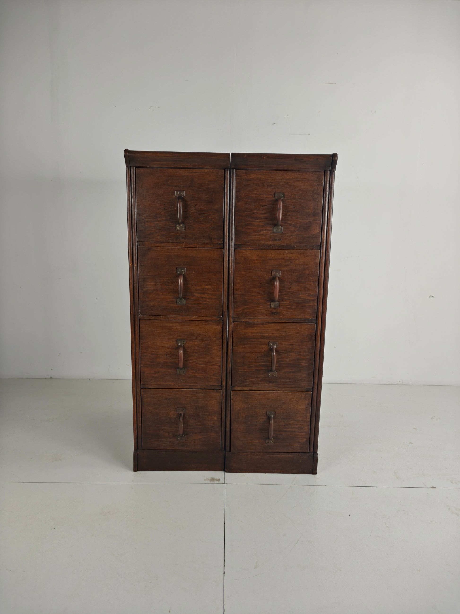 Beautiful solid oak double archive cabinet from the Netherlands, dating circa 1920–1940. This piece features its original hardware and is rich in patina, reflecting its age and history.