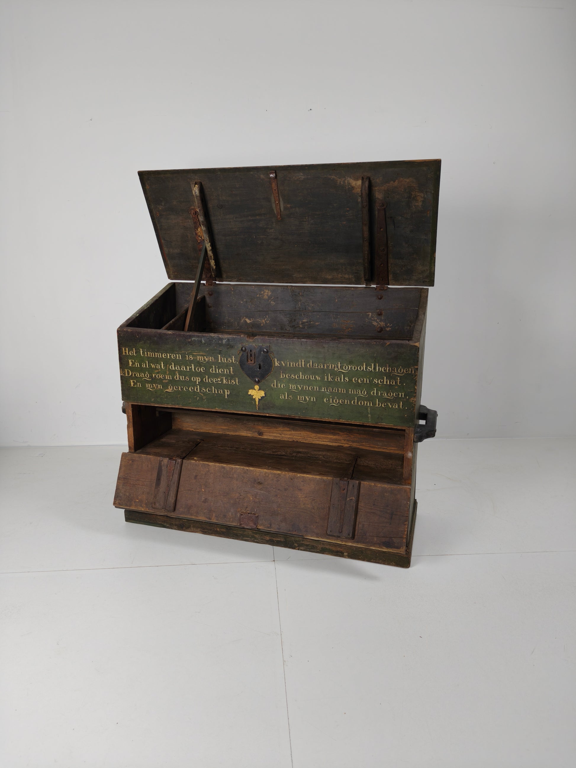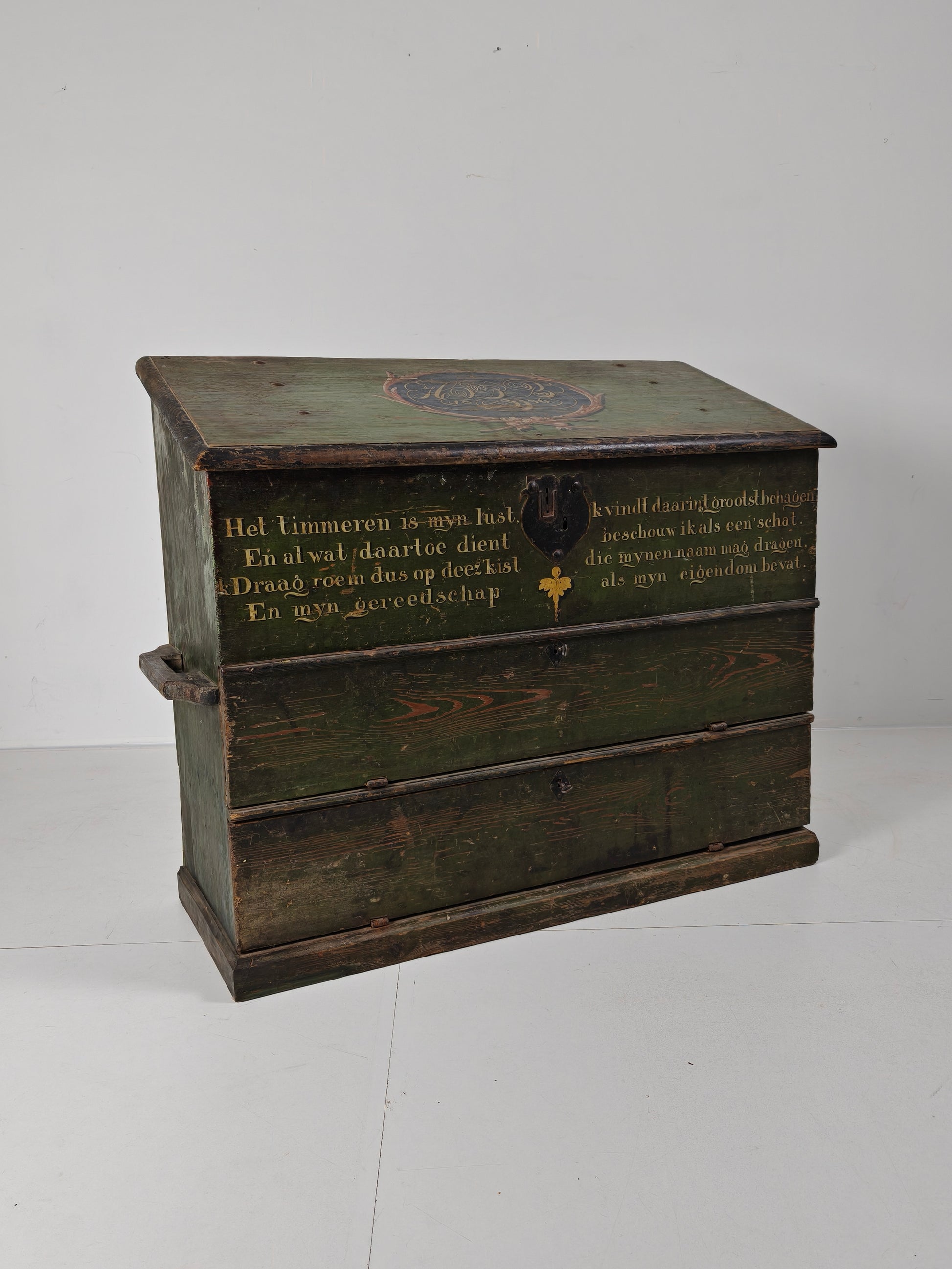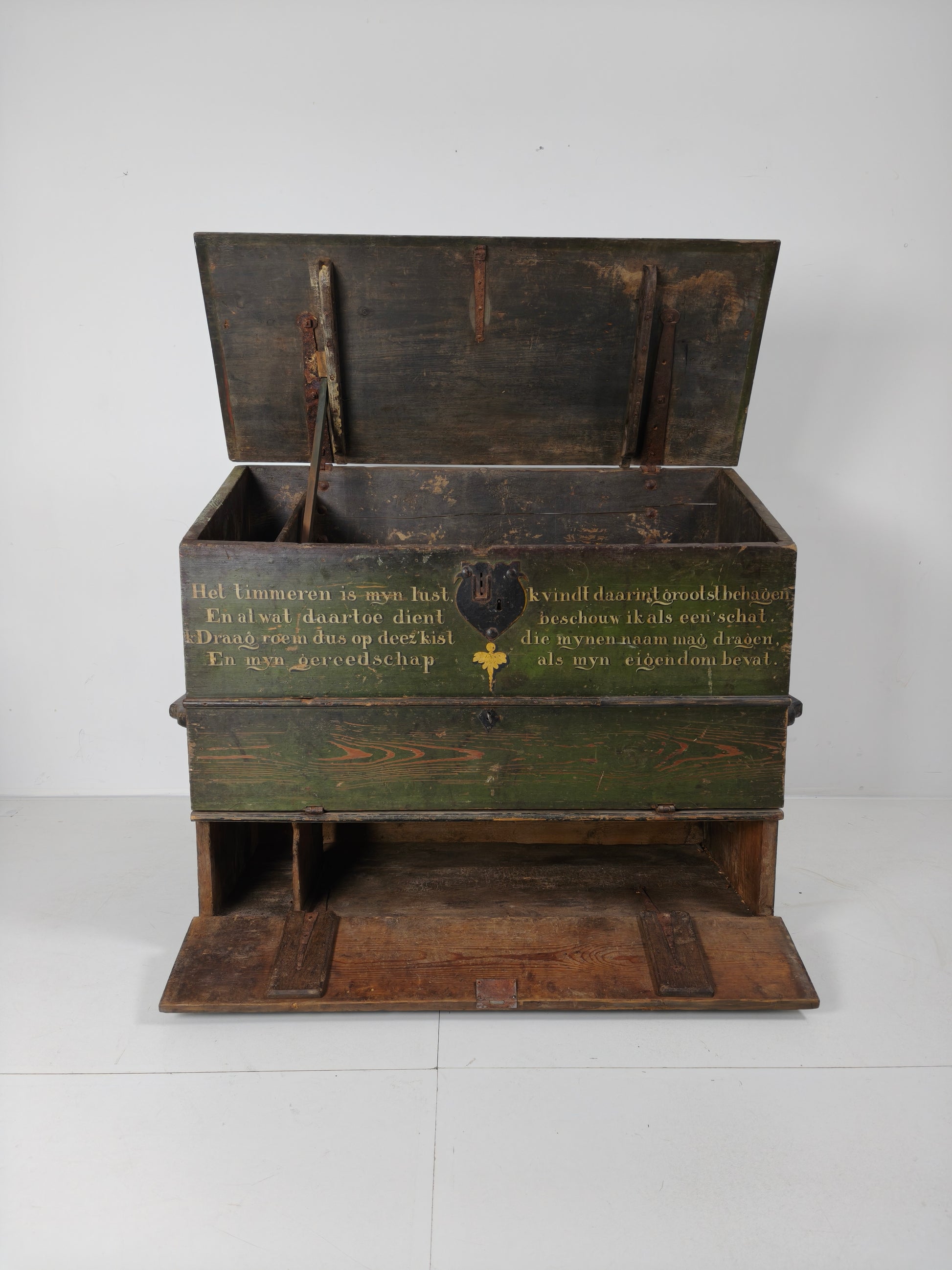 Dutch tool chests were popular among shipbuilders in the Netherlands during the 18th and 19th centuries. Due to the wet conditions in unheated shipyard workshops, craftsmen sought a way to protect their tools from rust and moisture. The slanted lid design was an ingenious solution, preventing rain from accumulating on the chest.