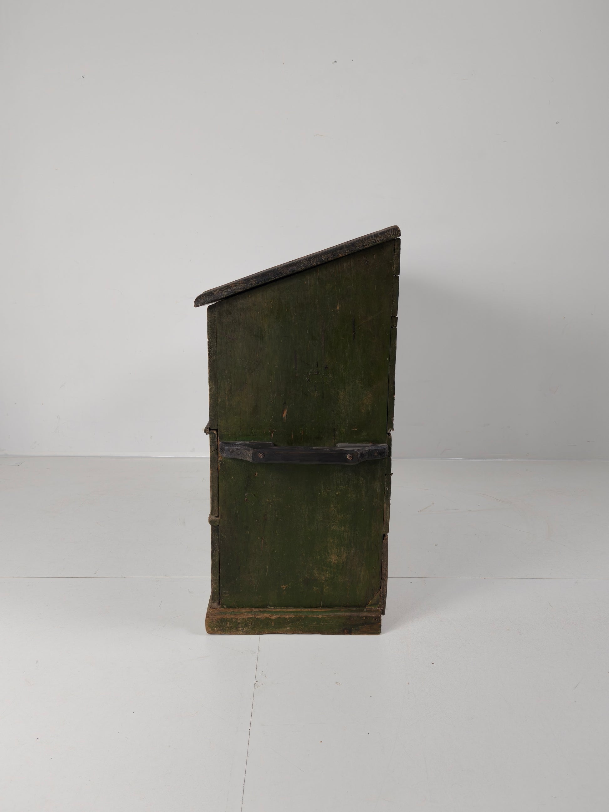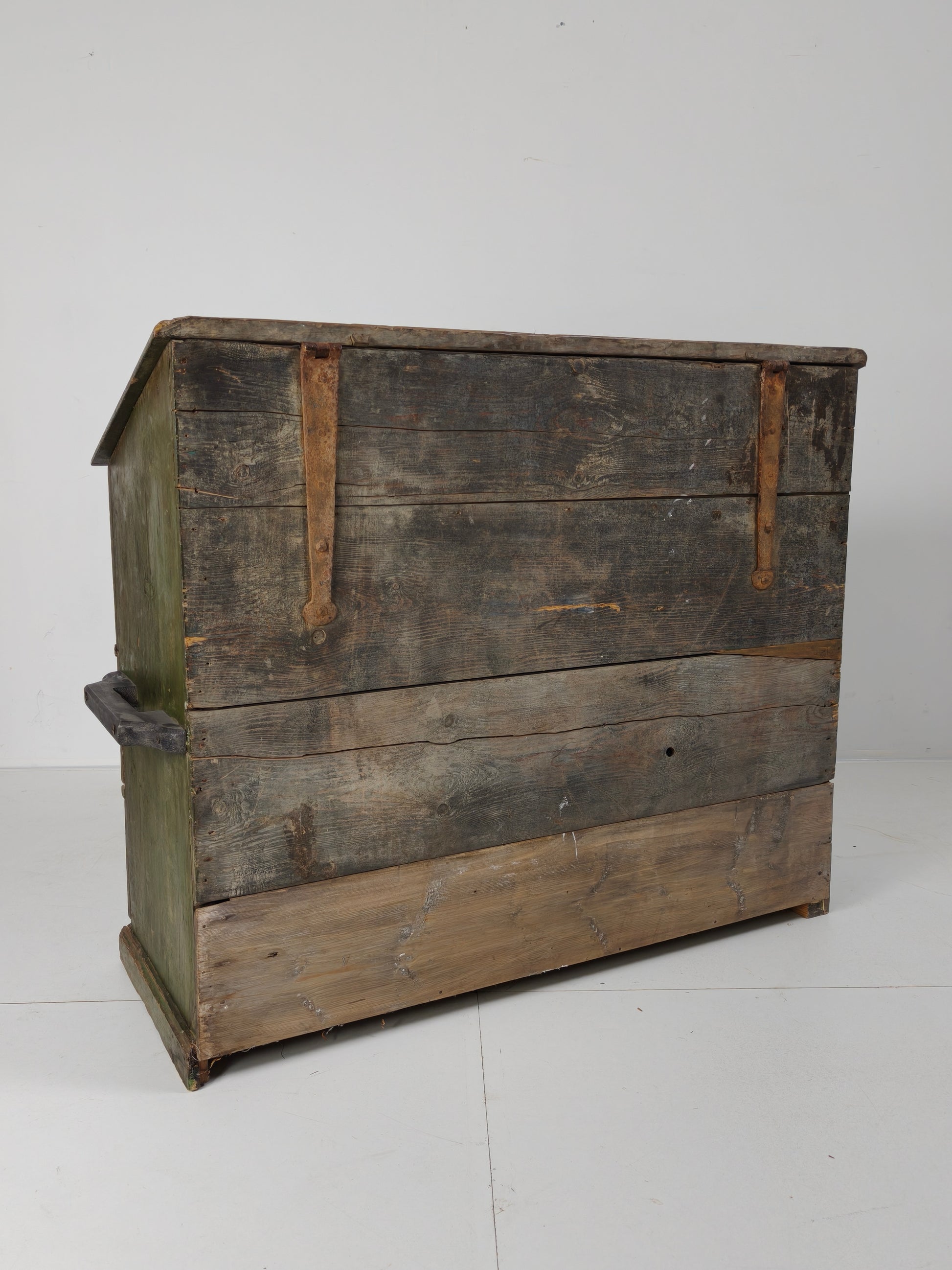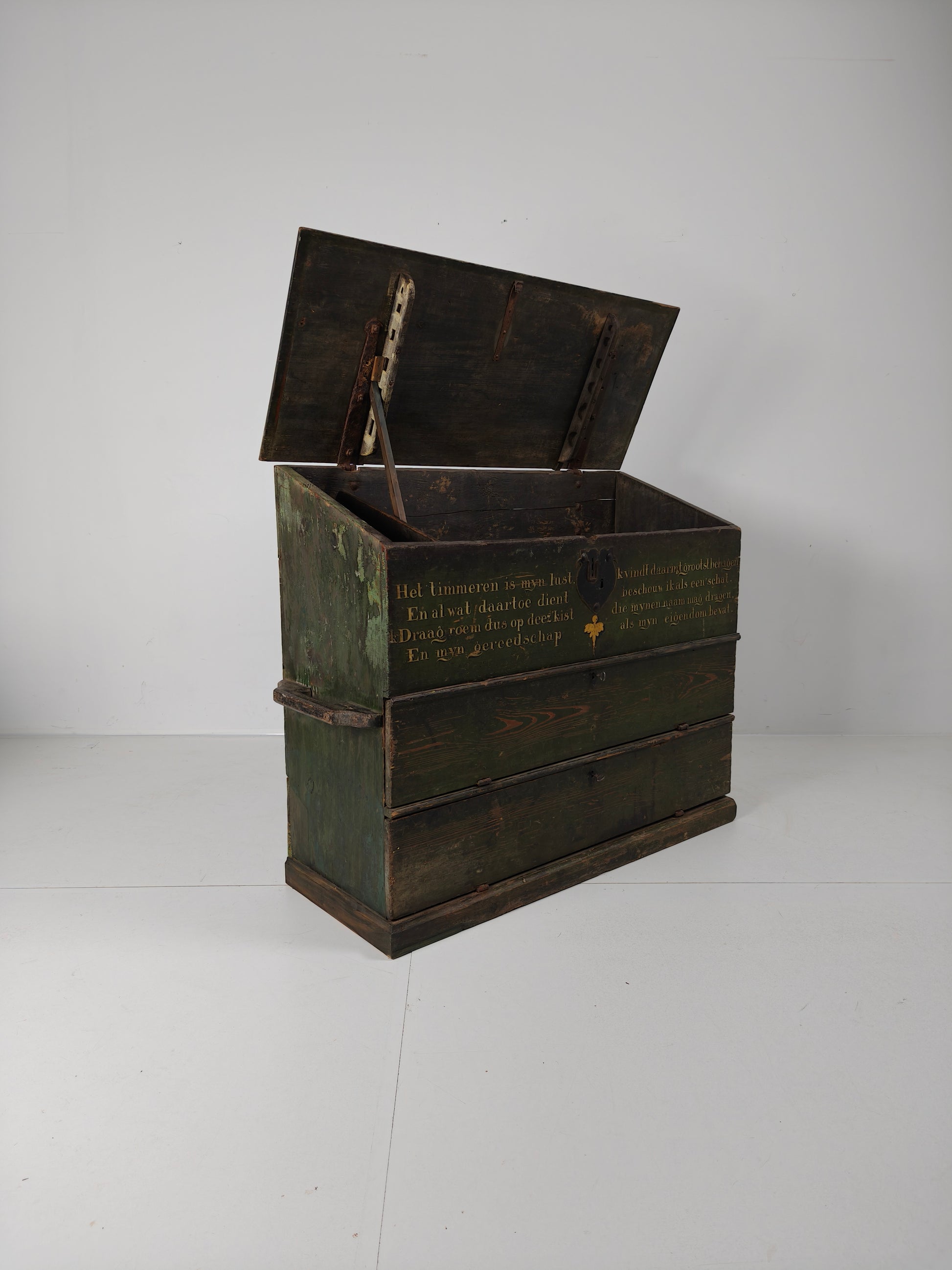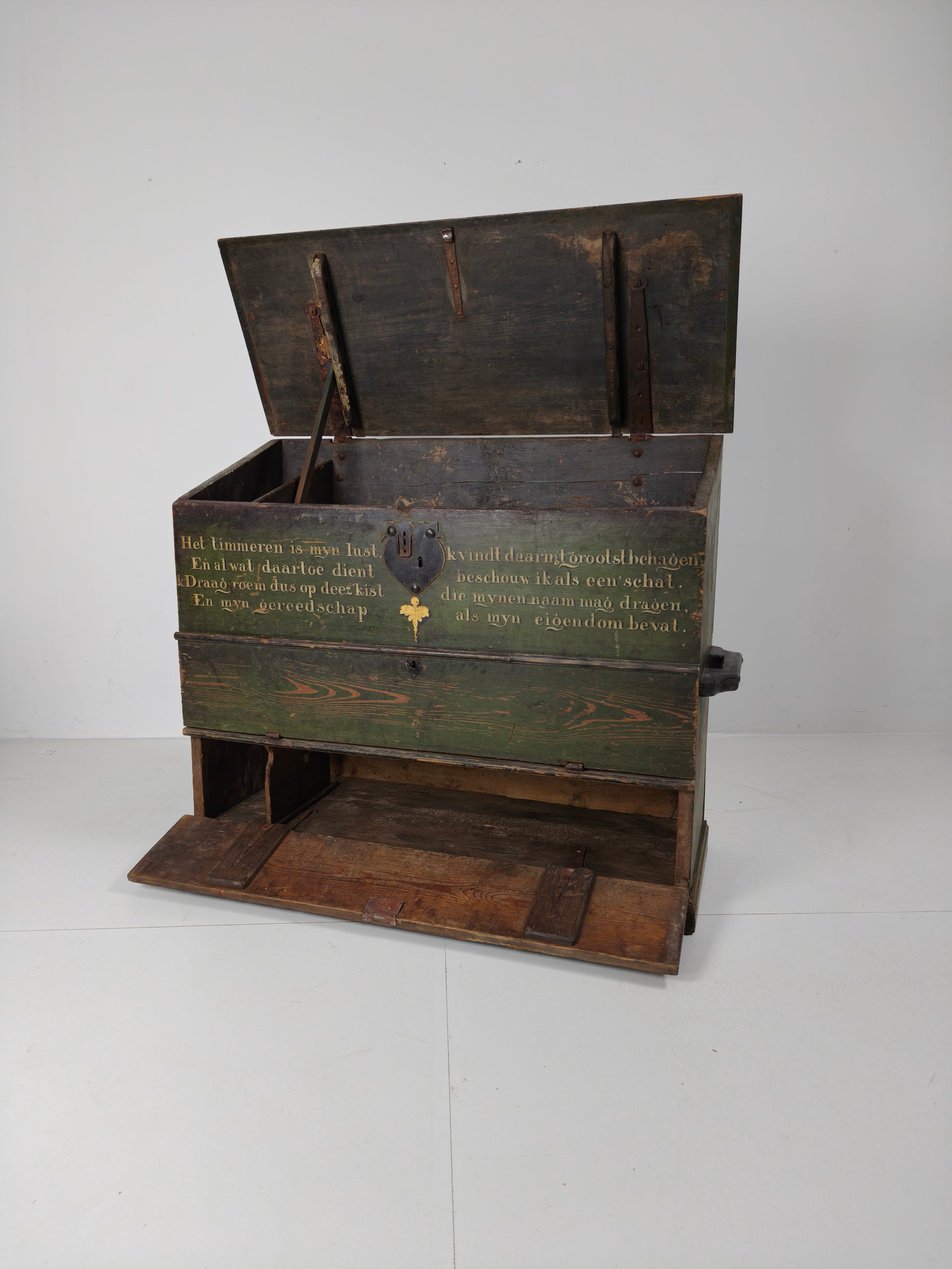 Dutch tool chests were popular among shipbuilders in the Netherlands during the 18th and 19th centuries. Due to the wet conditions in unheated shipyard workshops, craftsmen sought a way to protect their tools from rust and moisture. The slanted lid design was an ingenious solution, preventing rain from accumulating on the chest.