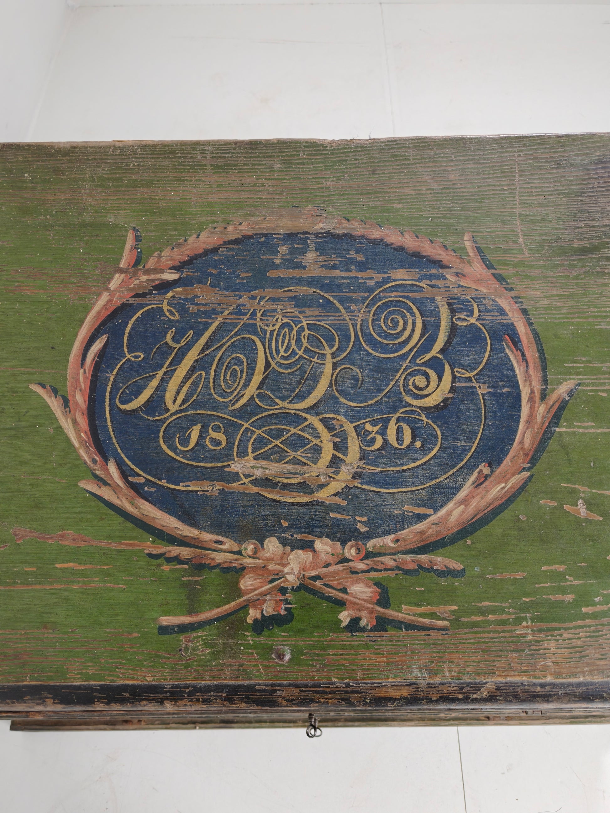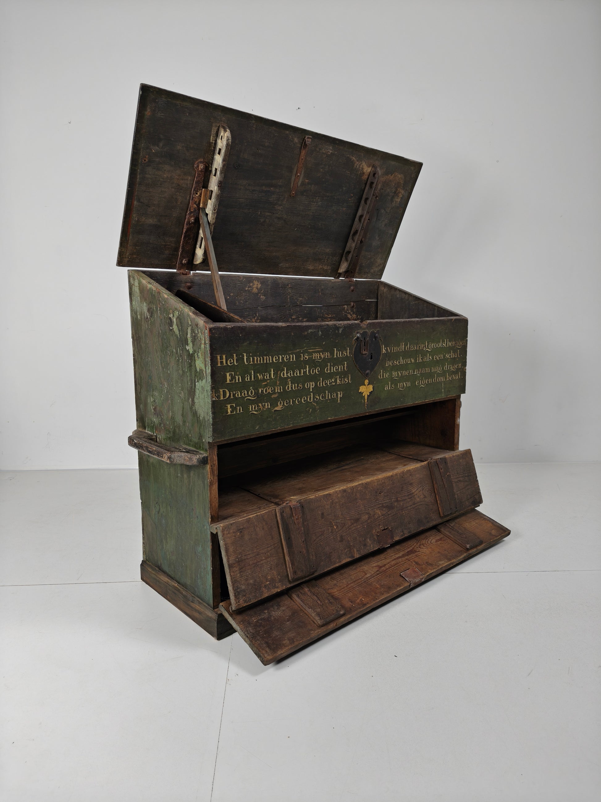 This Dutch tool chest from 1836 is a remarkable piece of Dutch folk art, featuring fully hand-painted decorations, including the year of origin, and remains in completely original condition. It is equipped with two drop-down drawers, a slanted top lid with key, and wrought-iron hinges.