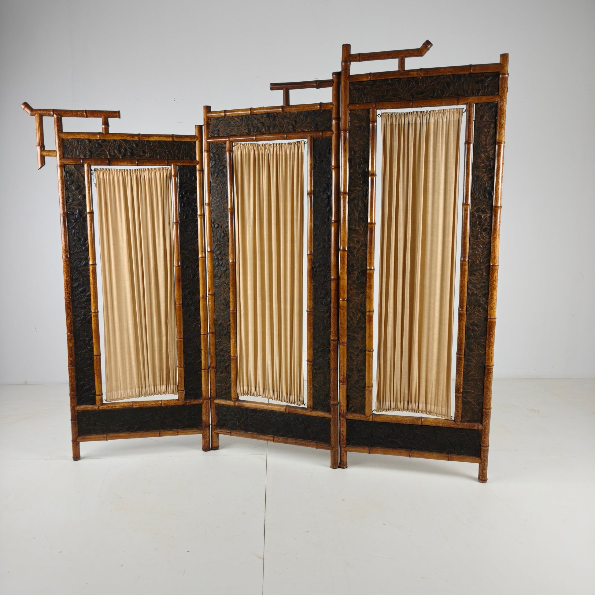A beautifully decorative bamboo room divider / folding screen, featuring carved panels with naturalistic motifs and elegant textile inserts.