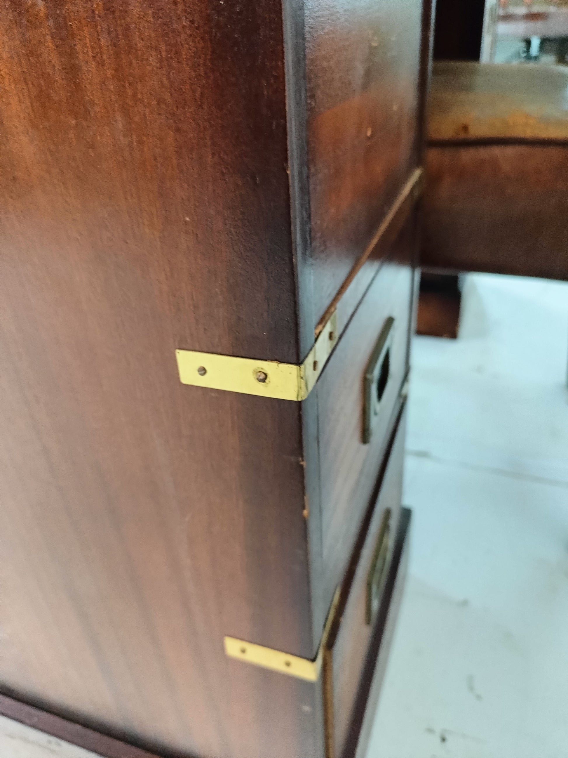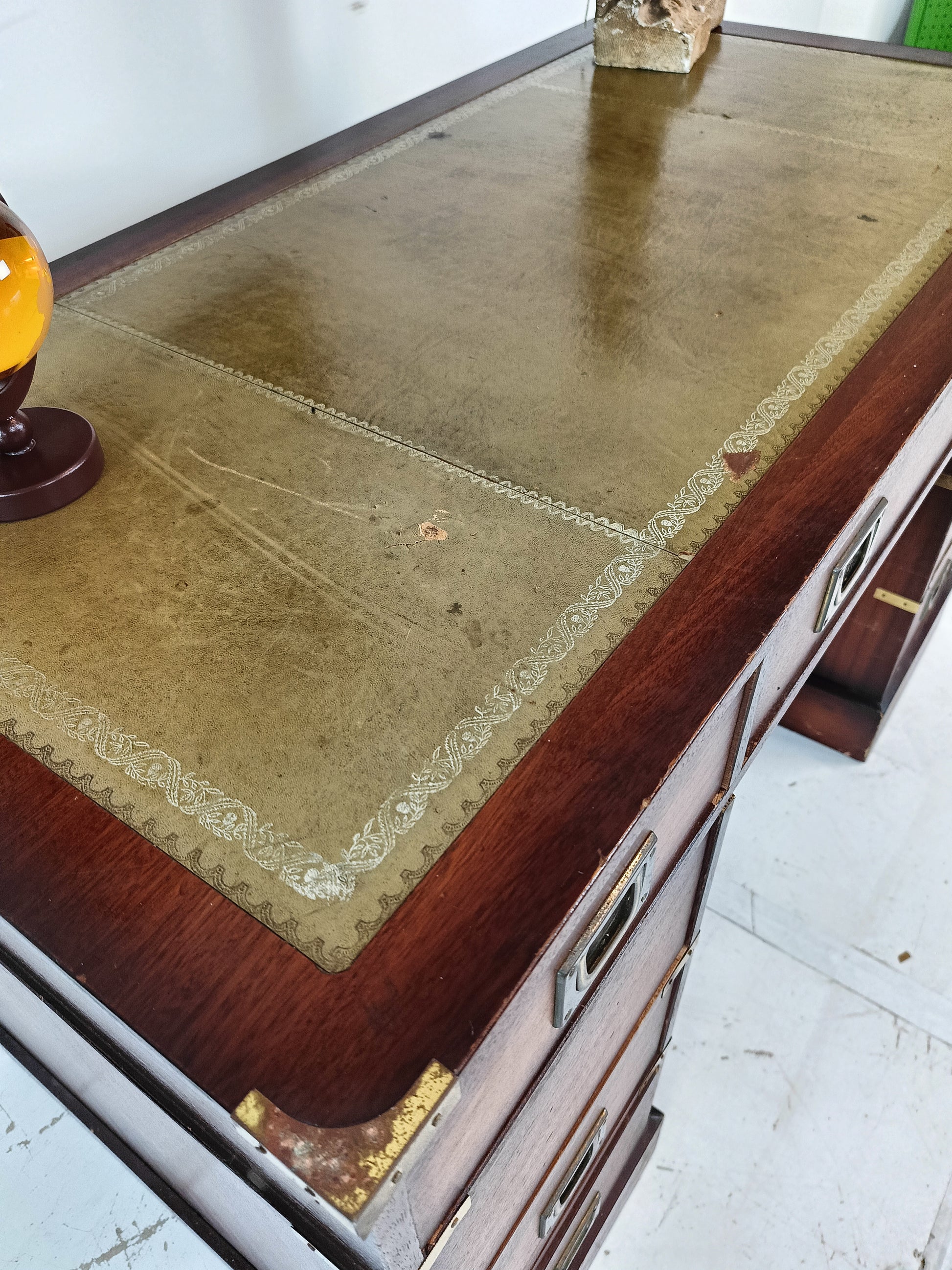 A true English classis campaign desk, smaller than usual. Perfect for decorating a home office. Some signs of old age. The leather is a bit worn in some places. Details have been photographed