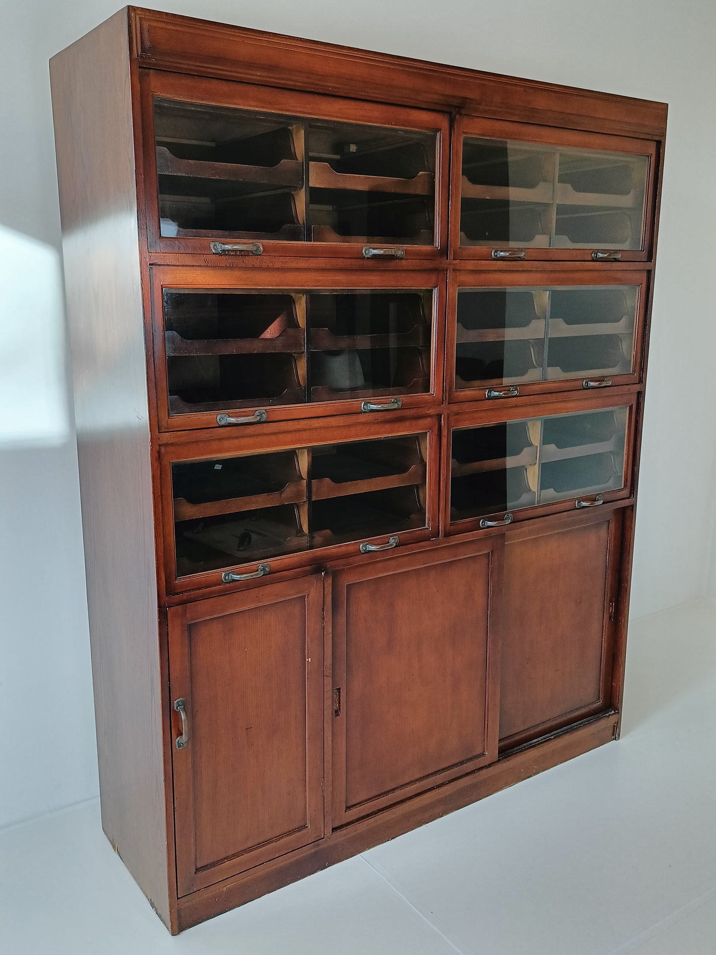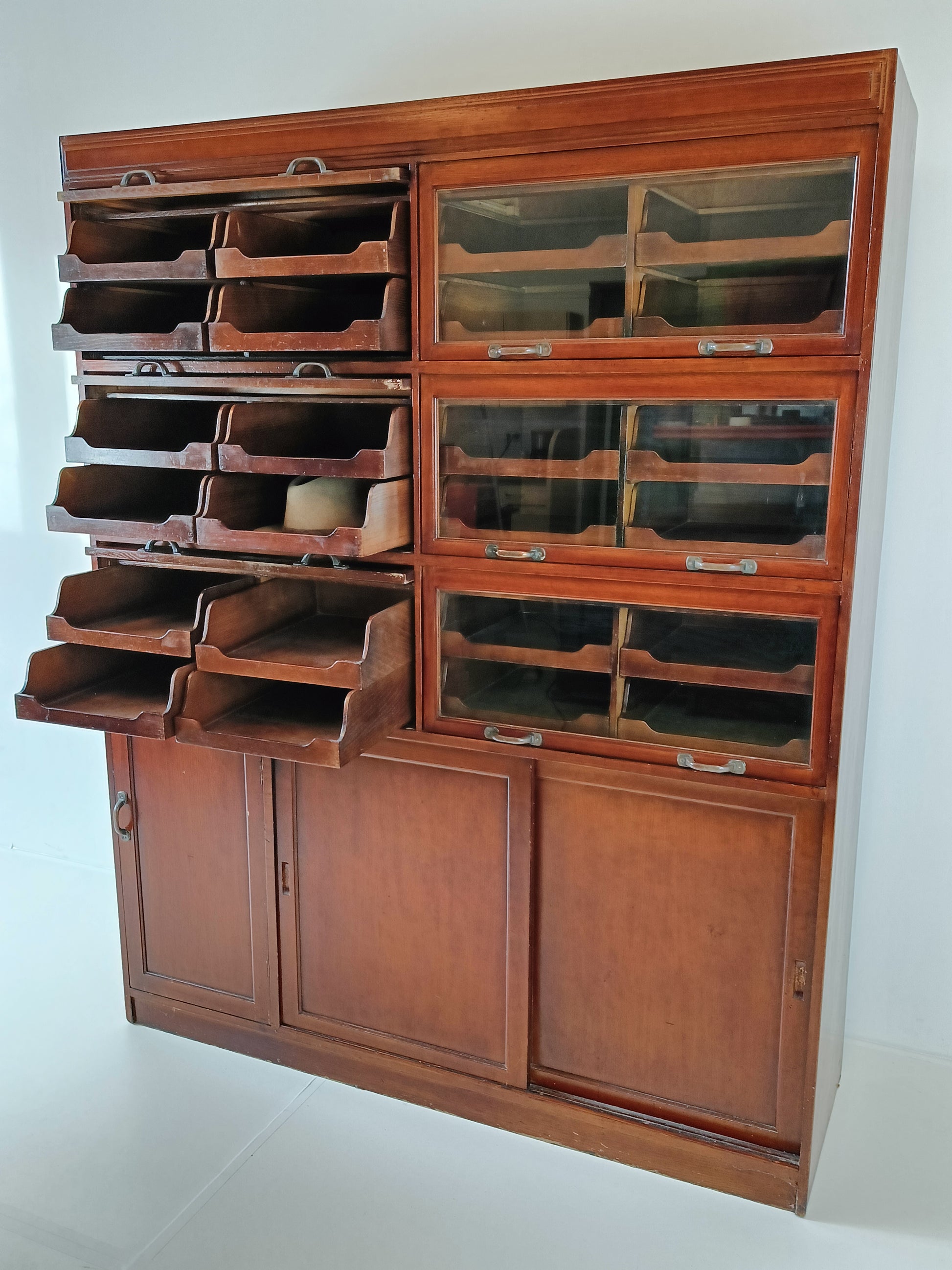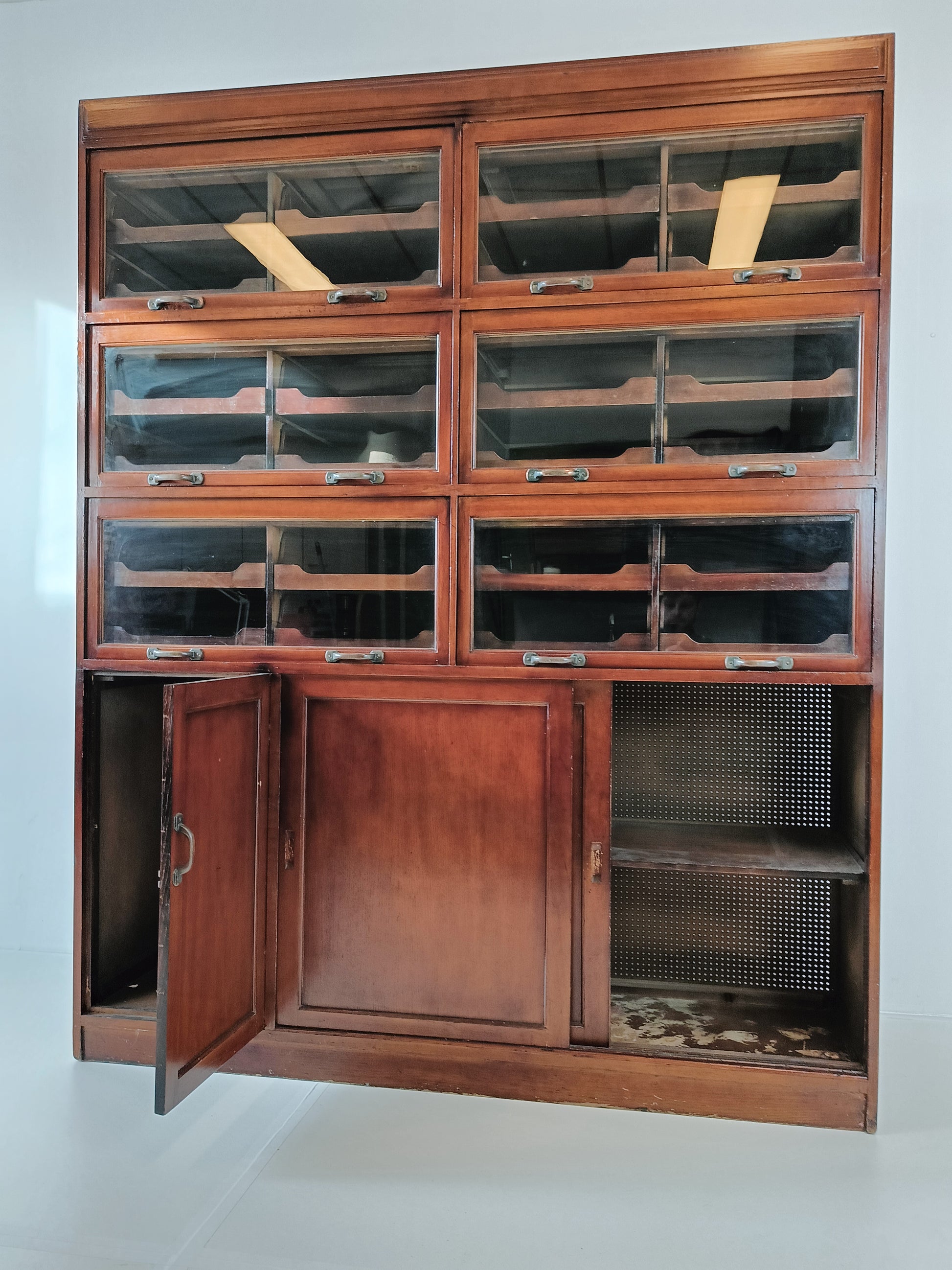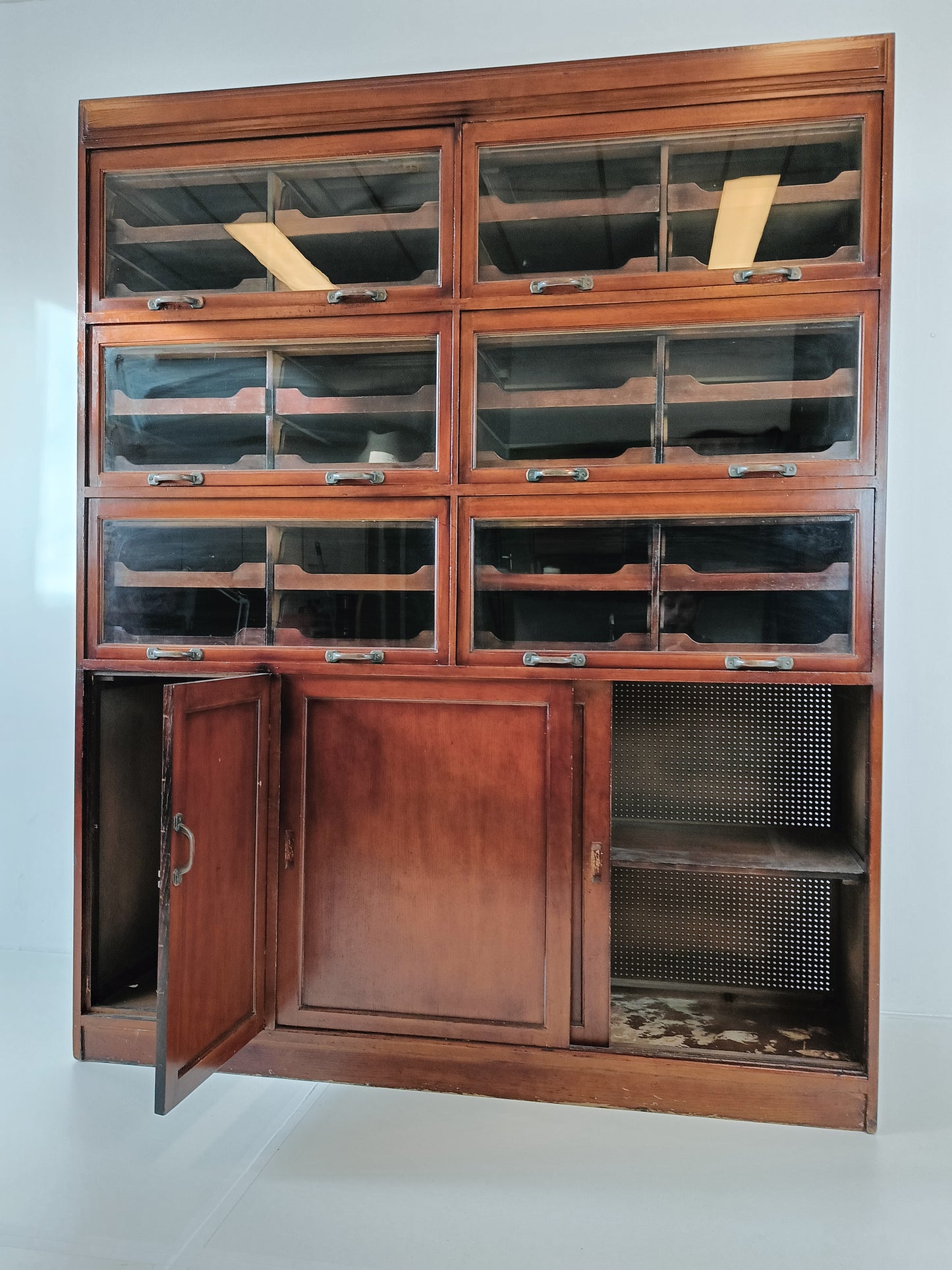 Antique mahogany shop cabinet with 24 drawers behind glasses in sliding doors and 6 large closed drawers. Made entirely of solid mahogany. Very nice quality. With these types of shop cabinets from the beginning of the 20th century, you don't often see that the whole is made of solid wood. Light traces of use origin: England period: ca. 1900-1920