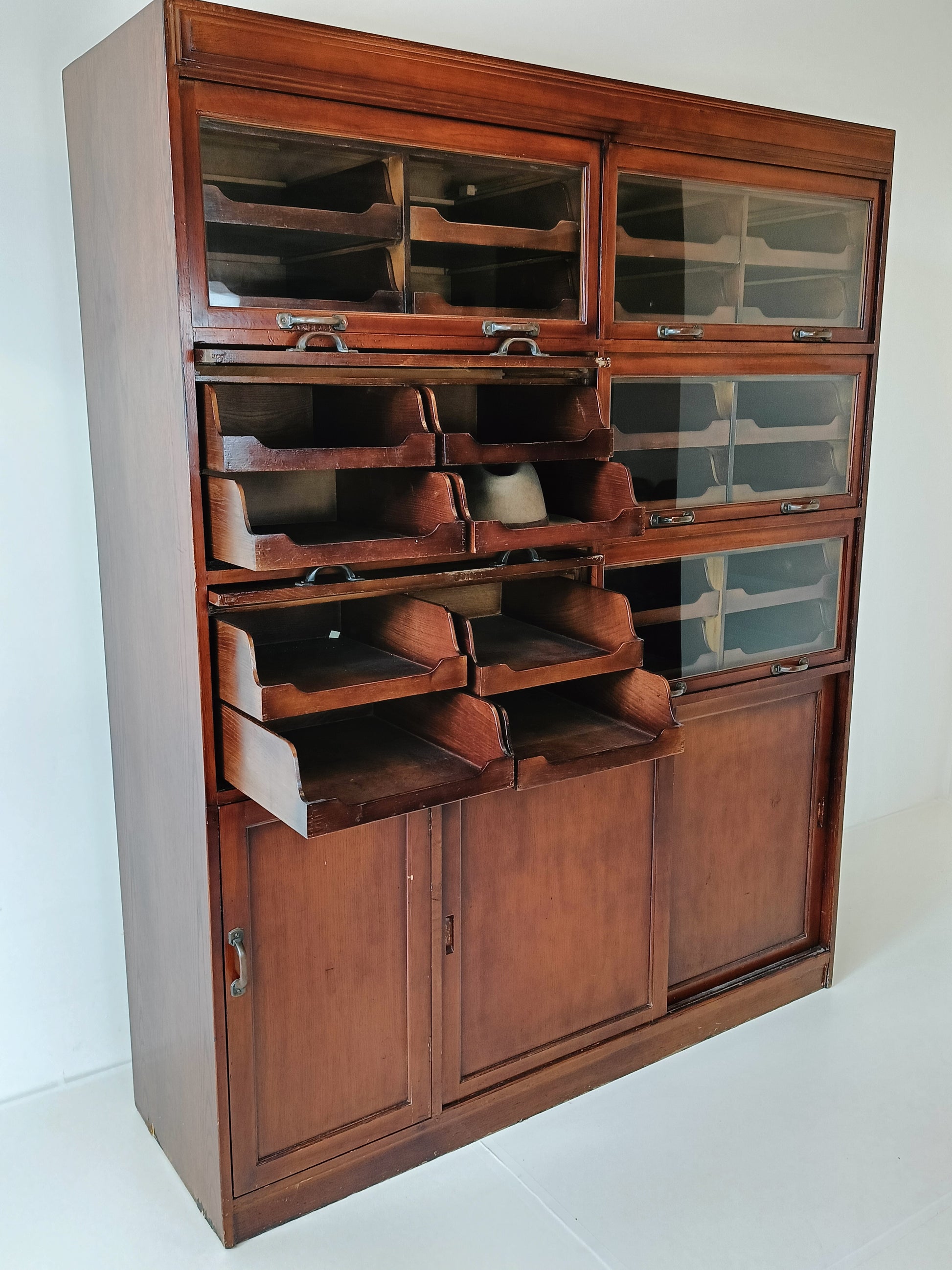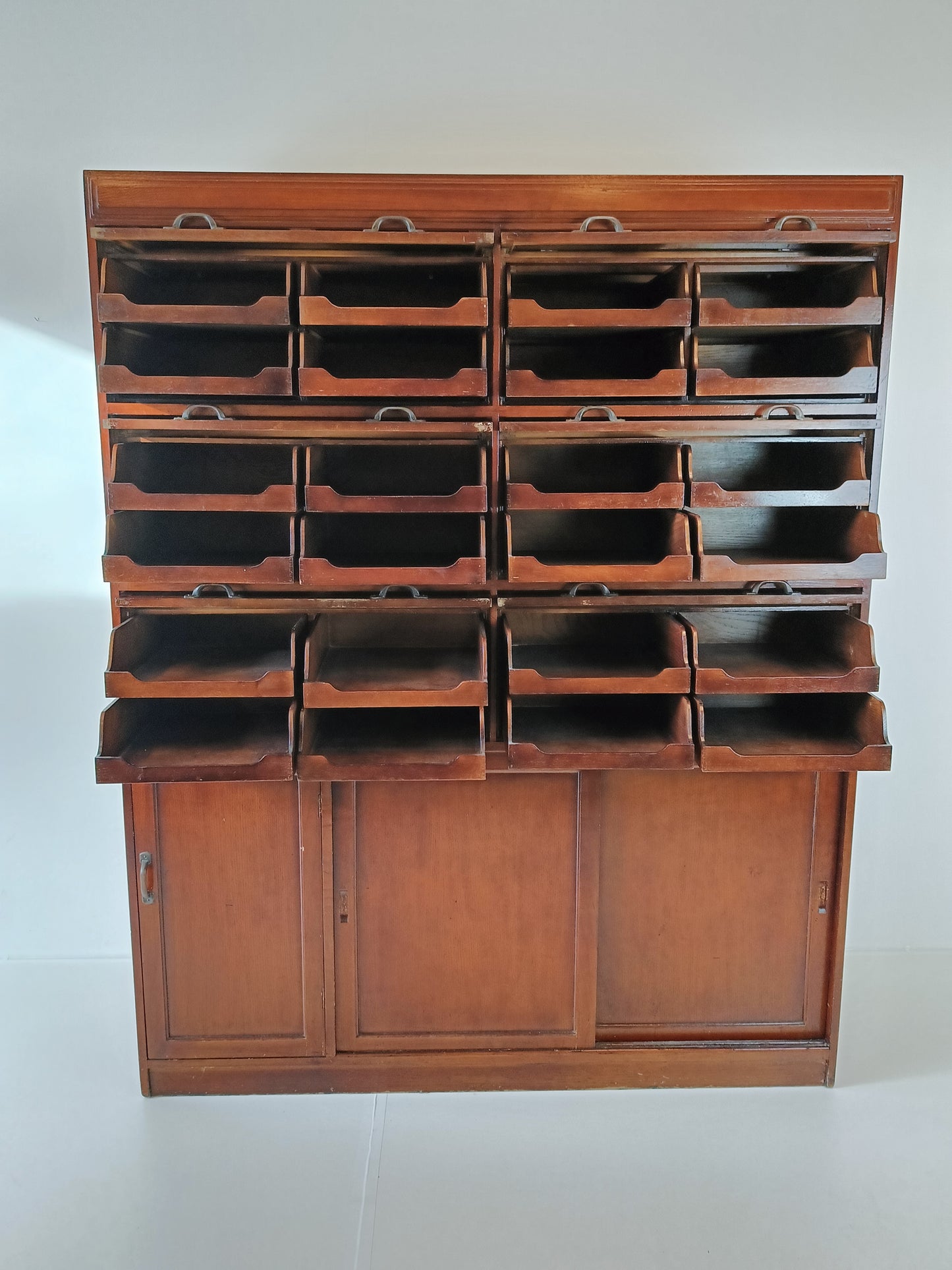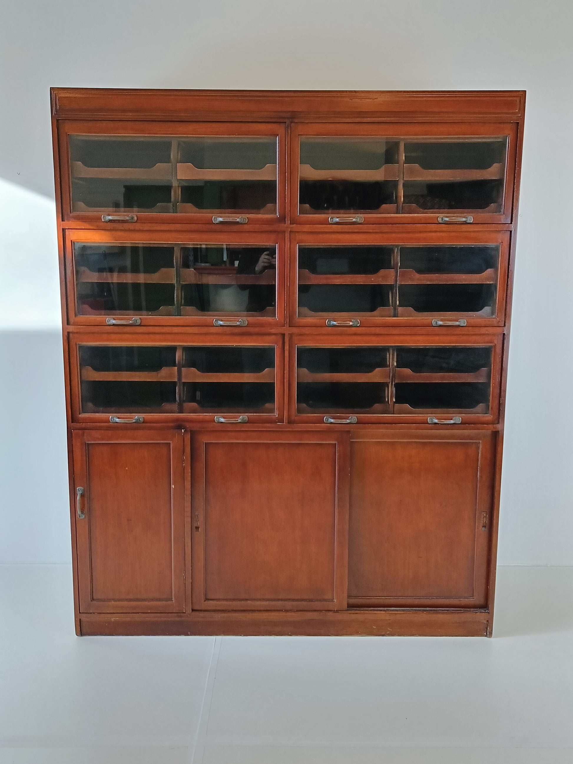 Antique mahogany shop cabinet with 24 drawers behind glasses in sliding doors and 6 large closed drawers. Made entirely of solid mahogany. Very nice quality. With these types of shop cabinets from the beginning of the 20th century, you don't often see that the whole is made of solid wood. Light traces of use origin: England period: ca. 1900-1920