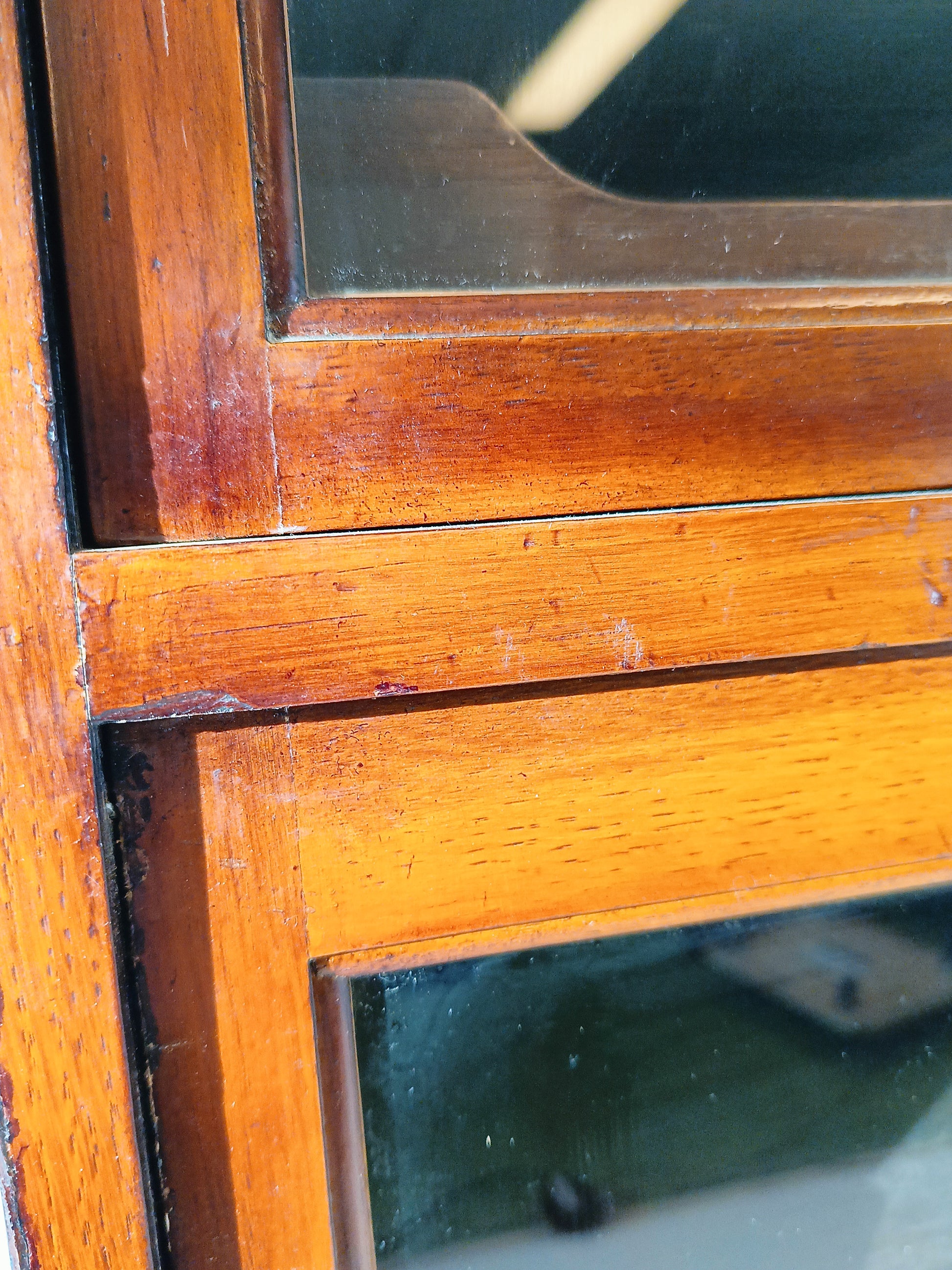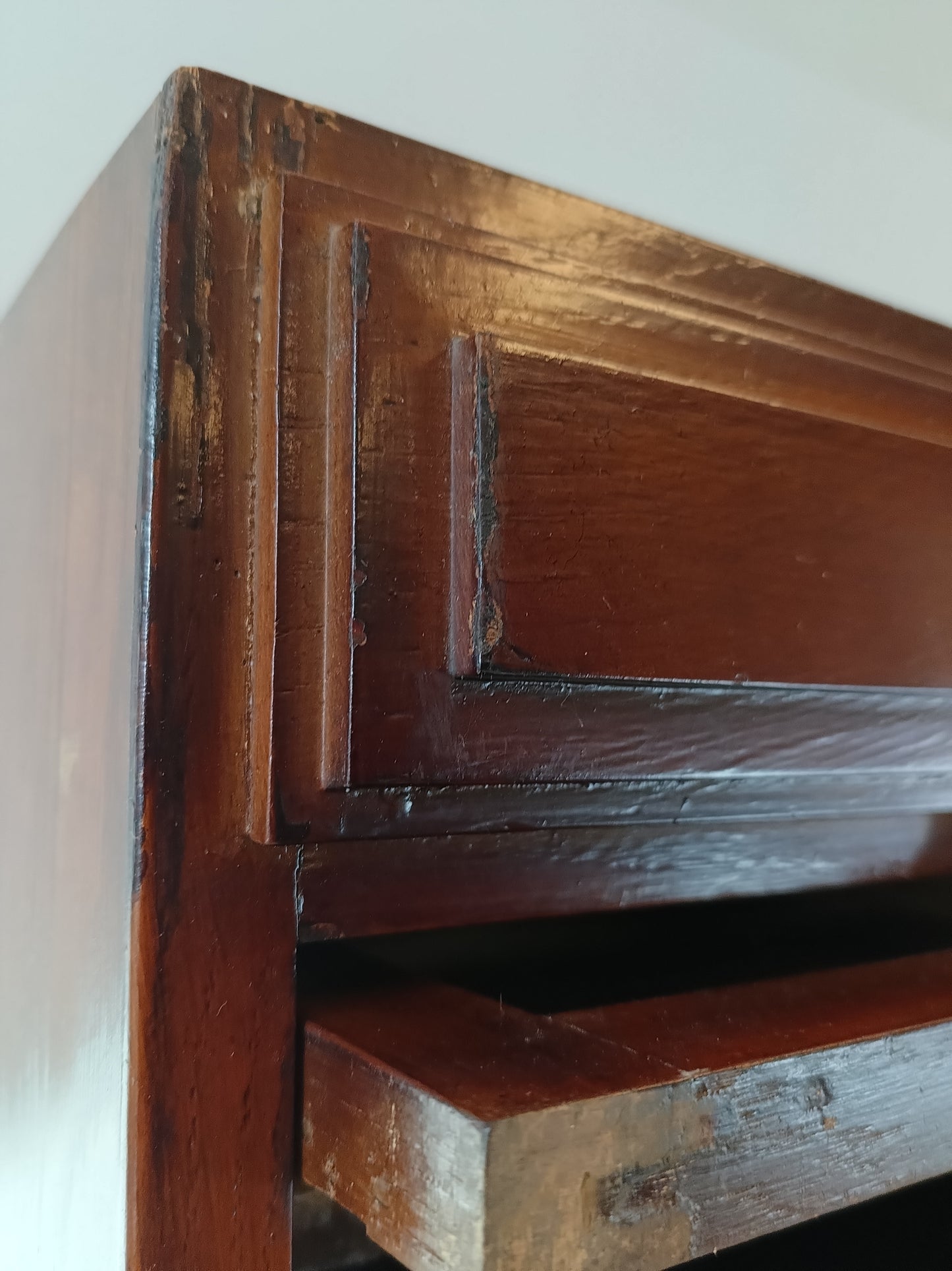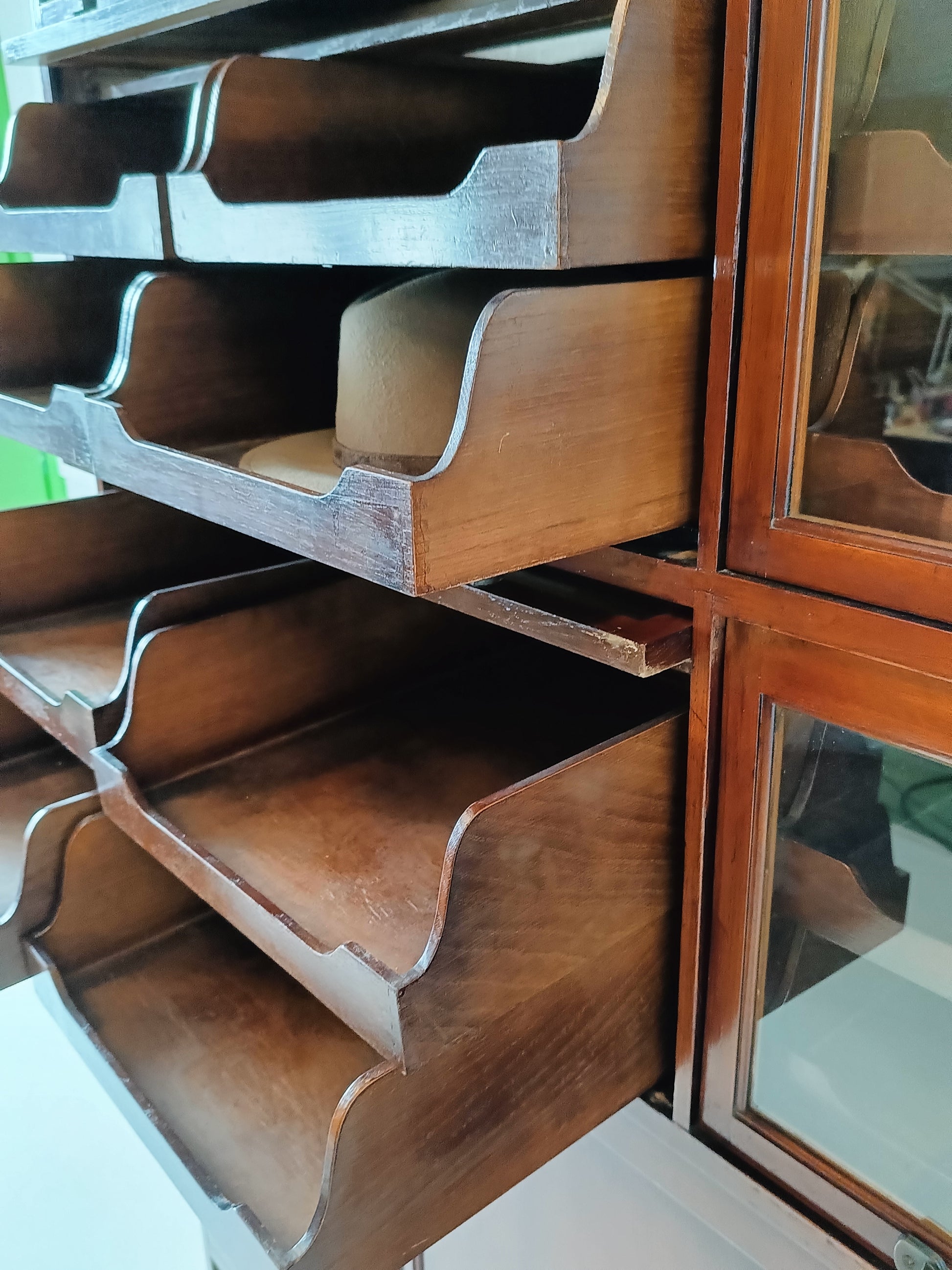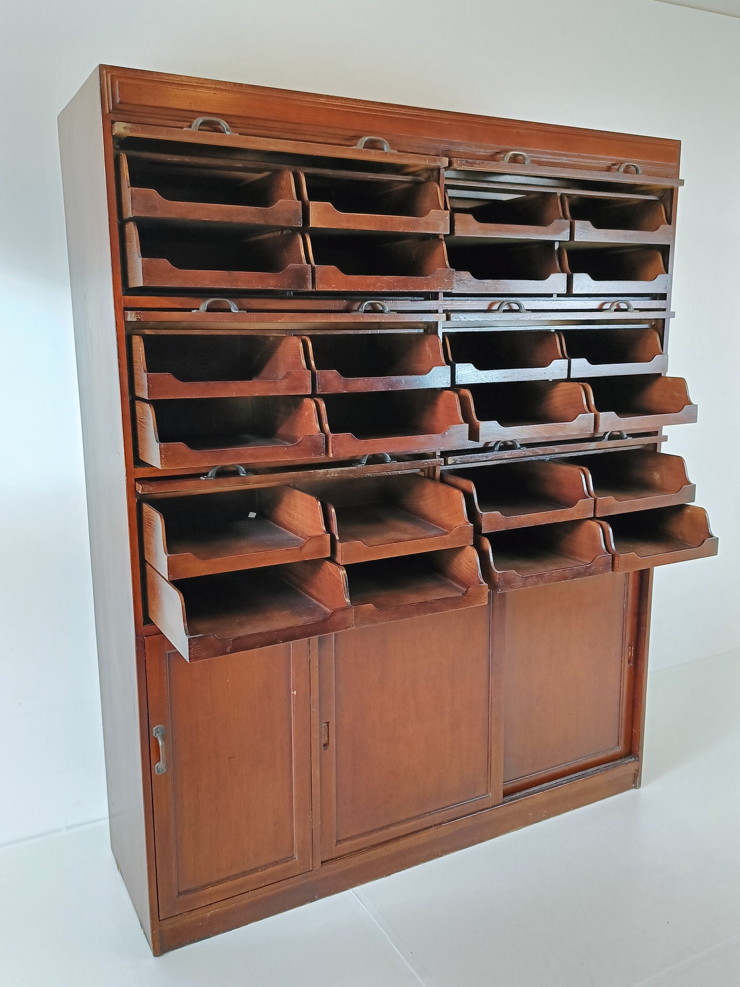 Antique mahogany shop cabinet with 24 drawers behind glasses in sliding doors and 6 large closed drawers. Made entirely of solid mahogany. Very nice quality. With these types of shop cabinets from the beginning of the 20th century, you don't often see that the whole is made of solid wood. Light traces of use origin: England period: ca. 1900-1920