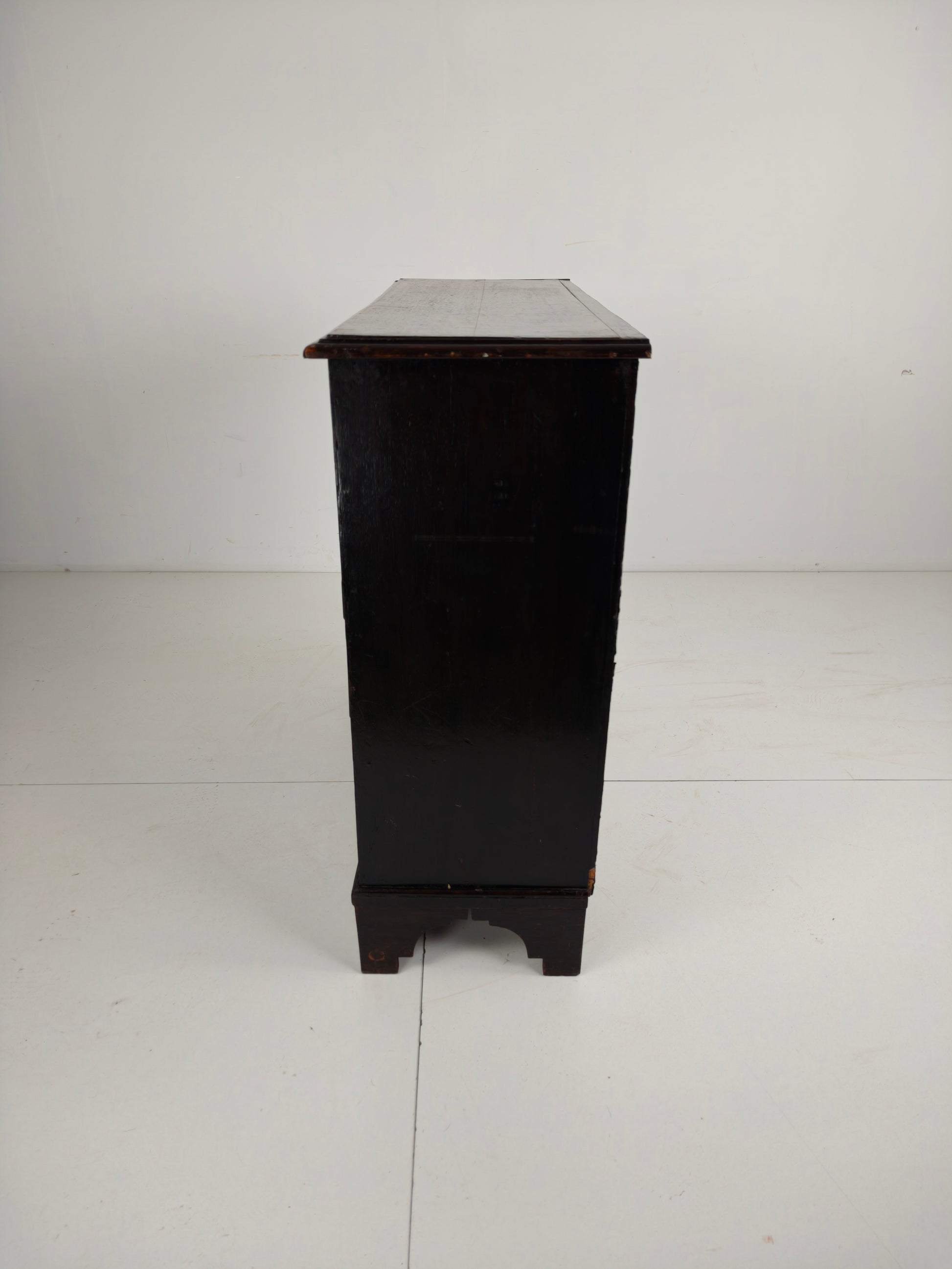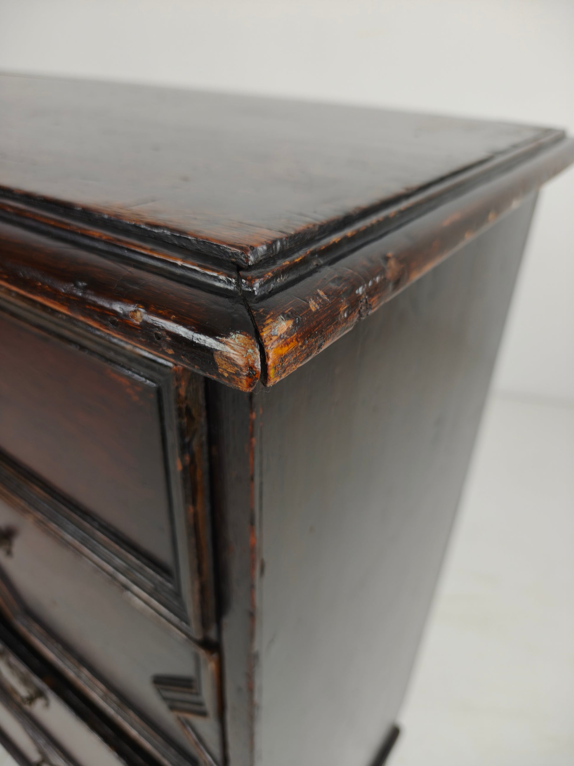 A beautiful 17th-century oak chest of drawers with classic geometric panelling, dating to around 1680. This piece features an attractive, well-balanced design and an unusually shallow depth, making it ideal for a narrower hallway or smaller space.