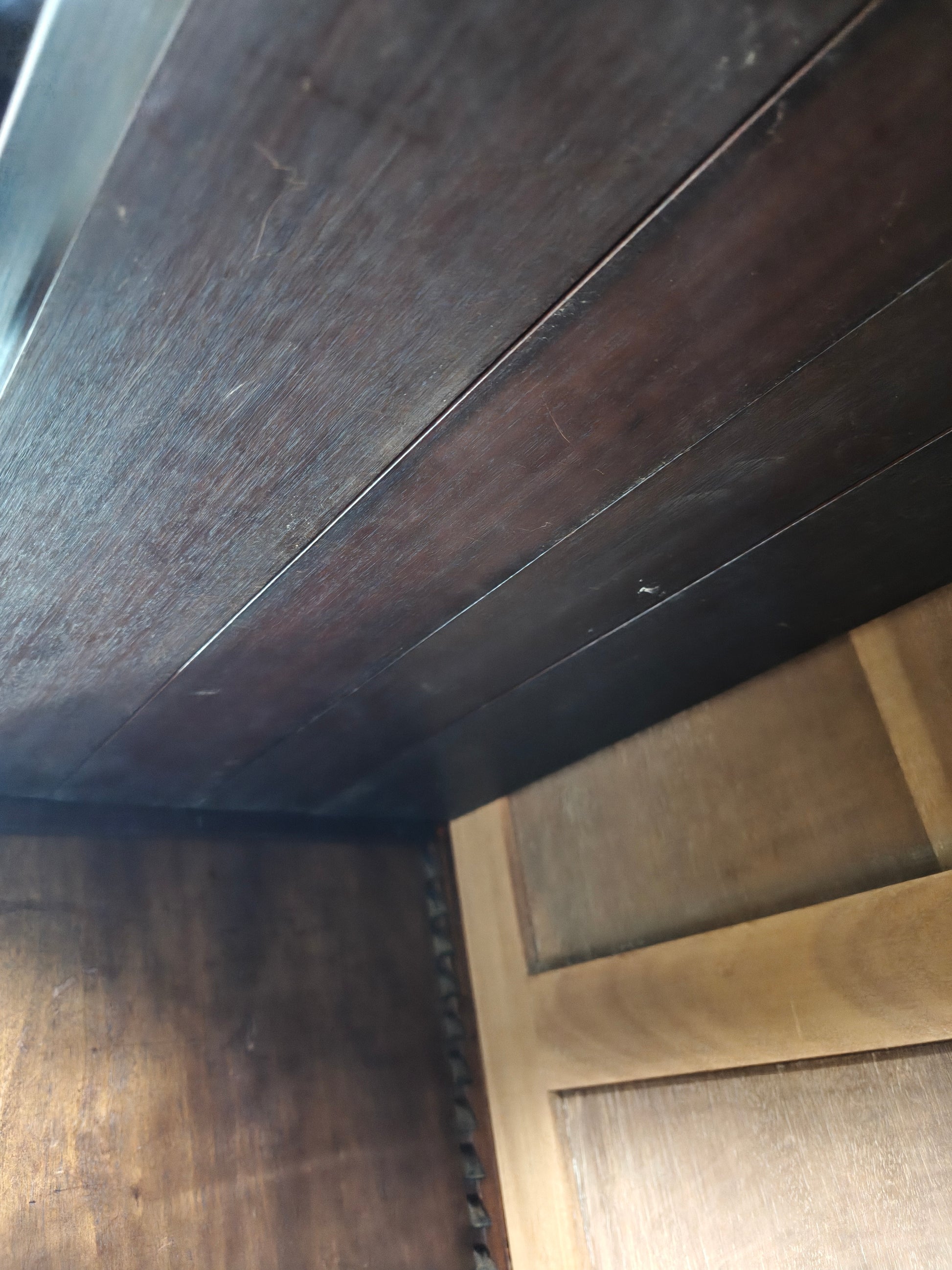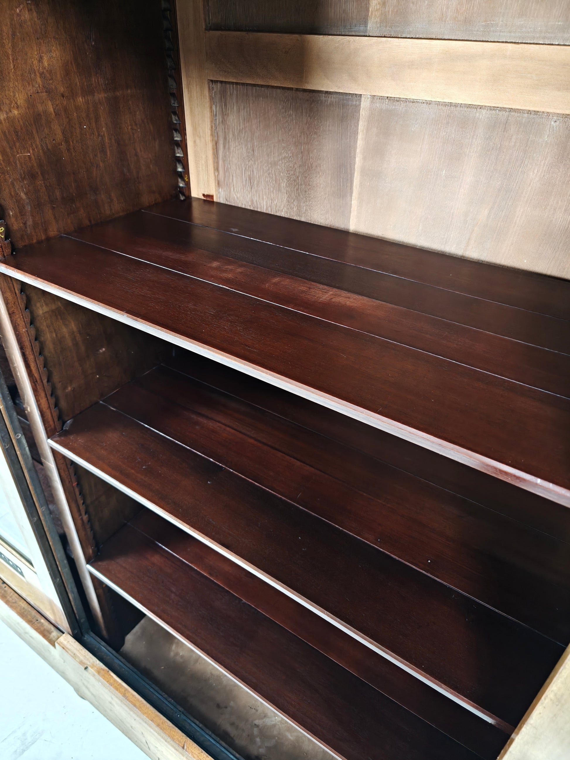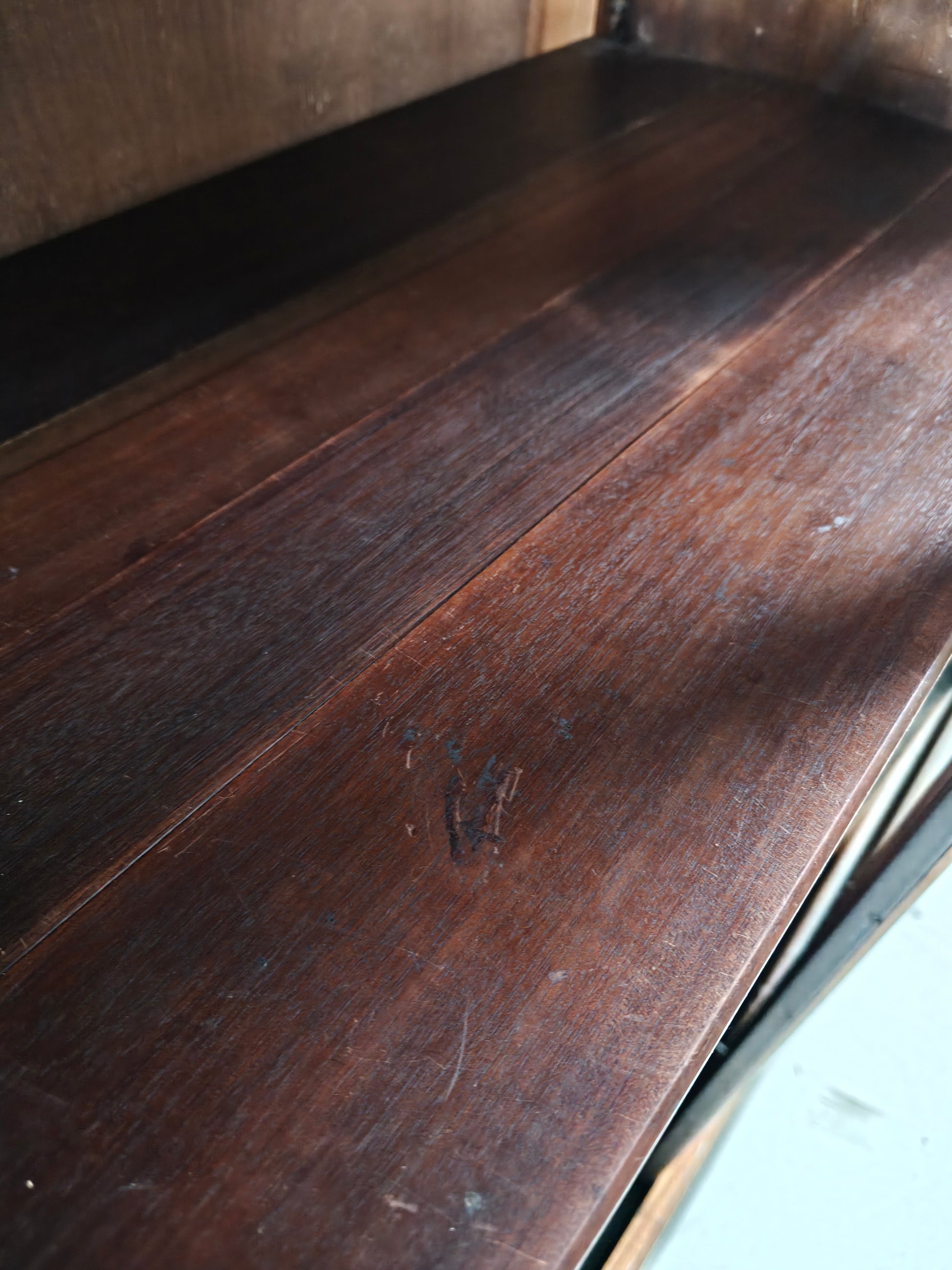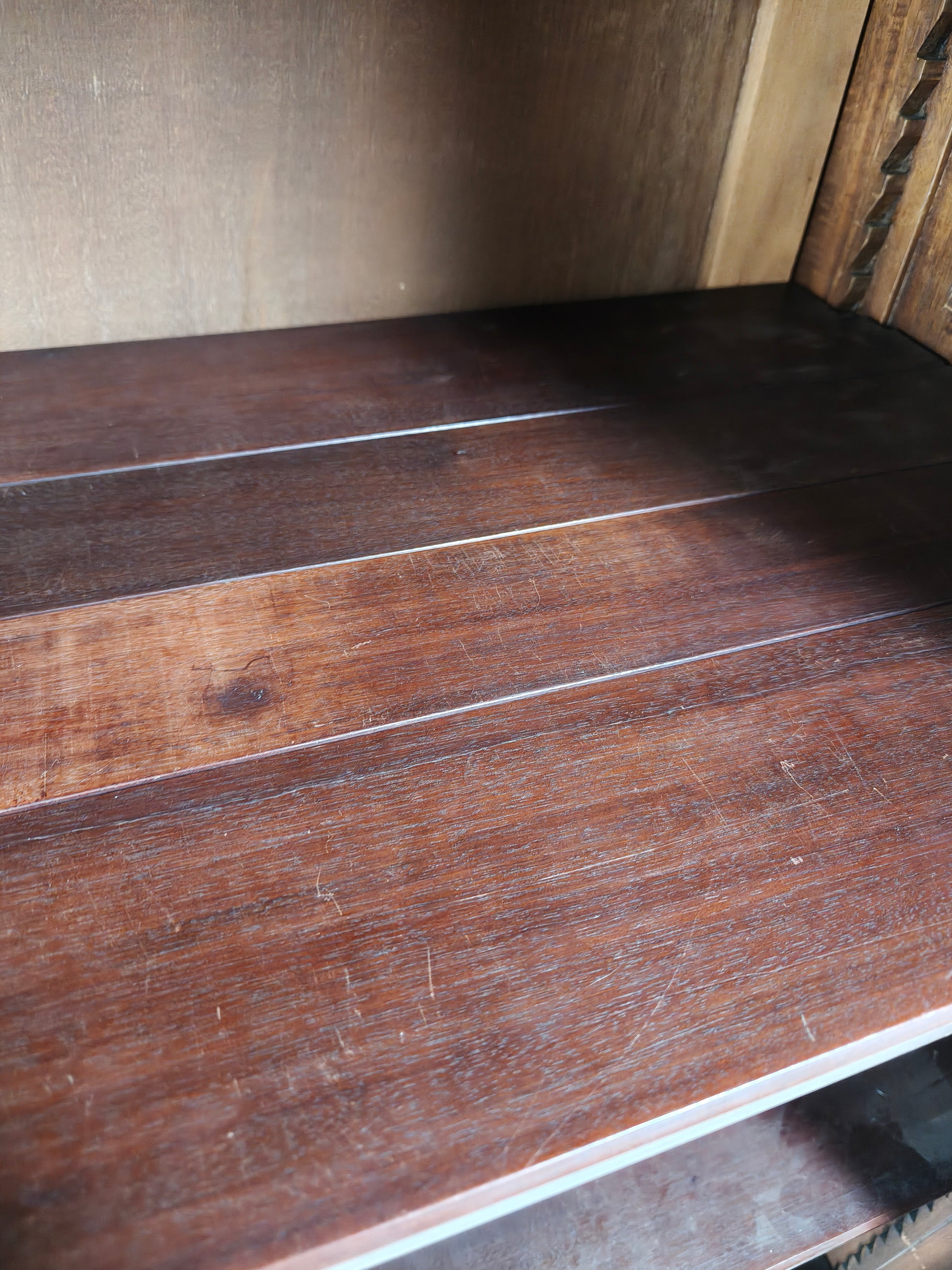 Has sliding doors and original old glass in the doors. The twelve shelves are made out of solid mahogany wood. Can be reassembled for easy transport options. Has signs of wear consistant with age and use.
