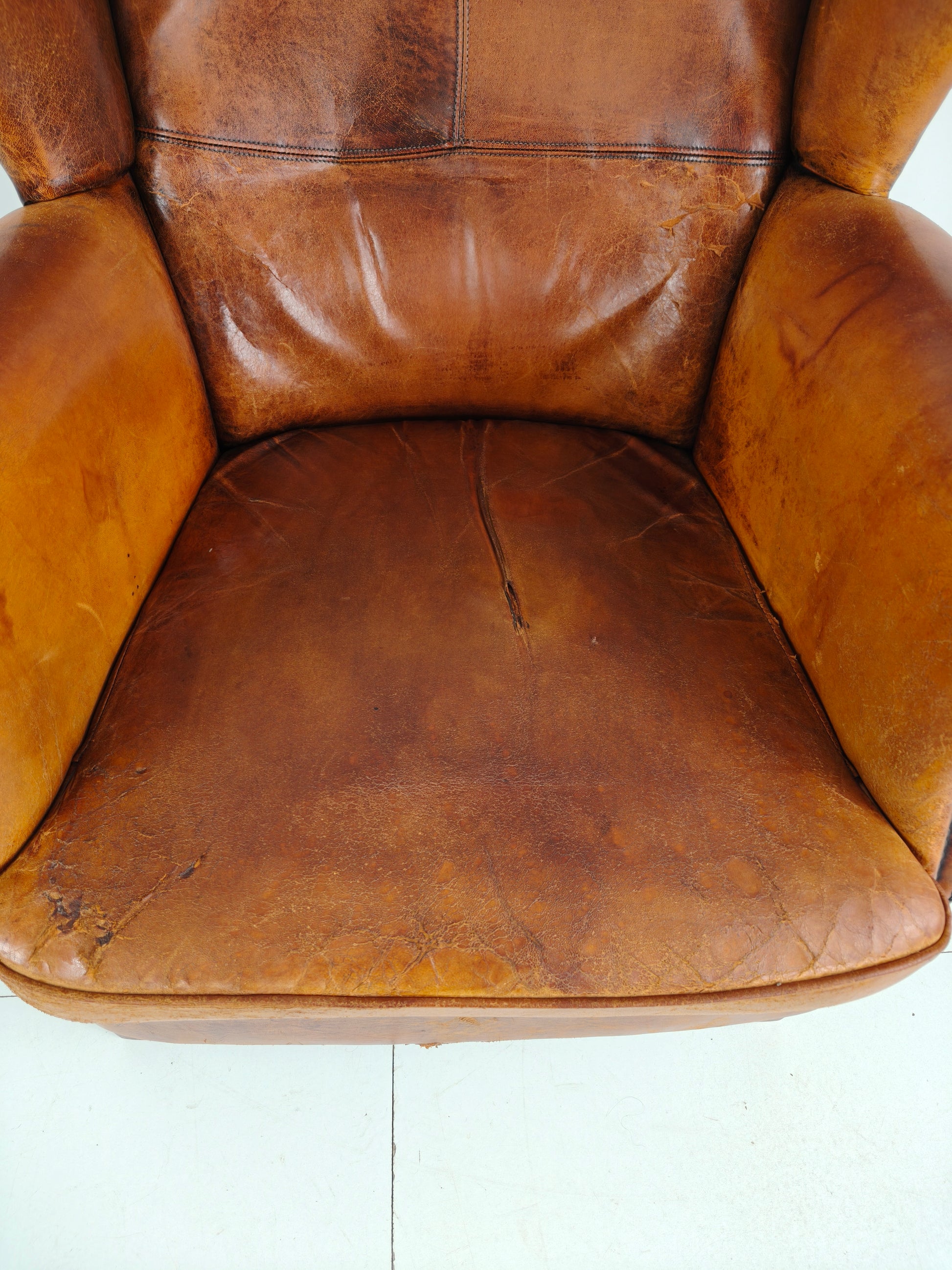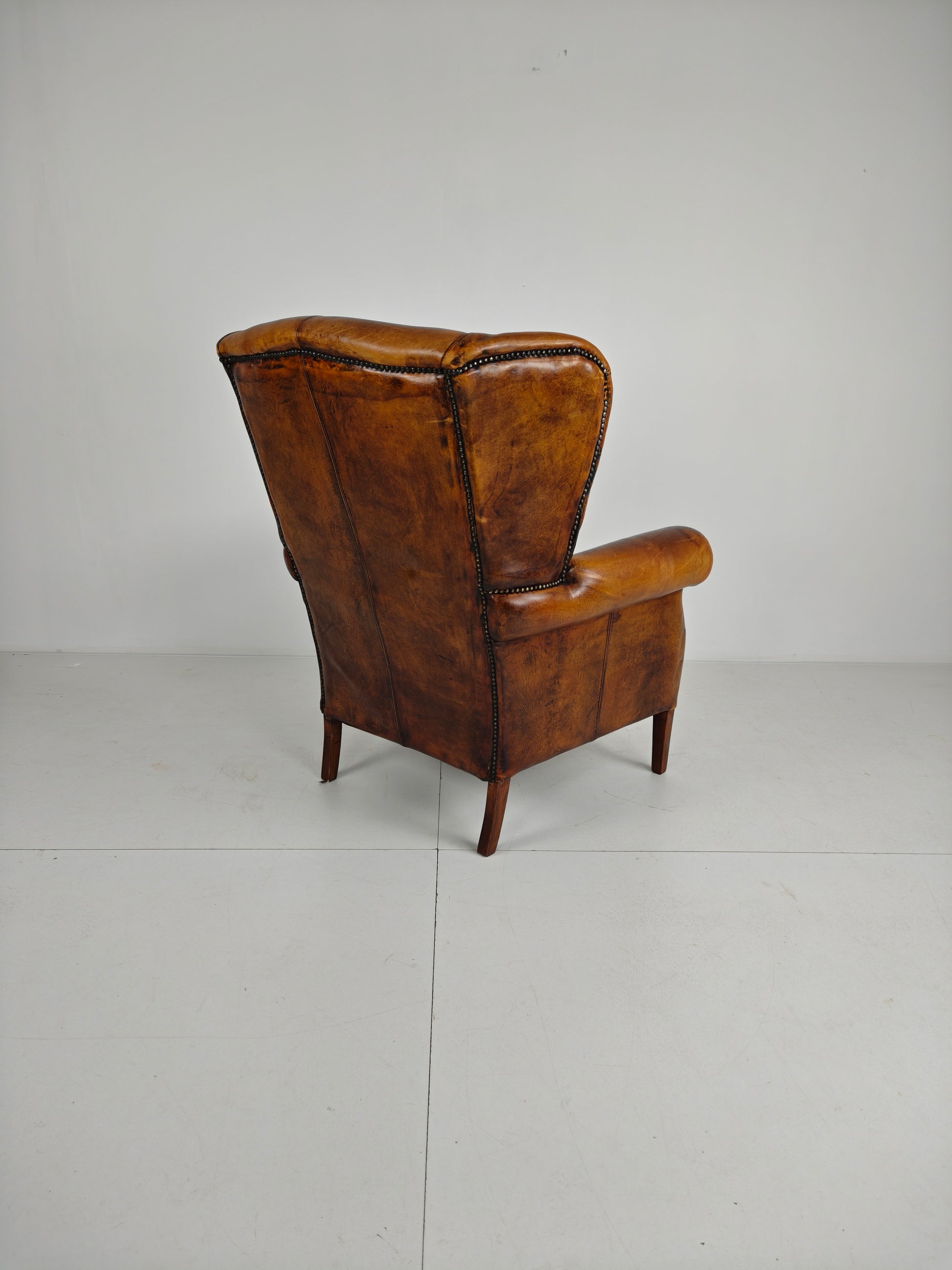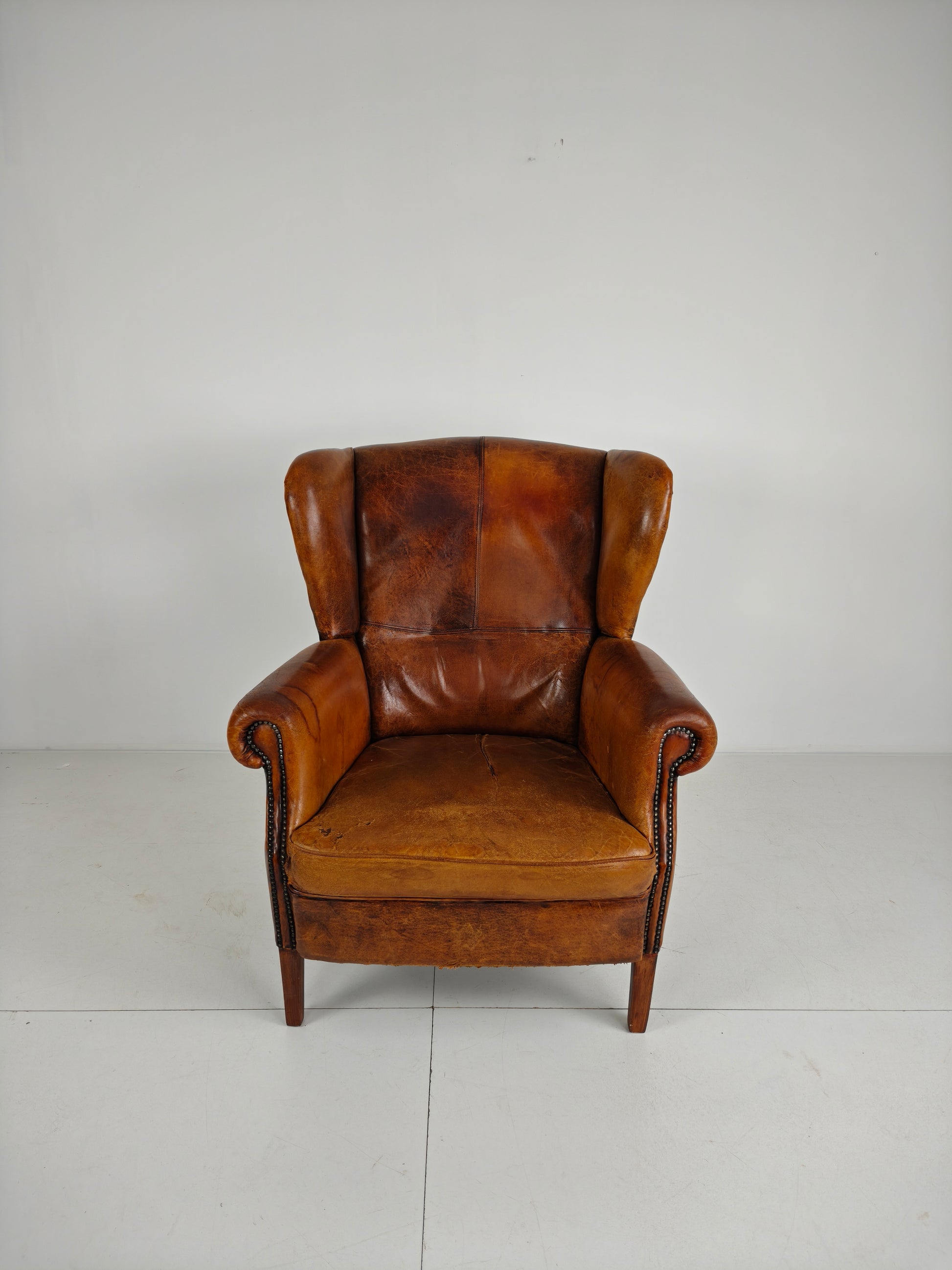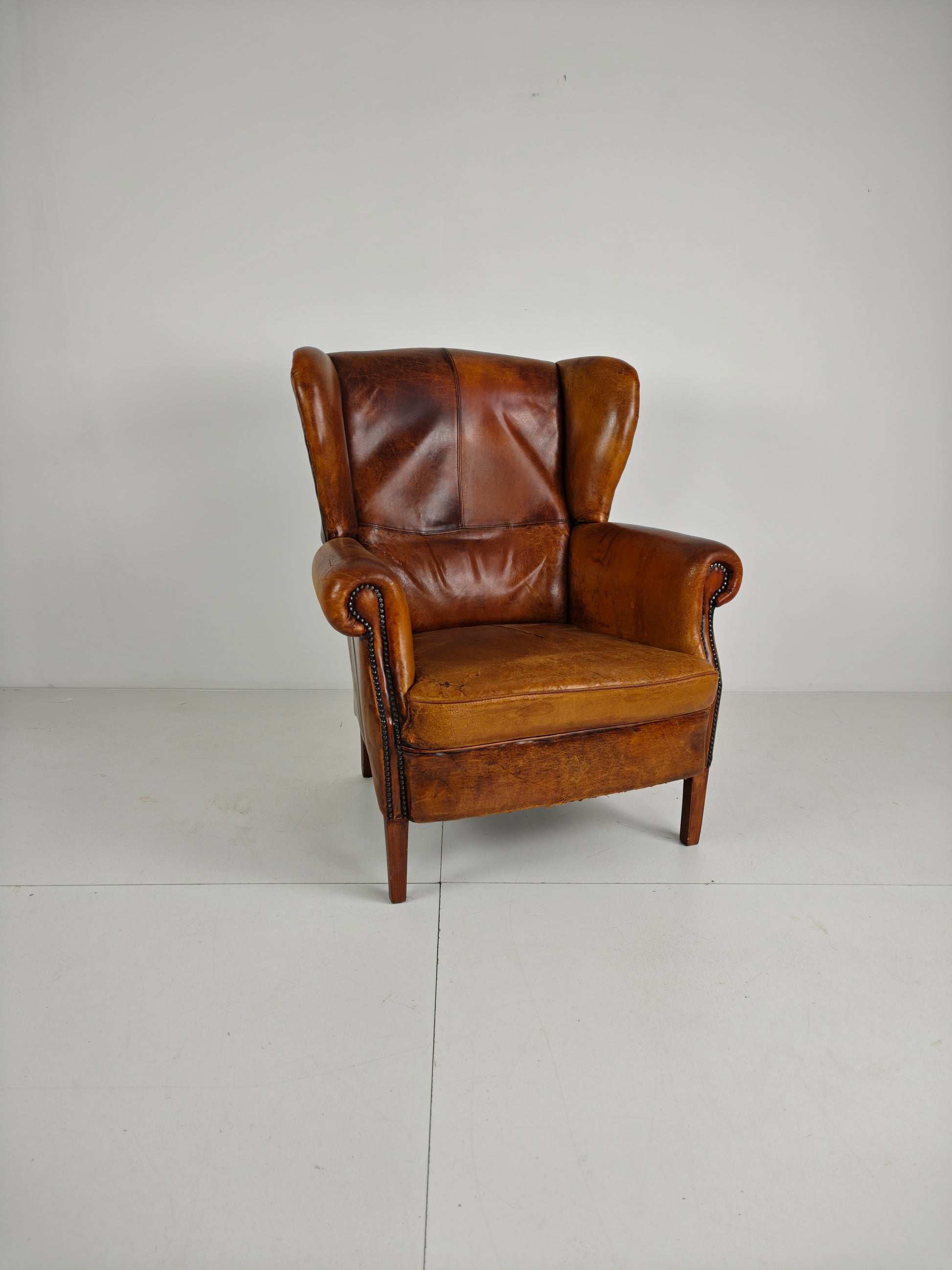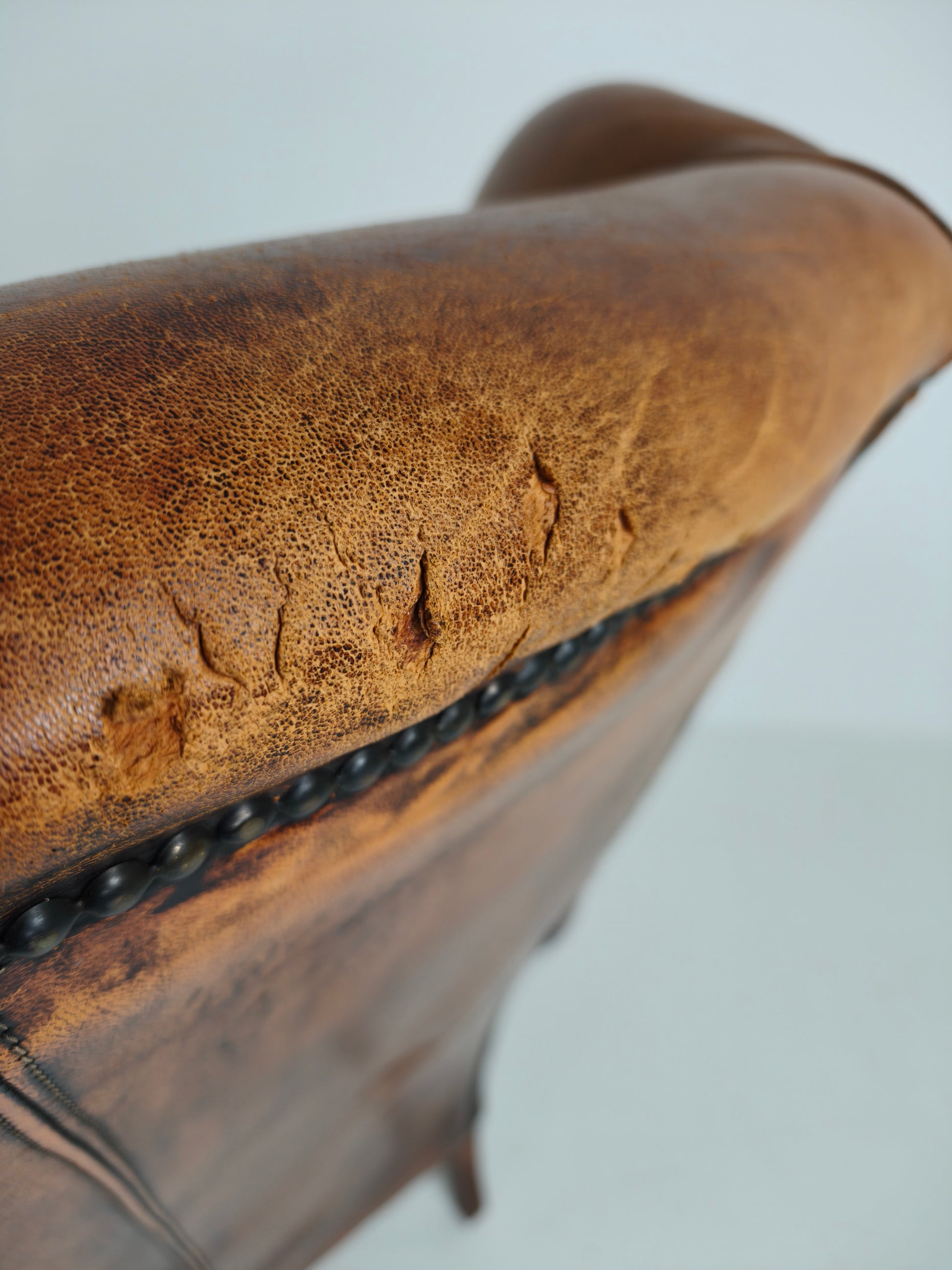 Large wingback armchair made of sheepskin leather shows beautiful signs of wear, giving it a unique character. one repair on the seat (see photos), but these imperfections only add to the chair's history and charm.