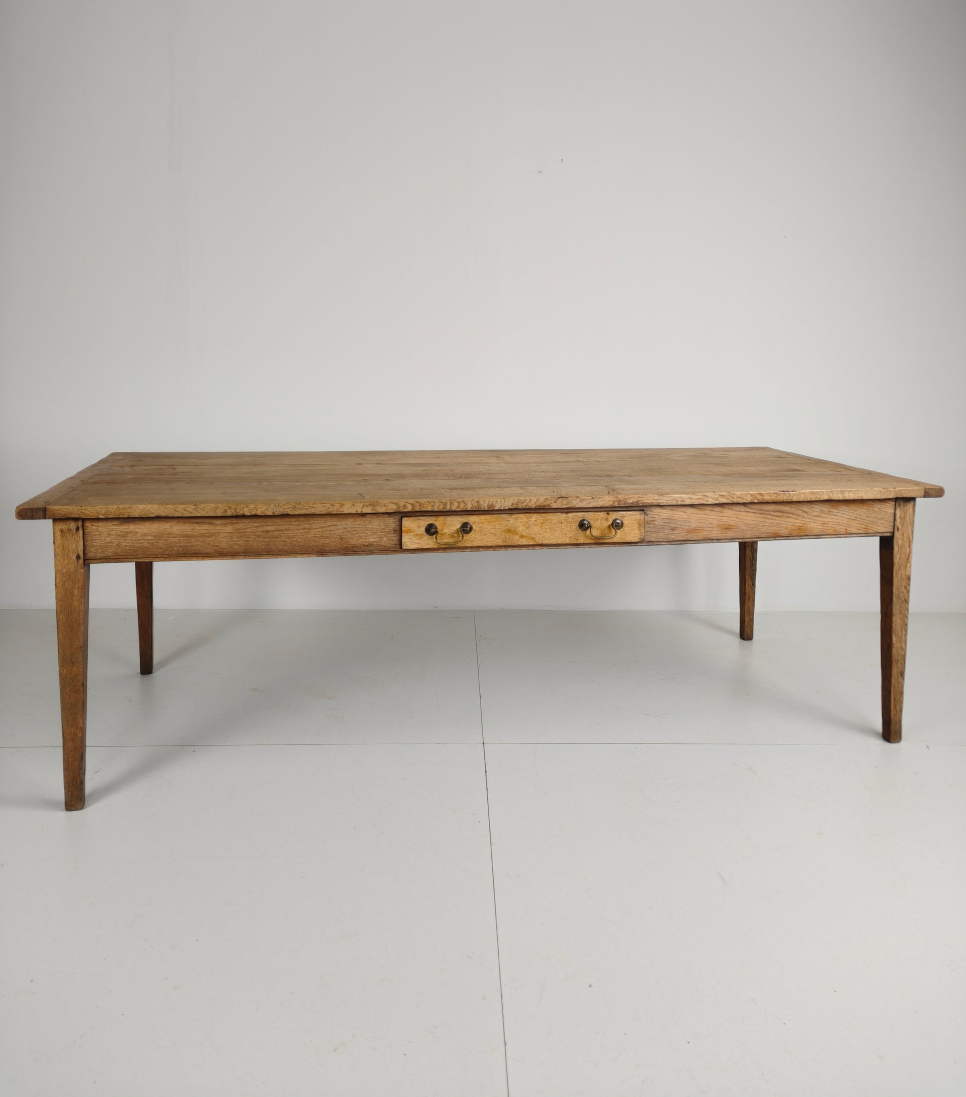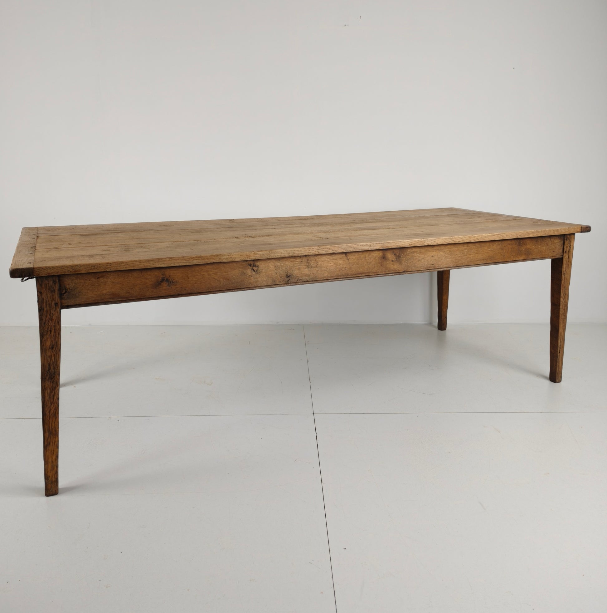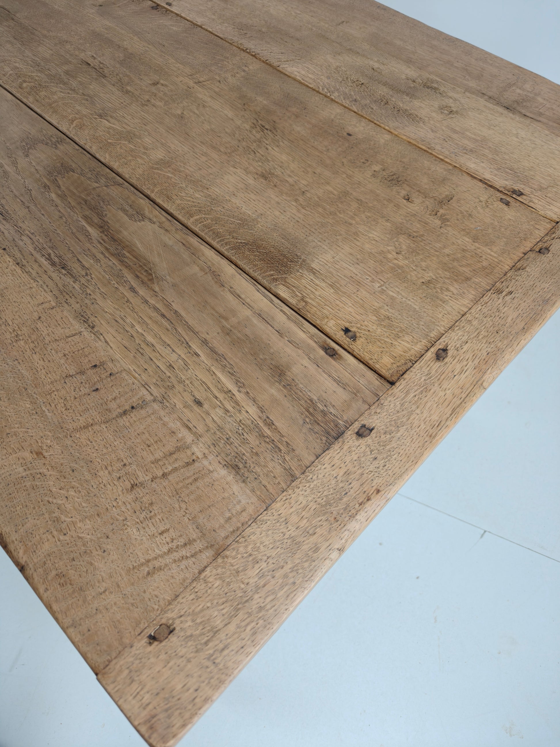 This antique 1900 French farmhouse dining table with rustic charm and timeless elegance. Crafted from solid oak wood, it features a beautiful, well-worn patina that showcases its rich history and character. The table’s sturdy construction reflects the craftsmanship of the period, while its aged surface bears signs of wear consistent with its age and use, adding to its authenticity and appeal.