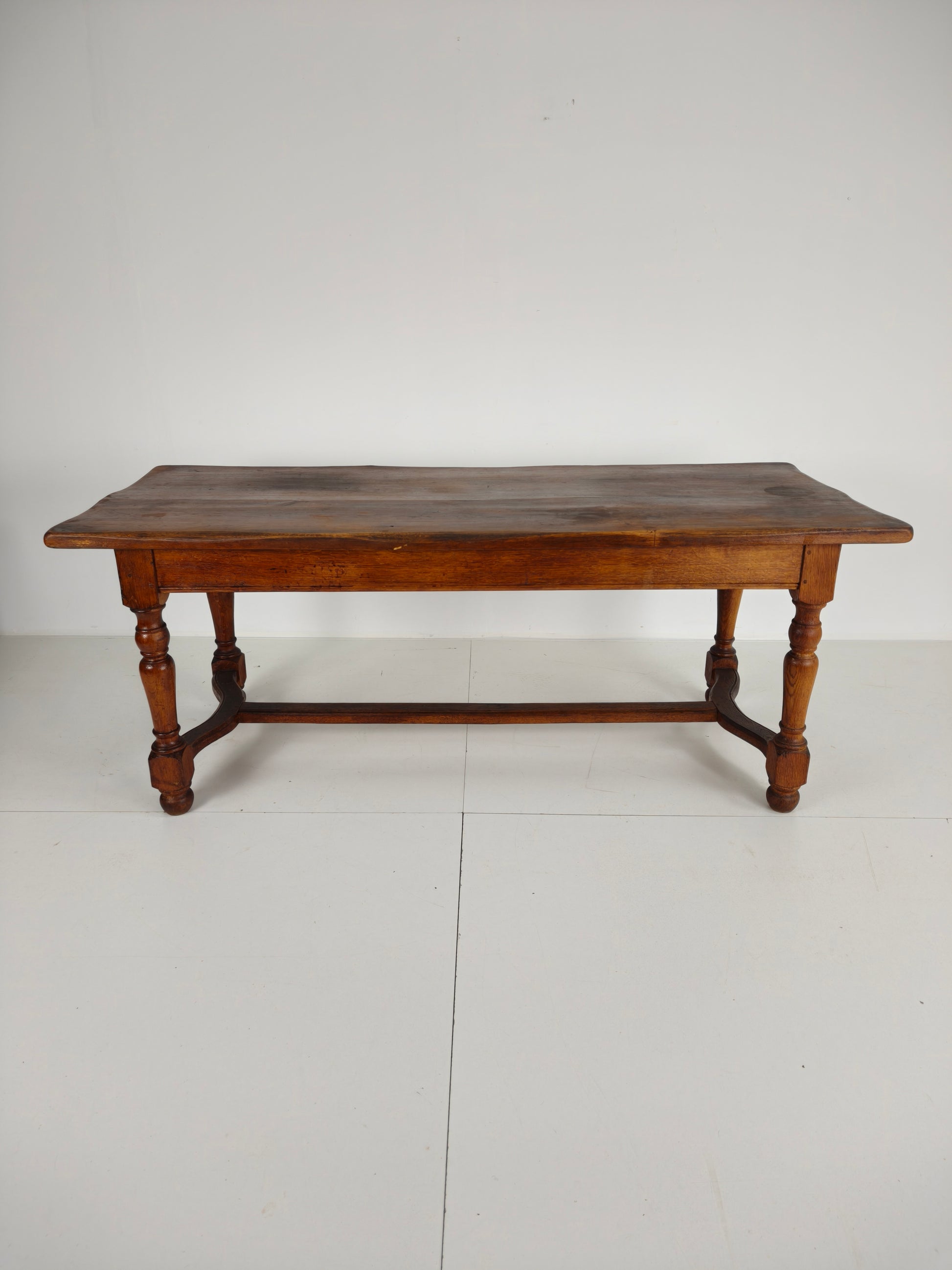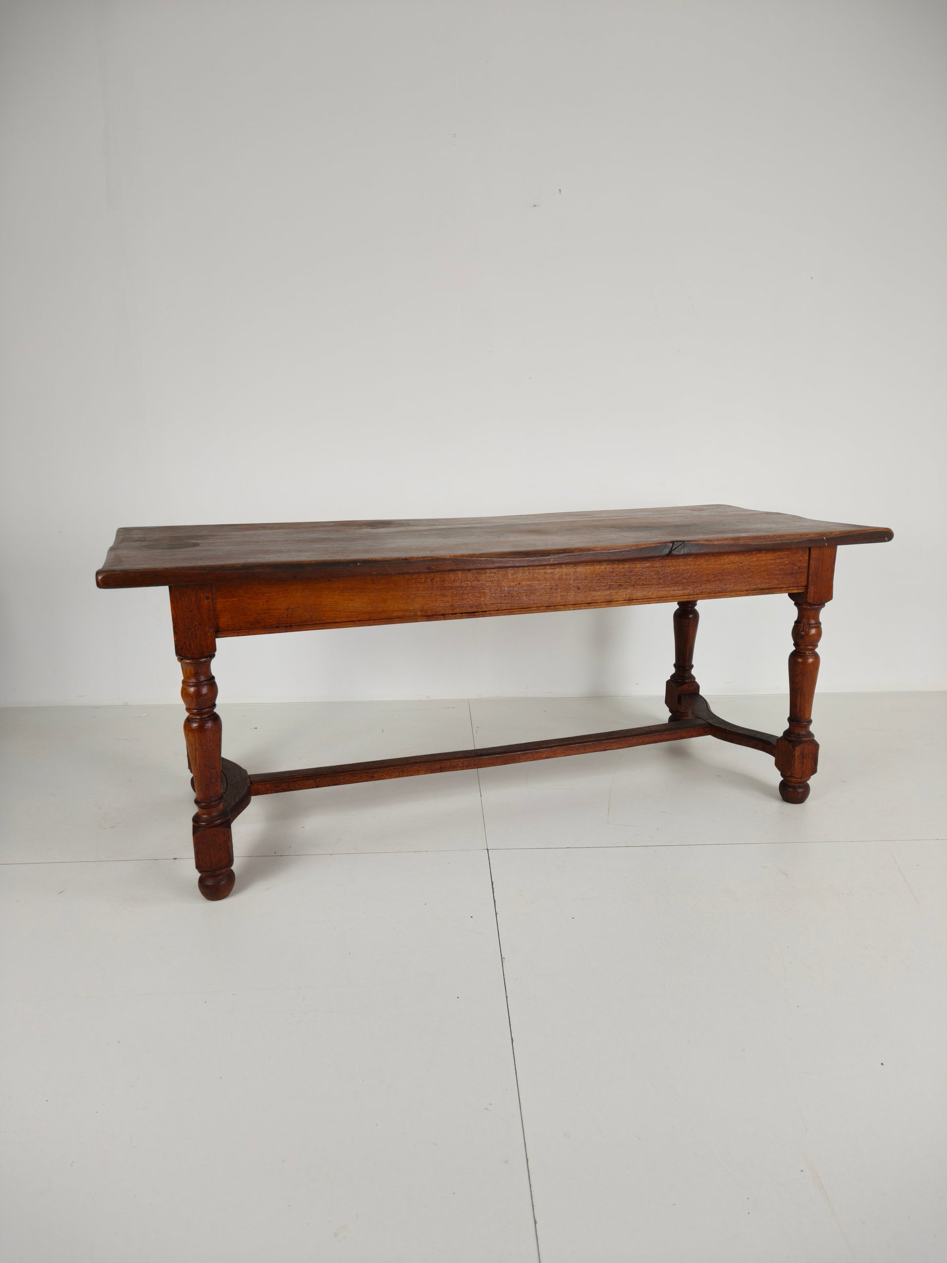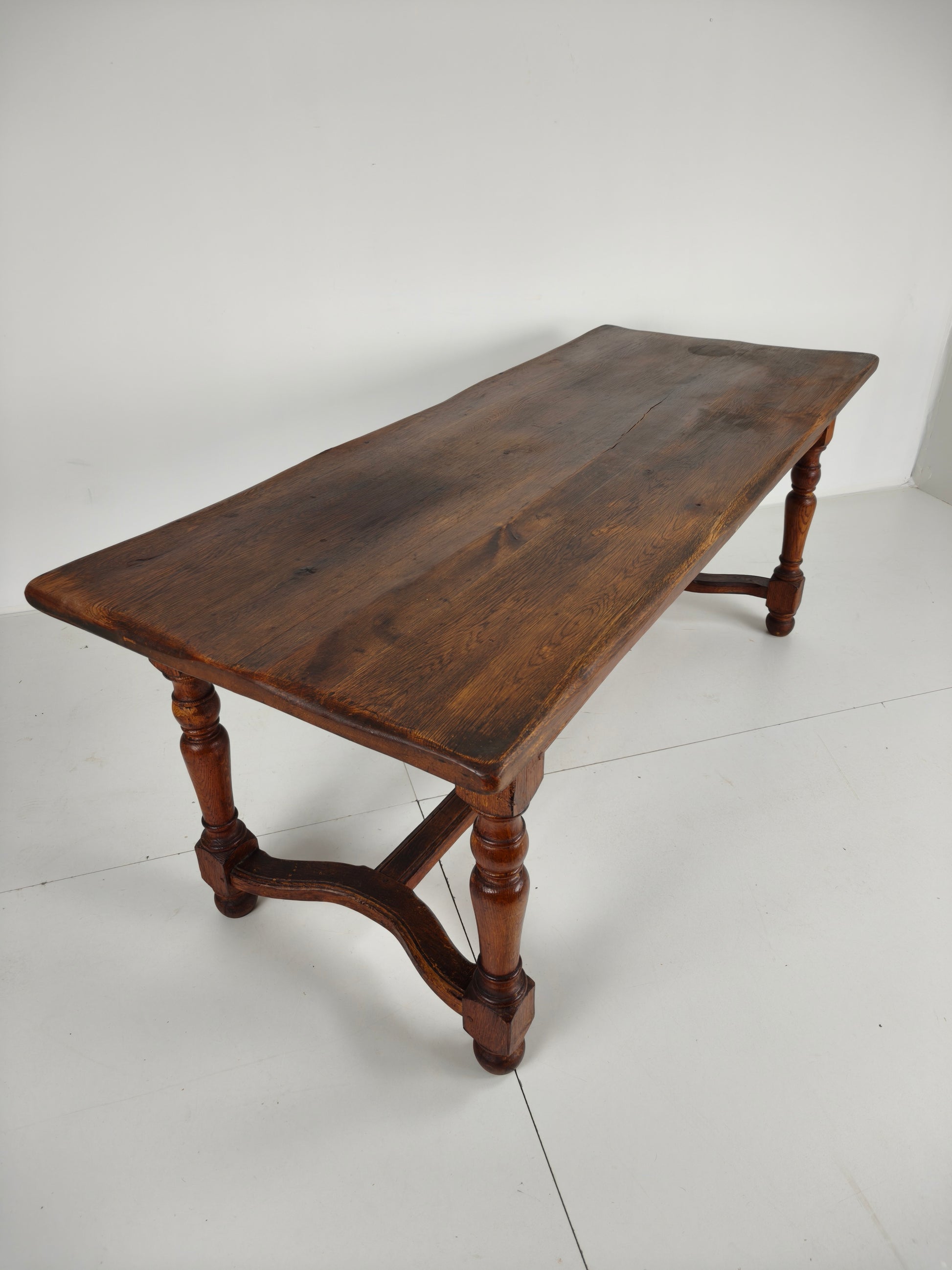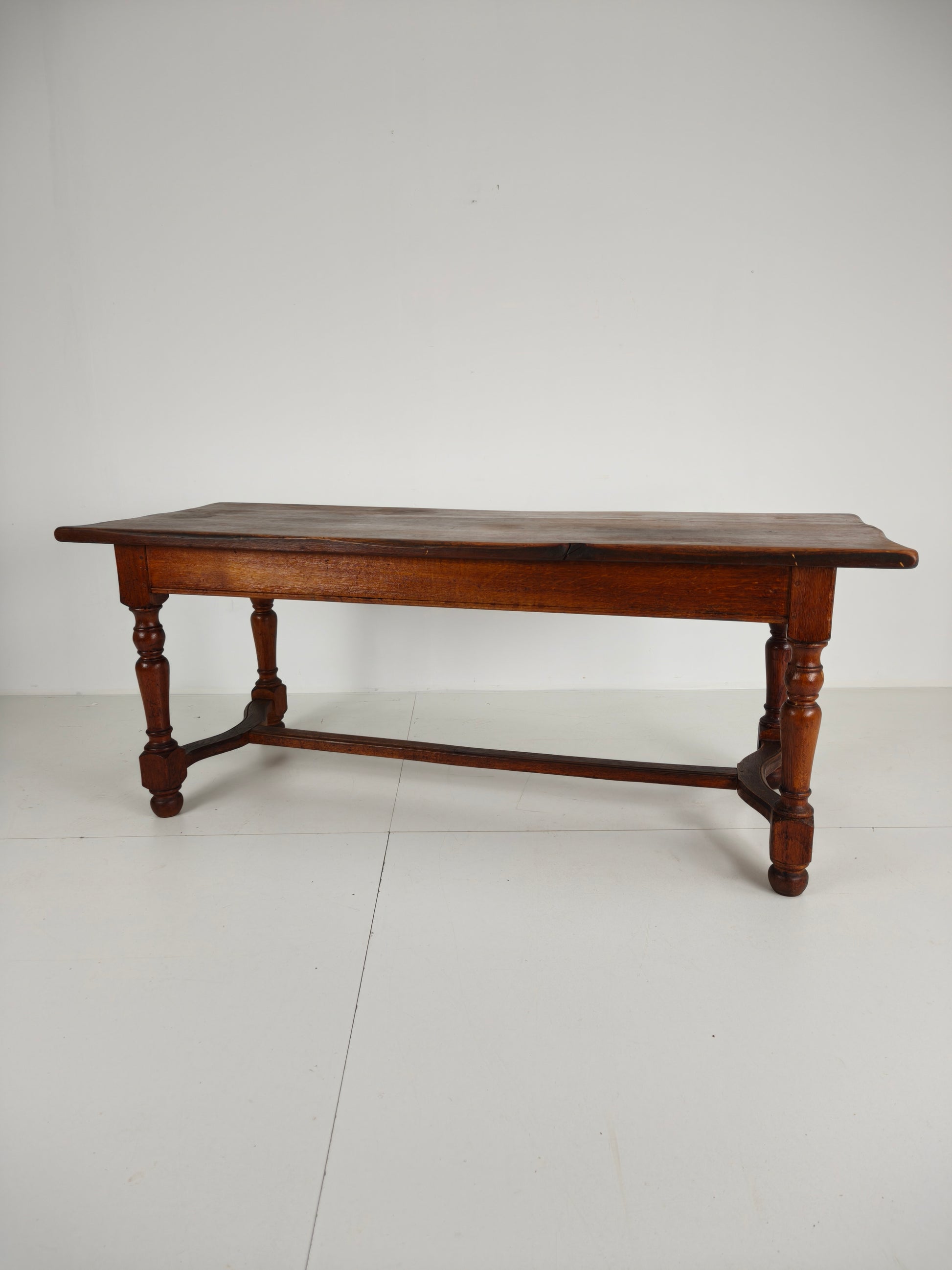 This charming French farmhouse table is crafted from solid oak with a beautiful single-plank top and classic turned legs. Dating from the early 20th century, it has a warm, authentic character with visible signs of use that add to its rustic appeal (see photos).
