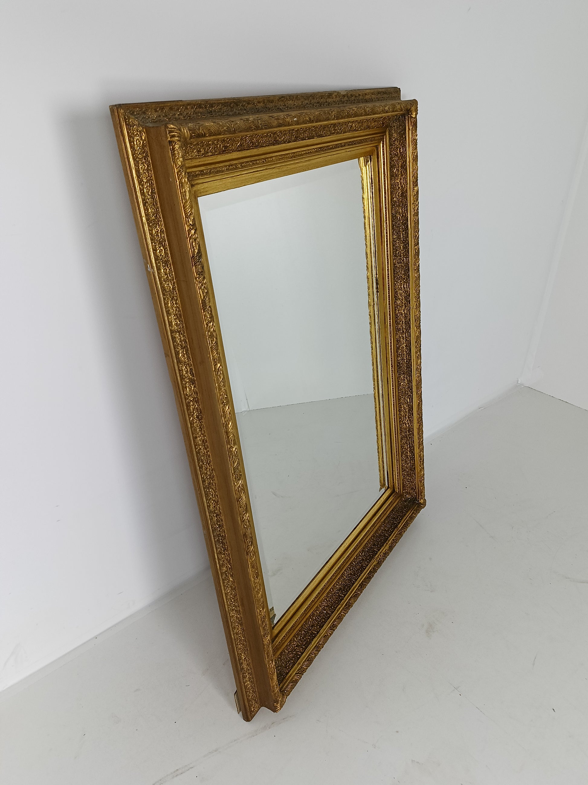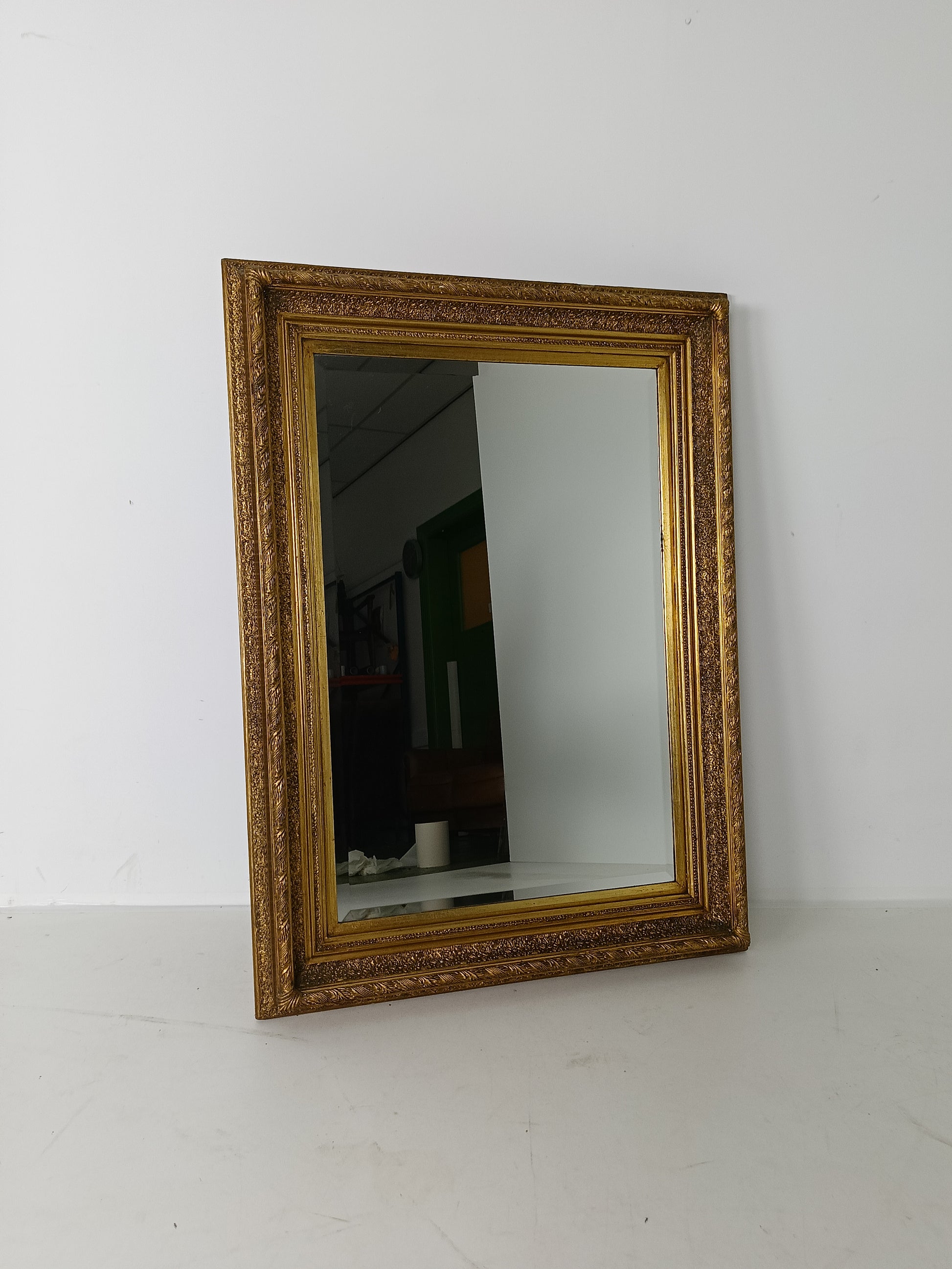 This antique mirror radiates timeless elegance with its intricately crafted frame and beautifully aged patina. Its vintage charm and reflective surface make it a striking centerpiece, perfect for adding character to any space. Wooden frame. Has signs of wear consistant with age and use.
