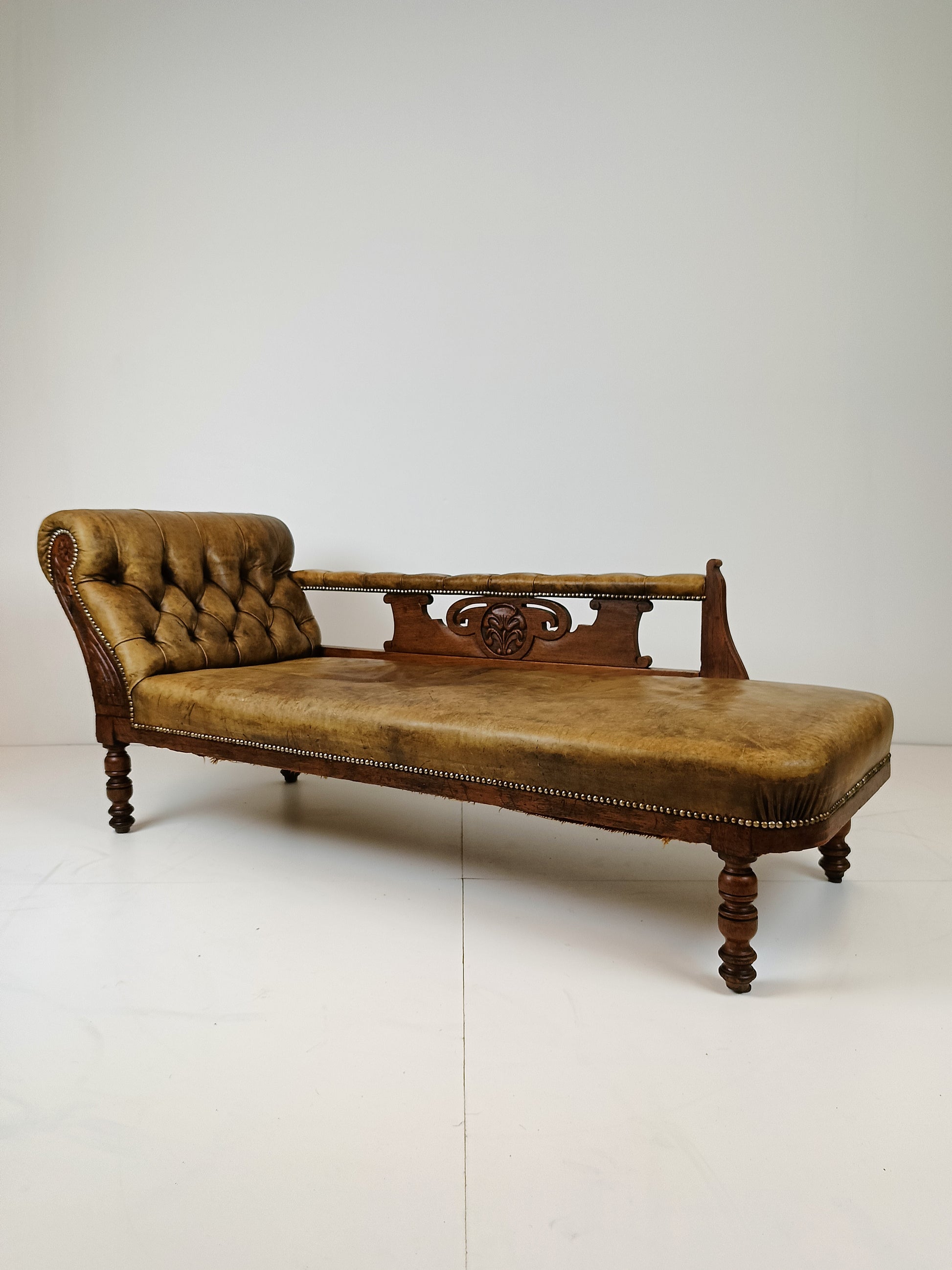 A Victorian oak chaise lounge with leather is a luxurious Victorian-style piece of furniture made from oak and high-quality leather. It has a classic look that matches an elegant interior.