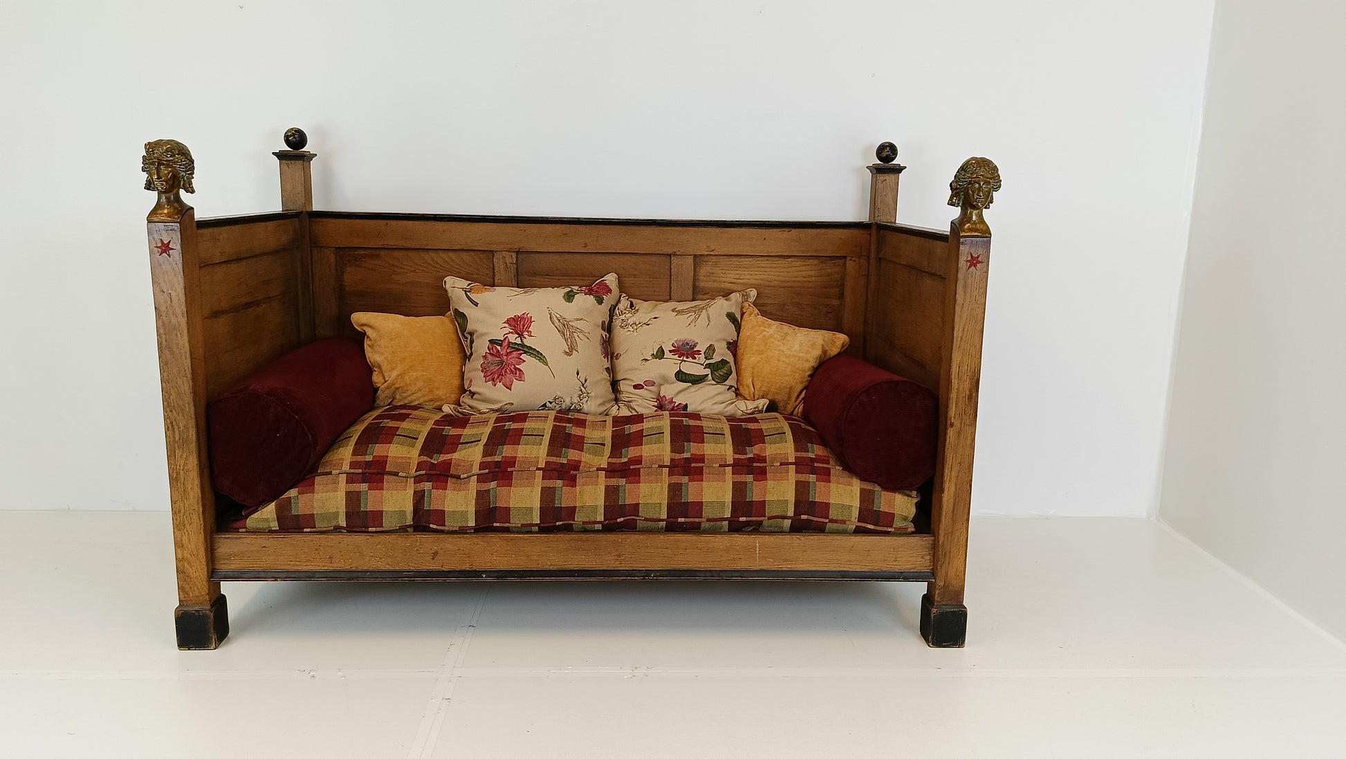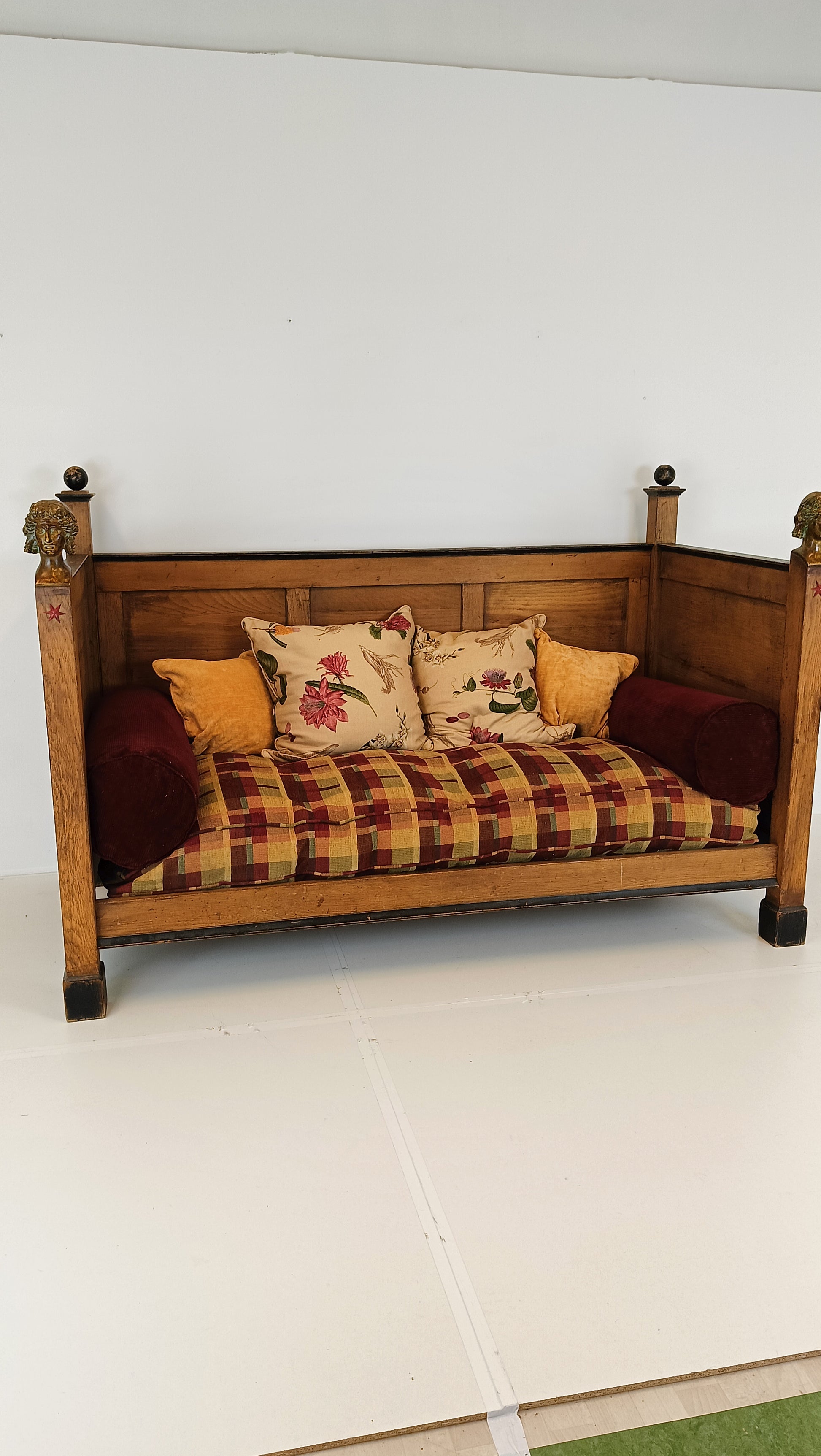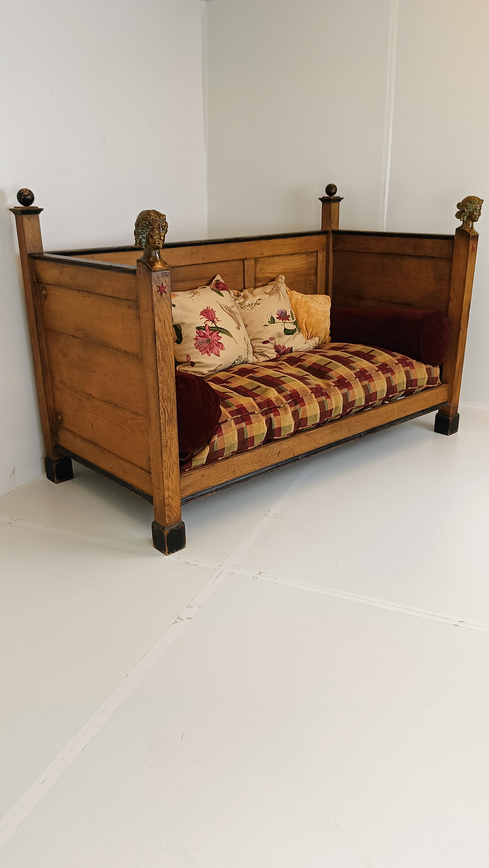 An Empire style sofa, which can function as both a bed and a sofa, exemplifies robust construction and elegant design. Characterized by its neoclassical aesthetic, this piece often features two distinctive bronze heads on the front, adding a touch of opulence and historical charm. The sturdy build ensures durability, while the luxurious materials and refined details reflect the grandeur of the Empire period. Ideal for those who appreciate both form and function, this versatile piece seamlessly blends practical use with this timeless item.