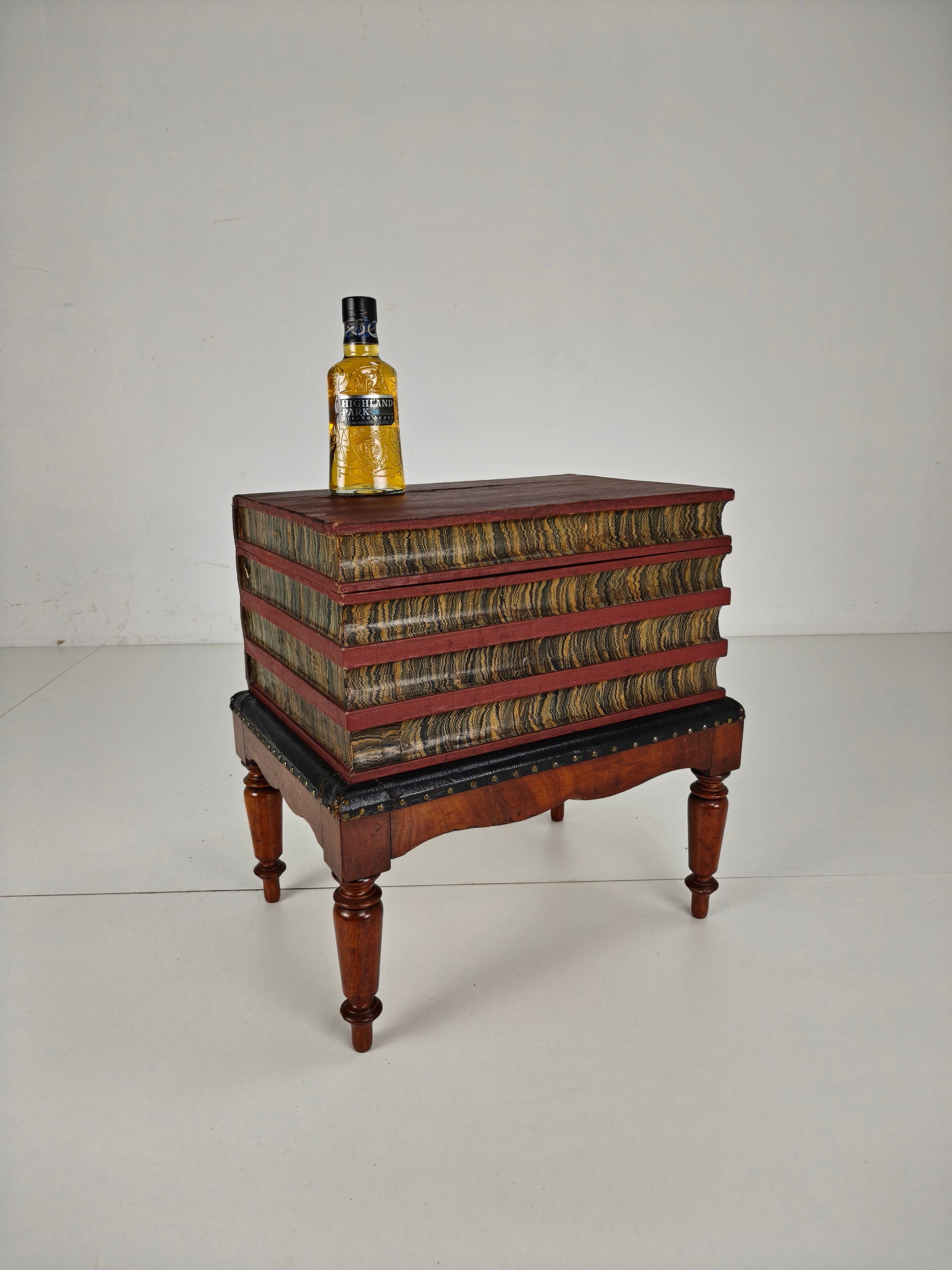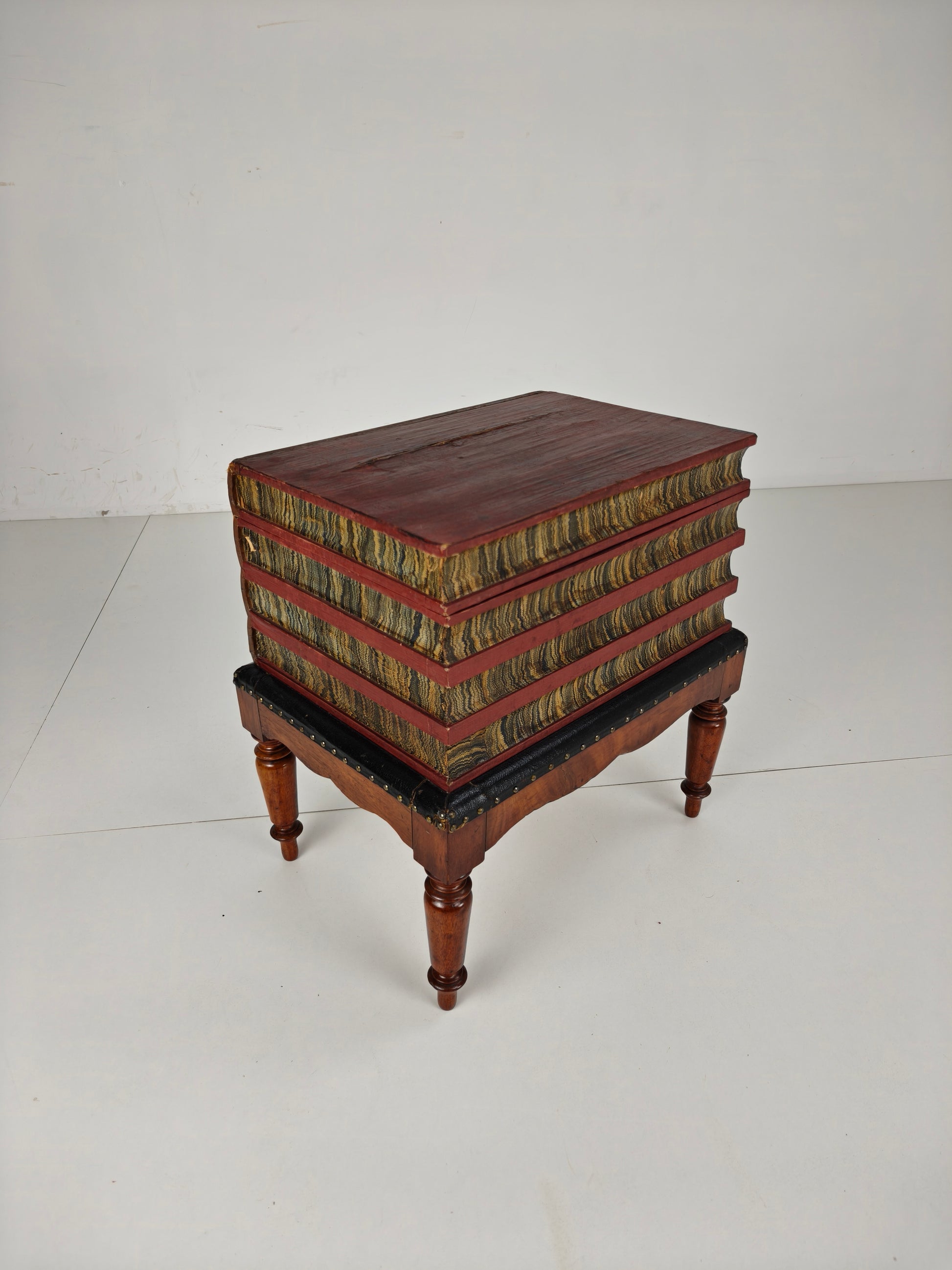A highly decorative Regency period faux book box, crafted in leather and mounted on a painted stand, dating to around 1830. Cleverly designed to imitate a stack of books, this piece combines whimsical charm with practical storage.