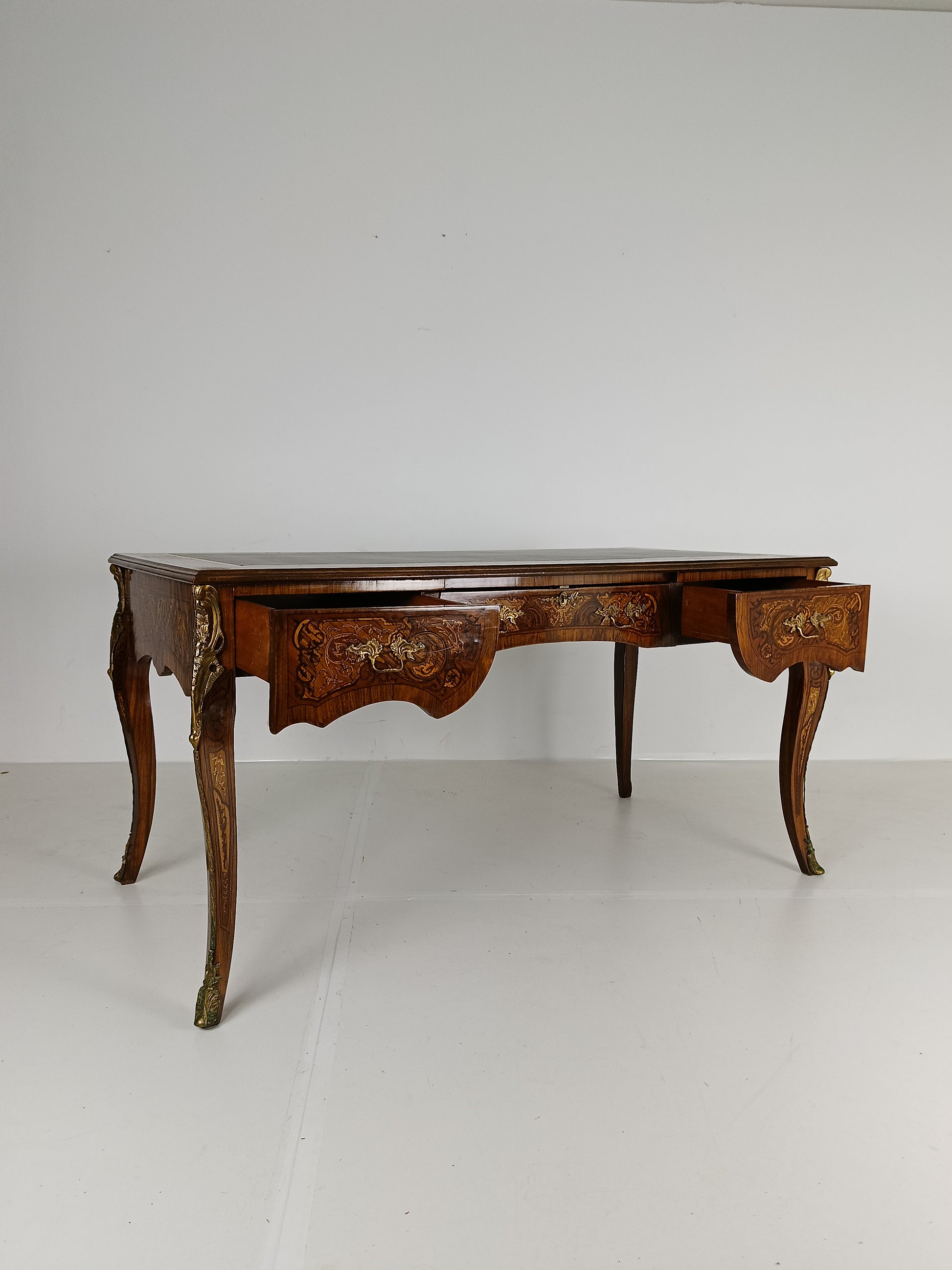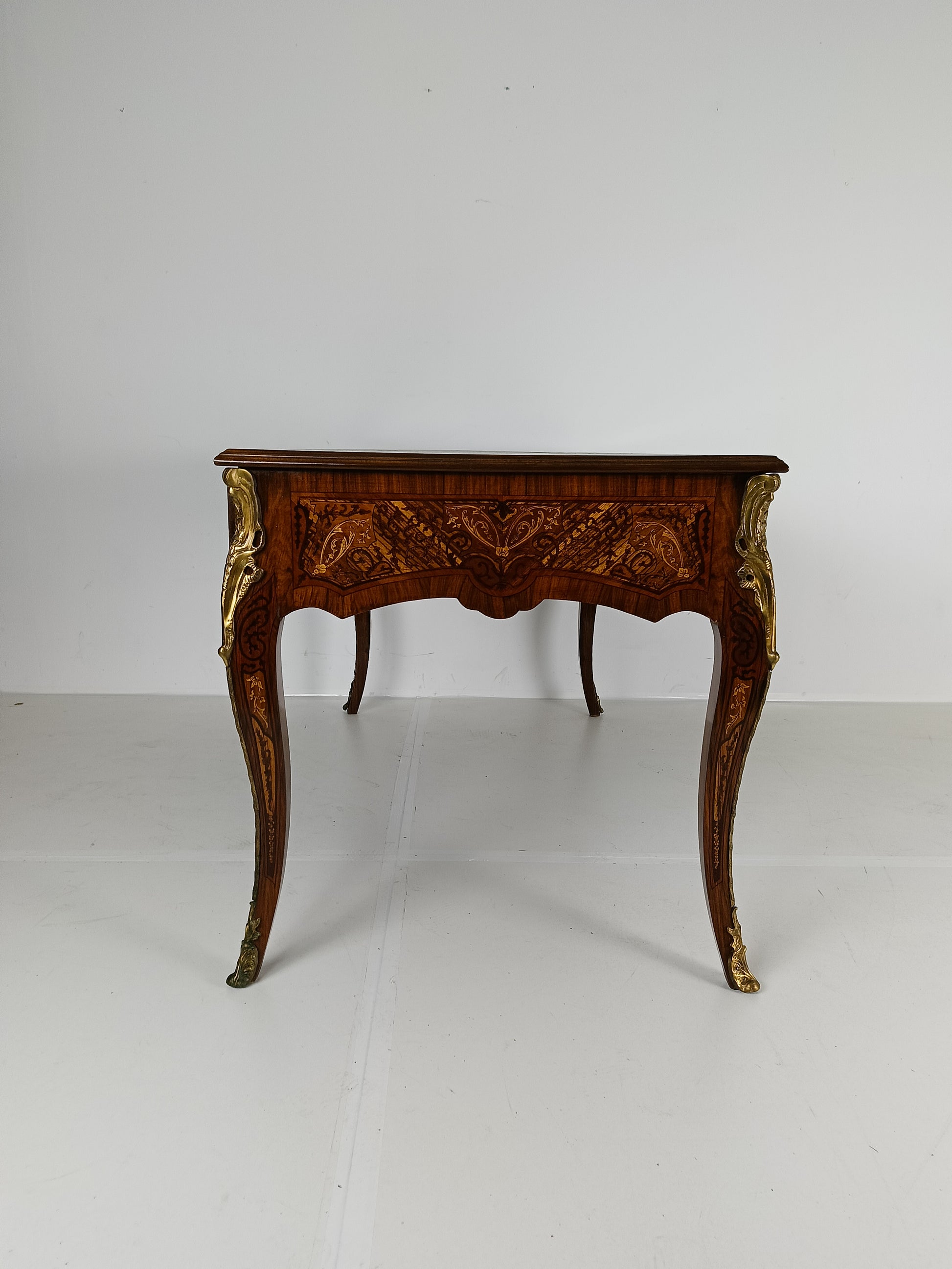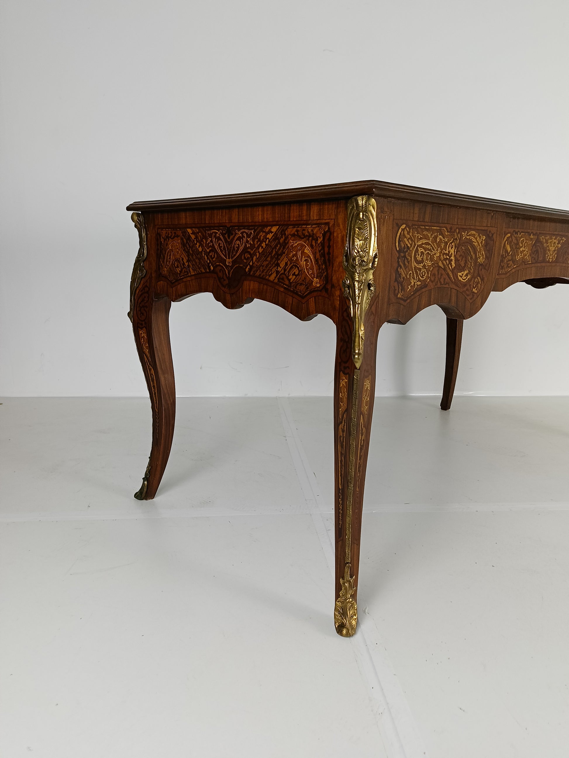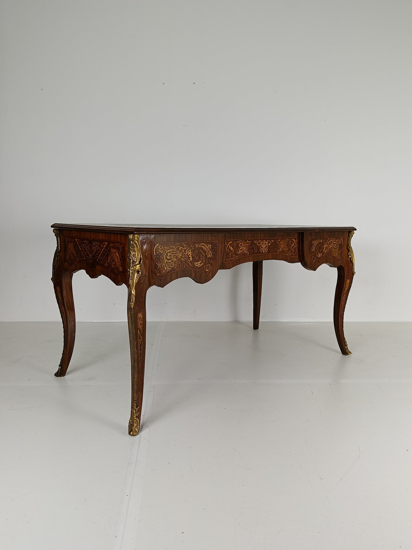 Double flat desk in mahogany and amaranth veneer from the Louis XV period. style Featuring two scalloped boxes in a belt accommodating three drawers on the front. The moving crosspieces supported by arched feet. The lines of the furniture highlighted by bronzes with decorations of pearl row friezes, acanthus and double braces with leafy fleurons. Rococo pull handles, openwork exploded pomegranate falls and claw sabots in gilded bronzes. Top covered with leather with decorations of small gilded irons. Louis XV style period