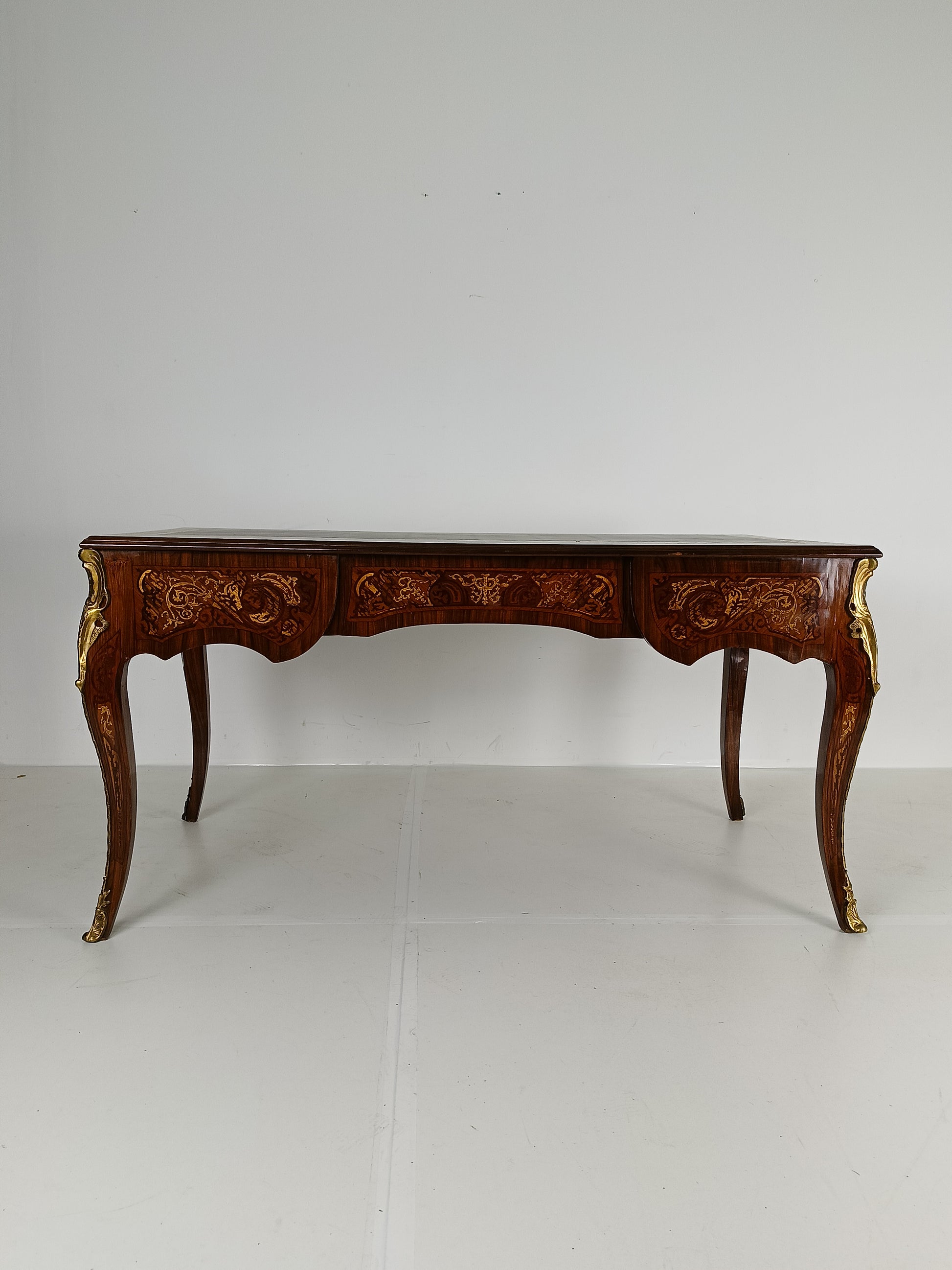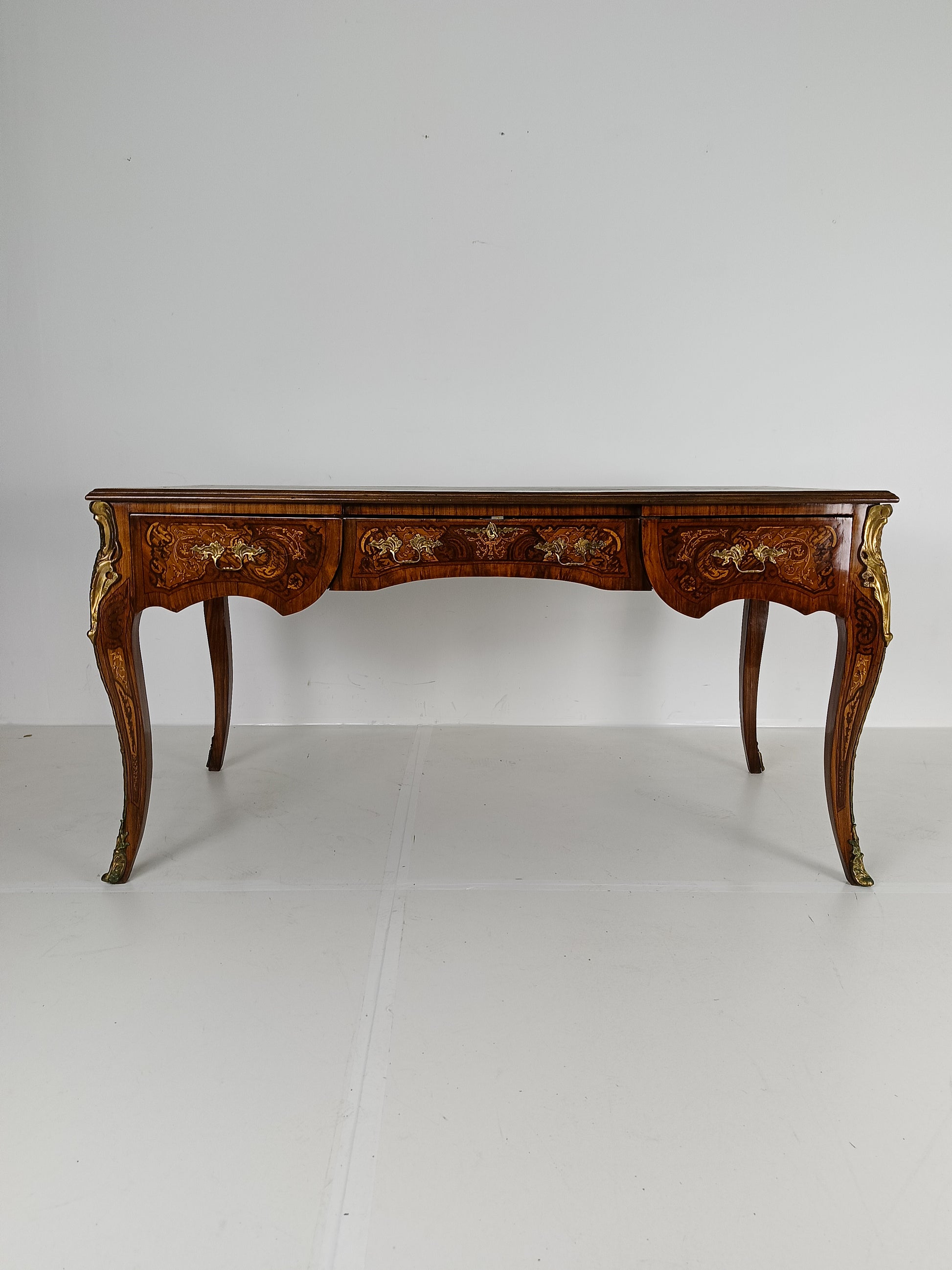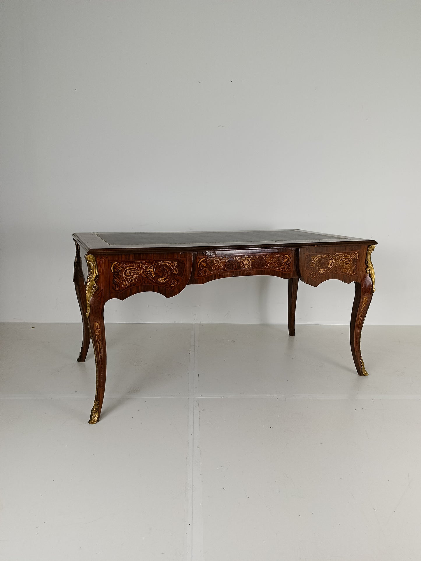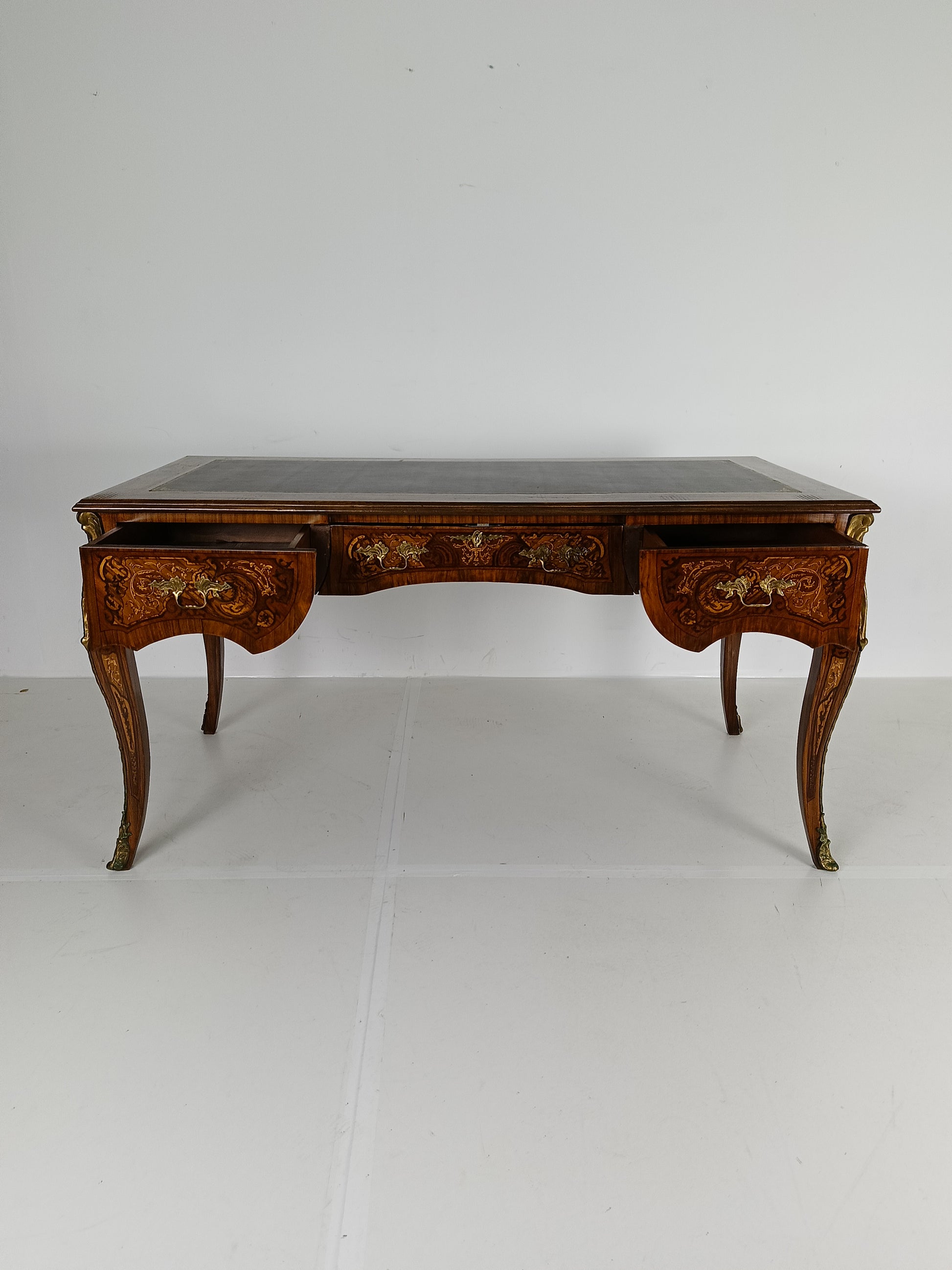 Double flat desk in mahogany and amaranth veneer from the Louis XV period. style Featuring two scalloped boxes in a belt accommodating three drawers on the front. The moving crosspieces supported by arched feet. The lines of the furniture highlighted by bronzes with decorations of pearl row friezes, acanthus and double braces with leafy fleurons. Rococo pull handles, openwork exploded pomegranate falls and claw sabots in gilded bronzes. Top covered with leather with decorations of small gilded irons. Louis XV style period