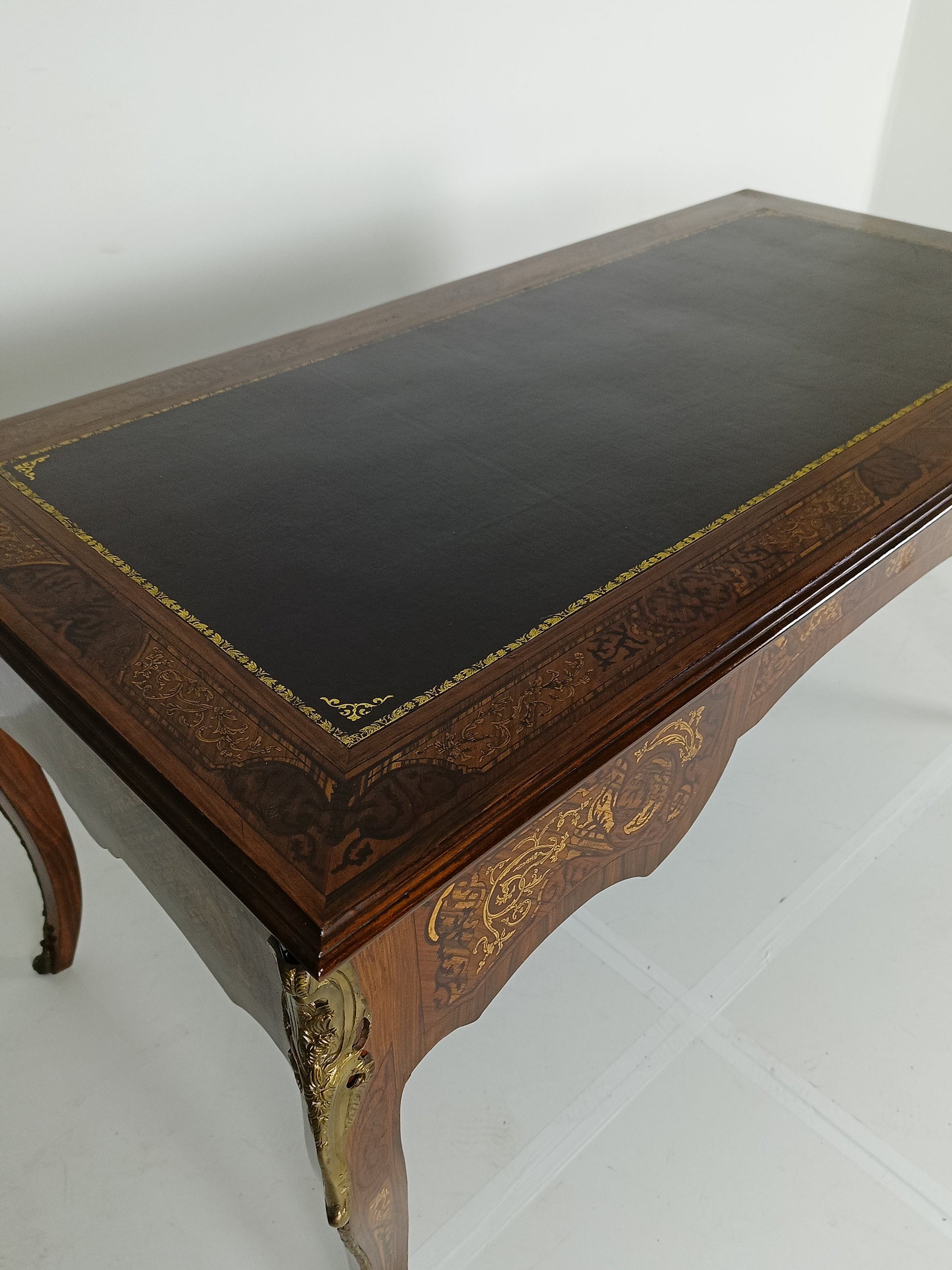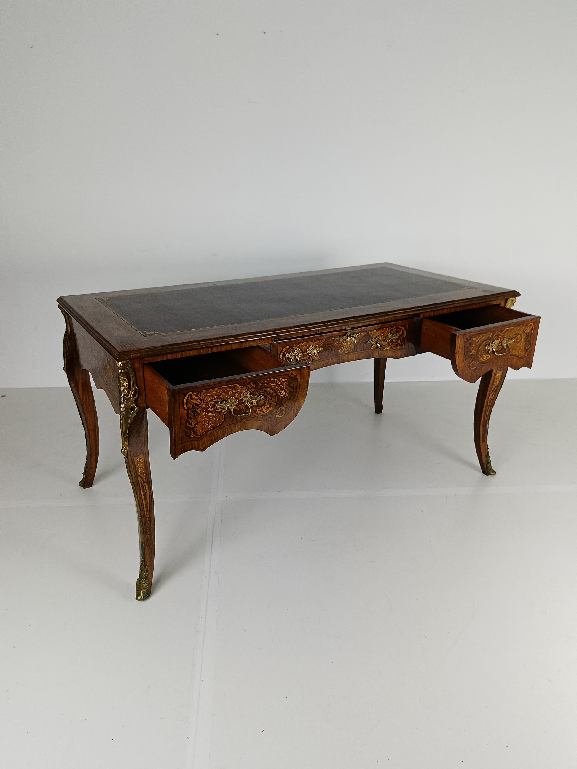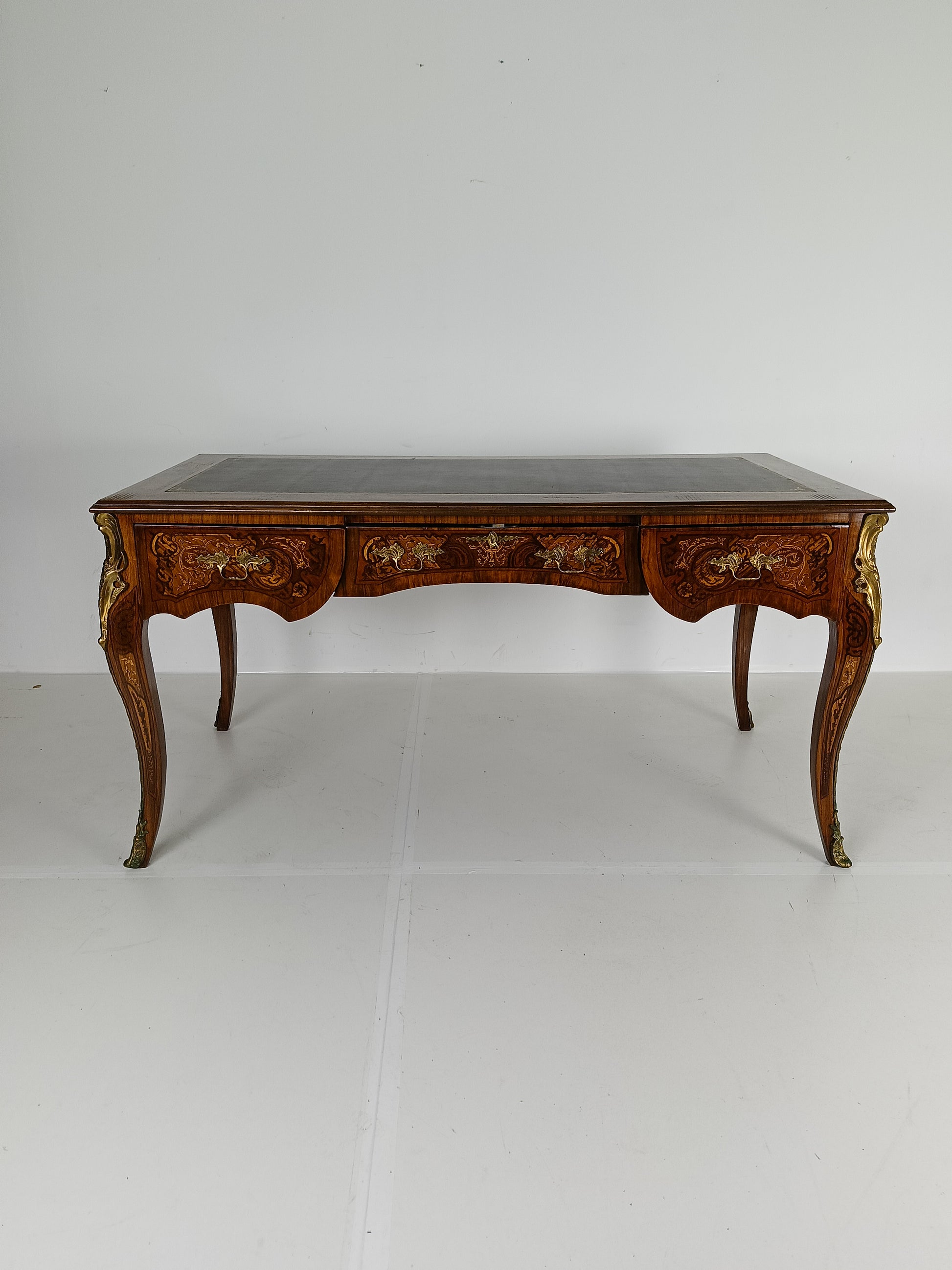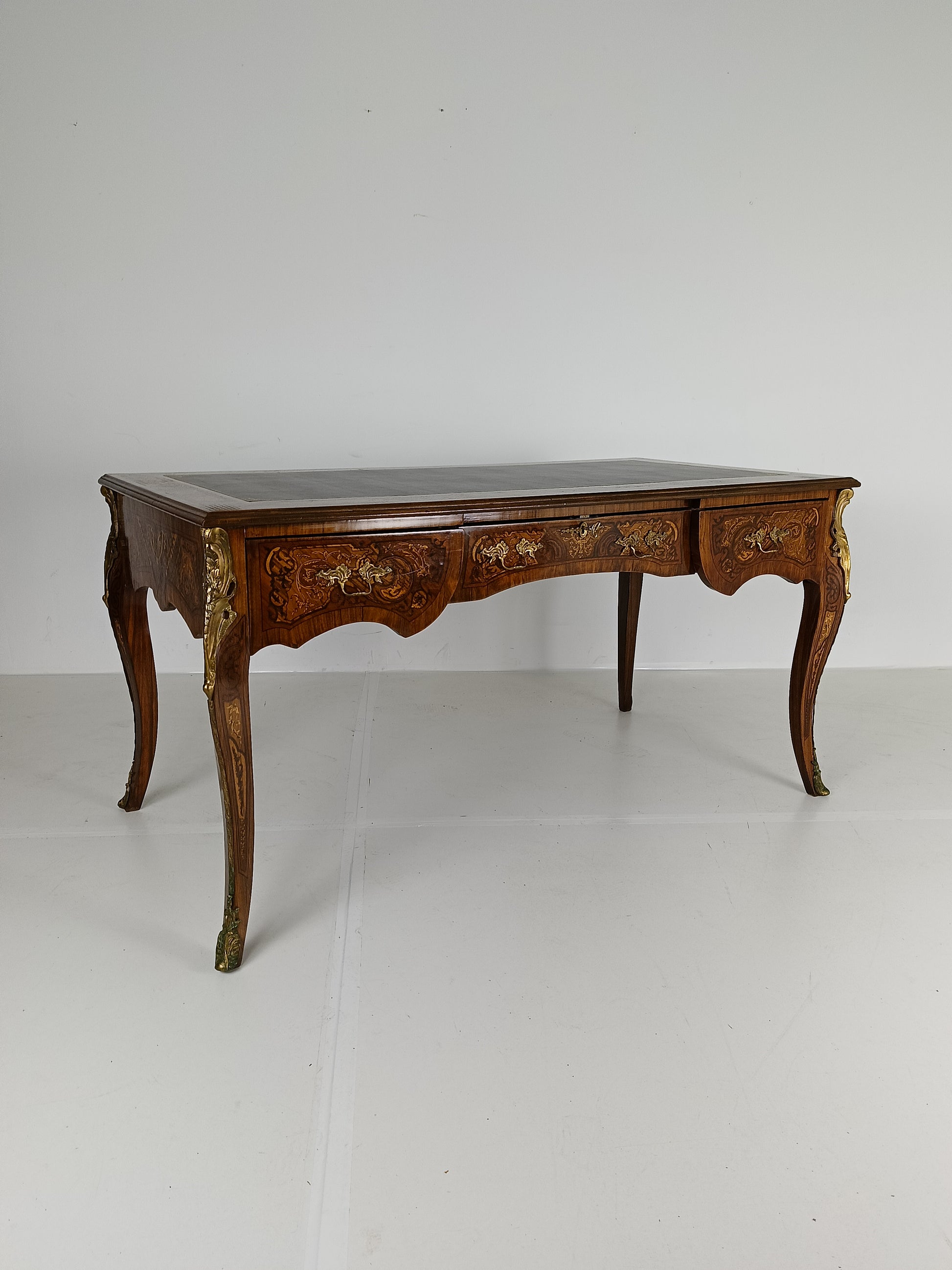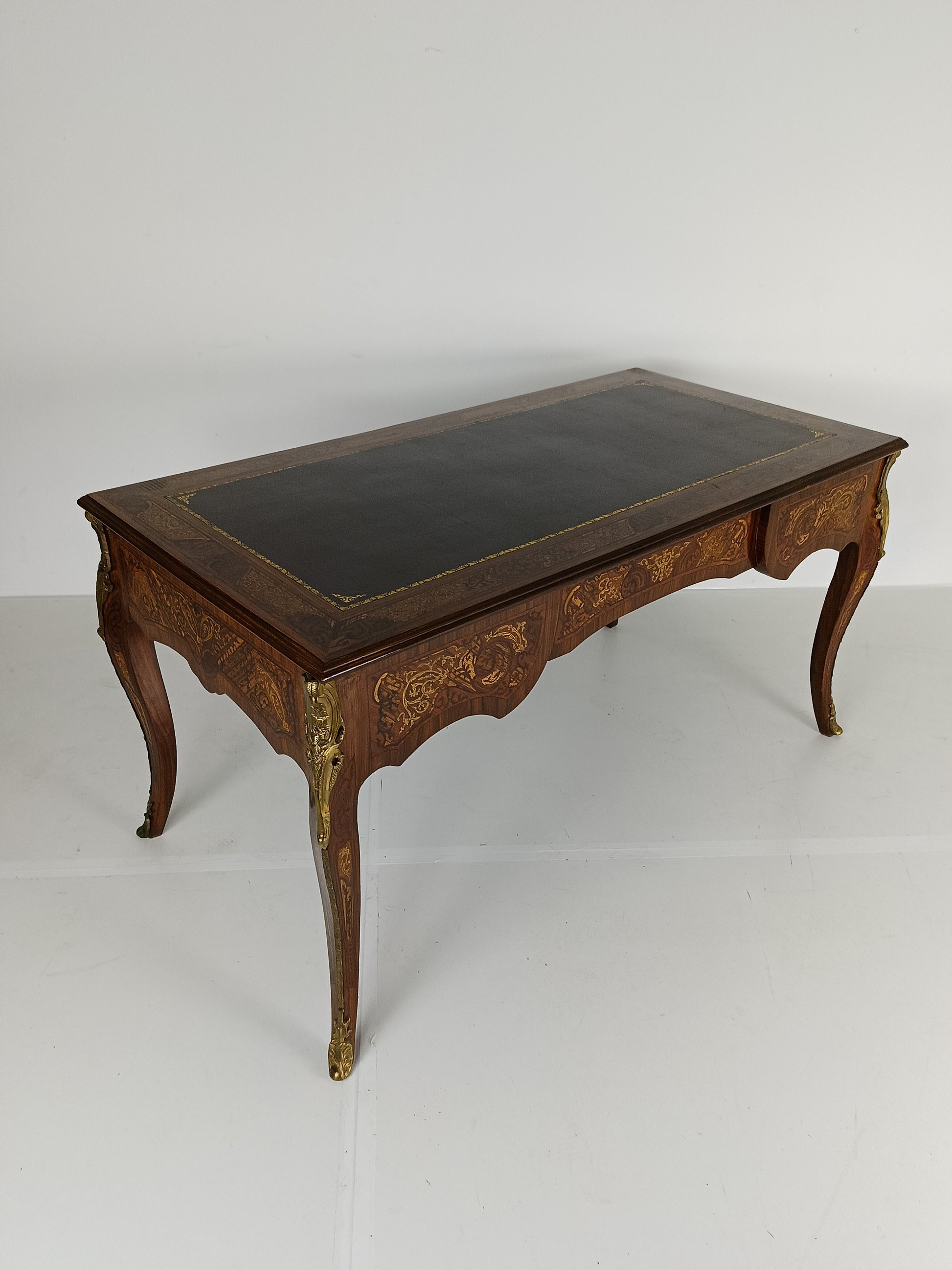 Double flat desk in mahogany and amaranth veneer from the Louis XV period. style Featuring two scalloped boxes in a belt accommodating three drawers on the front. The moving crosspieces supported by arched feet. The lines of the furniture highlighted by bronzes with decorations of pearl row friezes, acanthus and double braces with leafy fleurons. Rococo pull handles, openwork exploded pomegranate falls and claw sabots in gilded bronzes. Top covered with leather with decorations of small gilded irons. Louis XV style period