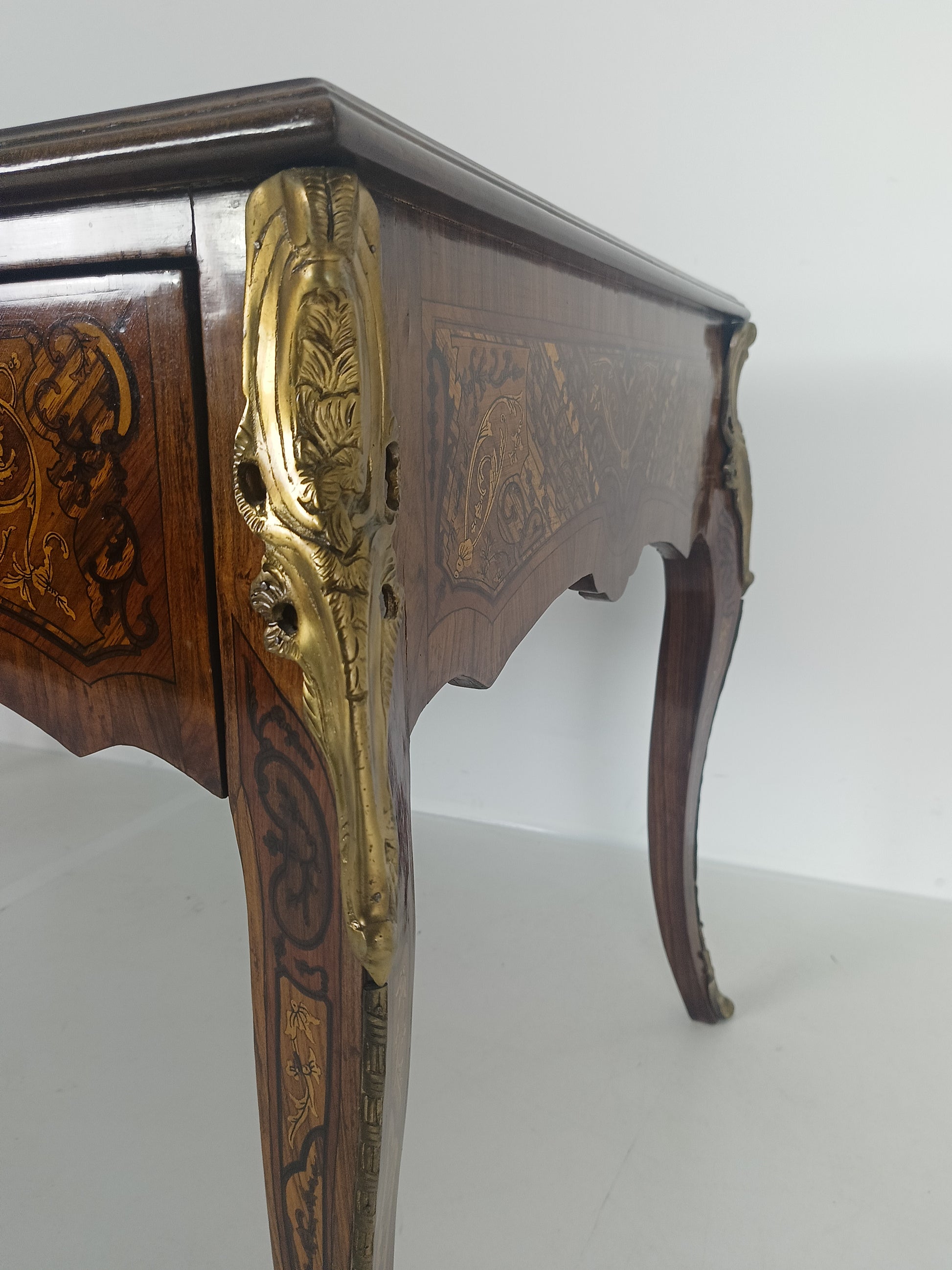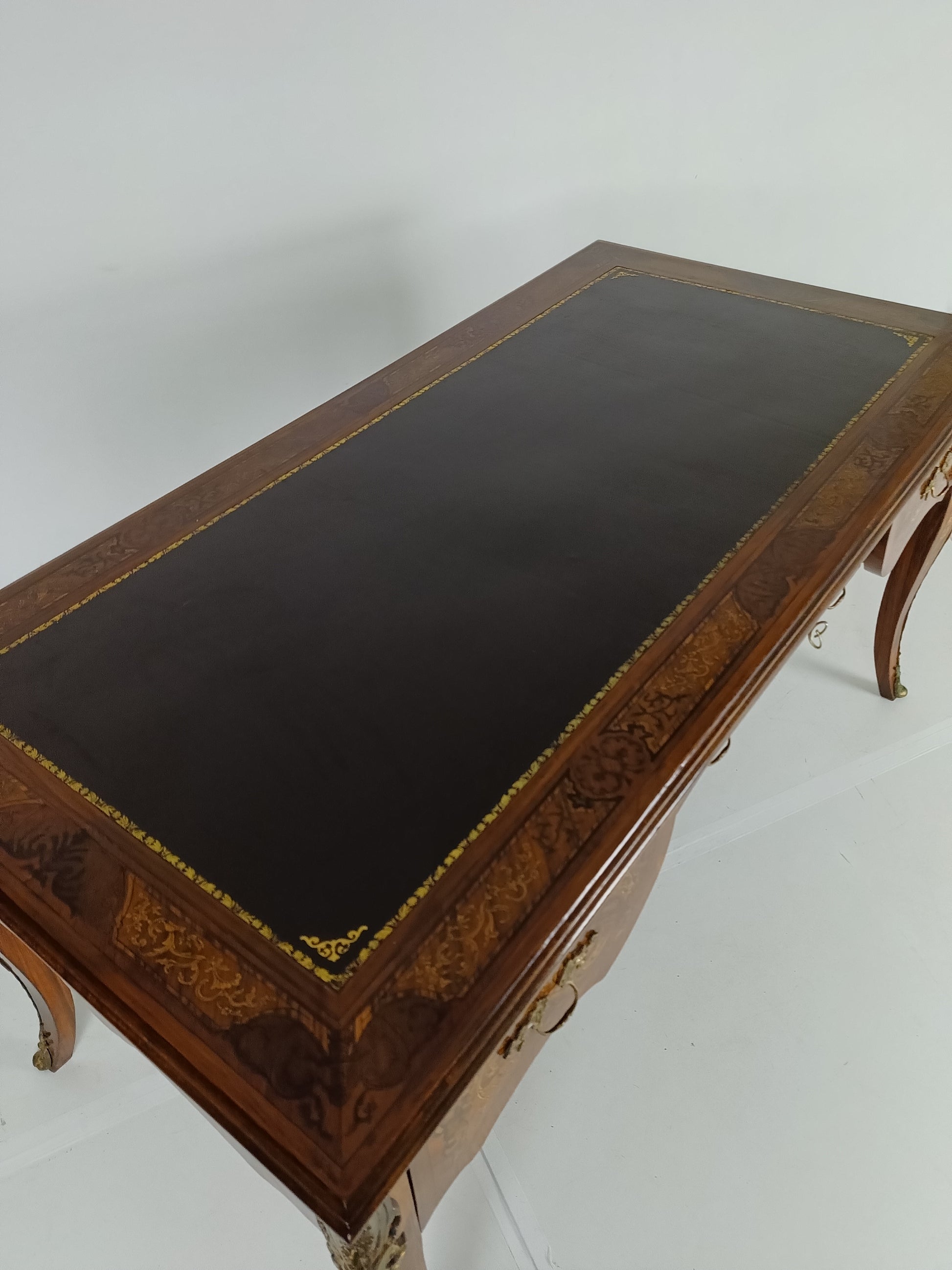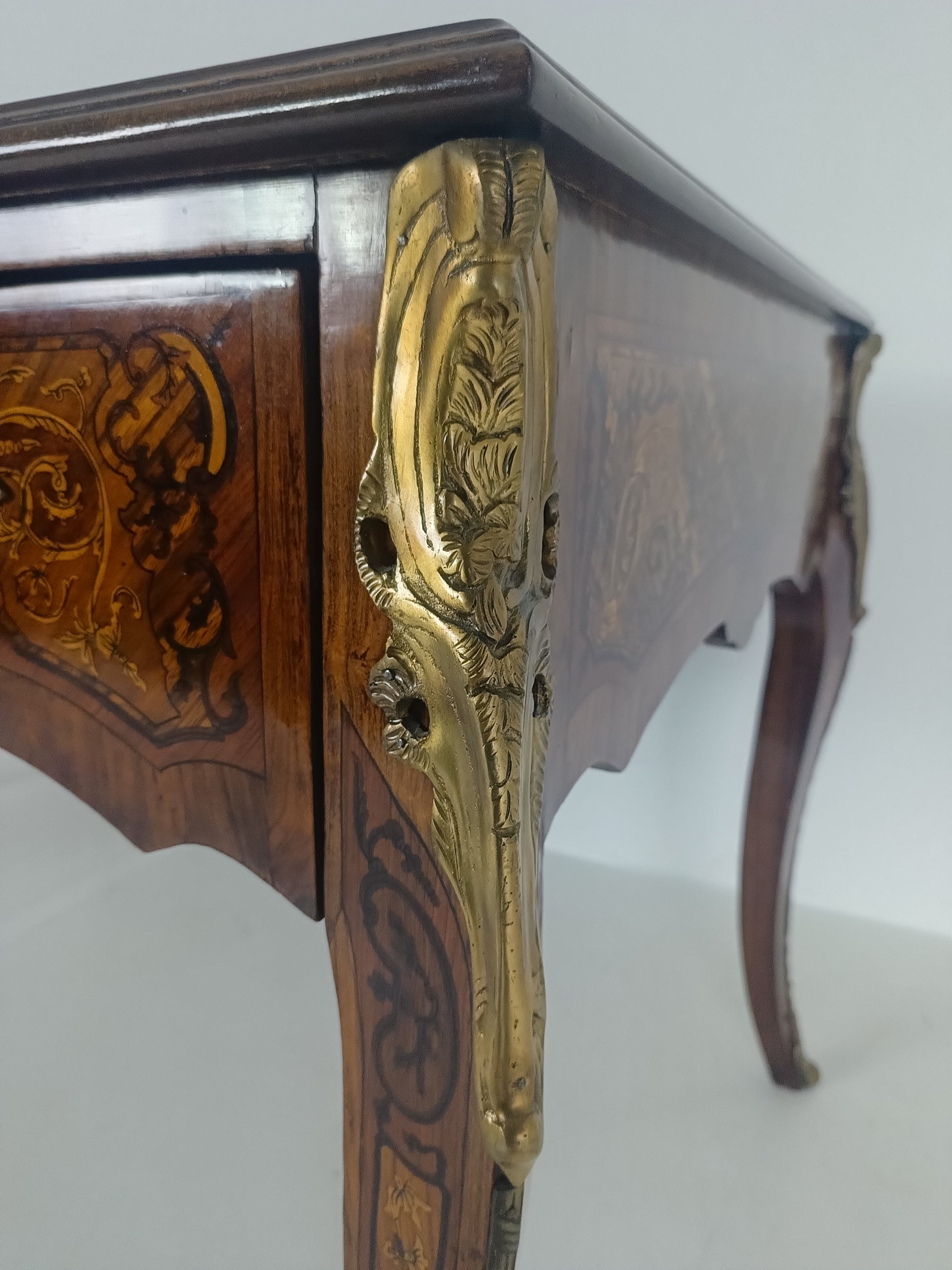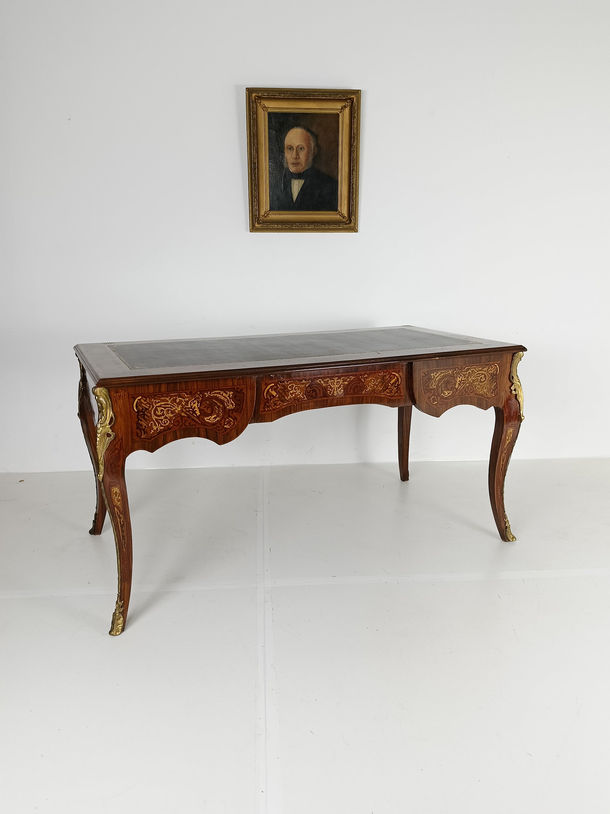 Double flat desk in mahogany and amaranth veneer from the Louis XV period. style Featuring two scalloped boxes in a belt accommodating three drawers on the front. The moving crosspieces supported by arched feet. The lines of the furniture highlighted by bronzes with decorations of pearl row friezes, acanthus and double braces with leafy fleurons. Rococo pull handles, openwork exploded pomegranate falls and claw sabots in gilded bronzes. Top covered with leather with decorations of small gilded irons. Louis XV style period