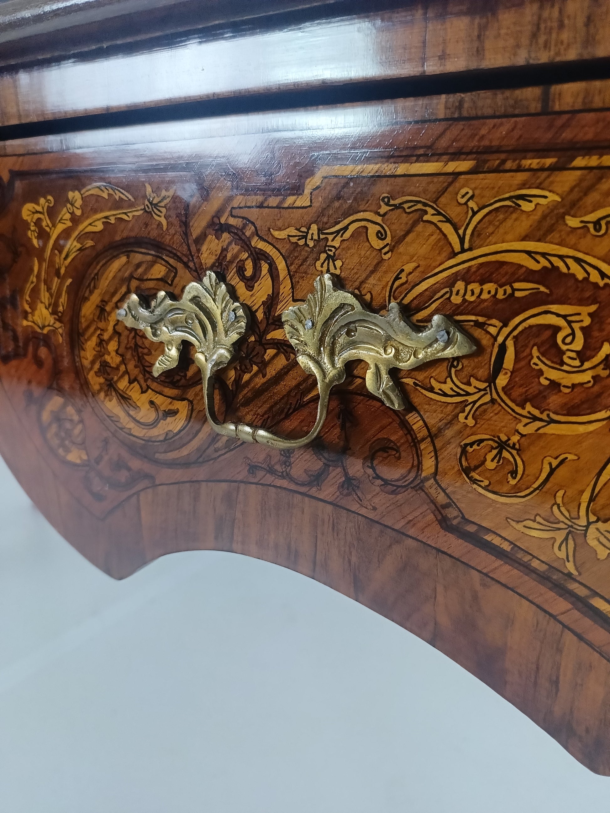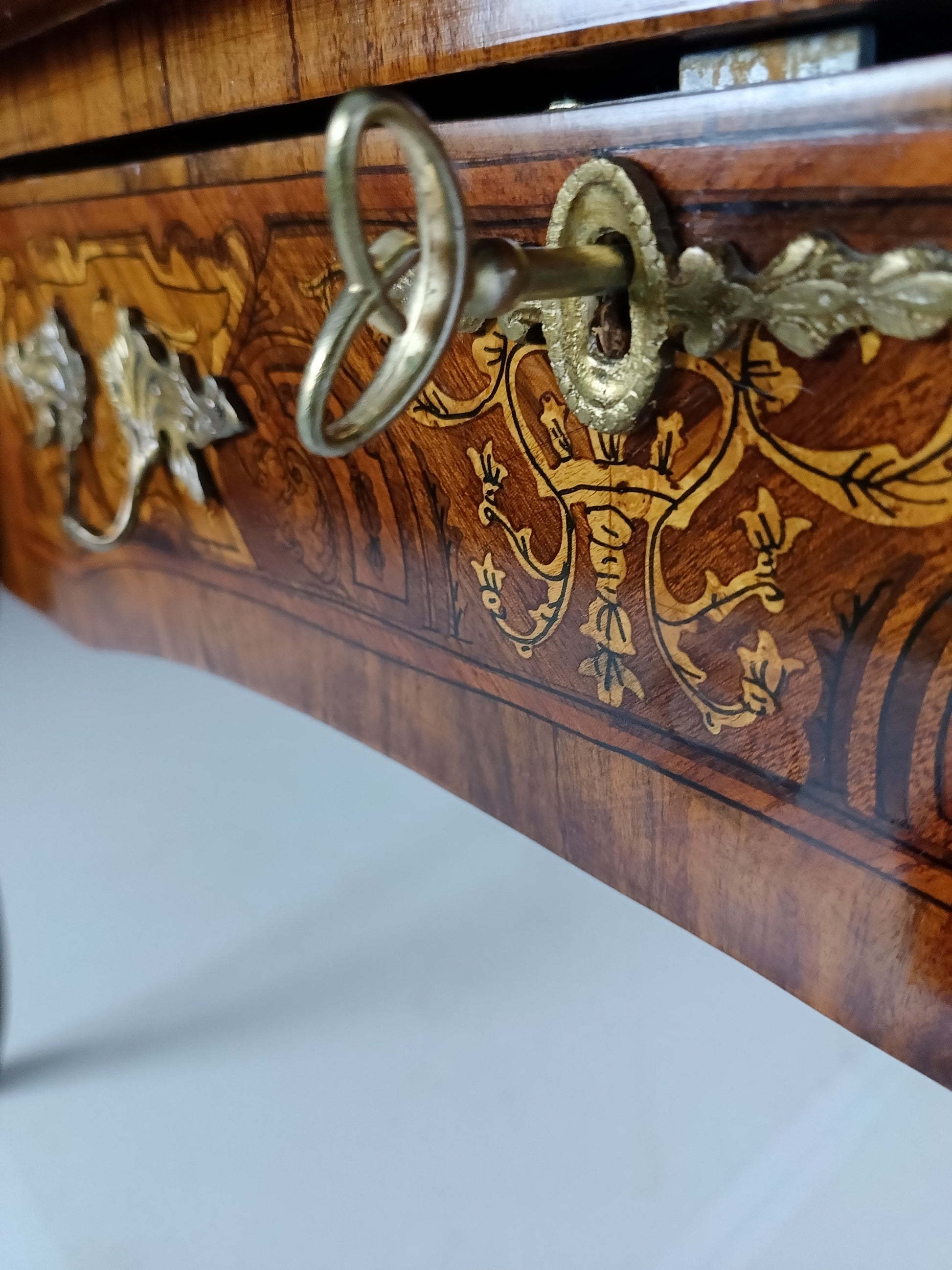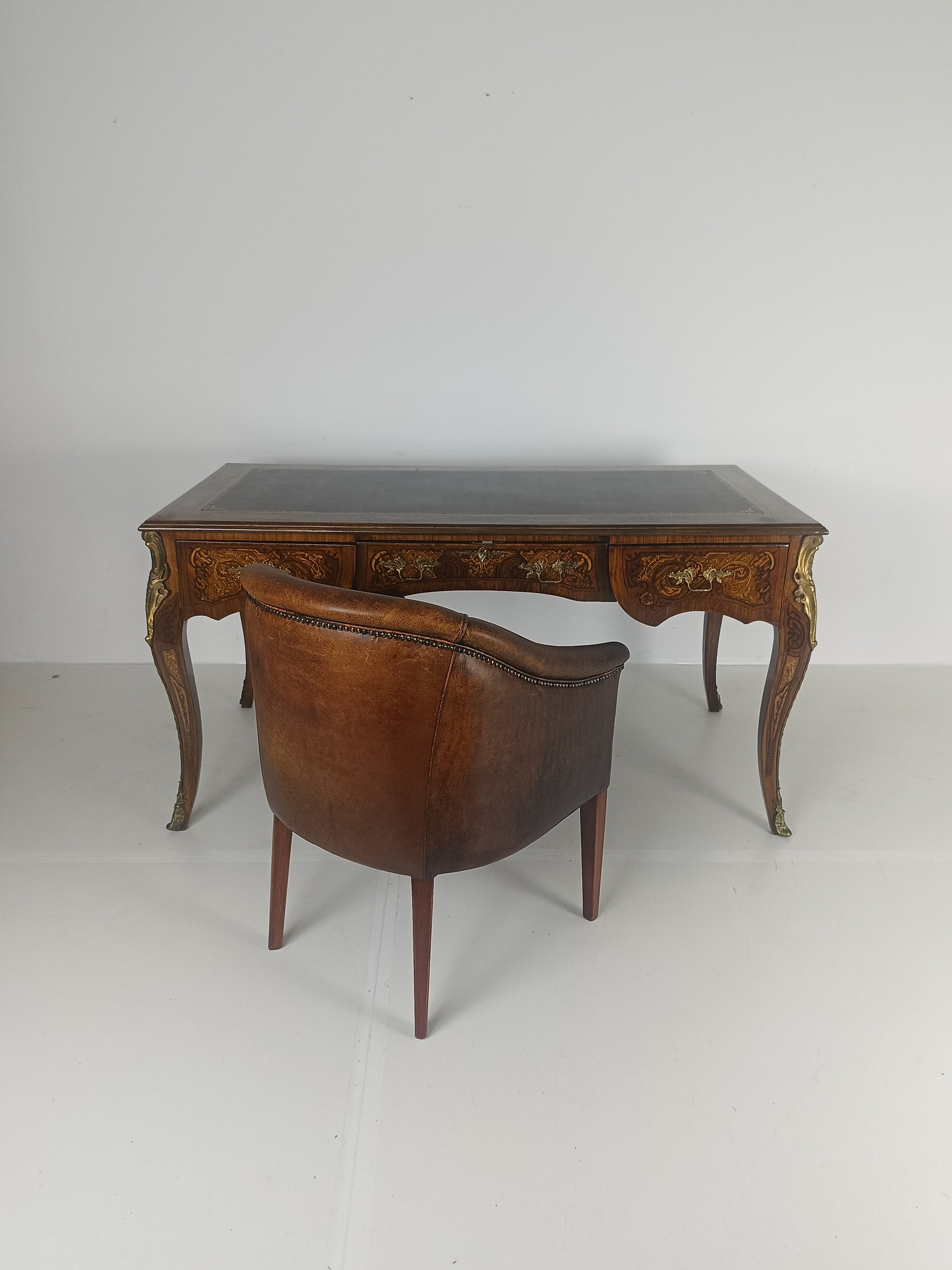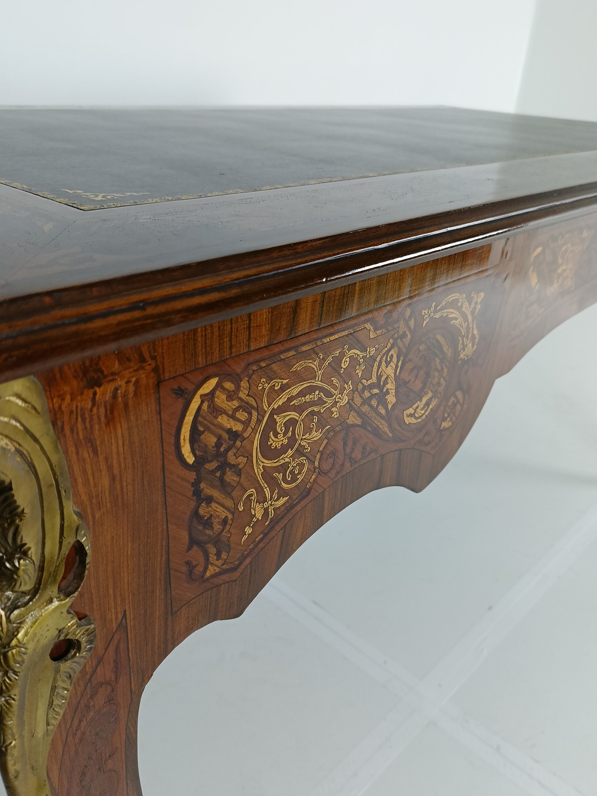 Double flat desk in mahogany and amaranth veneer from the Louis XV period. style Featuring two scalloped boxes in a belt accommodating three drawers on the front. The moving crosspieces supported by arched feet. The lines of the furniture highlighted by bronzes with decorations of pearl row friezes, acanthus and double braces with leafy fleurons. Rococo pull handles, openwork exploded pomegranate falls and claw sabots in gilded bronzes. Top covered with leather with decorations of small gilded irons. Louis XV style period