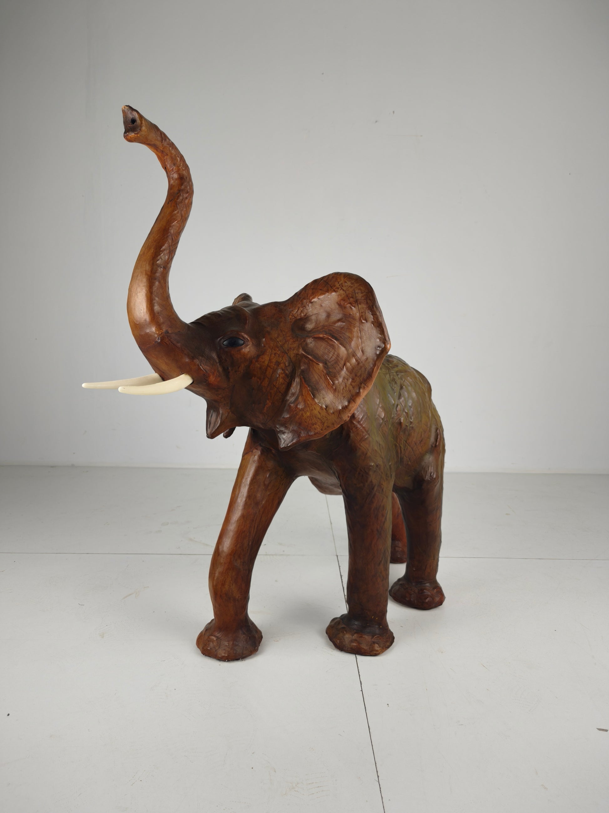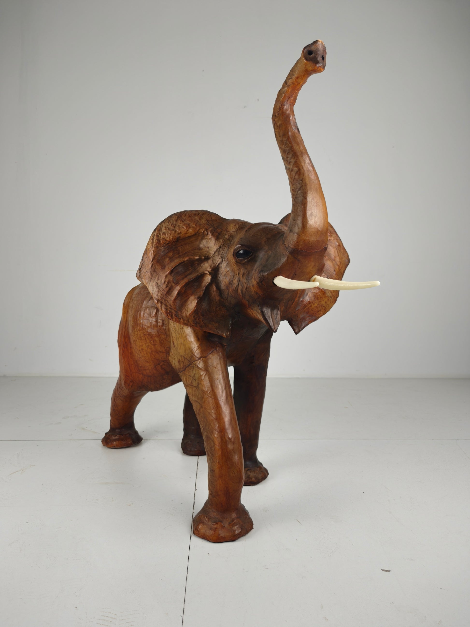 The elephant is made from brown leather and stands out for its impressive size (122 cm long) and exceptional condition. Light wear and natural patina to the leather only enhance its authentic vintage appeal.