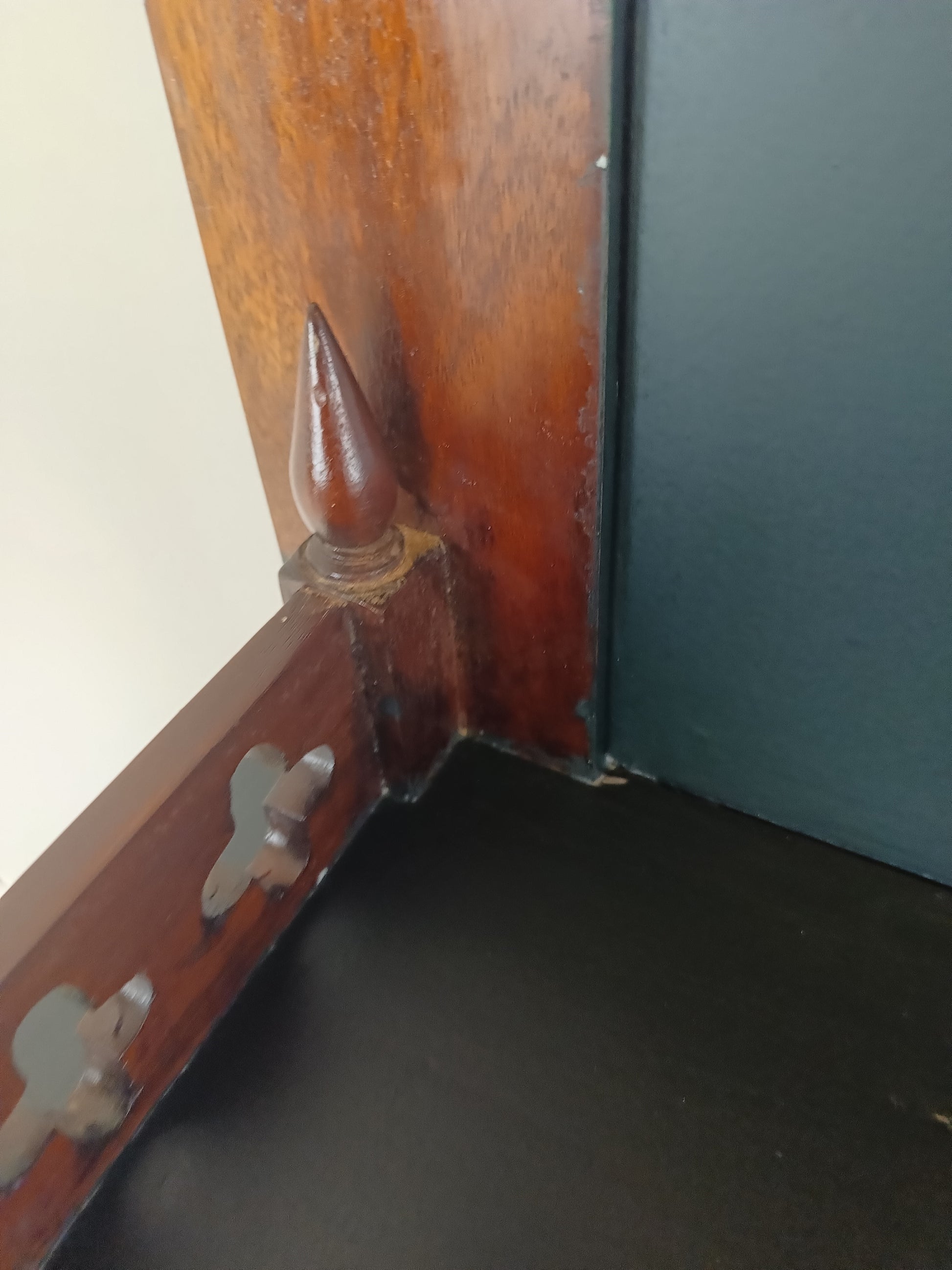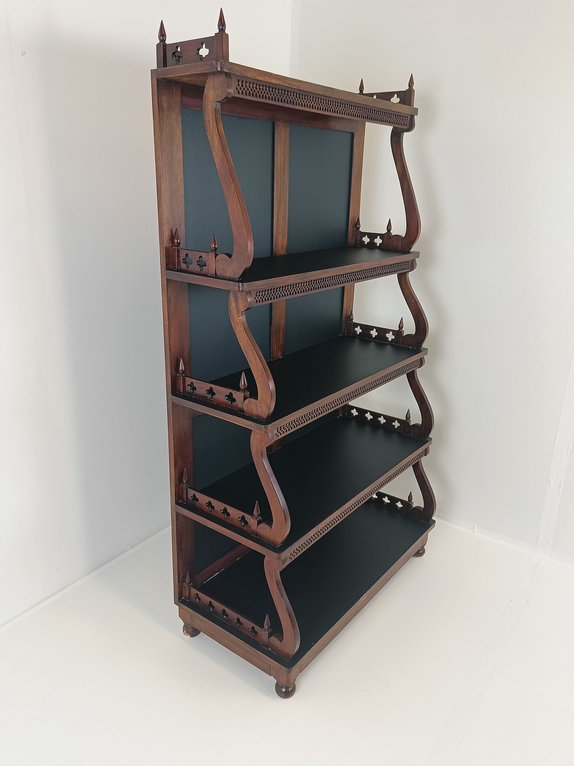 Beautiful mahogany bookcase, consists of five shelves, in different thicknesses. The shelves become wider from the top to the bottom. The smallest shelf is 19cm and the widest is 41cm. The carved details give the case an authentic look.