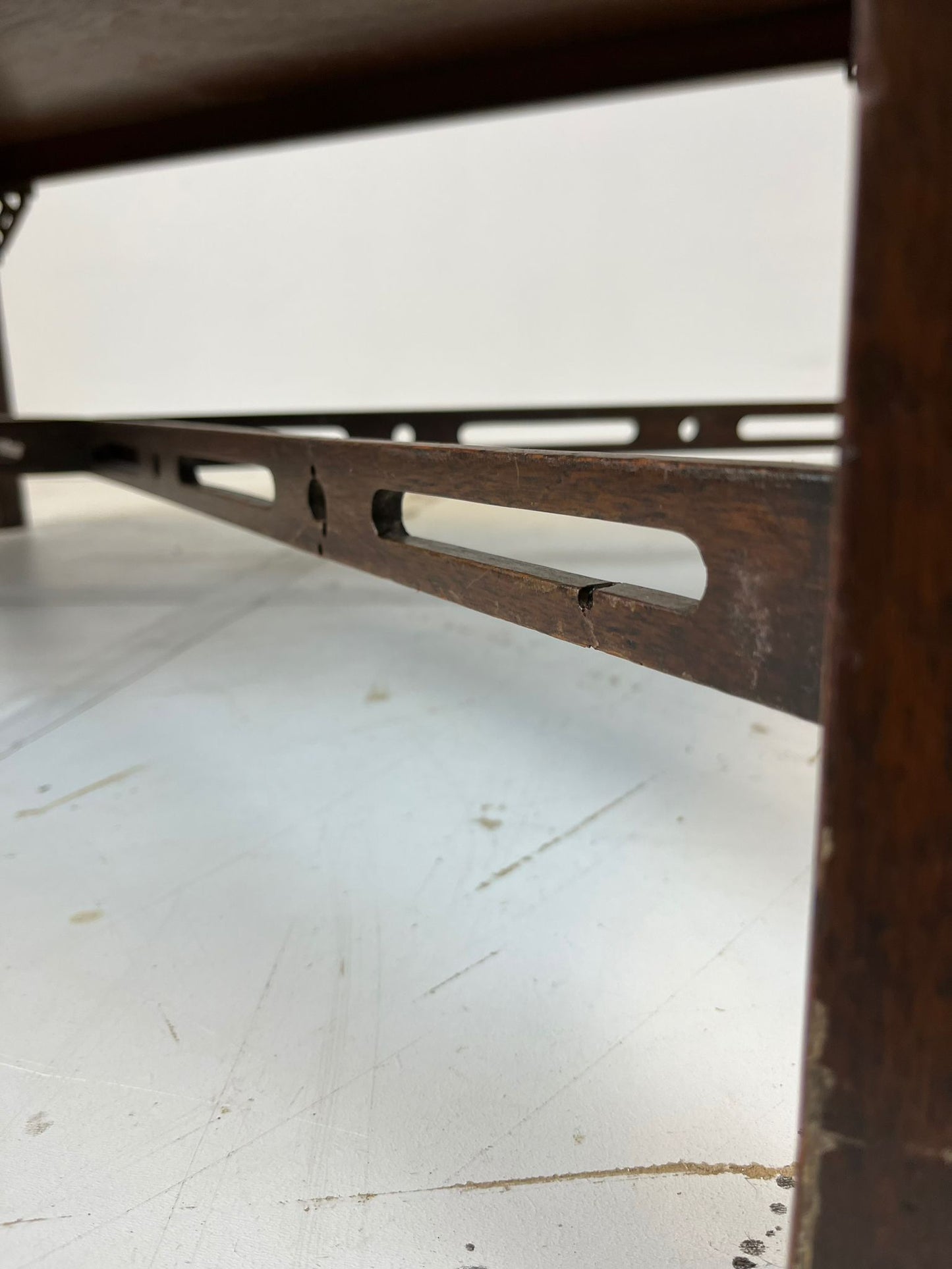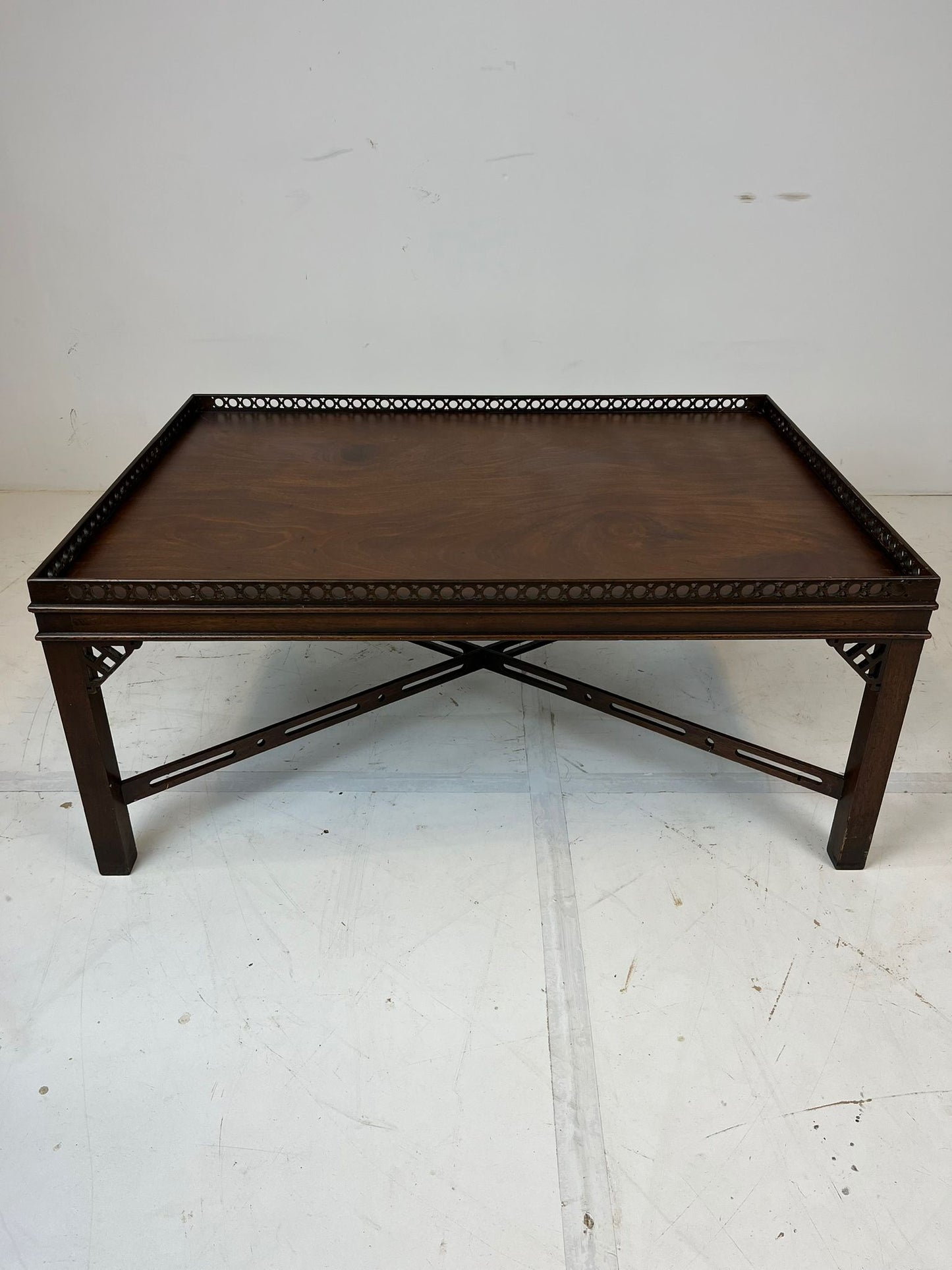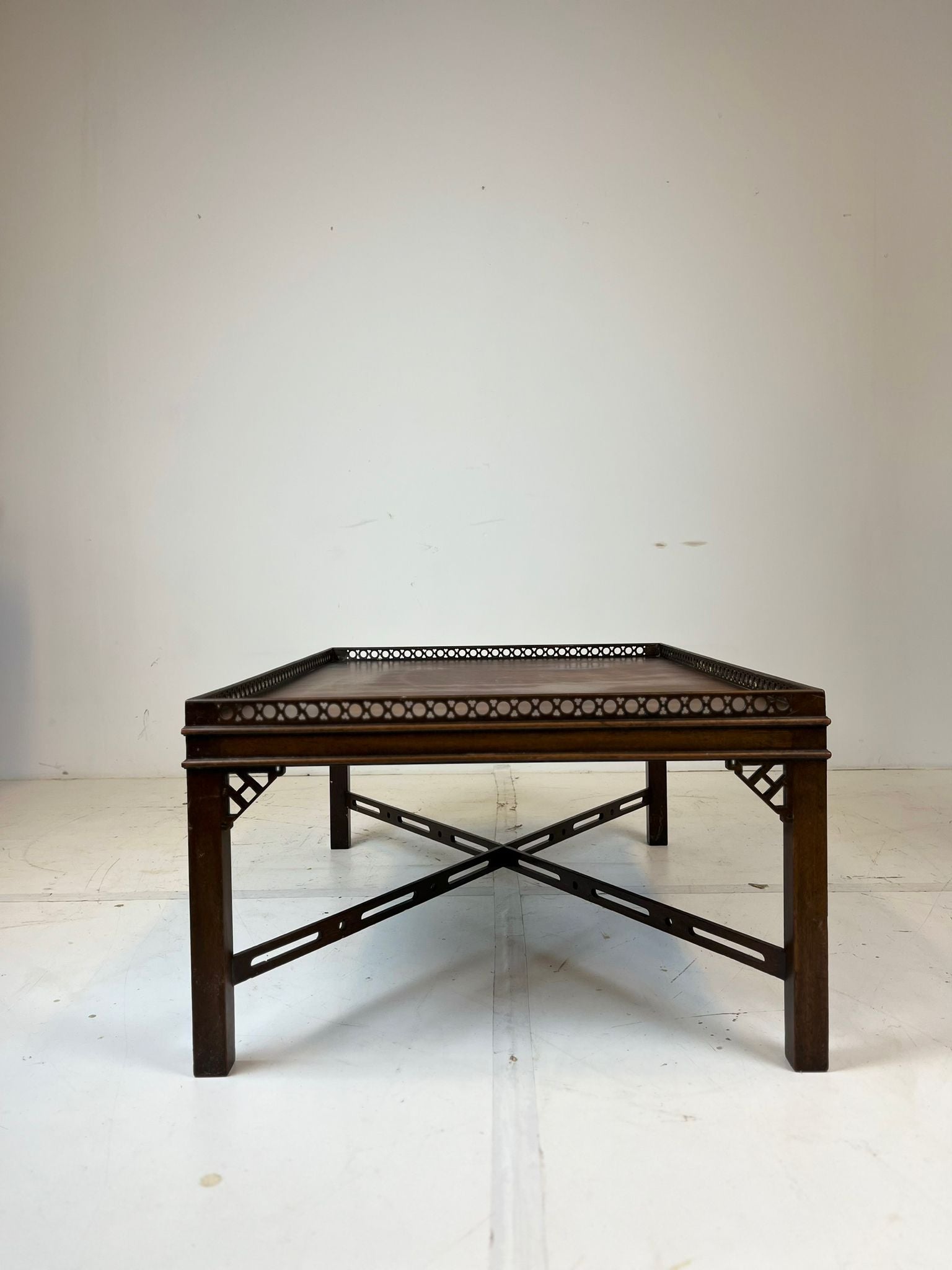 A large rectangular top low table with carved gailery rail supported by four square legs and braced by carved fretwork stretchers. Fretwork corner brackets on top leg joints. This table is in excellent condition and has just been polished. Circa 50's