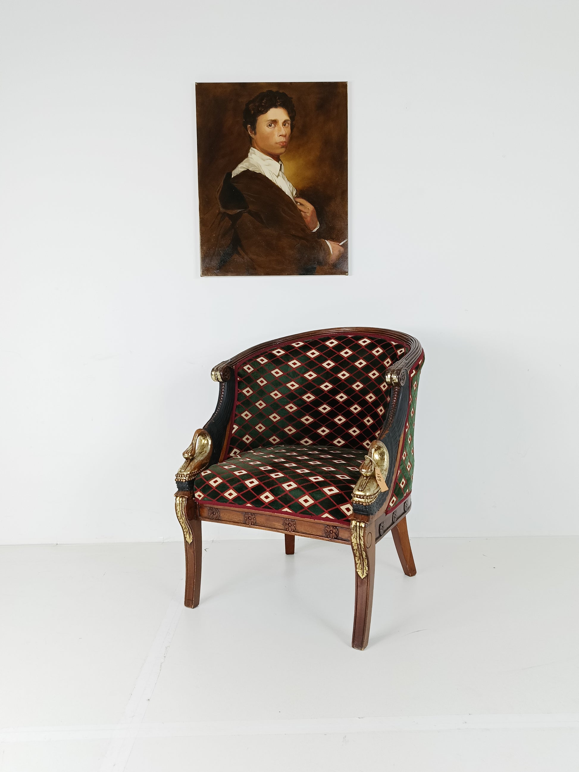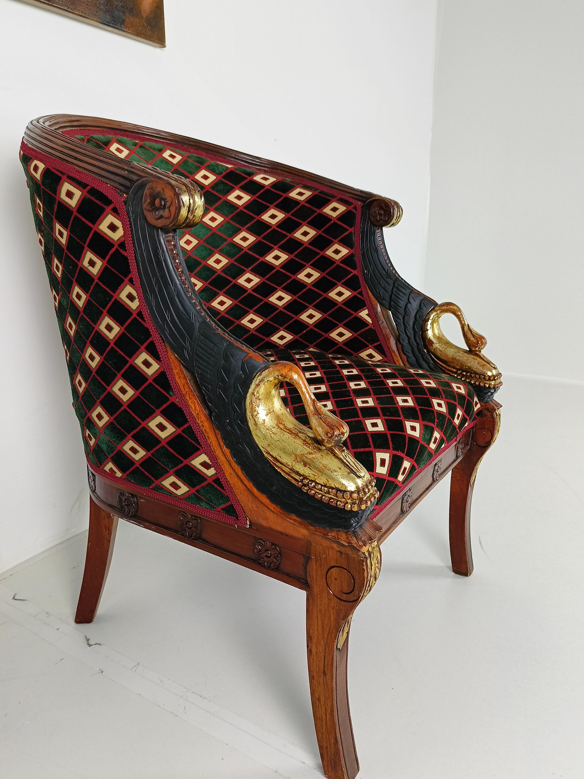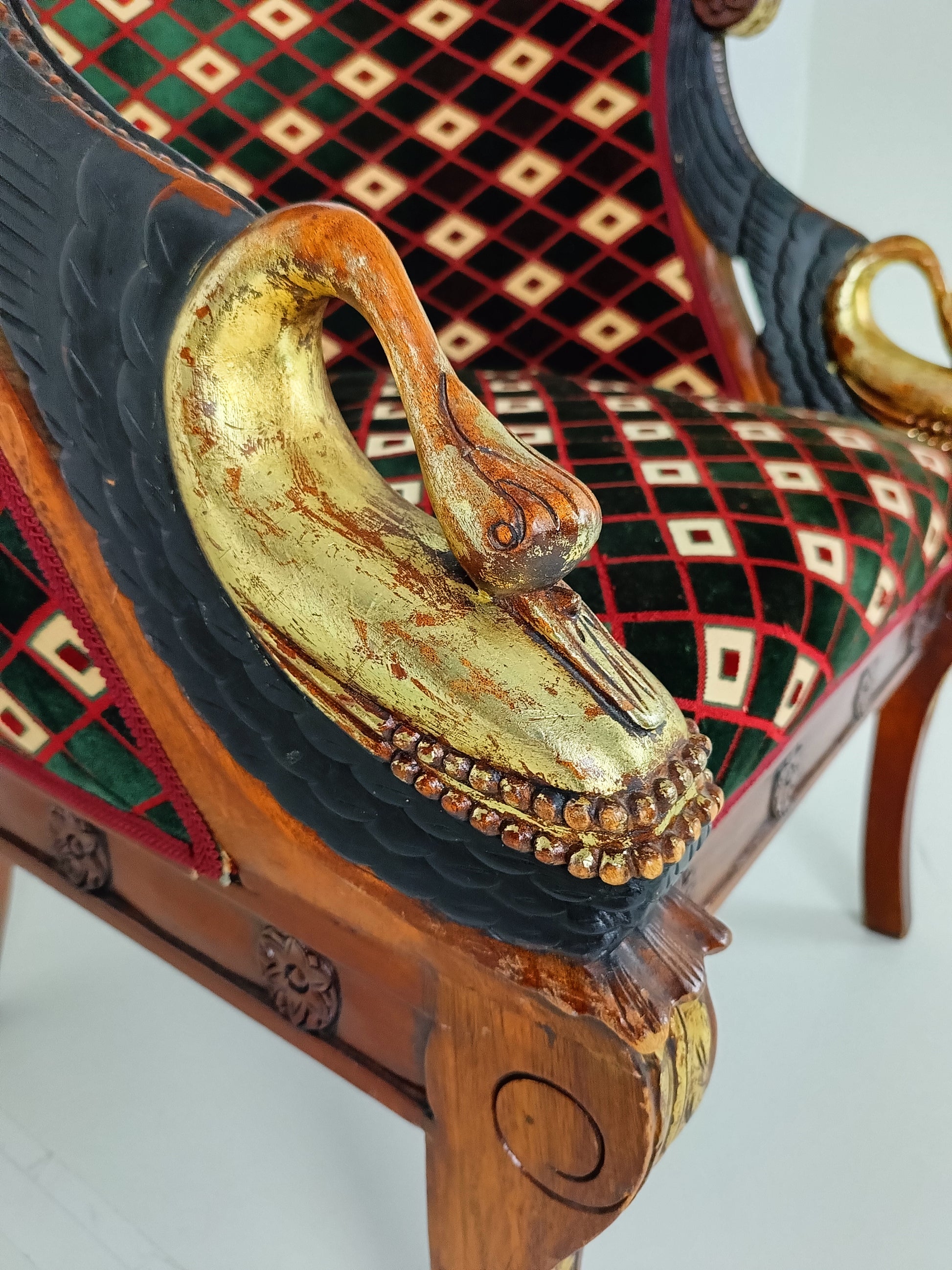 True classic swan chair. Embrace elegance with this antique chair, featuring exquisitely carved swan details that add a touch of timeless grace to any space. Has signs of wear consistant with age and patina.