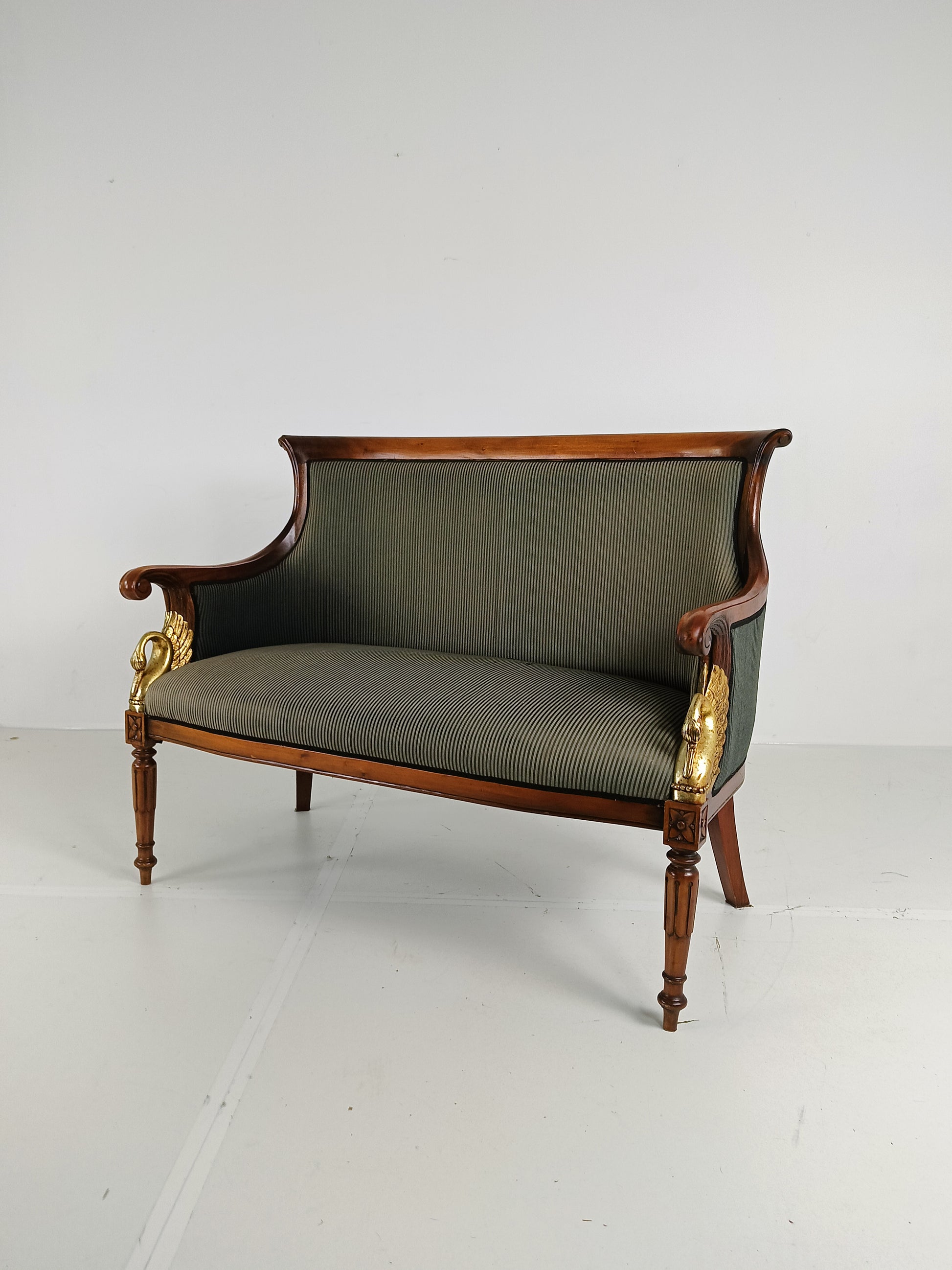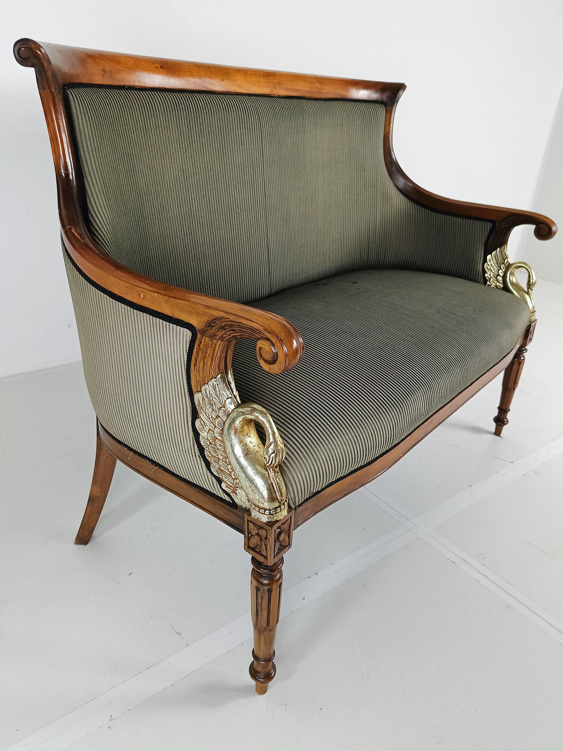 Antique neoclassical carved swan bench in gray finish. Each has a round reed comb rail that continues into carved arm connections of rosette, connecting upright carved swans nail head details. Made around circa 1940