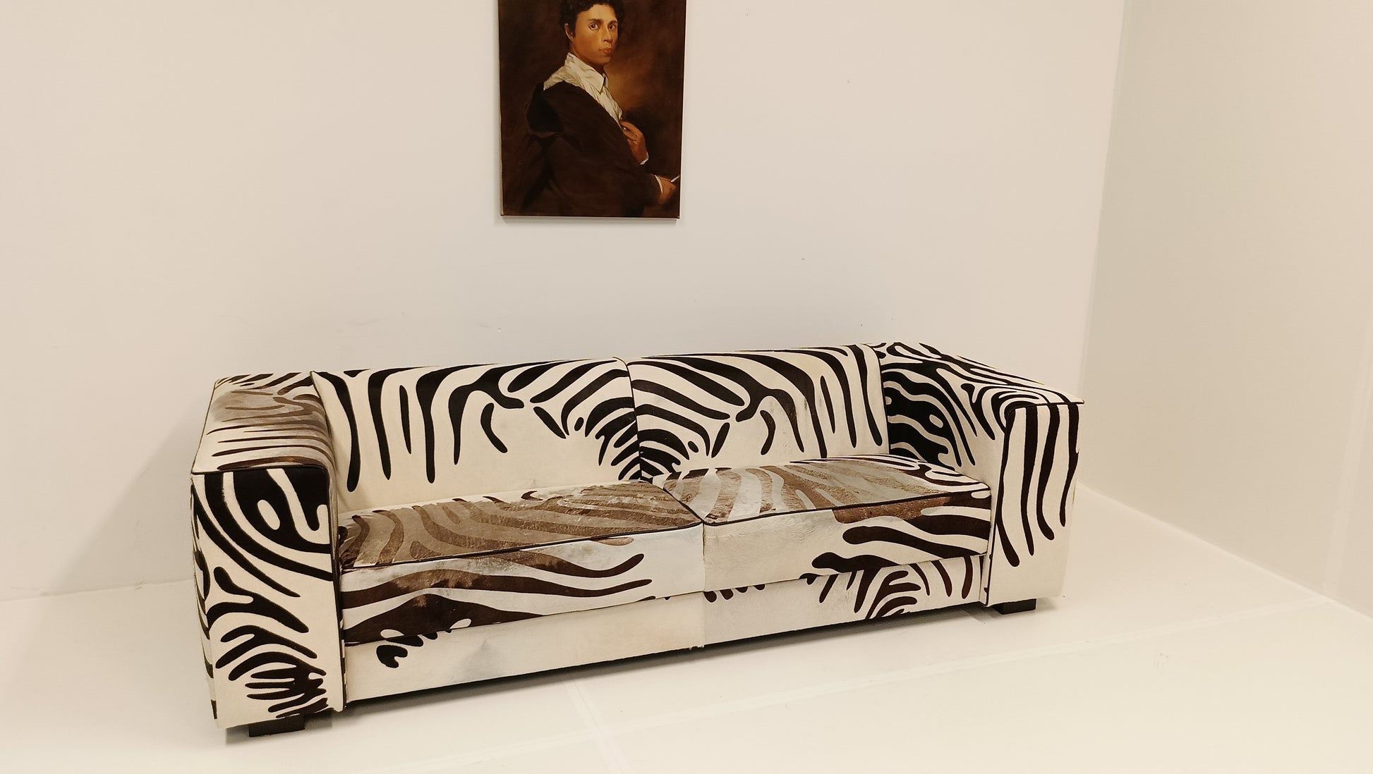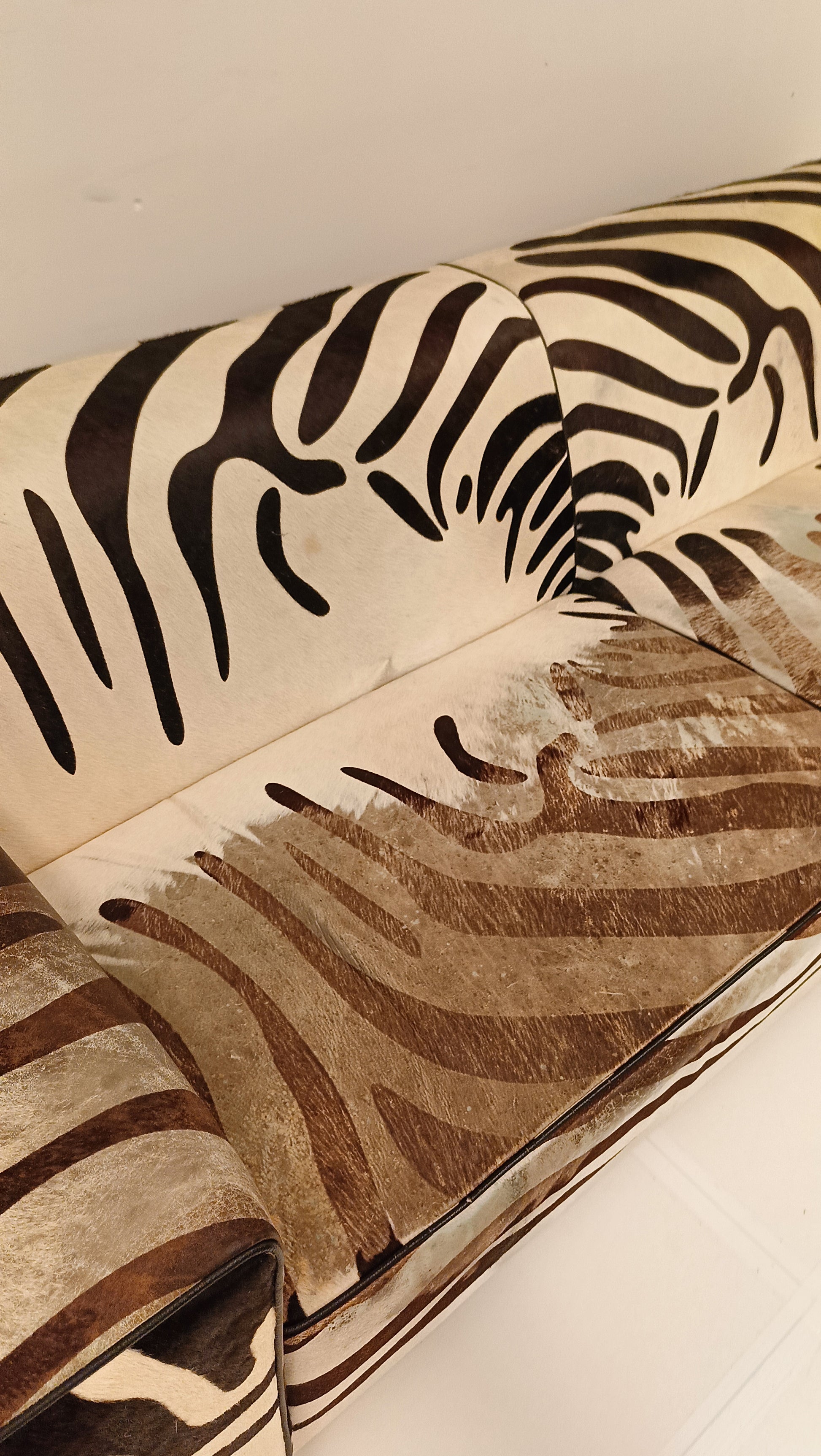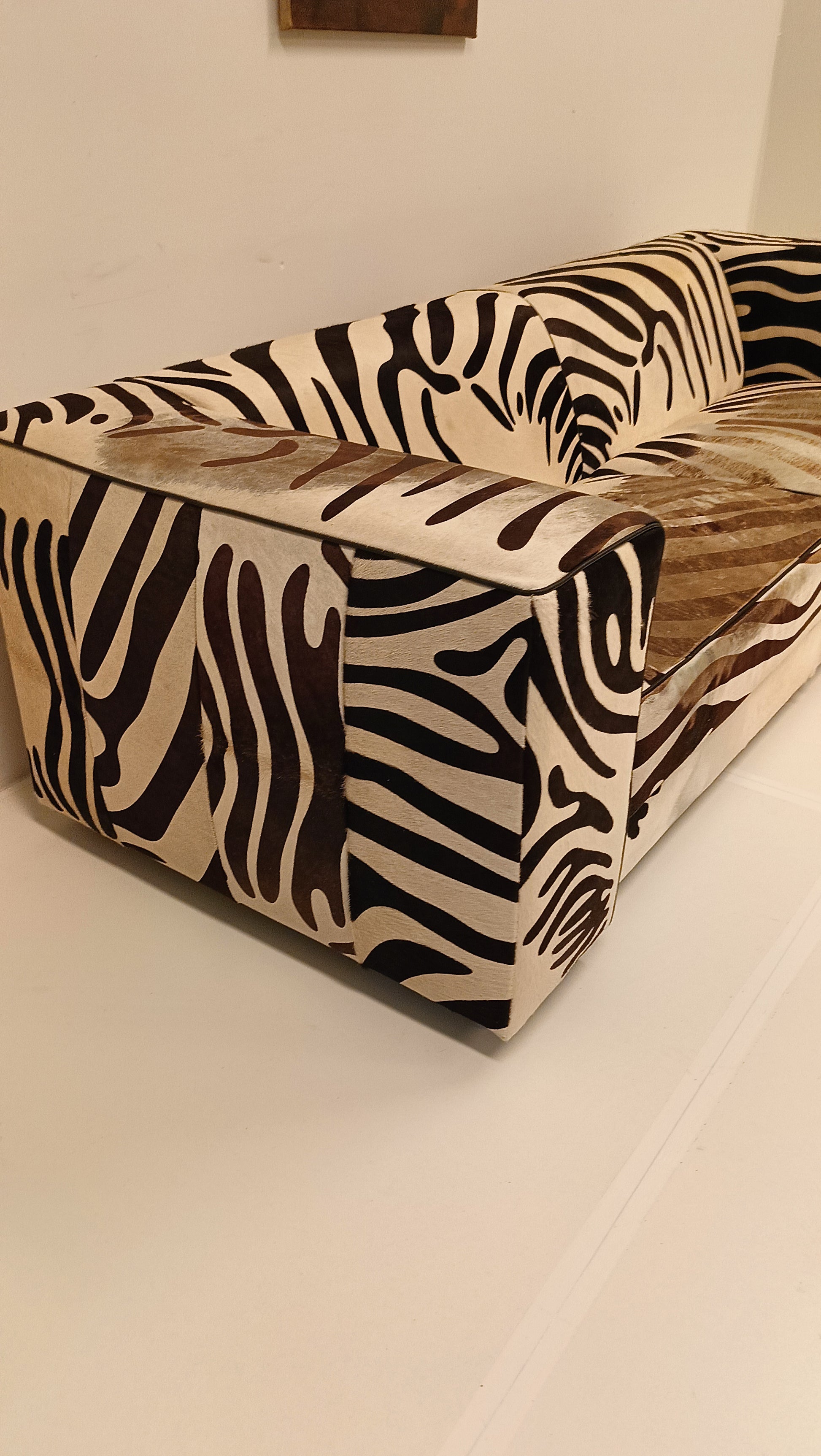 This zebra-style sofa, made from cowhide, combines striking design with natural materials. Its bold pattern adds a touch of exotic flair, while the high-quality cowhide ensures durability and comfort. Perfect for making a stylish statement in any living space.