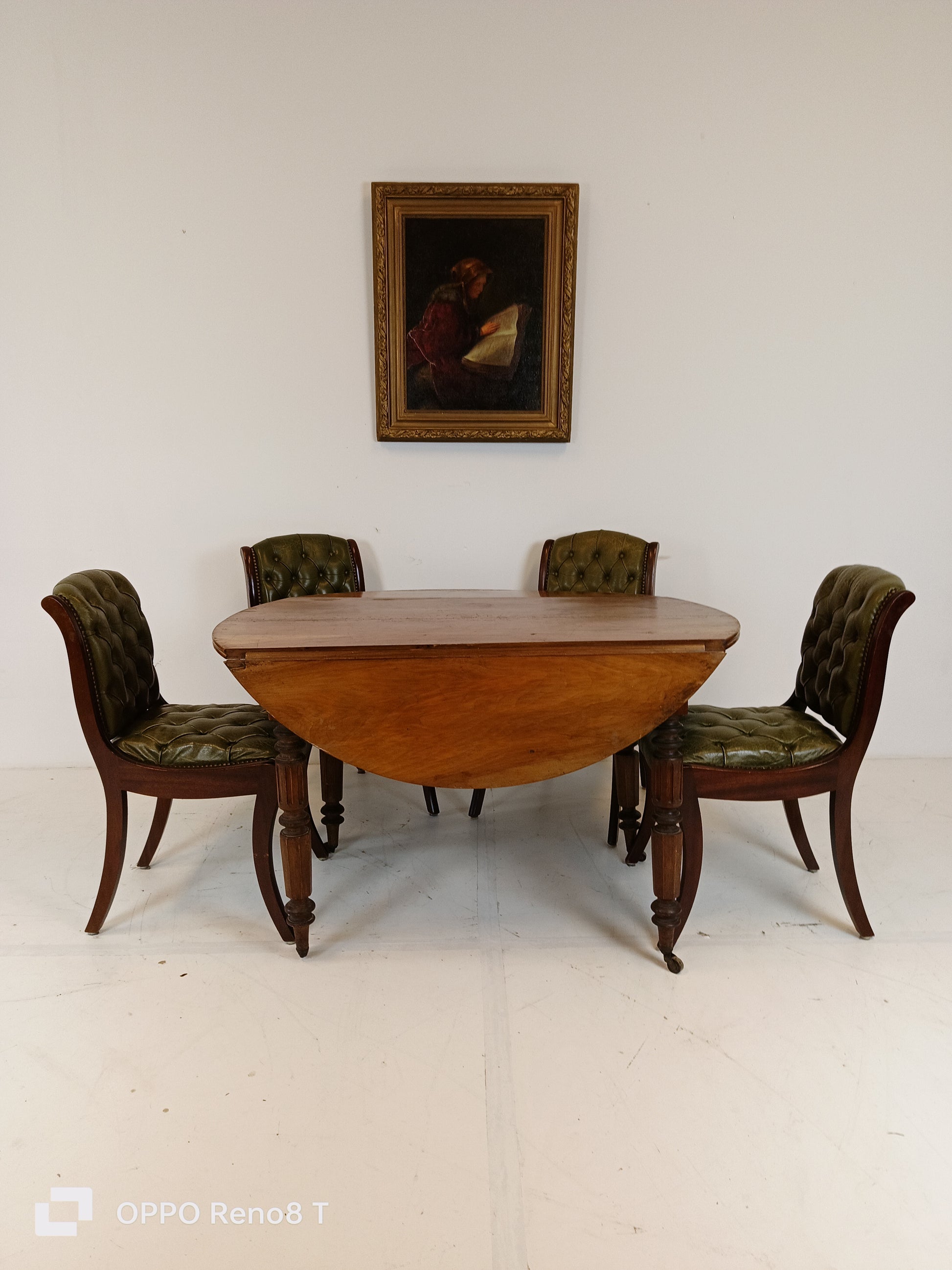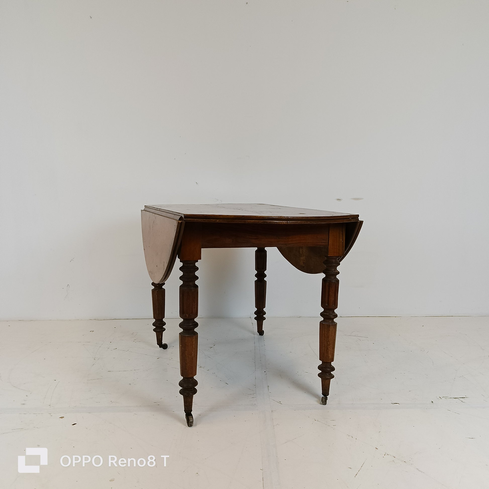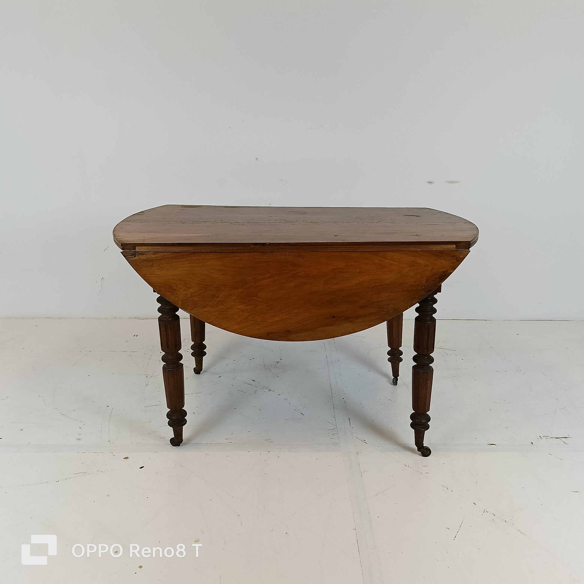 A pretty 19th century table. The plank top with two drop leaves which rise and are supported on pull out lopers ith original iron ring handles. The table has beautiful ring turned legs. Practical and usable and a very pretty provincial table with great charm.
