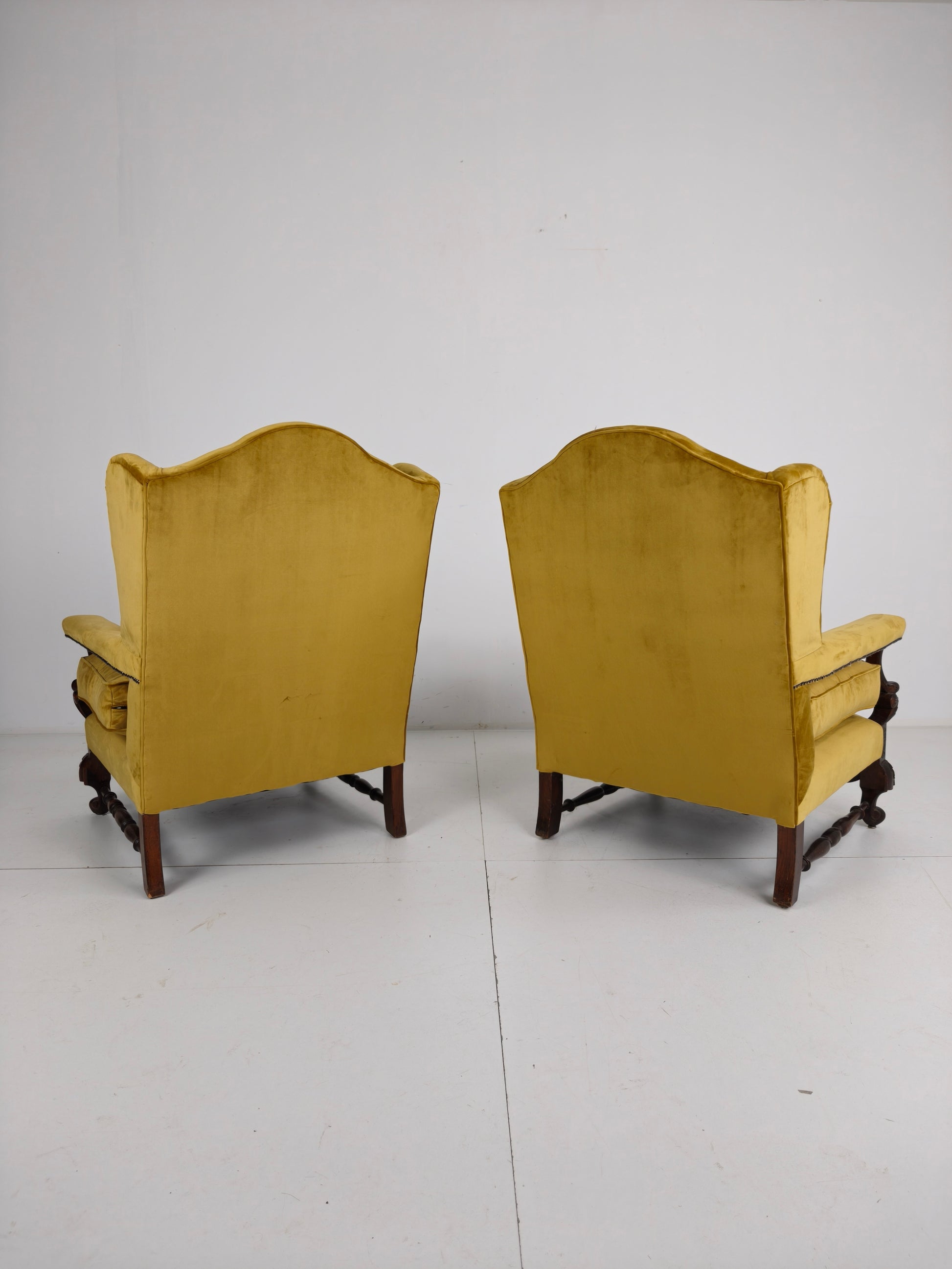 Upholstered in soft velvet fabric, they offer a luxurious seating experience while adding warmth and character to any classic or antique-inspired interior.