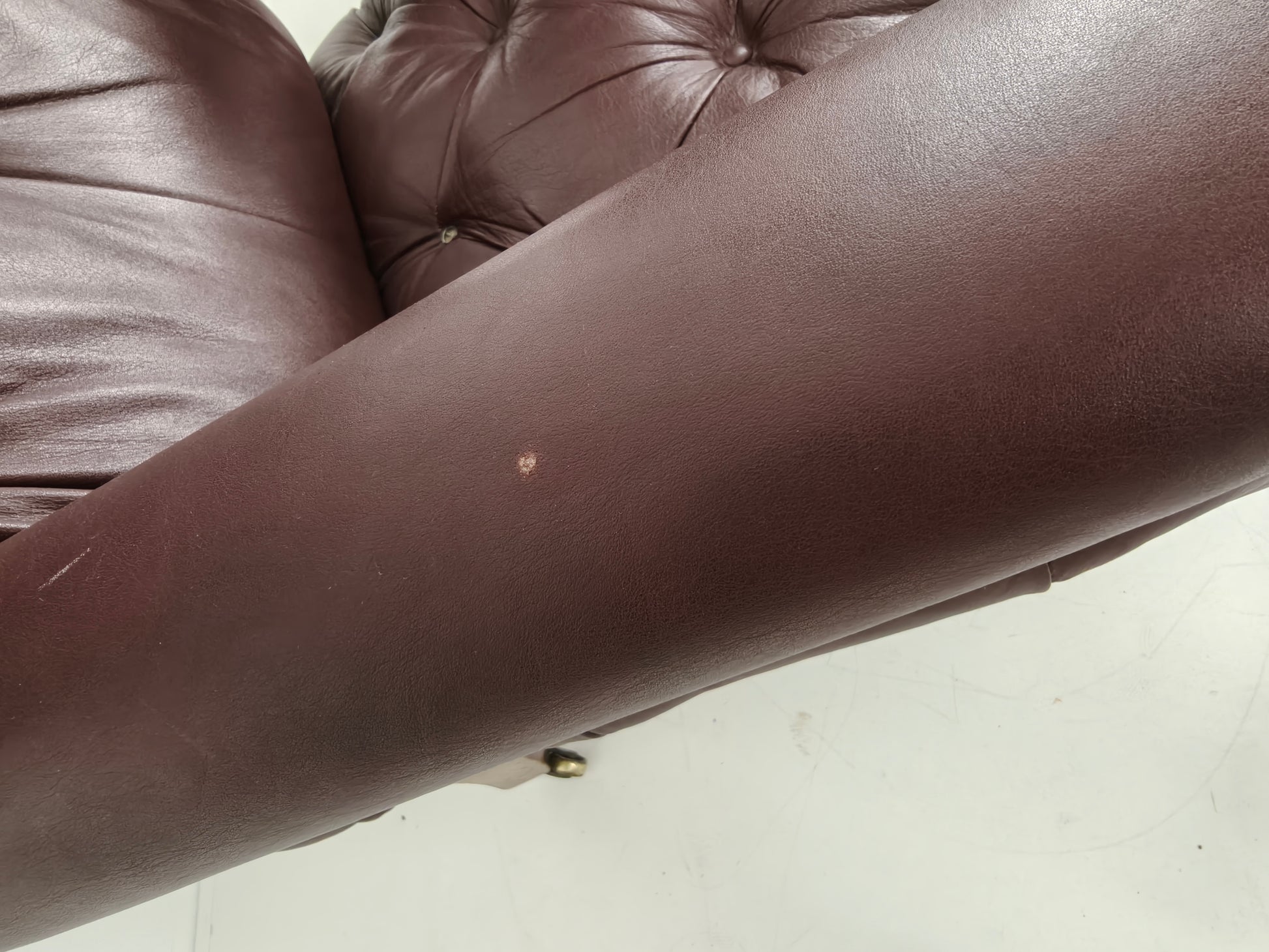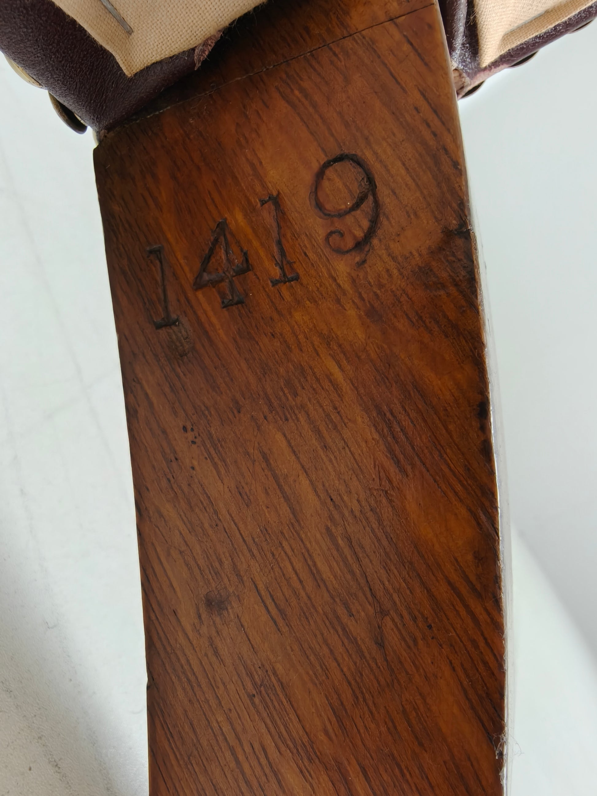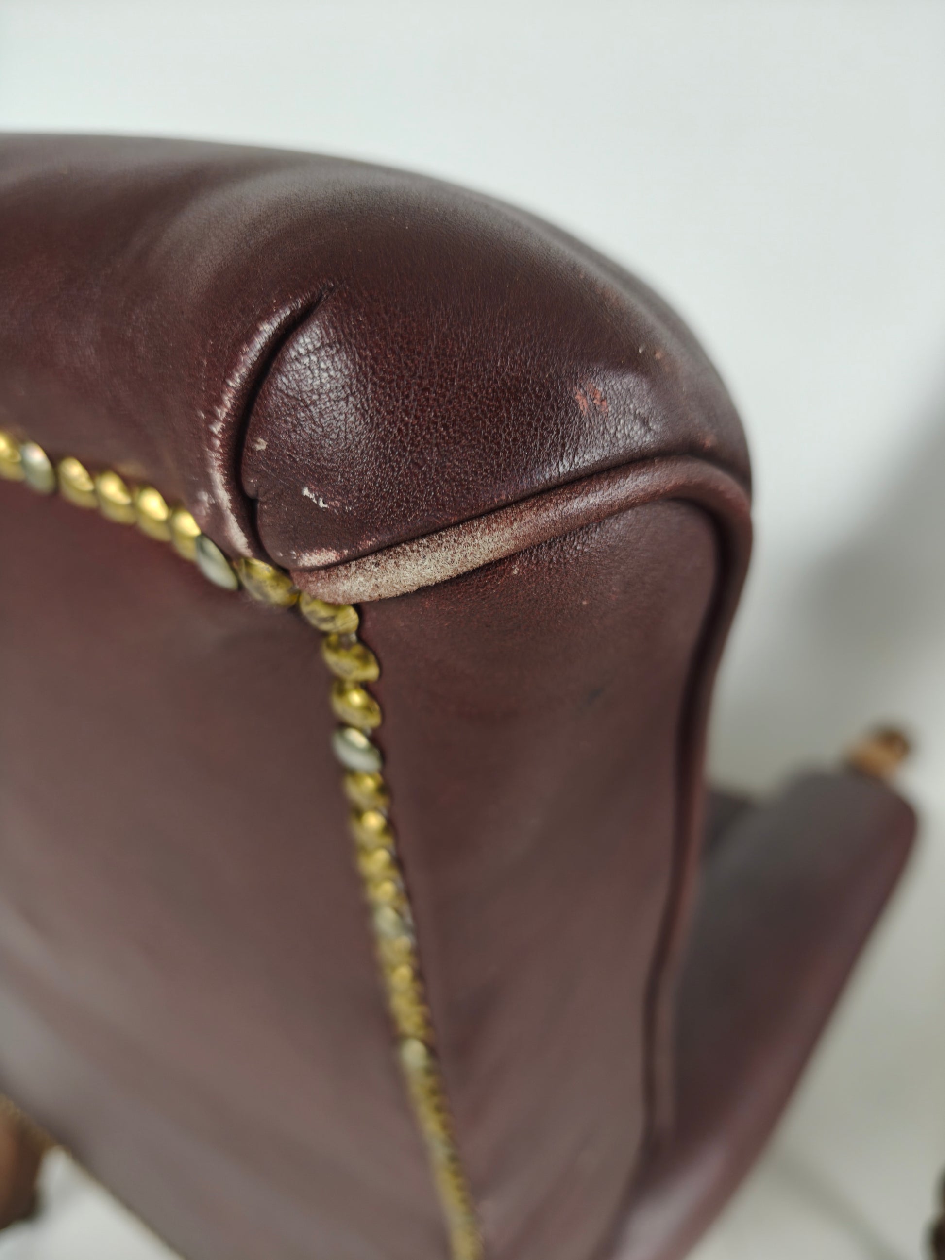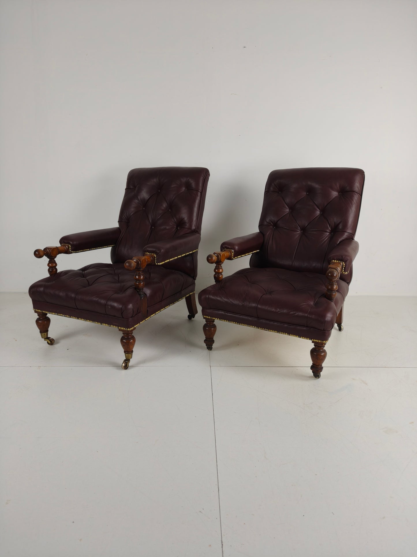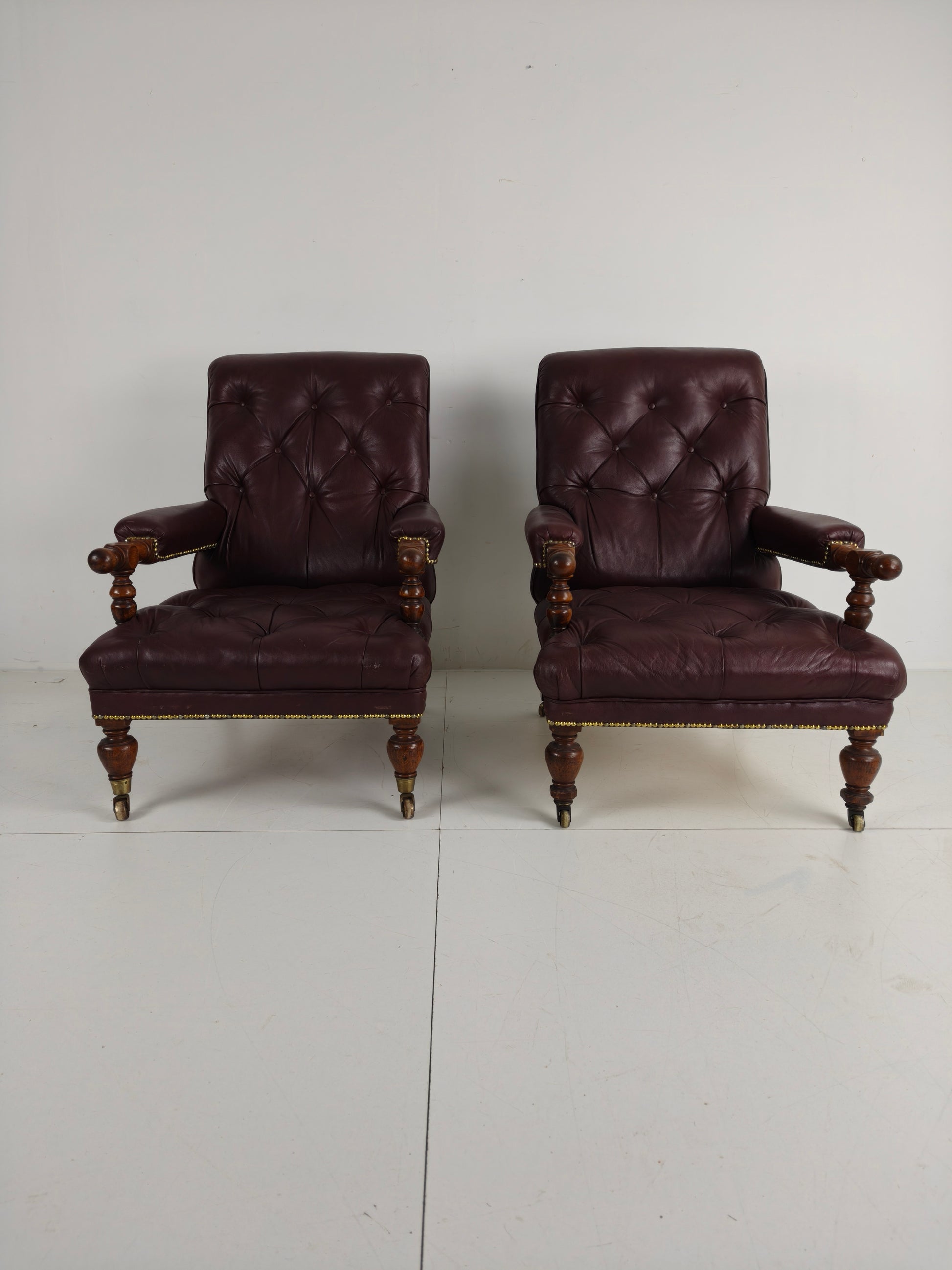 The chairs show slight signs of use, which are consistent with their age, adding to their character and charm. They are upholstered in leather, which has beautifully aged over time.